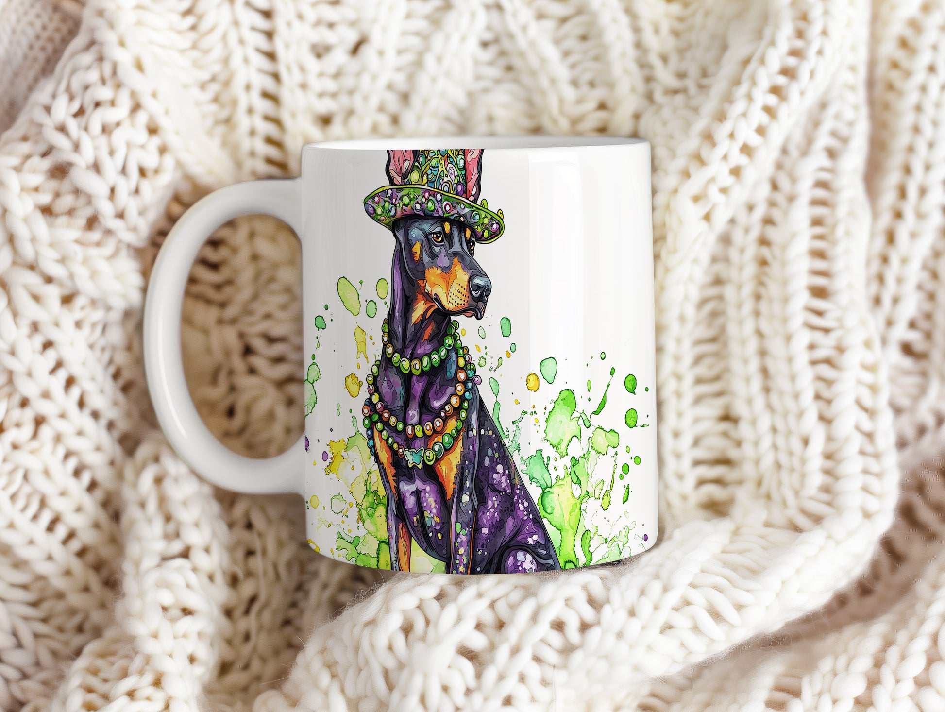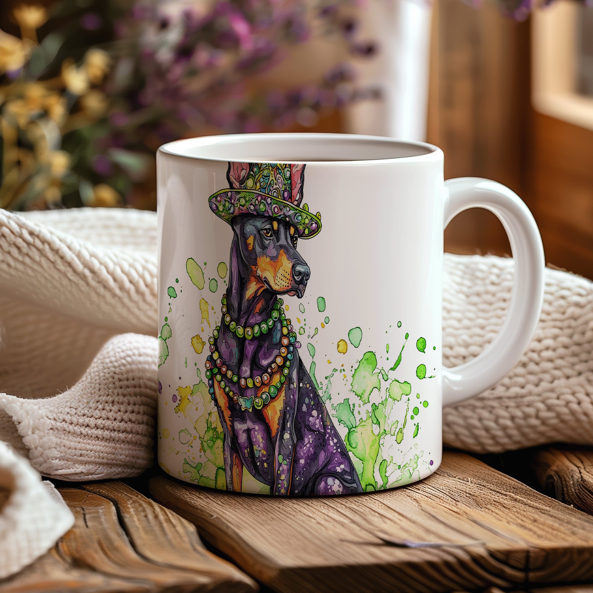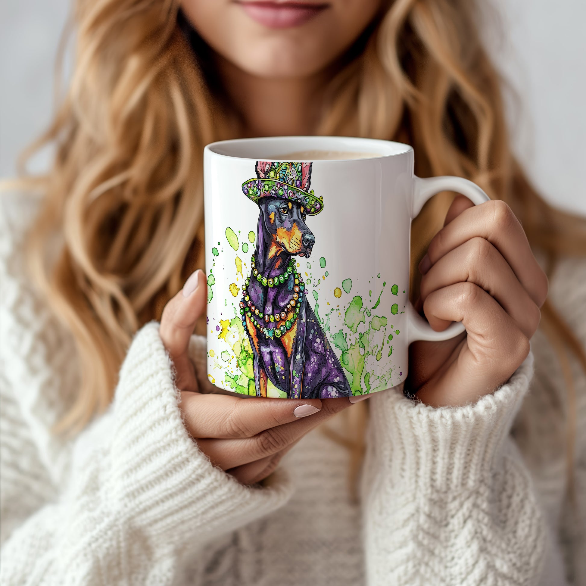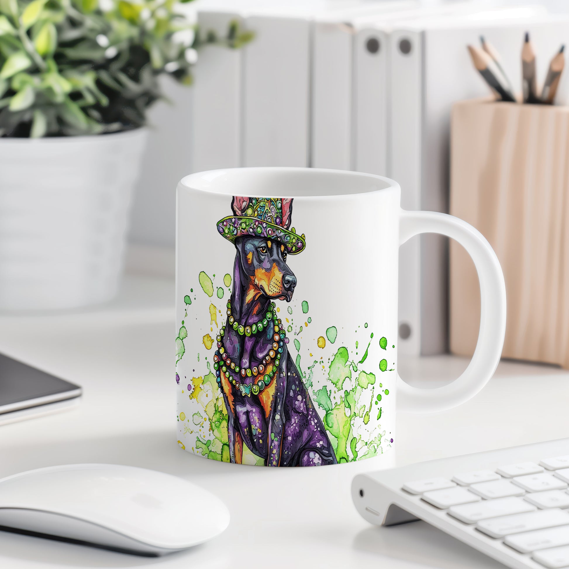 Tento hrnek z keramického materiálu zobrazuje veselého dobrmana v barevném klobouku. Je ideální pro milovníky psů a zábavy, skvěle se hodí jako dárek pro přátele nebo rodinu. Materiál: keramika. Objem: 330 ml. Vhodné do myčky i mikrovlnky. Používání tohoto hrnku přináší radost a oživí každé pití.