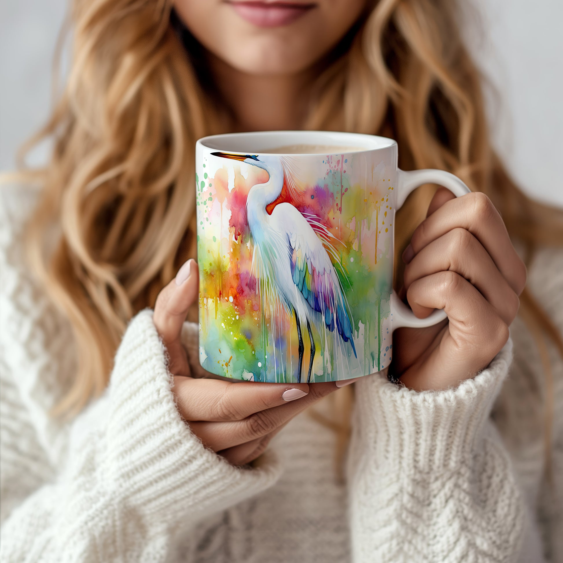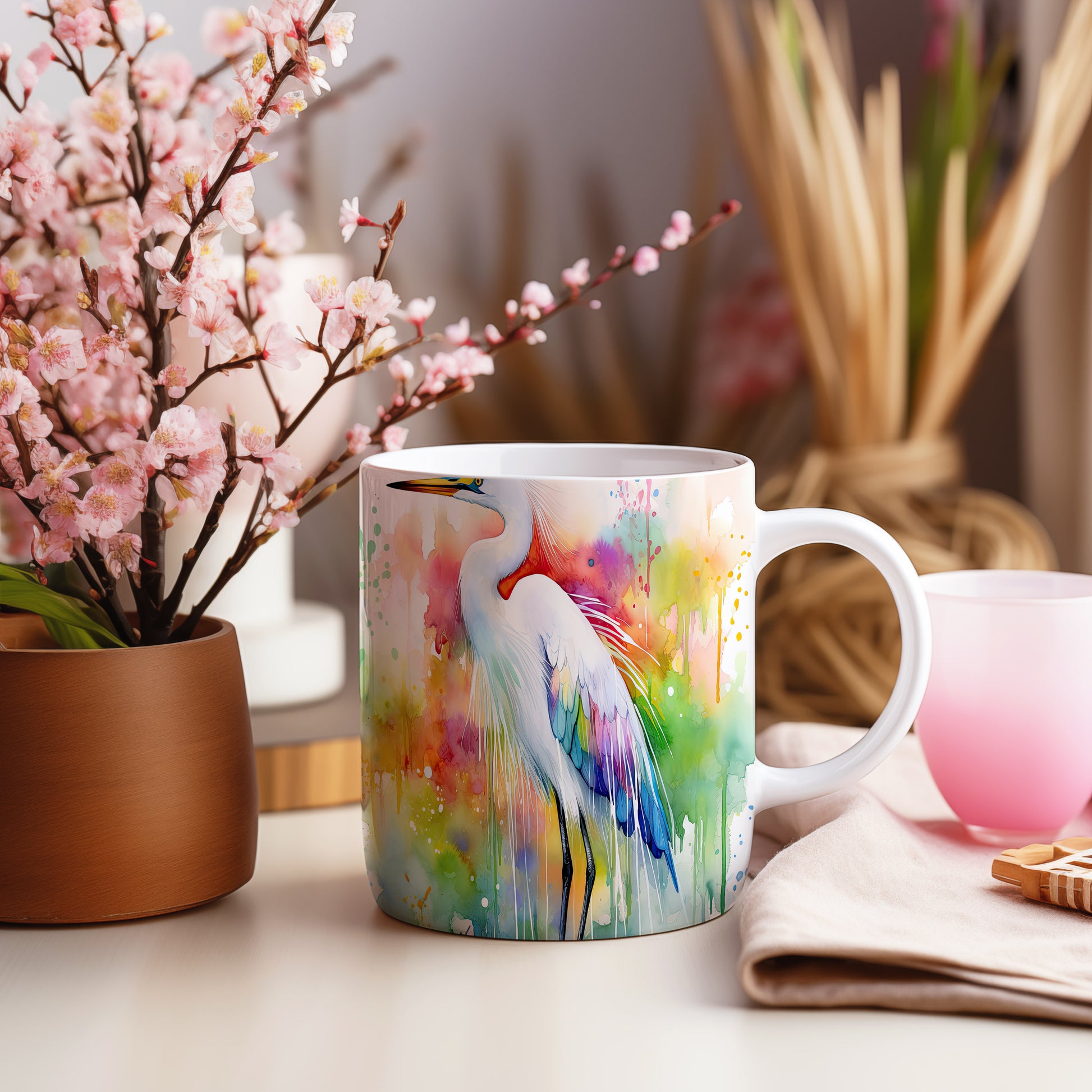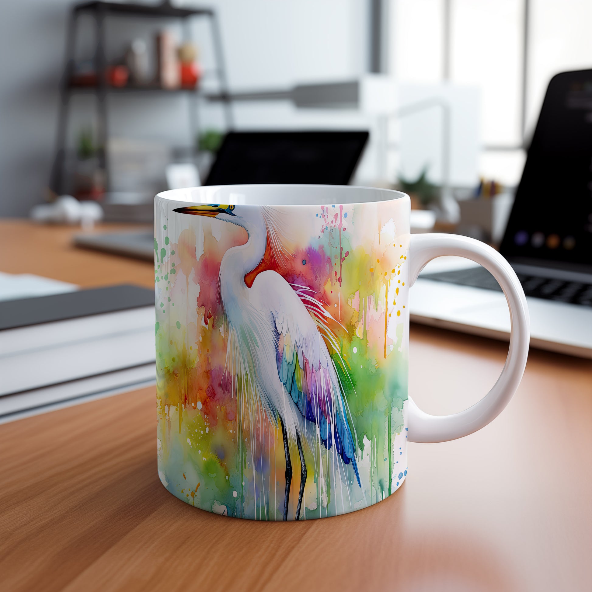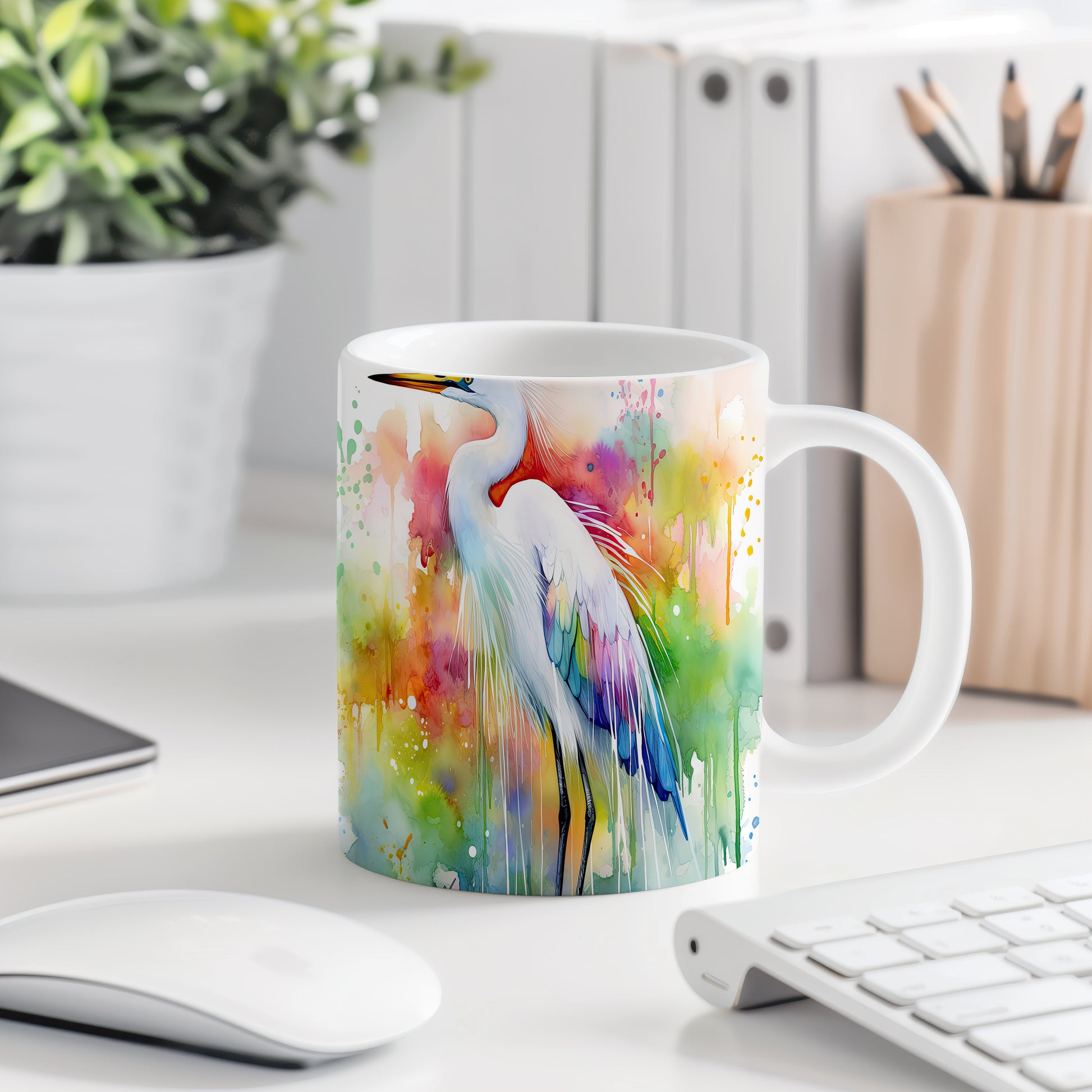 Hrnek s barevným heronem – akvarelovým motivem