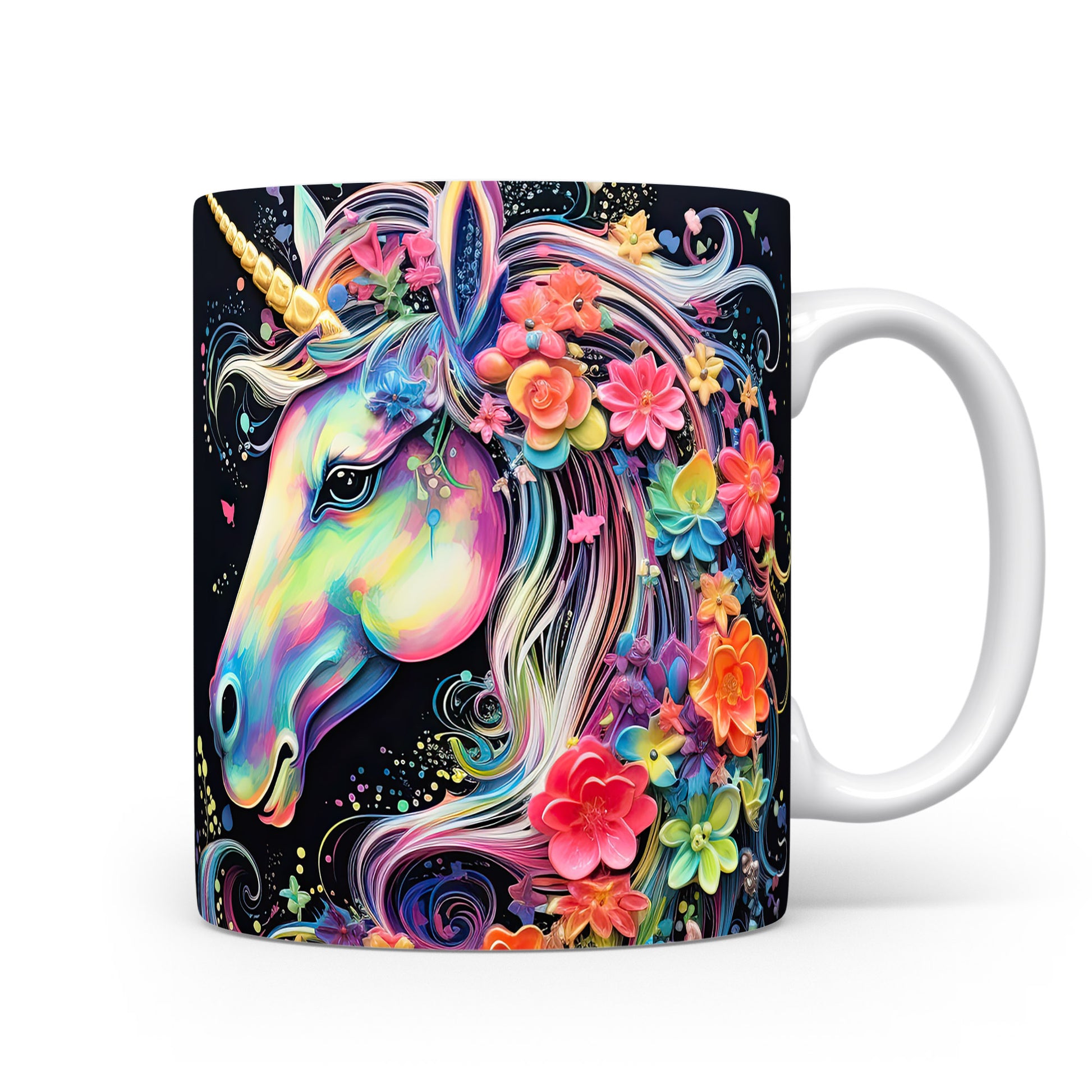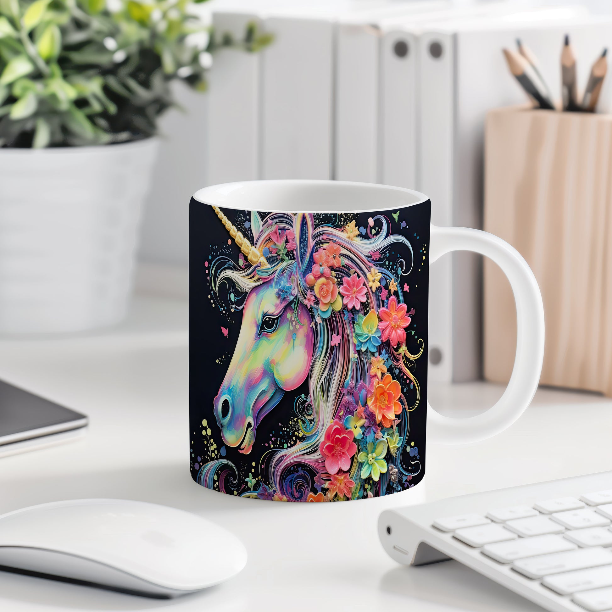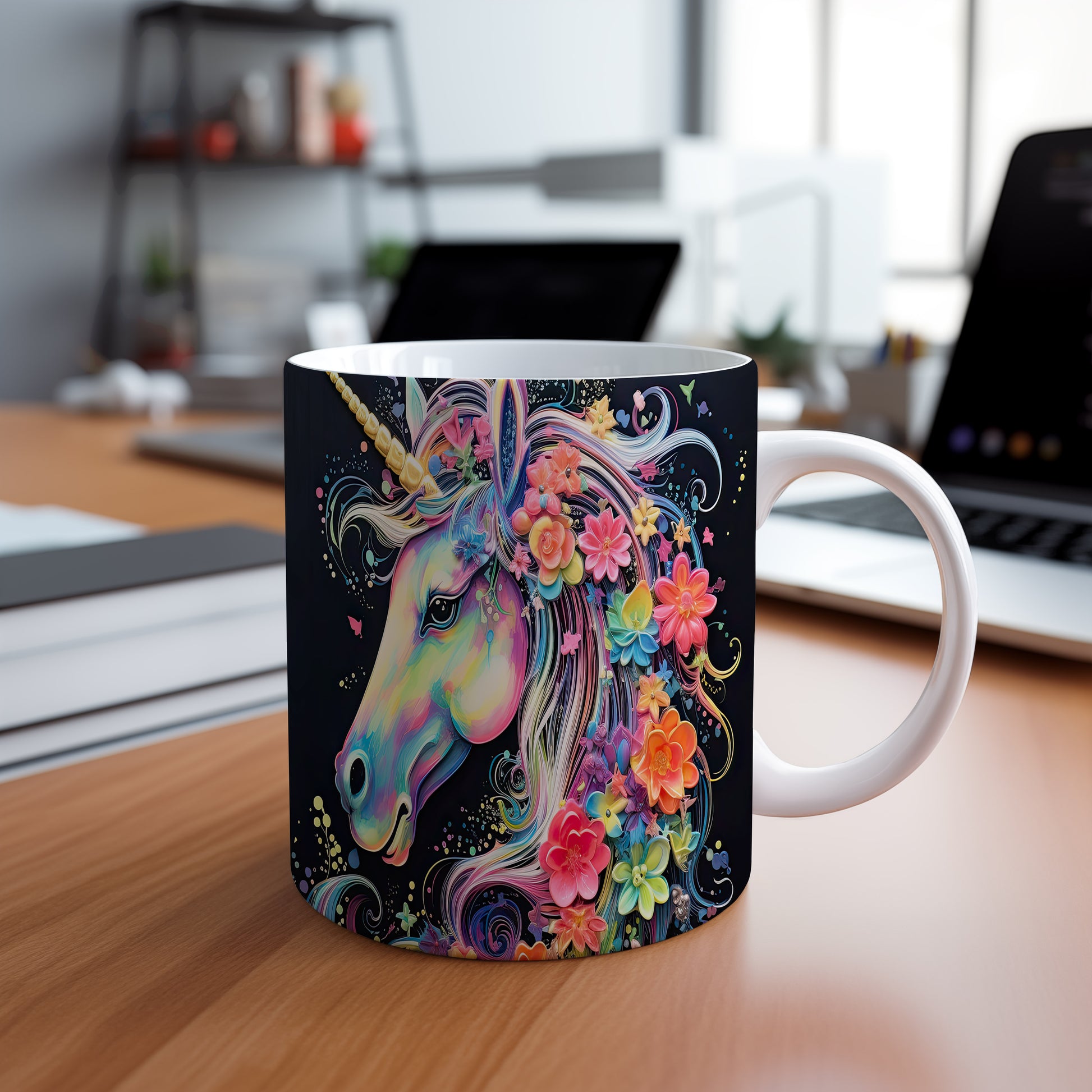 Tento hrnek zobrazuje barevného jednorožce s květinovým motivem. Je ideální pro milovníky pohádek a kouzelných bytostí, skvělý tip na dárek pro děti i dospělé. Materiál: keramika. Objem: 330 ml. Vhodné do myčky i mikrovlnky. Užívejte si každodenní kávu nebo čaj s tímto veselým hrnkem, který vám zlepší náladu.