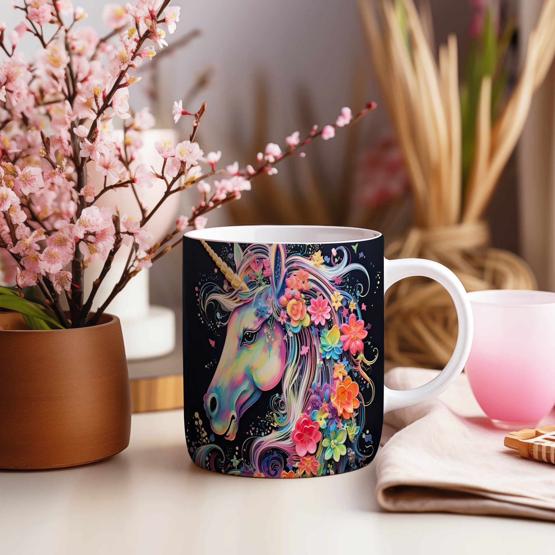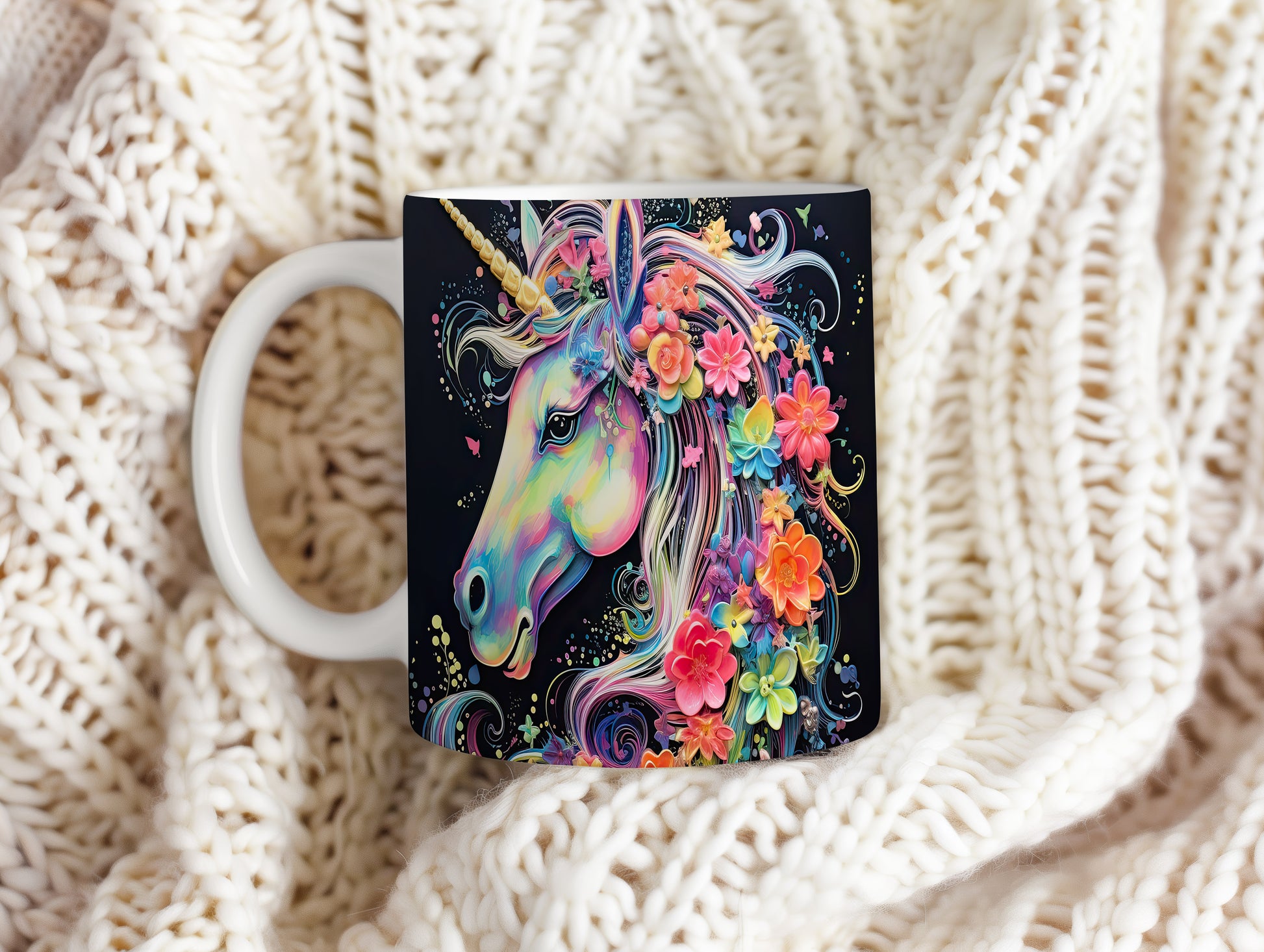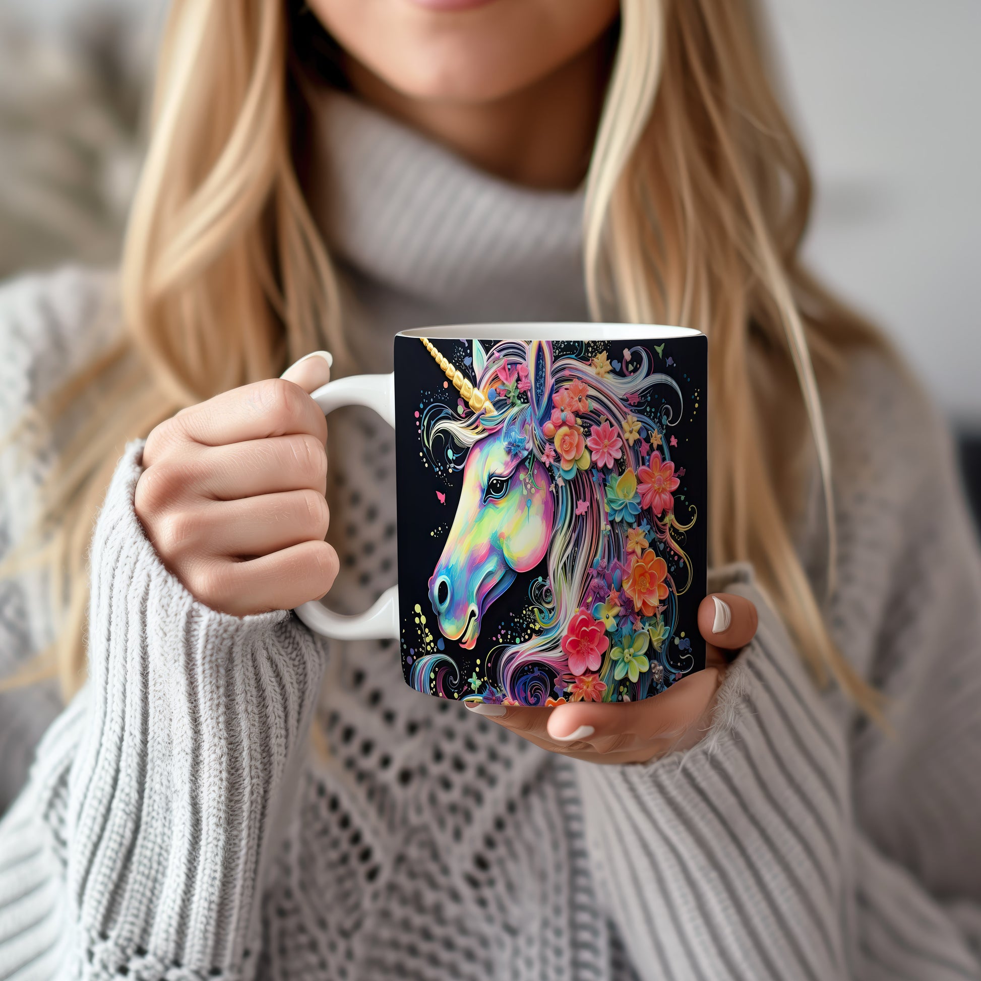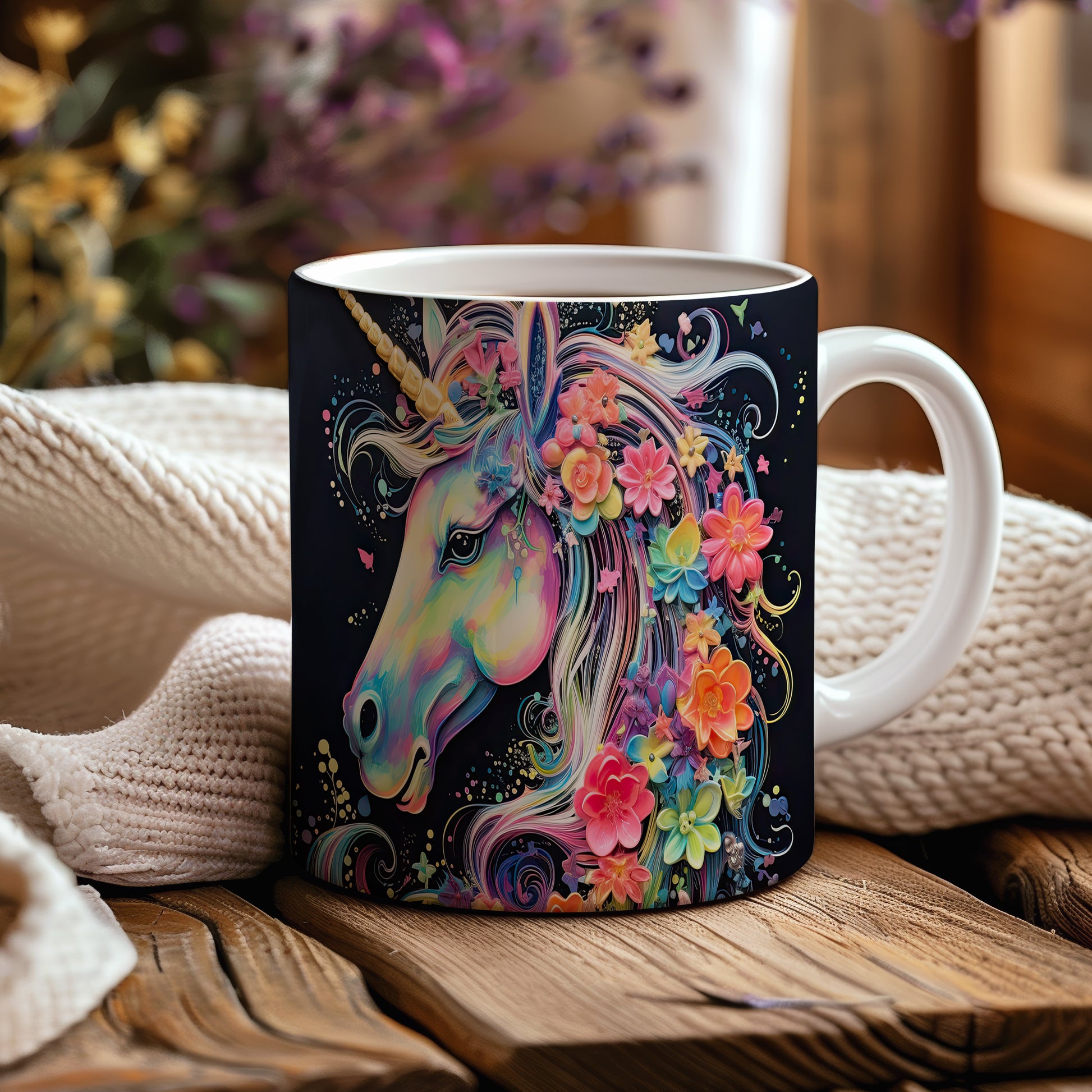 Tento hrnek zobrazuje barevného jednorožce s květinovým motivem. Je ideální pro milovníky pohádek a kouzelných bytostí, skvělý tip na dárek pro děti i dospělé. Materiál: keramika. Objem: 330 ml. Vhodné do myčky i mikrovlnky. Užívejte si každodenní kávu nebo čaj s tímto veselým hrnkem, který vám zlepší náladu.
