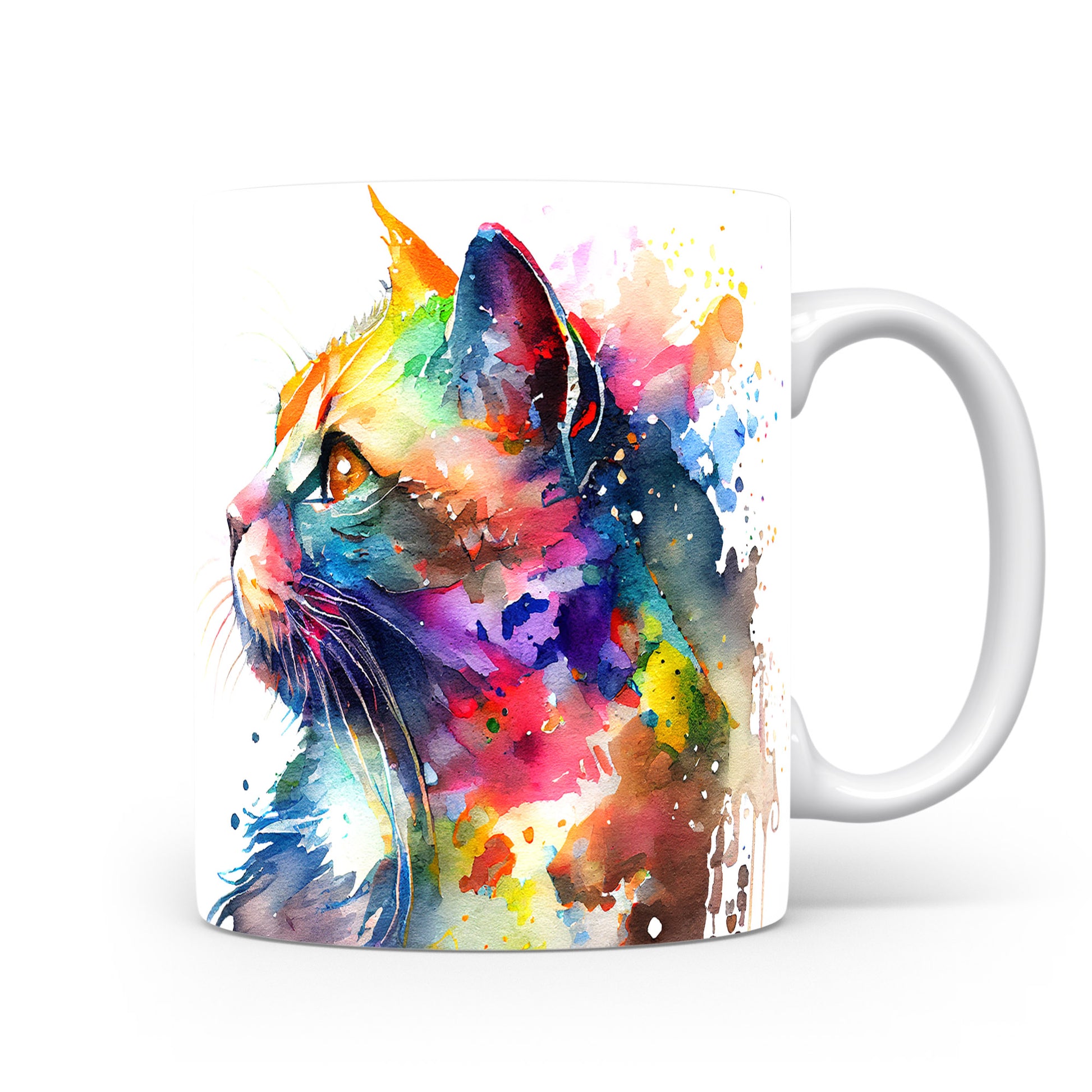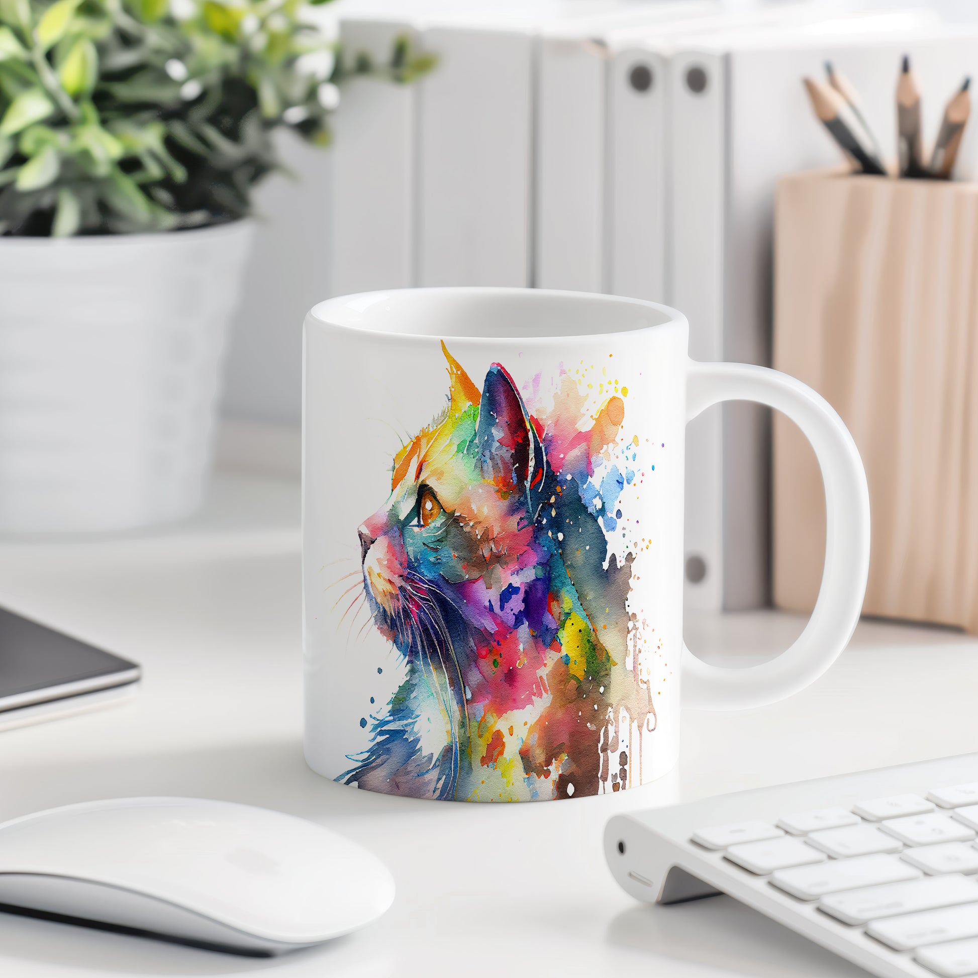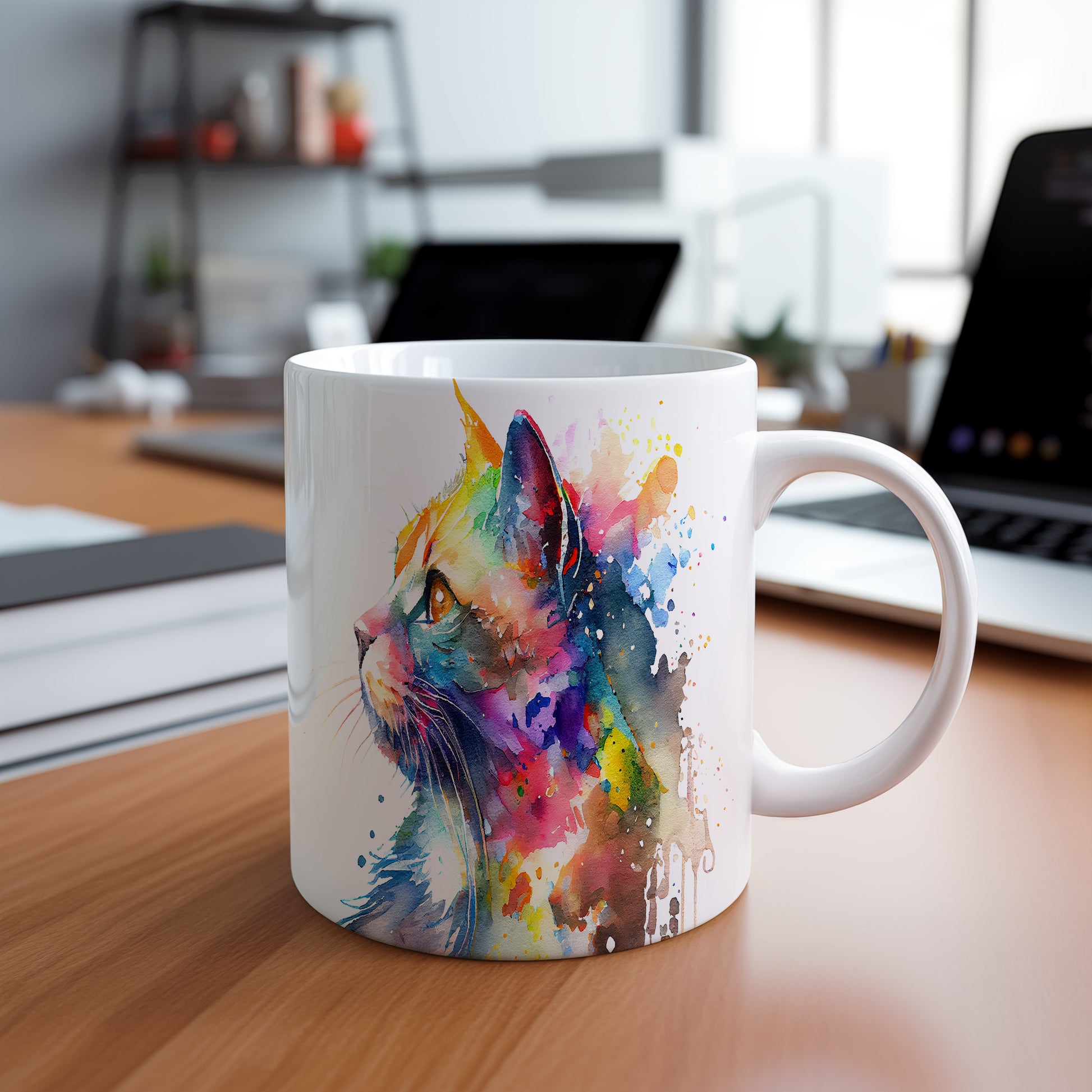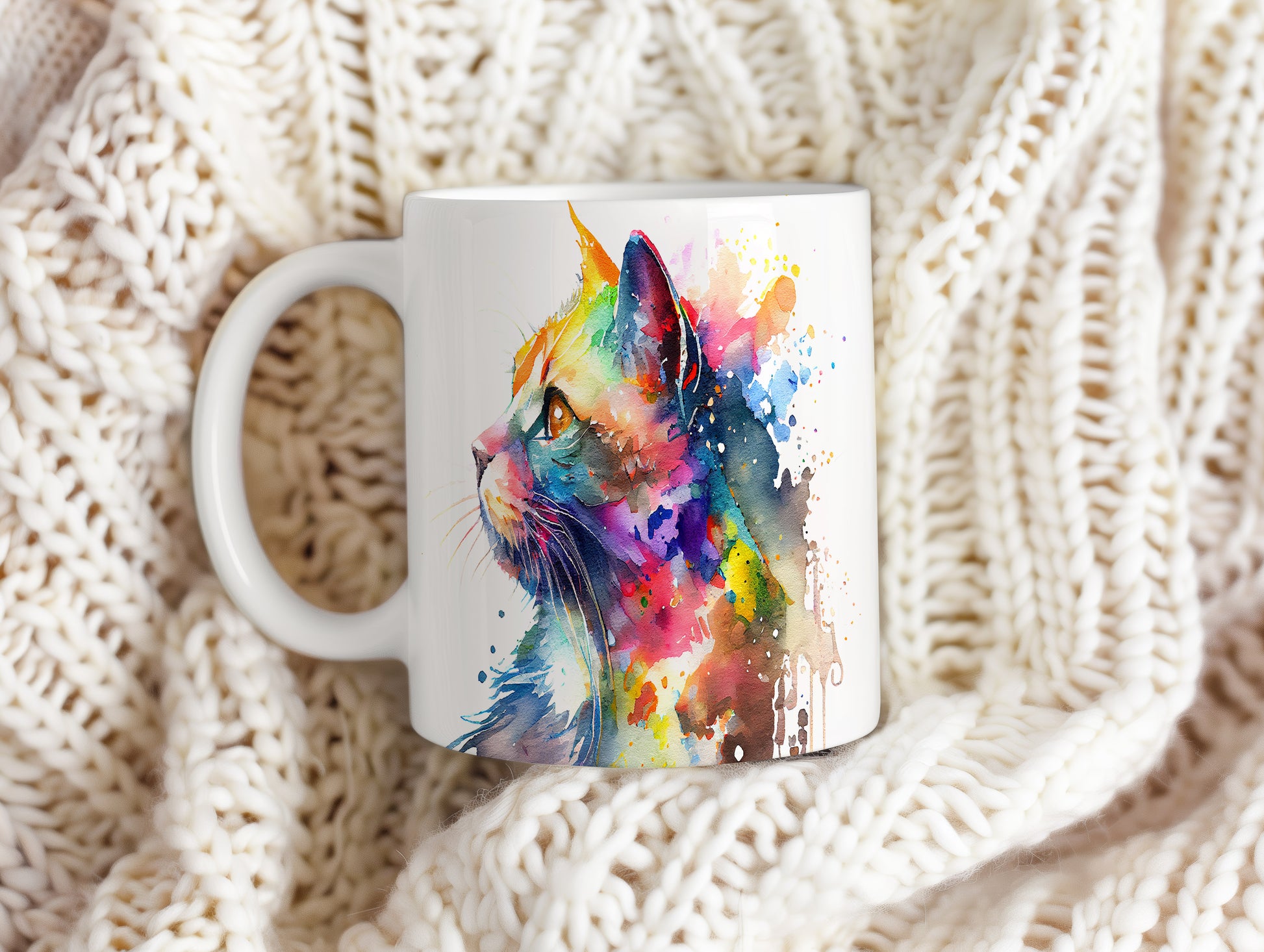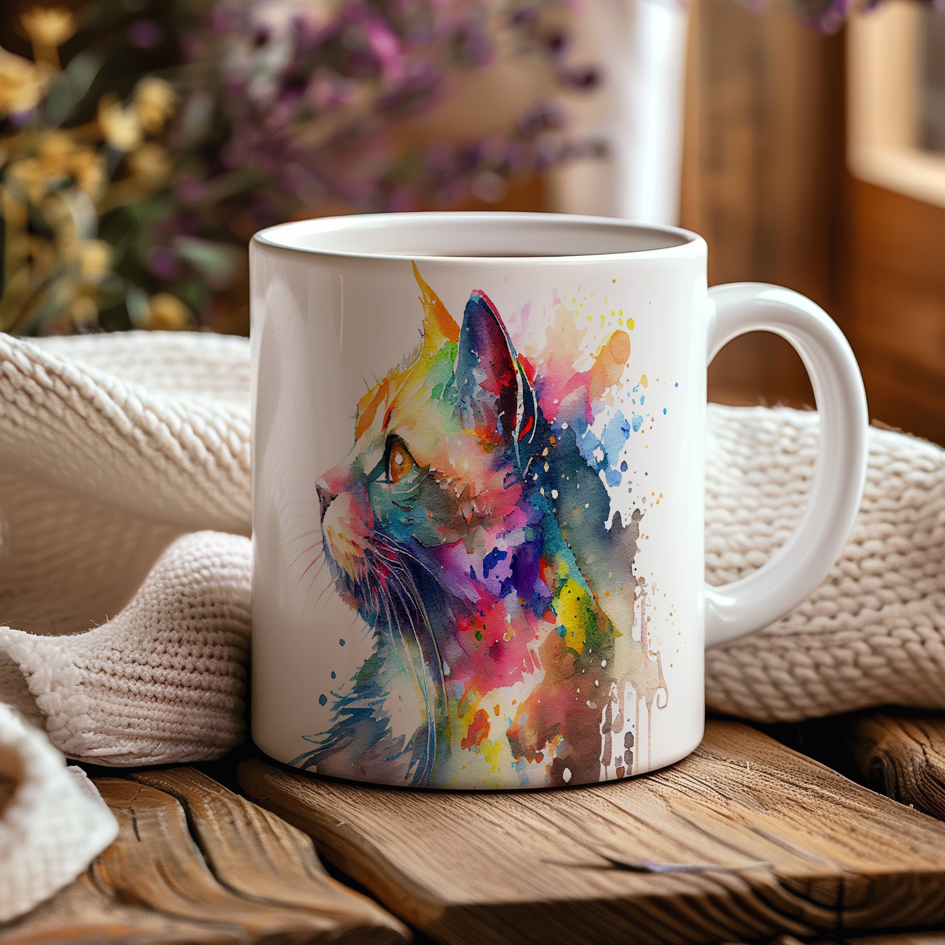 Hrnek s barevným kočkou v akvarelovém stylu – jemnými detaily