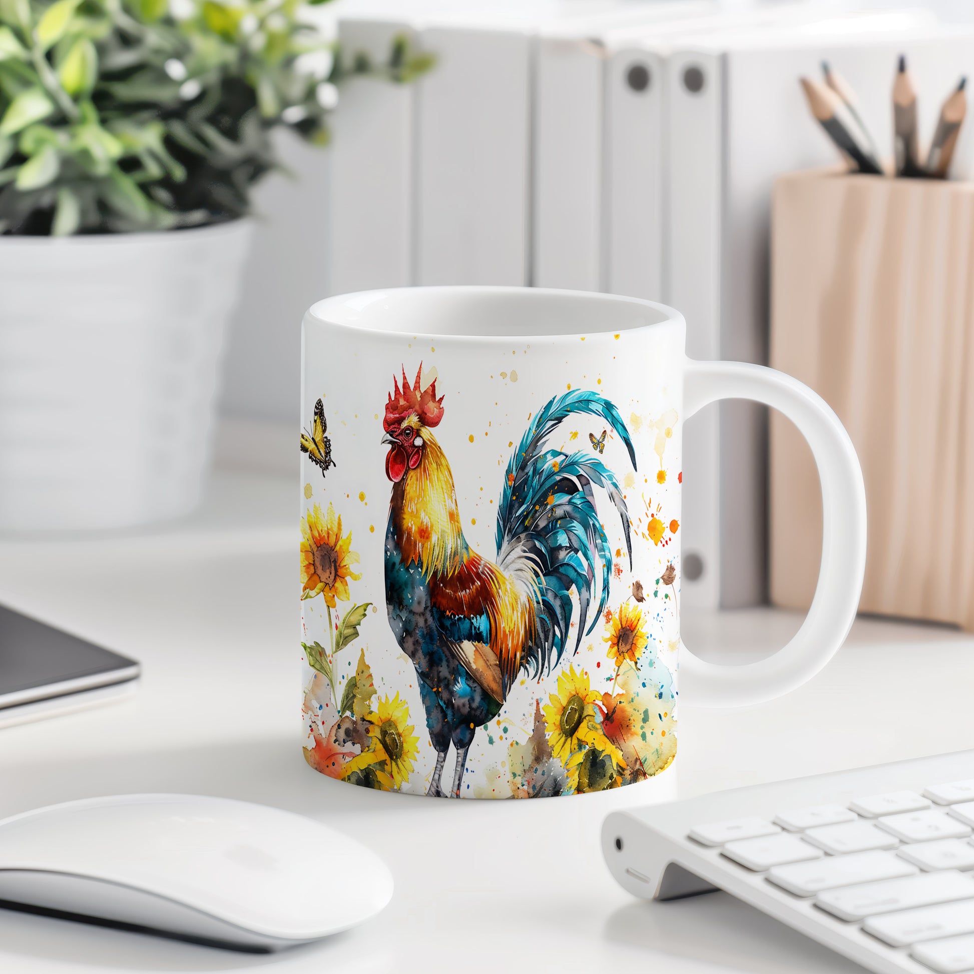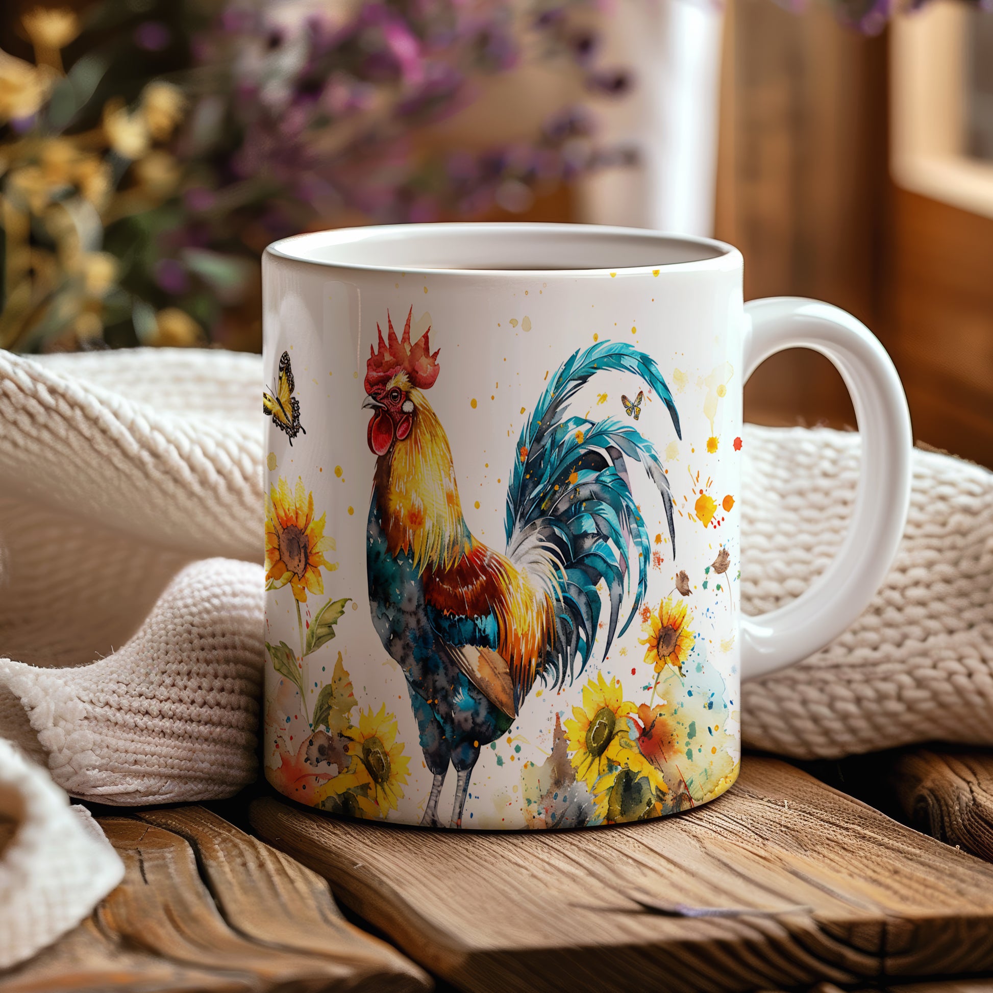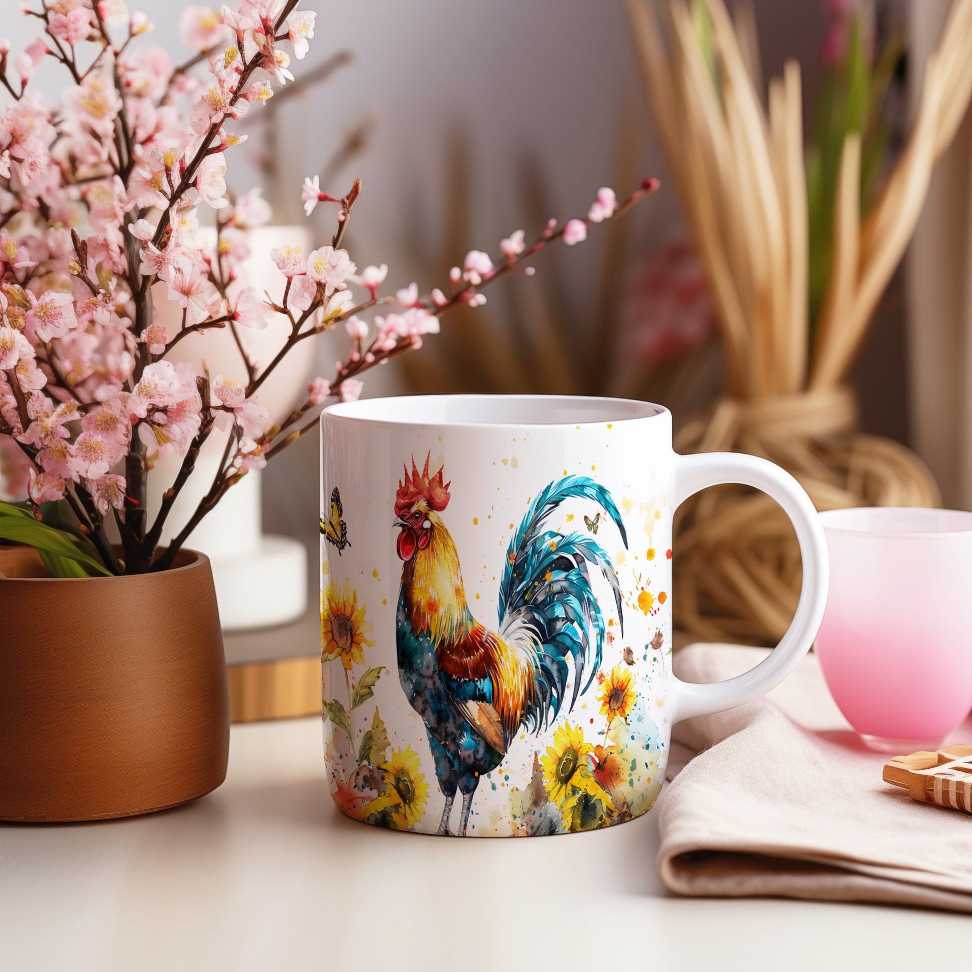 Tento keramický hrnek zobrazuje veselého kohouta obklopeného slunečnicemi a pestrými barvami. Je ideální pro každodenní použití a skvělým dárkem pro milovníky přírody. Materiál: keramika. Objem: 330 ml. Vhodné do myčky i mikrovlnky. Používání tohoto hrnku přináší radost a oživí každé ráno.