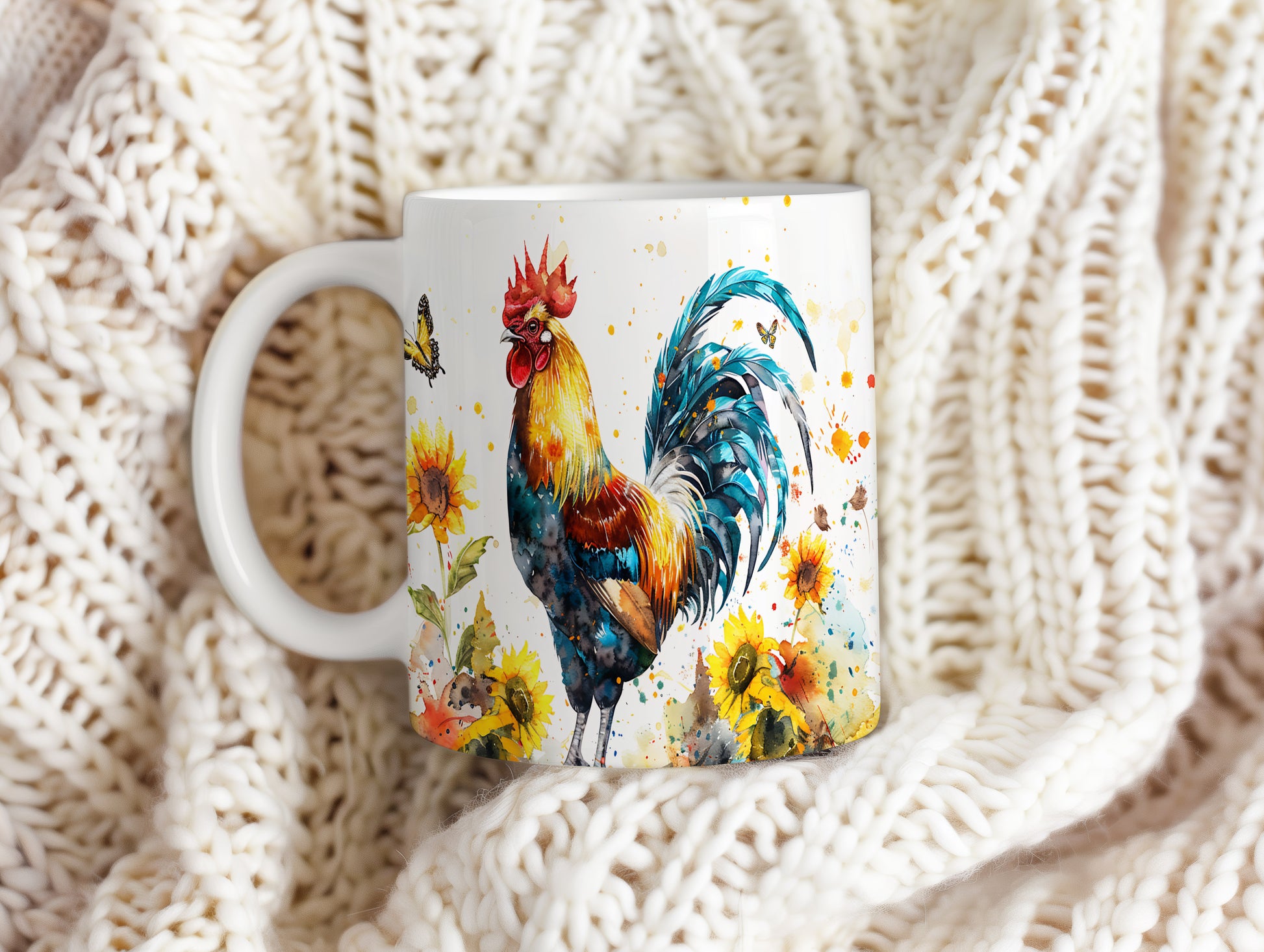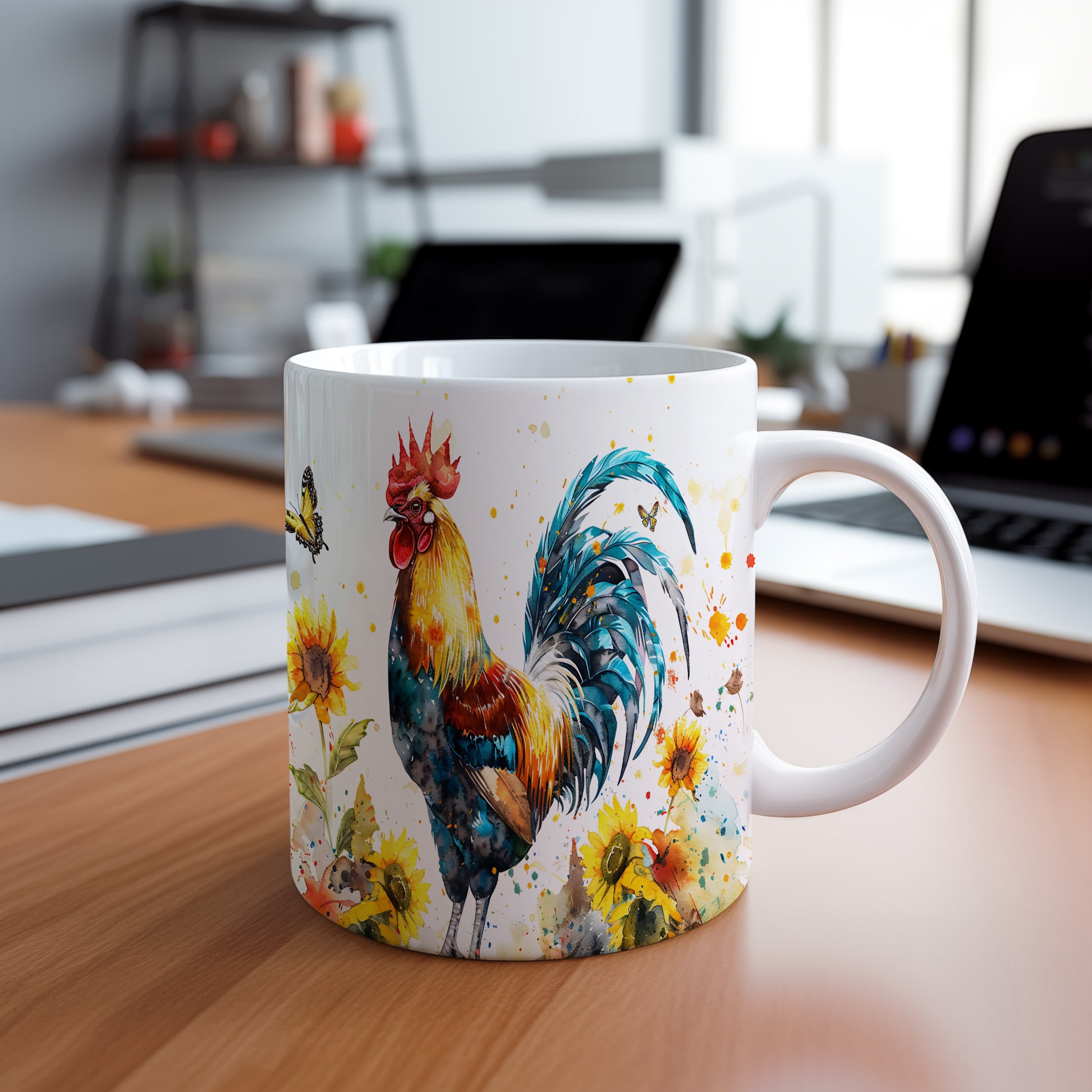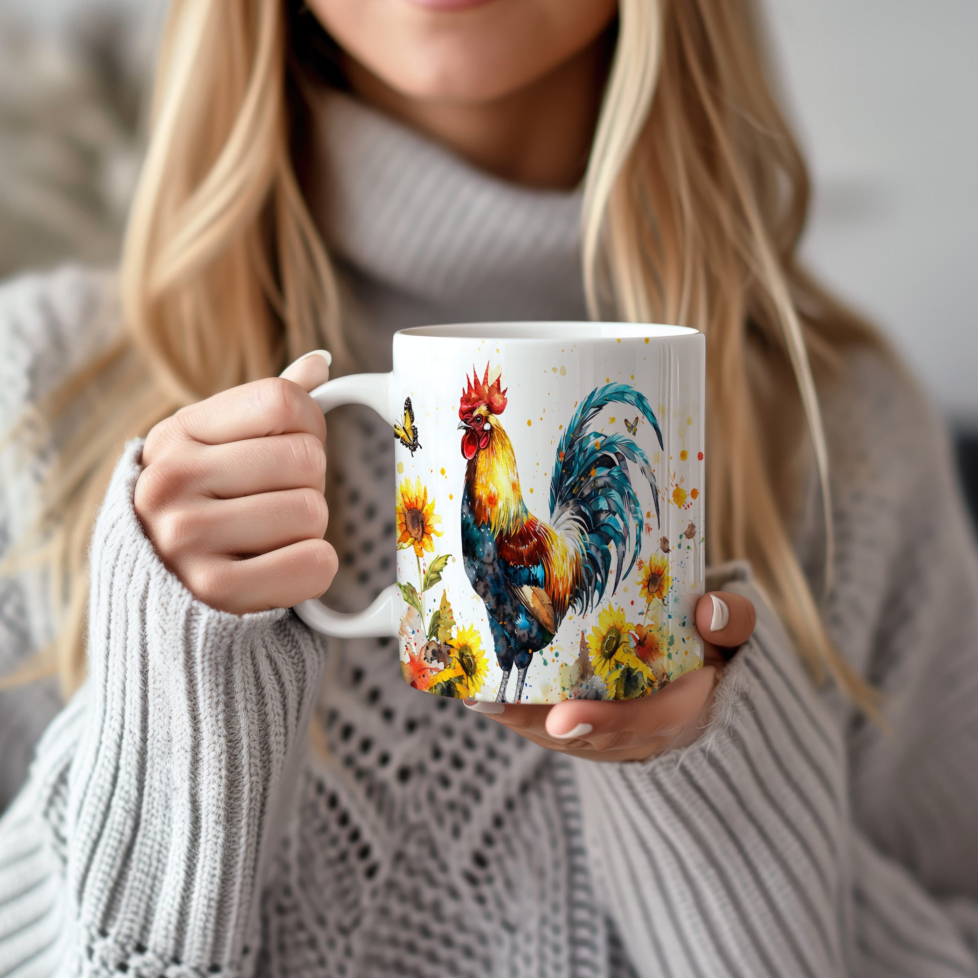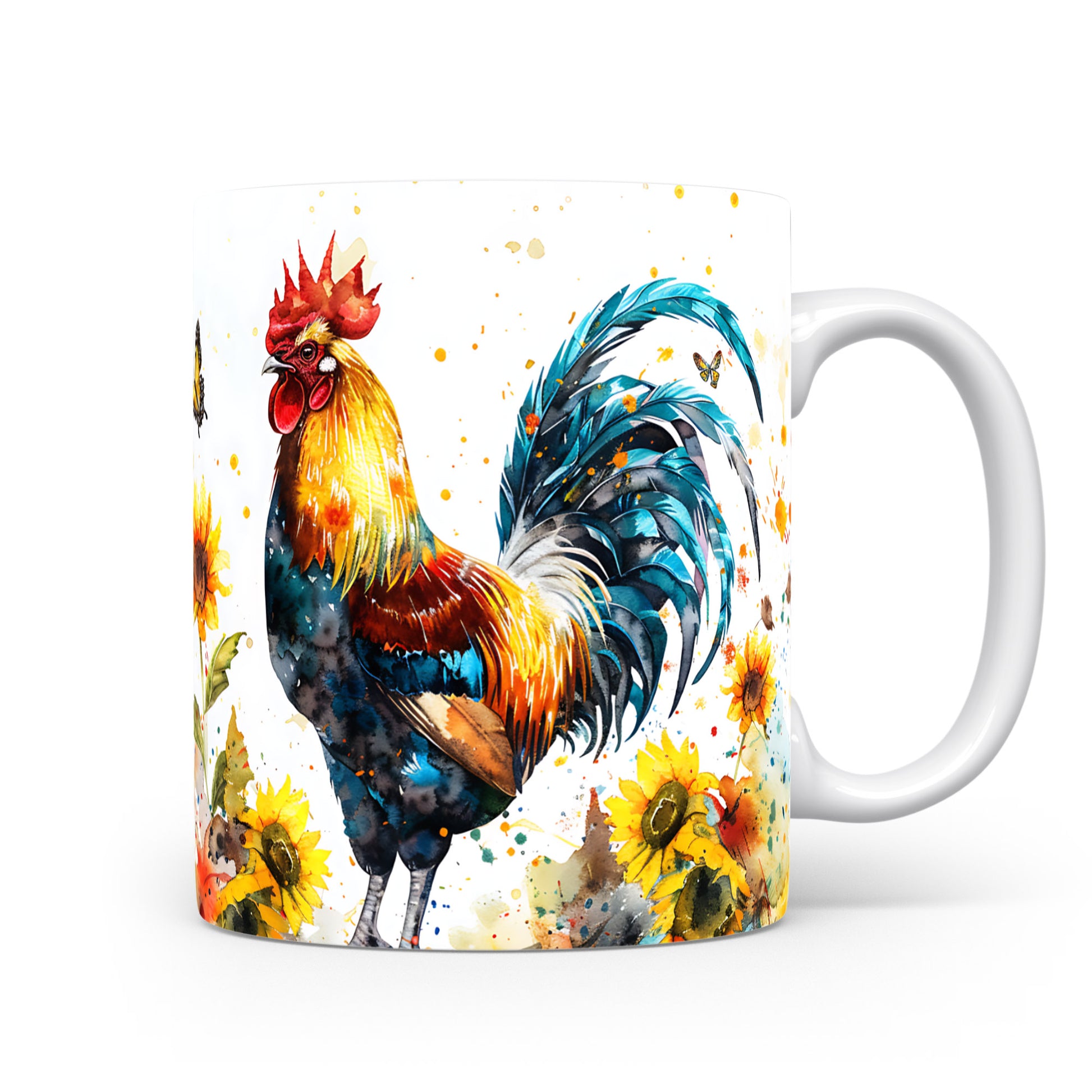 Tento keramický hrnek zobrazuje veselého kohouta obklopeného slunečnicemi a pestrými barvami. Je ideální pro každodenní použití a skvělým dárkem pro milovníky přírody. Materiál: keramika. Objem: 330 ml. Vhodné do myčky i mikrovlnky. Používání tohoto hrnku přináší radost a oživí každé ráno.
