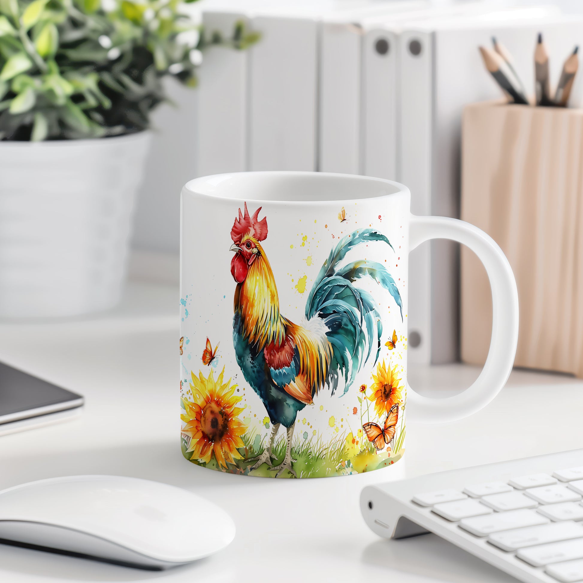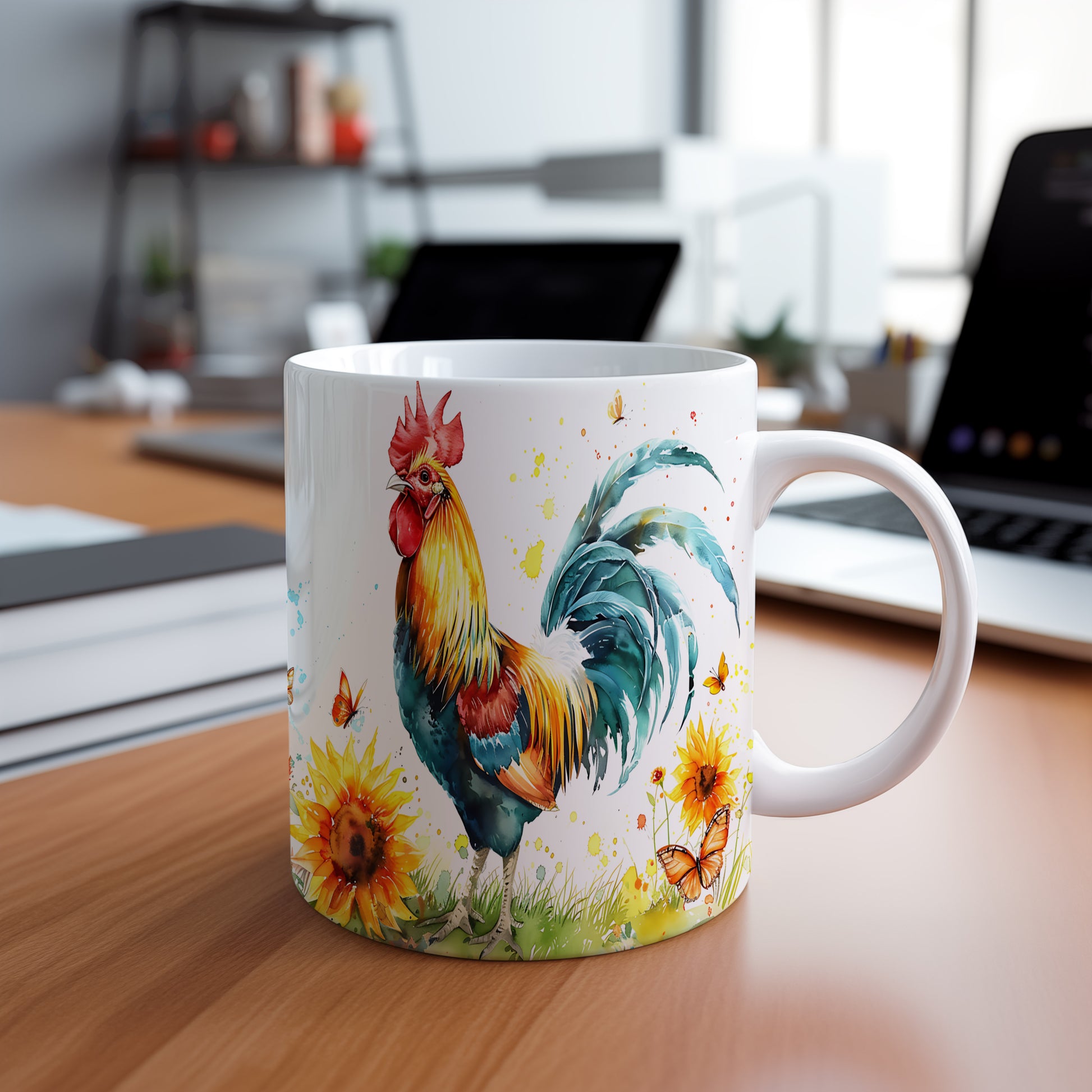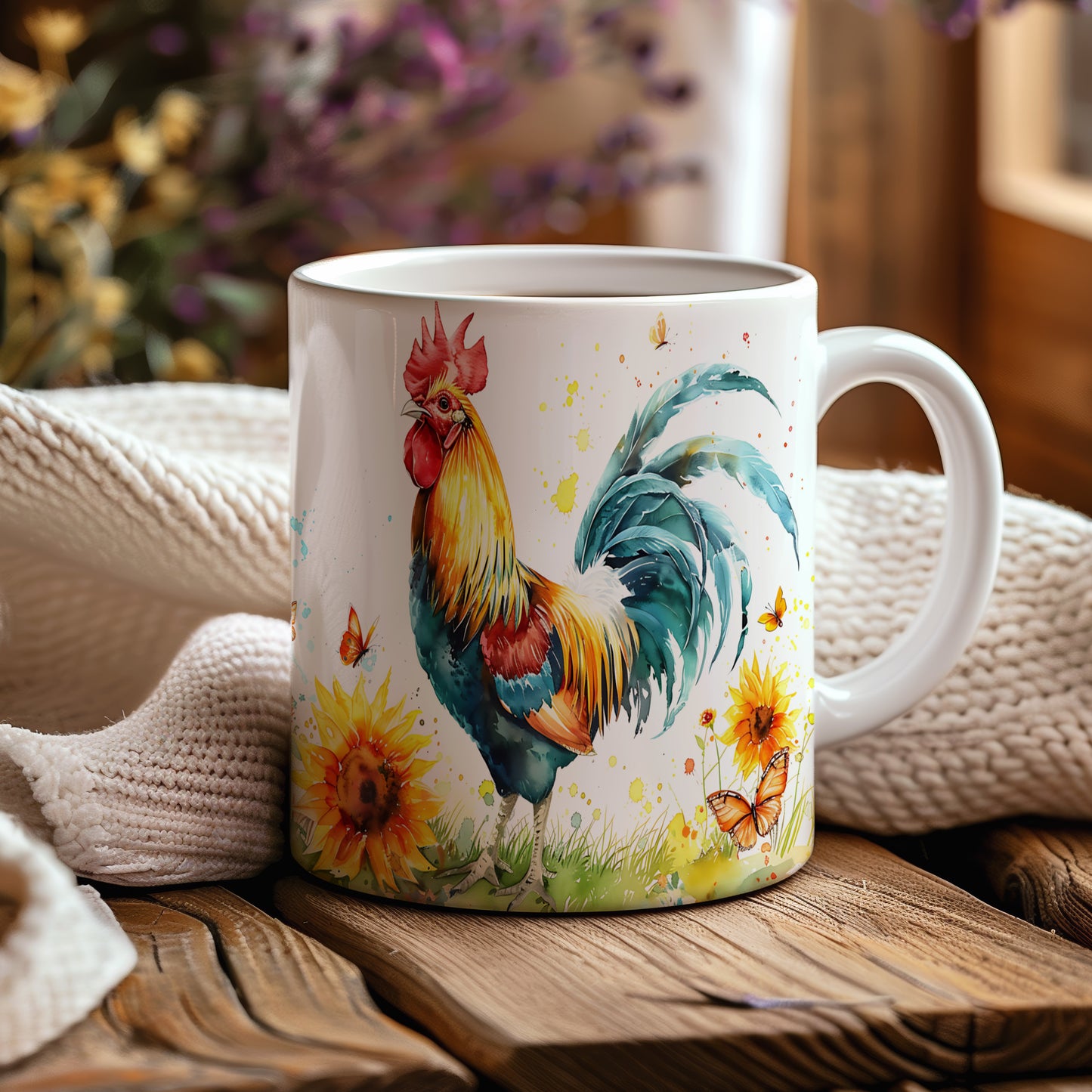 Elegantní keramický hrnek s motivem barevného kohouta a slunečnic. Tento originální kousek potěší milovníky přírody a skvěle se hodí jako dárek pro vaše blízké. Materiál: keramika. Objem: 330 ml. Vhodné do myčky i mikrovlnky. Používáním tohoto hrnku si užijete nejen krásný design, ale i praktické vlastnosti.