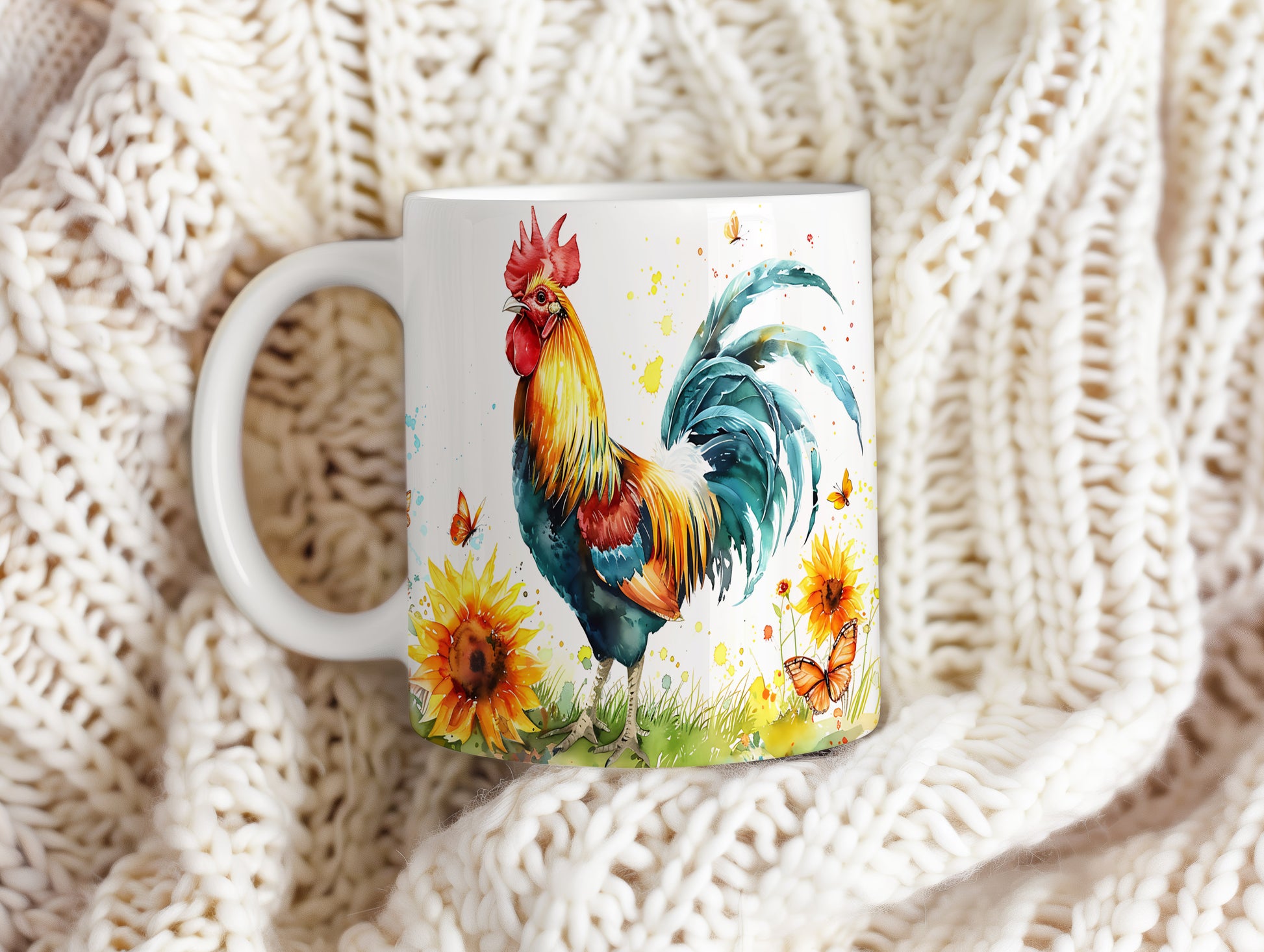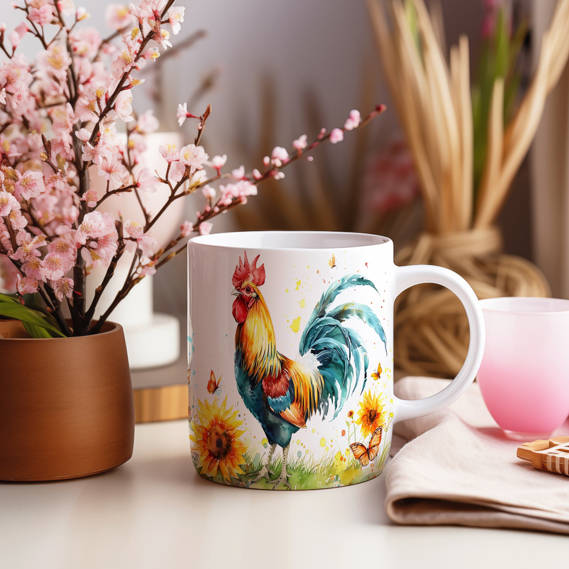 Hrnek s barevným kohoutem mezi slunečnicemi