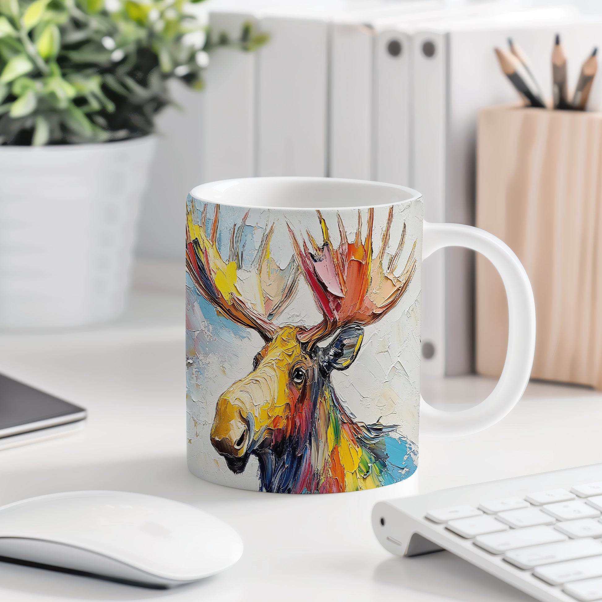 Hrnek s barevným losím motivem přináší hravou atmosféru a radost do každodenního pití. Je ideální pro milovníky přírody a skvělým dárkem pro přátele či rodinu. Materiál: keramika. Objem: 330 ml. Vhodné do myčky i mikrovlnky. Tento hrnek vám usnadní každodenní údržbu a přidá šmrnc vašemu stolu.