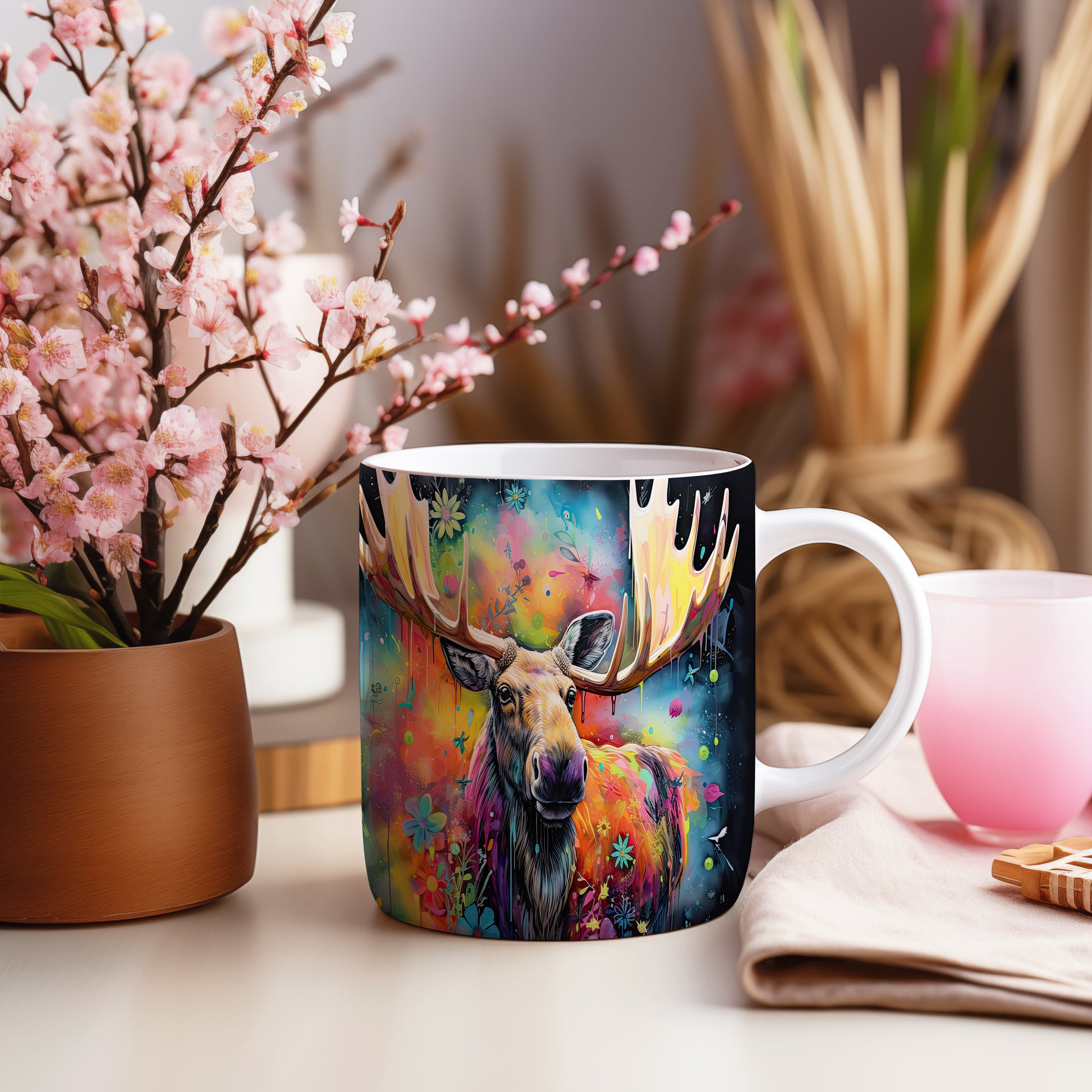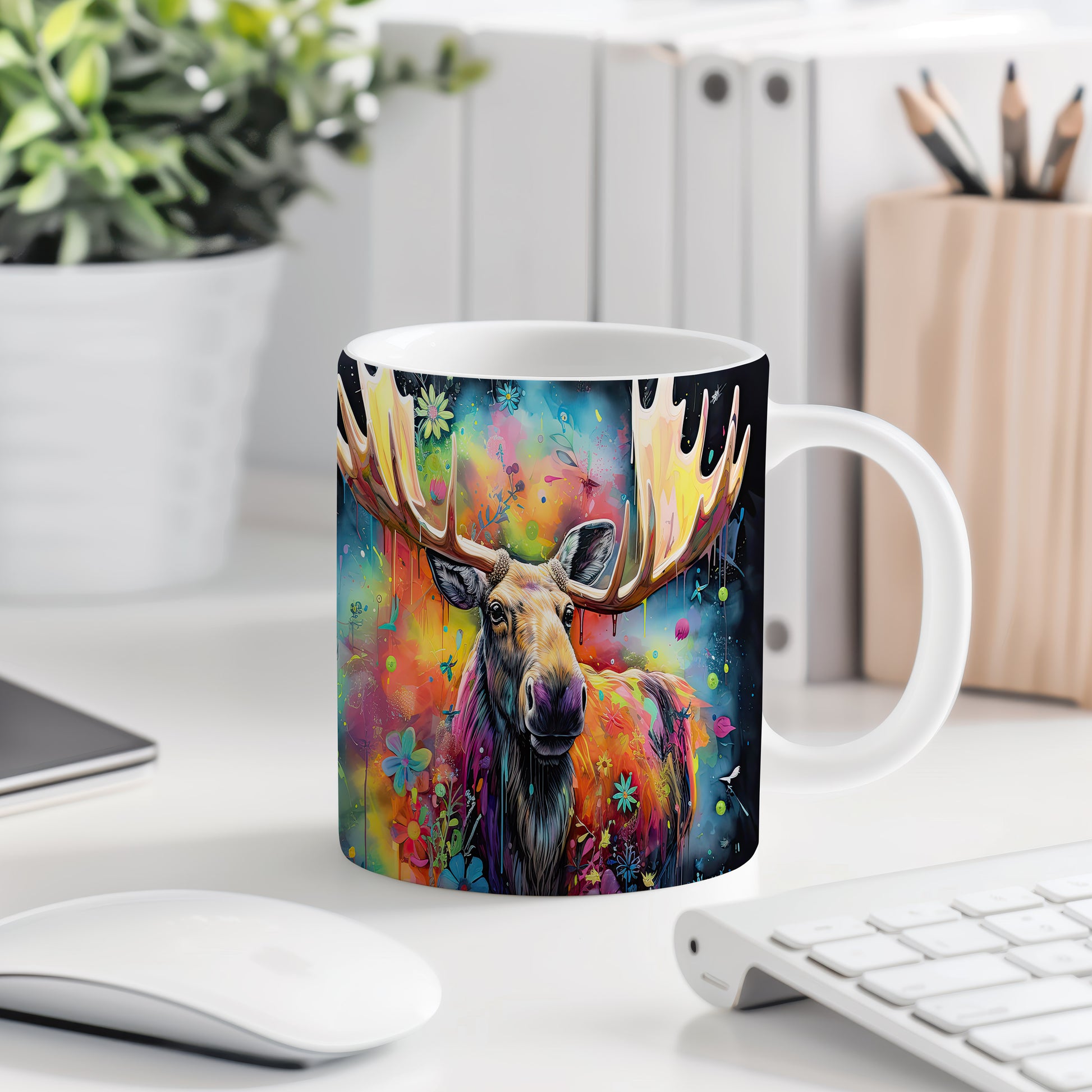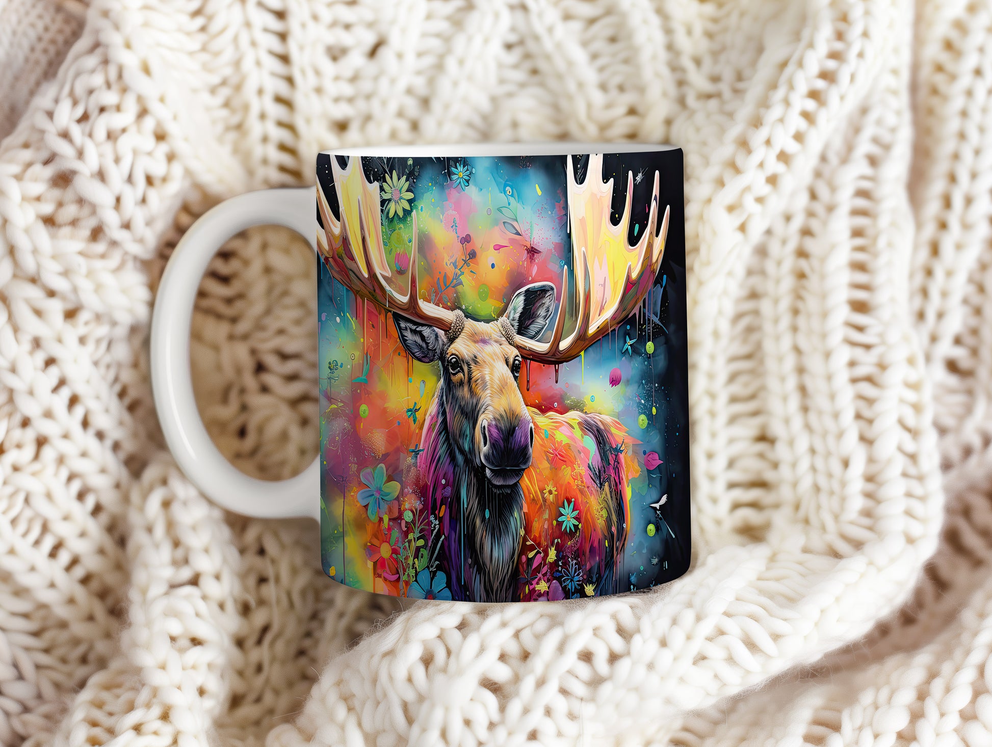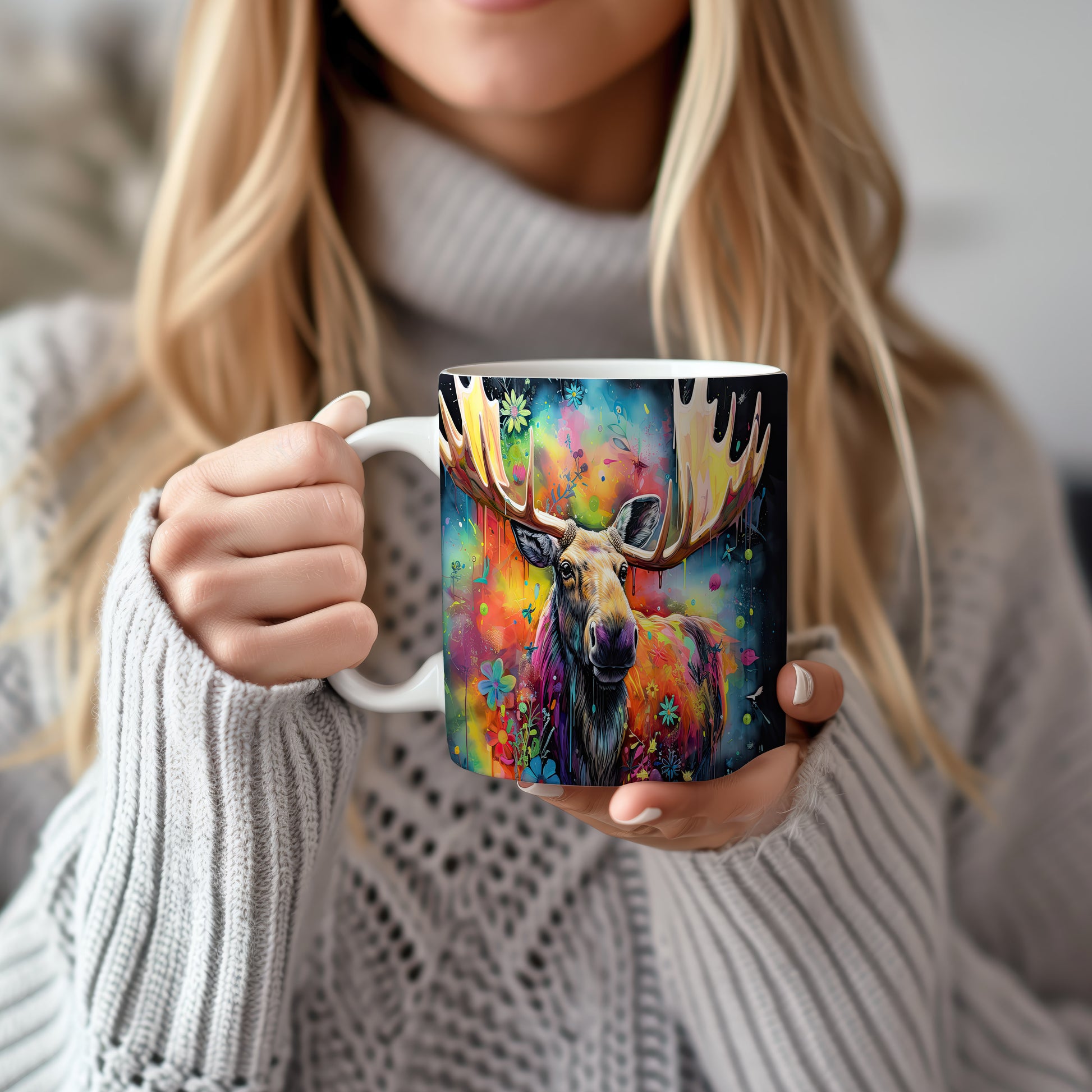 Tento hrnek s ilustrací losa obklopeného barevnými květinami je skvělým kouskem pro milovníky přírody a zvířat. Je ideální jako dárek pro přátele nebo rodinu, kteří ocení originální design. Materiál: keramika. Objem: 330 ml. Vhodné do myčky i mikrovlnky. Používání tohoto hrnku přináší radost z každého doušku.