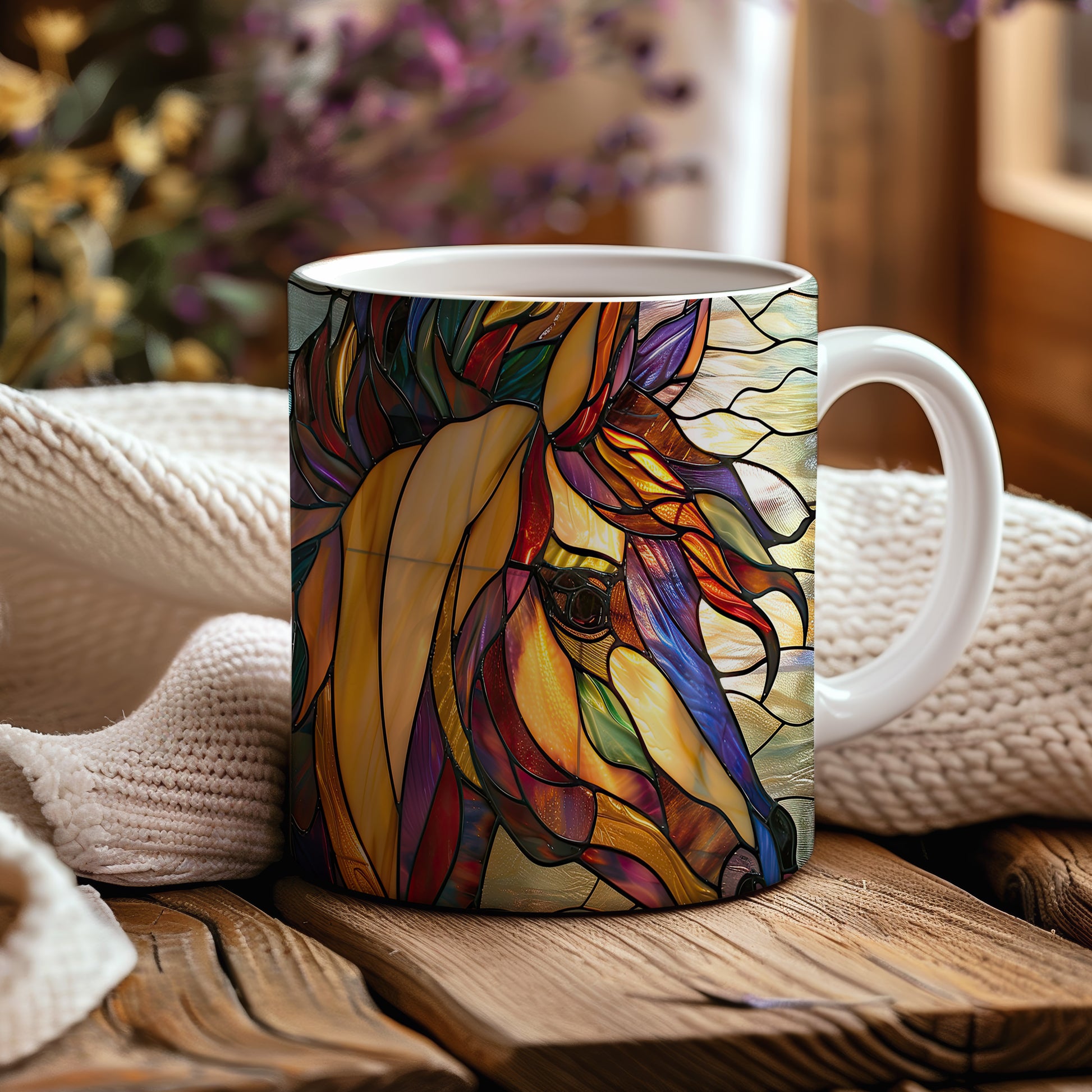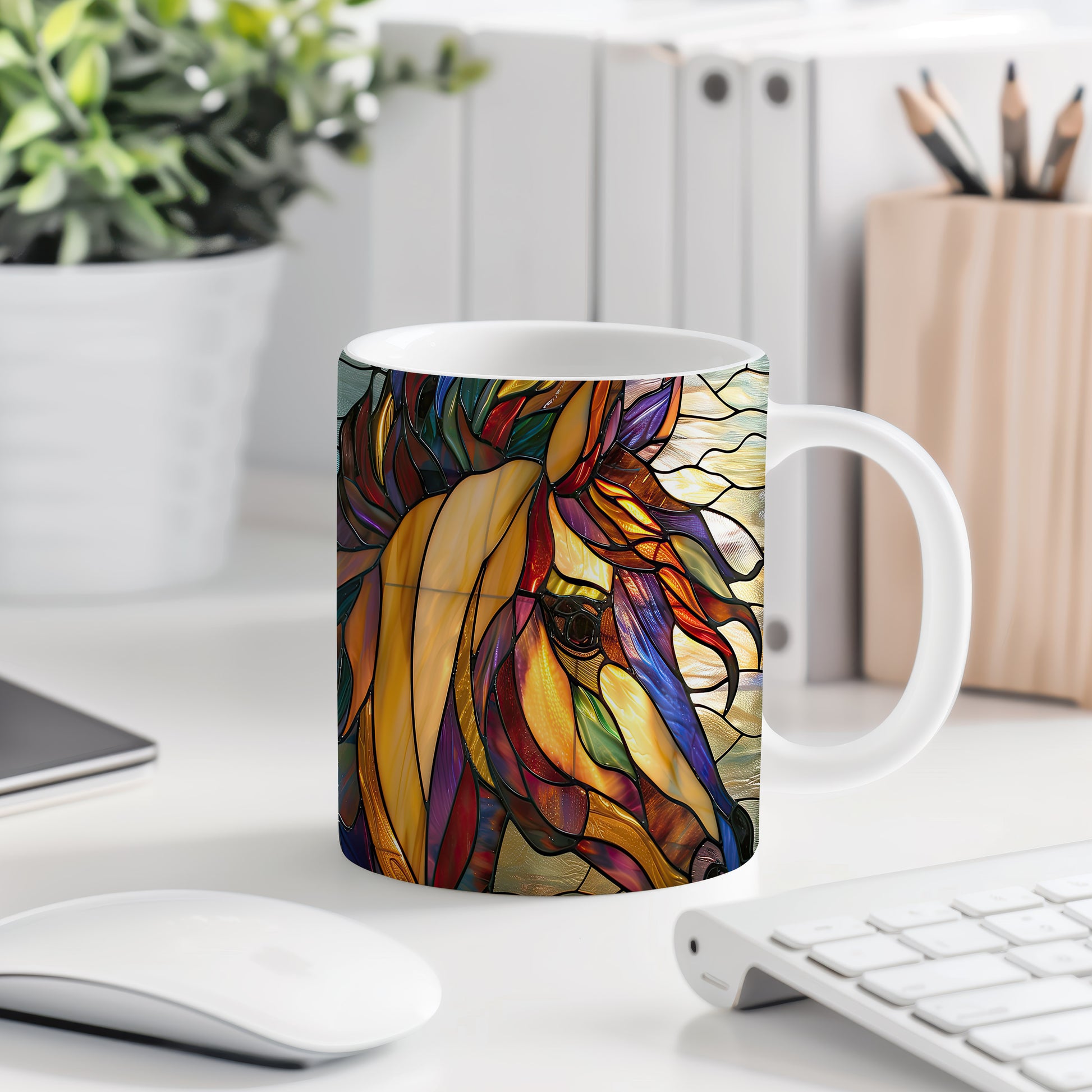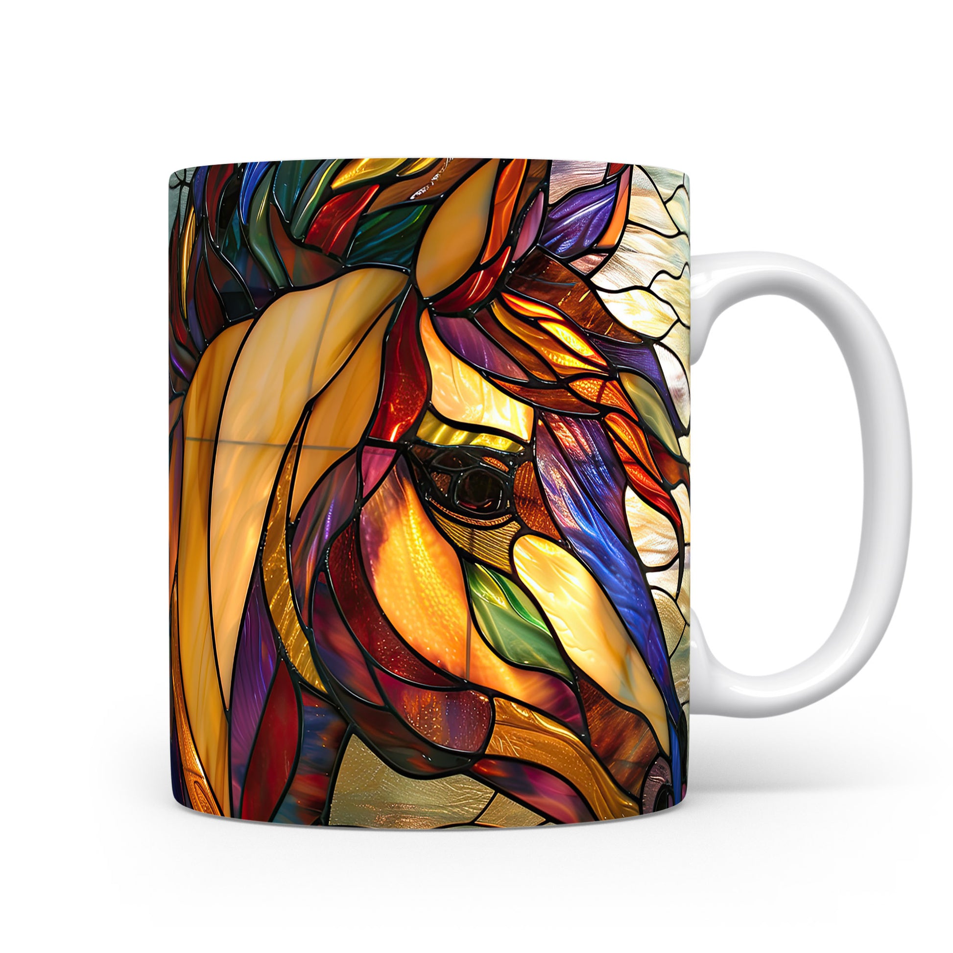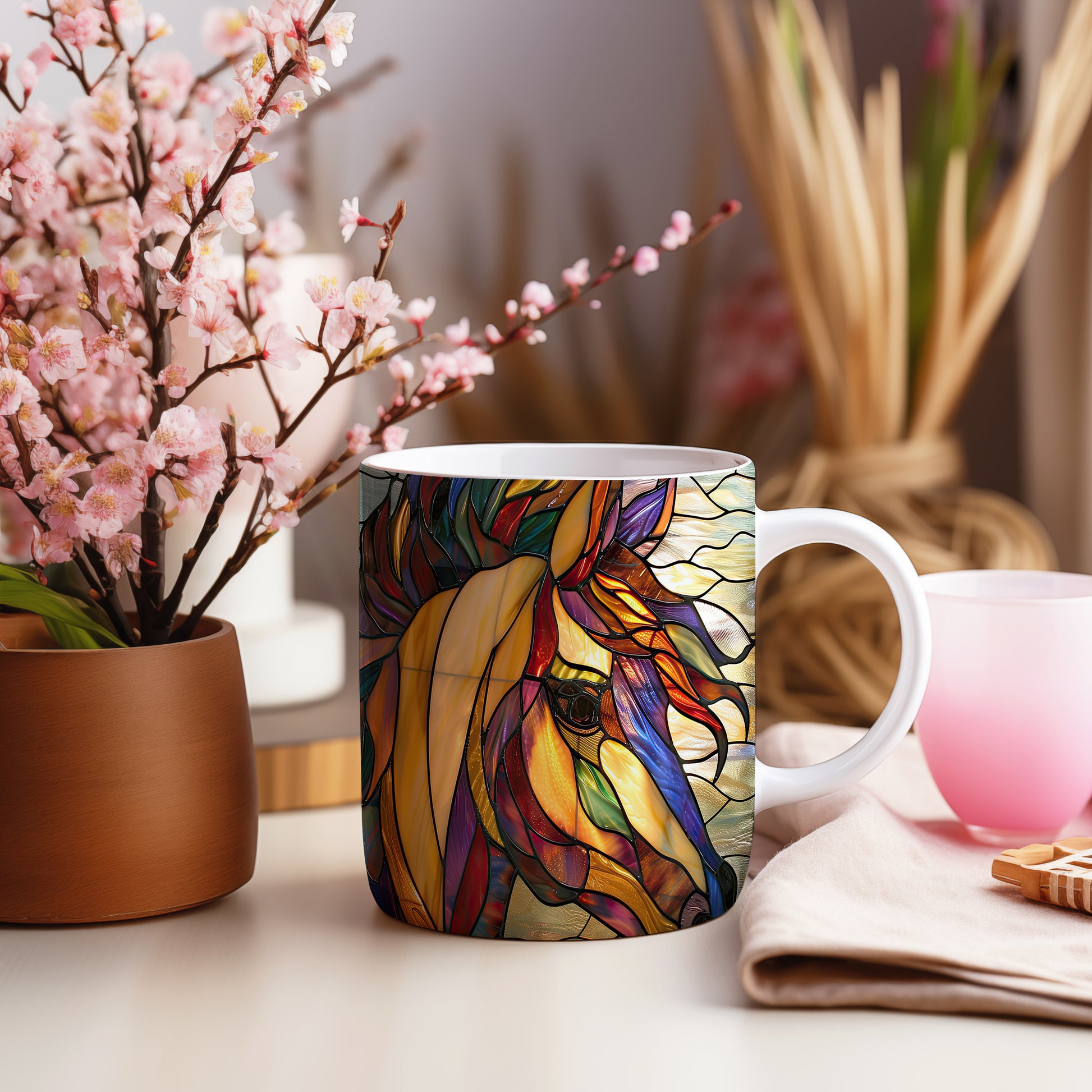 Tento keramický hrnek zobrazuje detailní motiv koně v živých barvách, evokující vitráž. Je ideální pro milovníky koní a skvělý dárek pro každého, kdo ocení stylové doplňky. Materiál: keramika. Objem: 330 ml. Vhodné do myčky i mikrovlnky. Používání tohoto hrnku přináší radost z každého doušku.