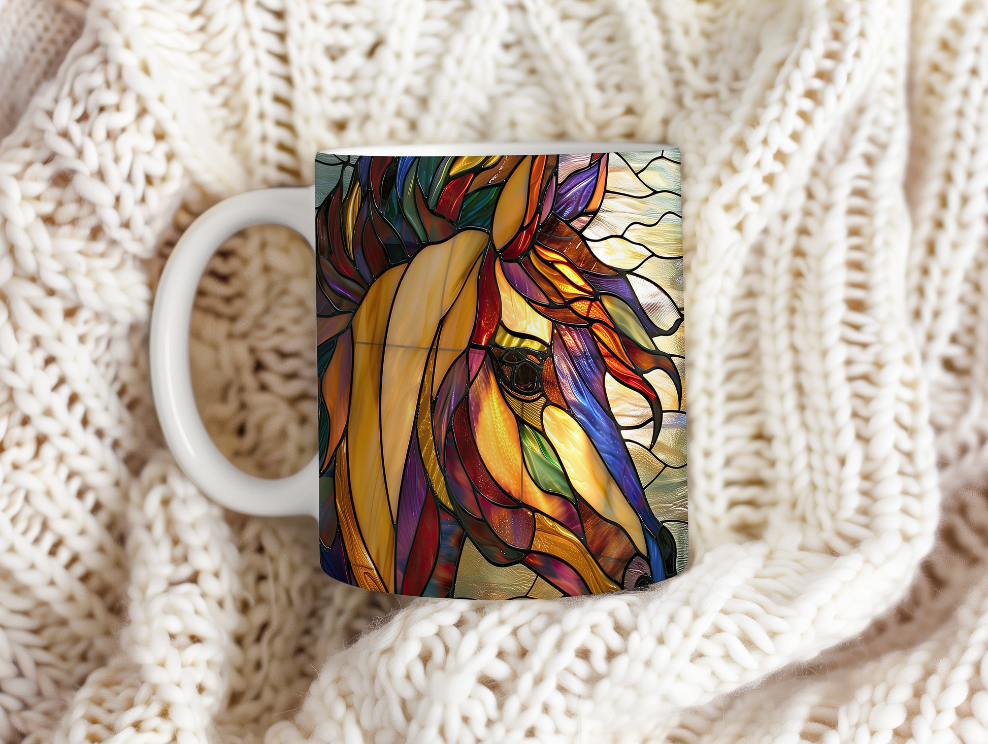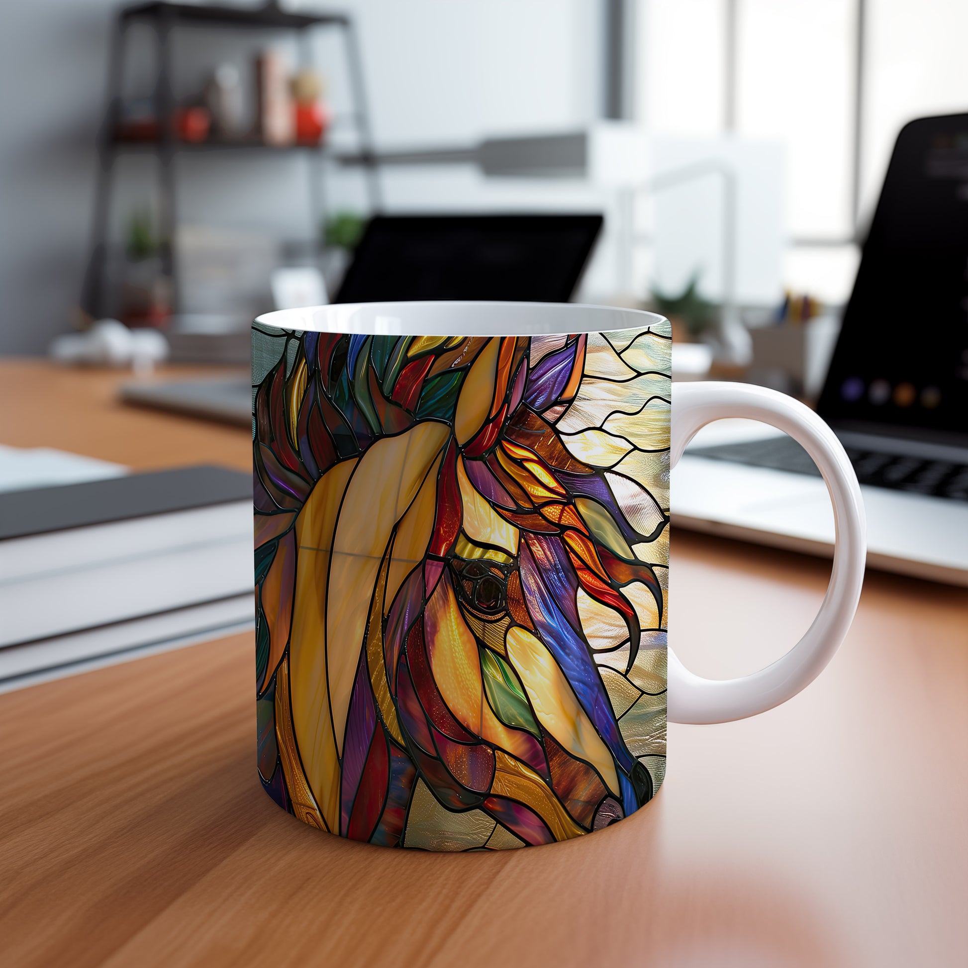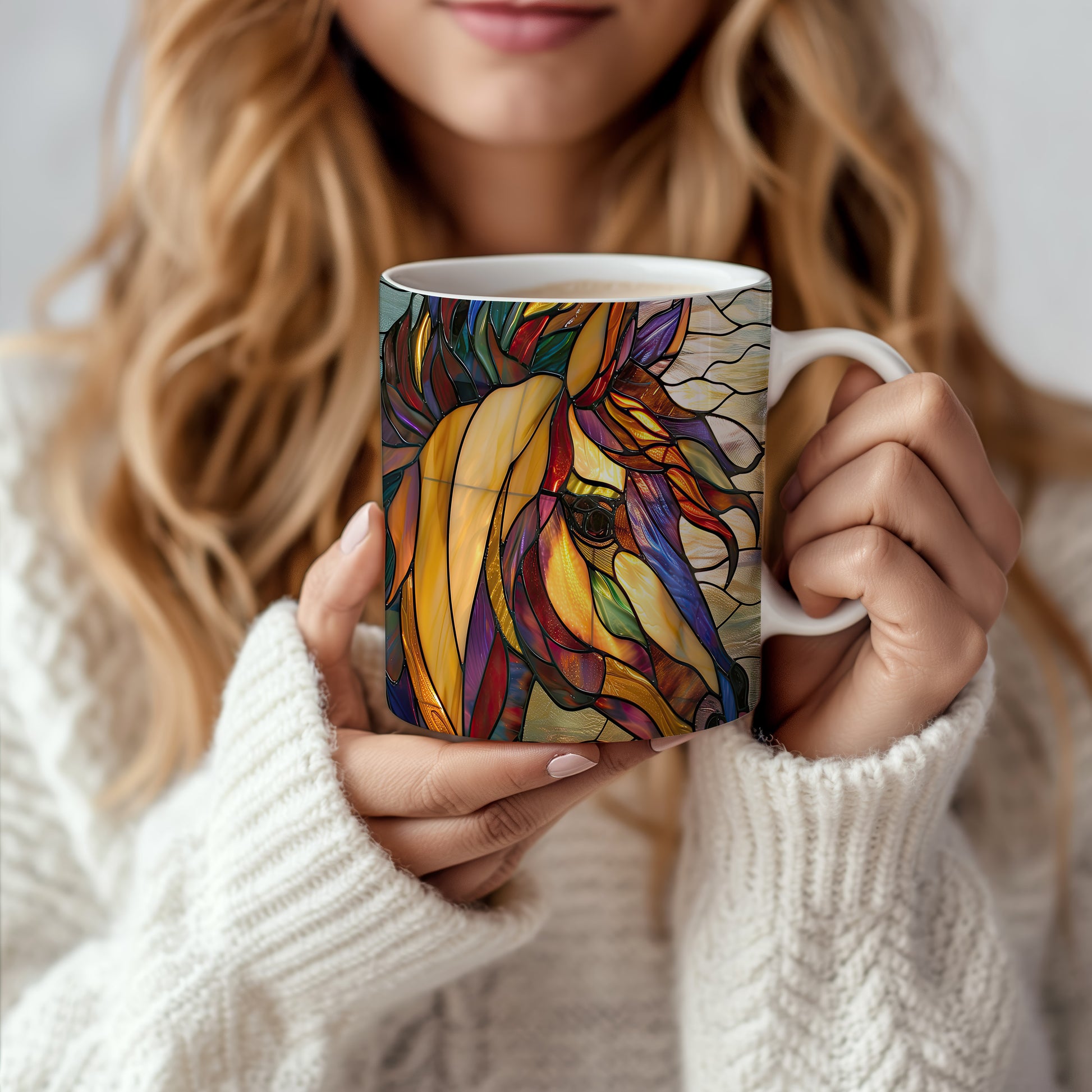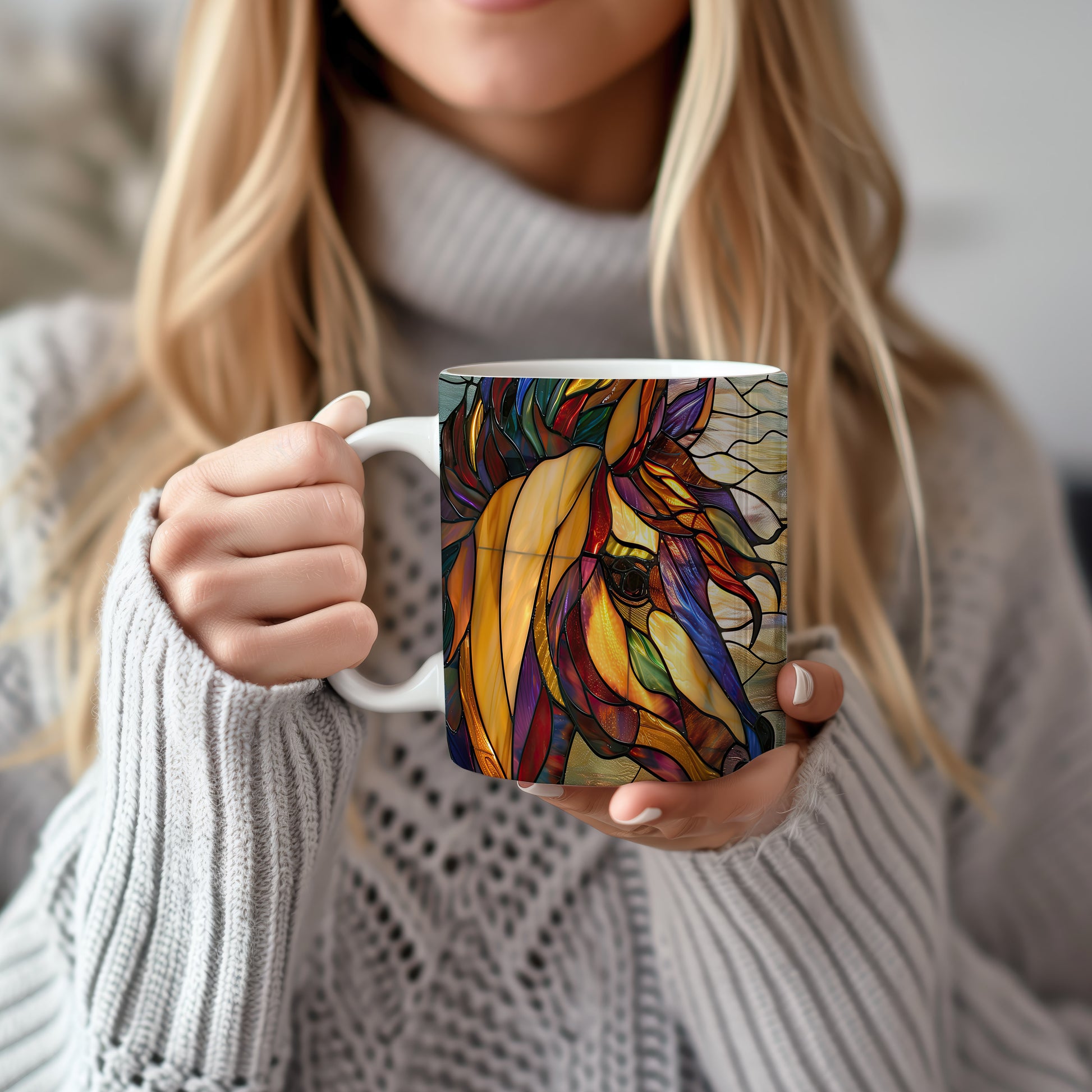 Tento keramický hrnek zobrazuje detailní motiv koně v živých barvách, evokující vitráž. Je ideální pro milovníky koní a skvělý dárek pro každého, kdo ocení stylové doplňky. Materiál: keramika. Objem: 330 ml. Vhodné do myčky i mikrovlnky. Používání tohoto hrnku přináší radost z každého doušku.