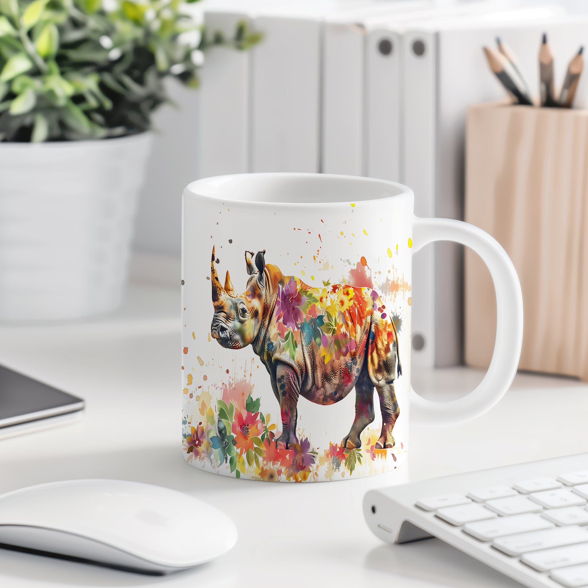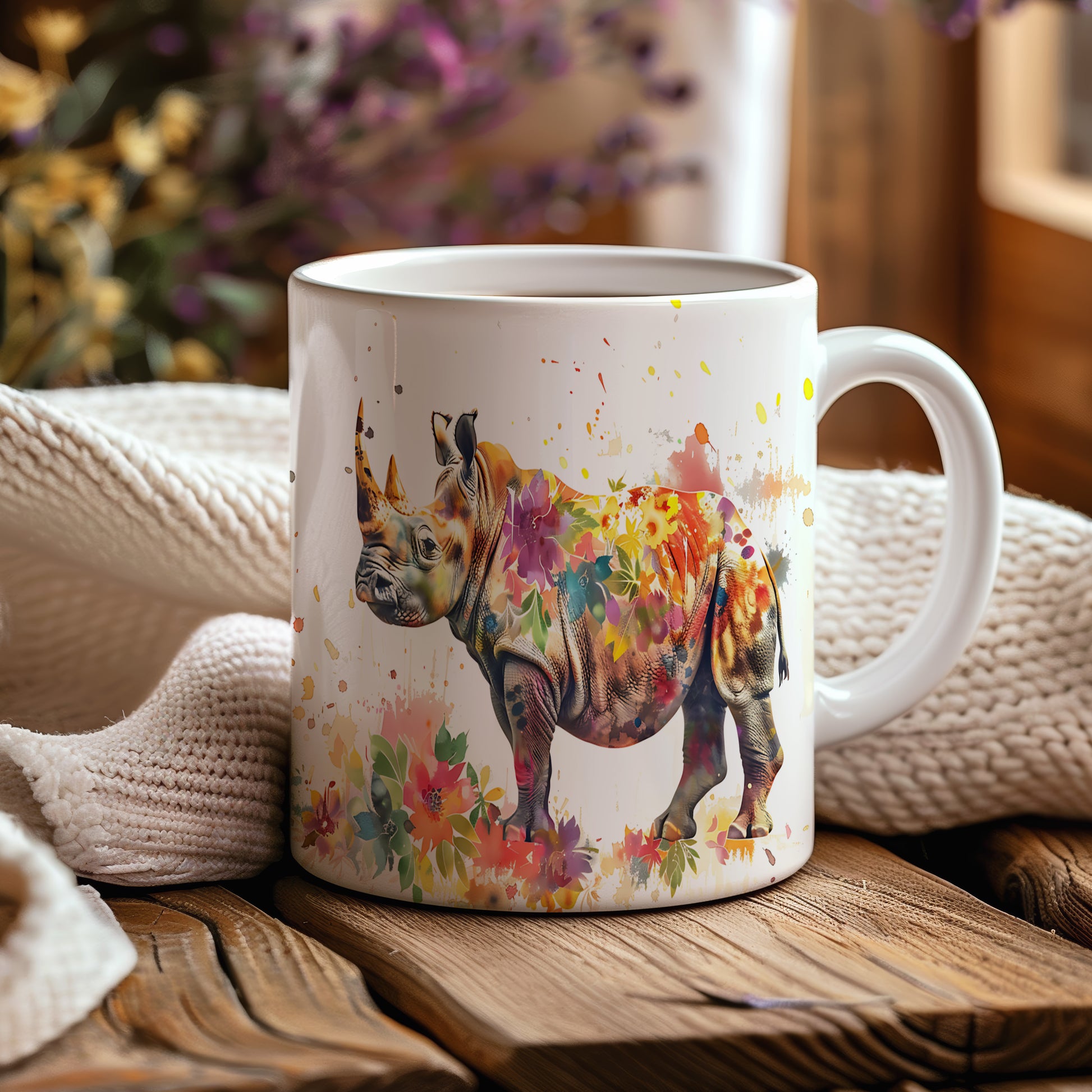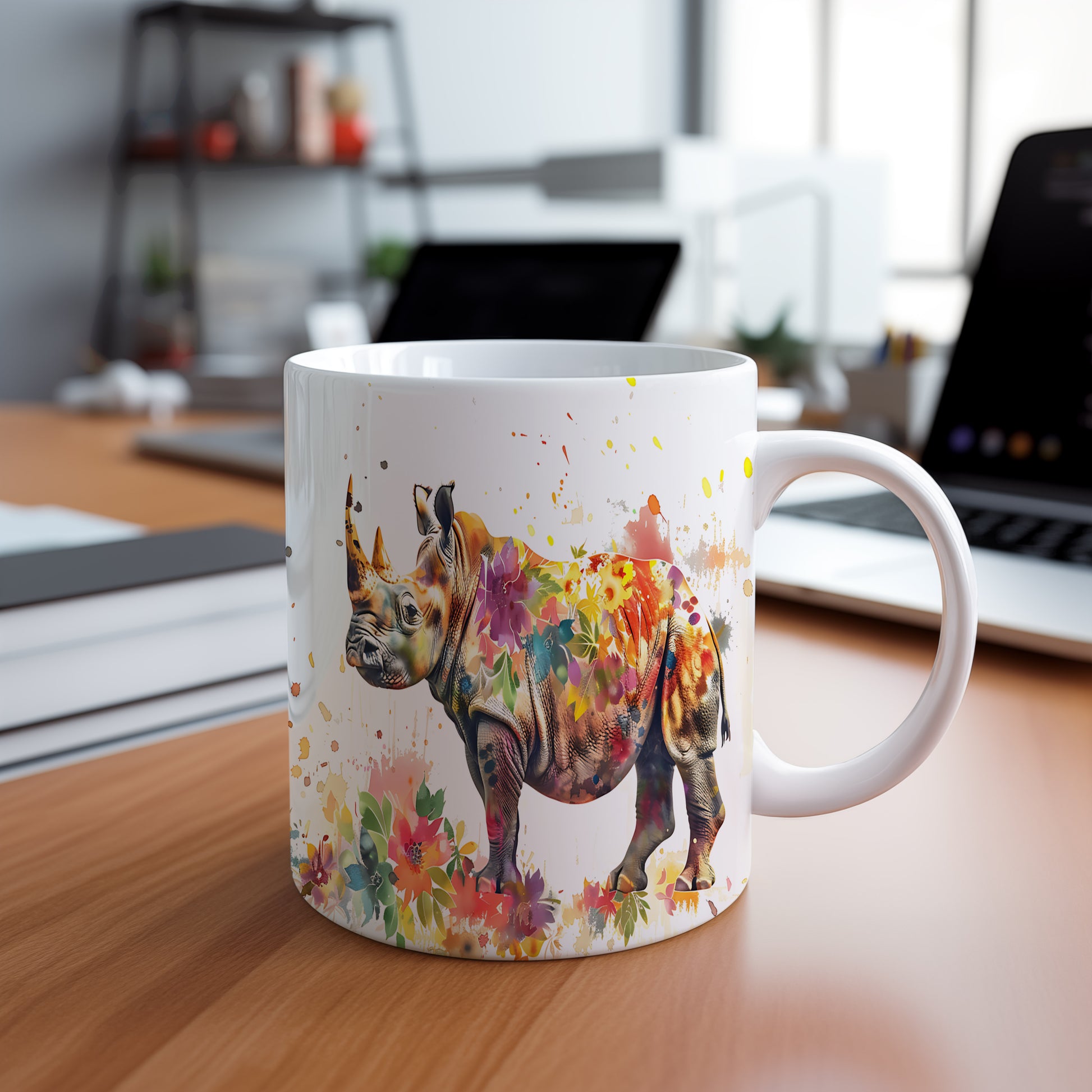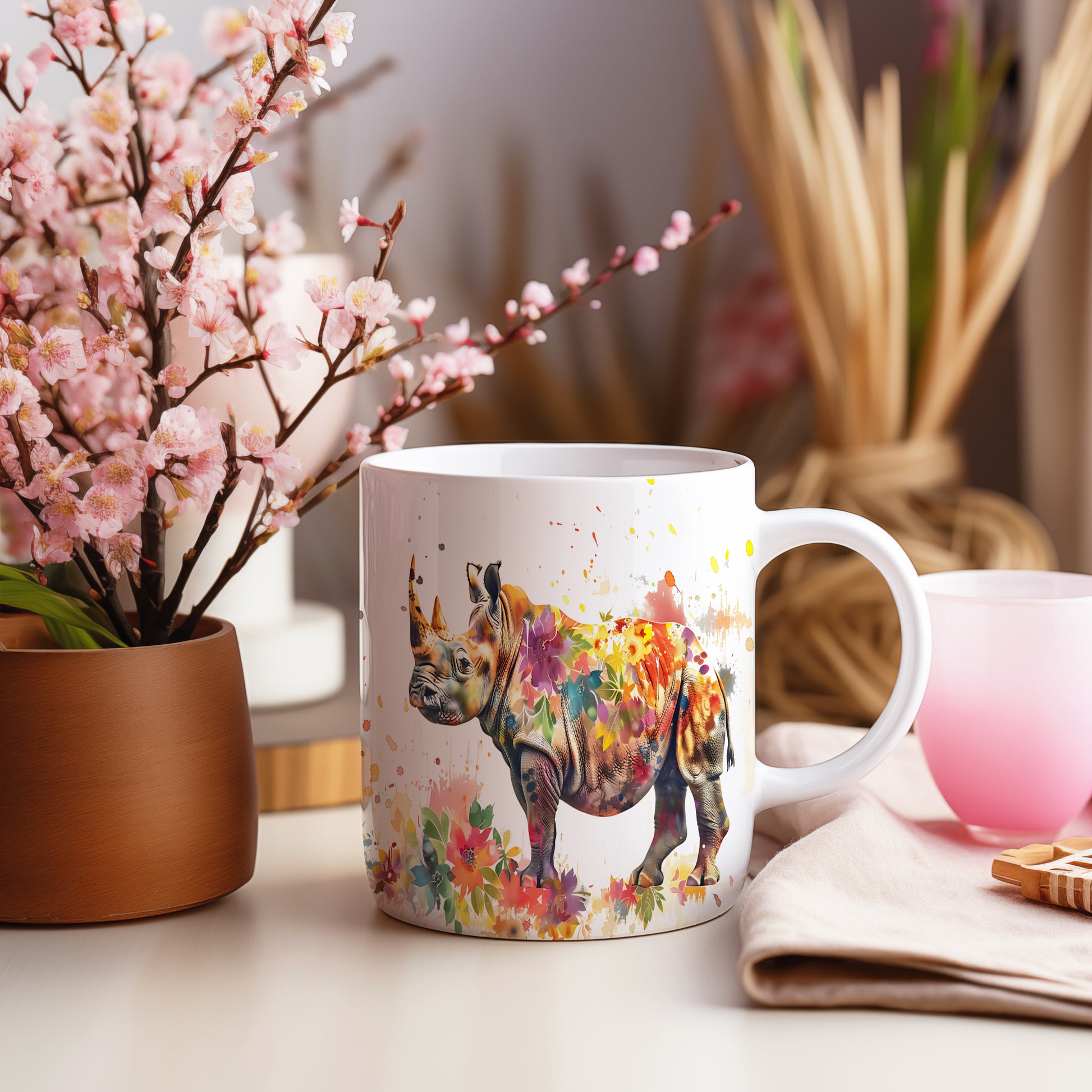 Hrnek s barevným nosorožcem a květinovým vzorem je skvělým kouskem pro milovníky přírody a zvířat. Tento hrnek je ideální jako dárek pro přátele nebo rodinu, kteří ocení originální design. Materiál: keramika. Objem: 330 ml. Vhodné do myčky i mikrovlnky. Používáním tohoto hrnku si užijete nejen kávu nebo čaj, ale také příjemný pohled na veselý motiv.