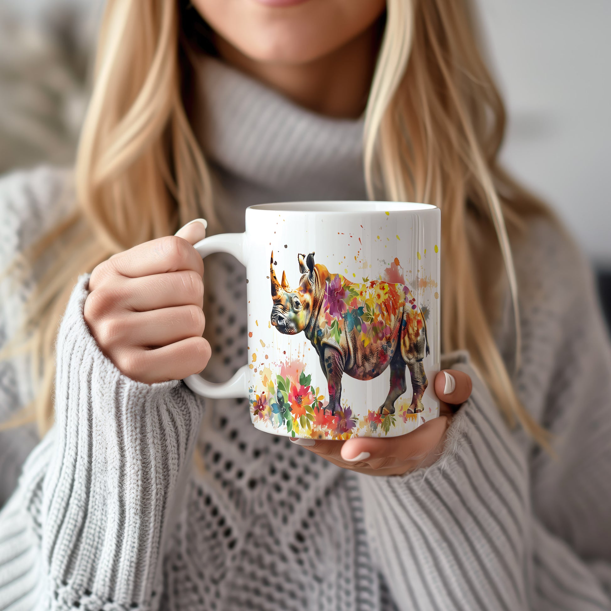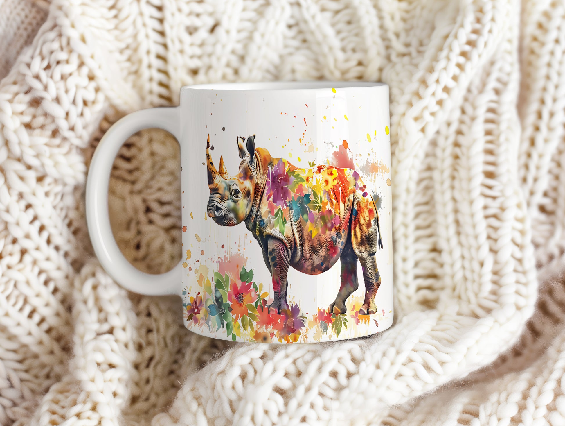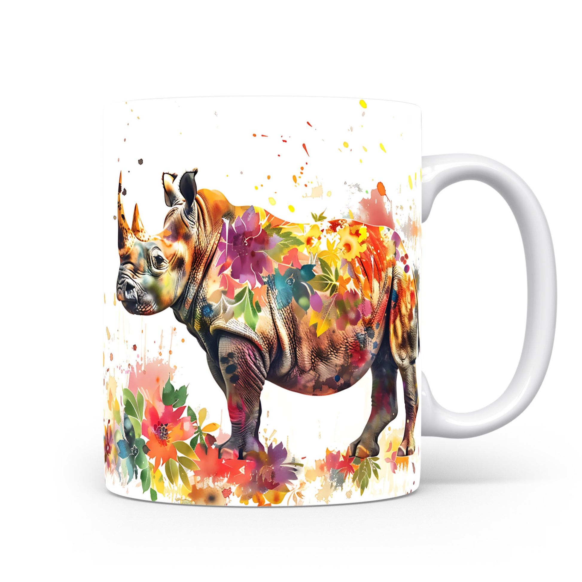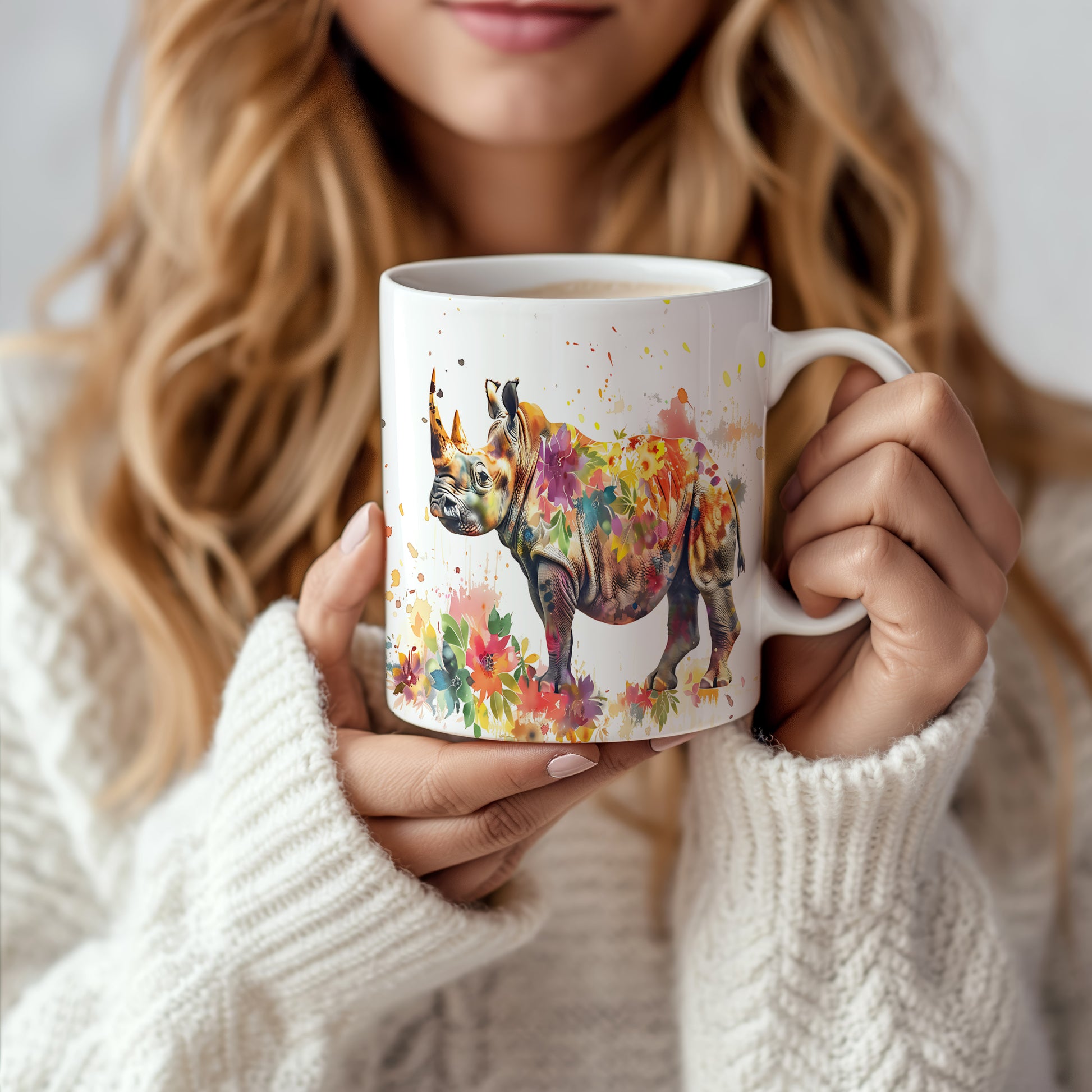 Hrnek s barevným nosorožcem a květinovým vzorem je skvělým kouskem pro milovníky přírody a zvířat. Tento hrnek je ideální jako dárek pro přátele nebo rodinu, kteří ocení originální design. Materiál: keramika. Objem: 330 ml. Vhodné do myčky i mikrovlnky. Používáním tohoto hrnku si užijete nejen kávu nebo čaj, ale také příjemný pohled na veselý motiv.