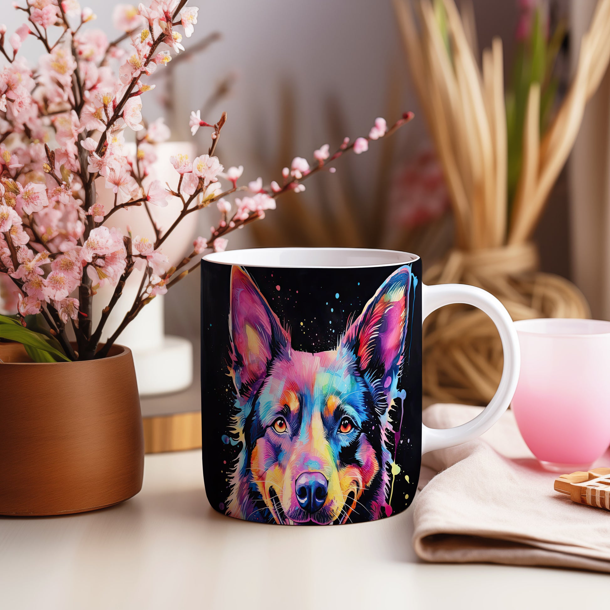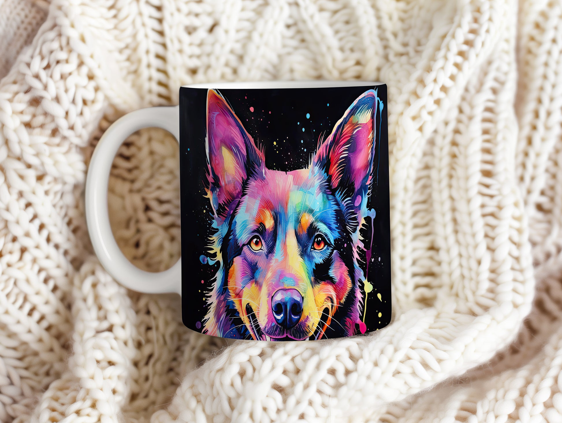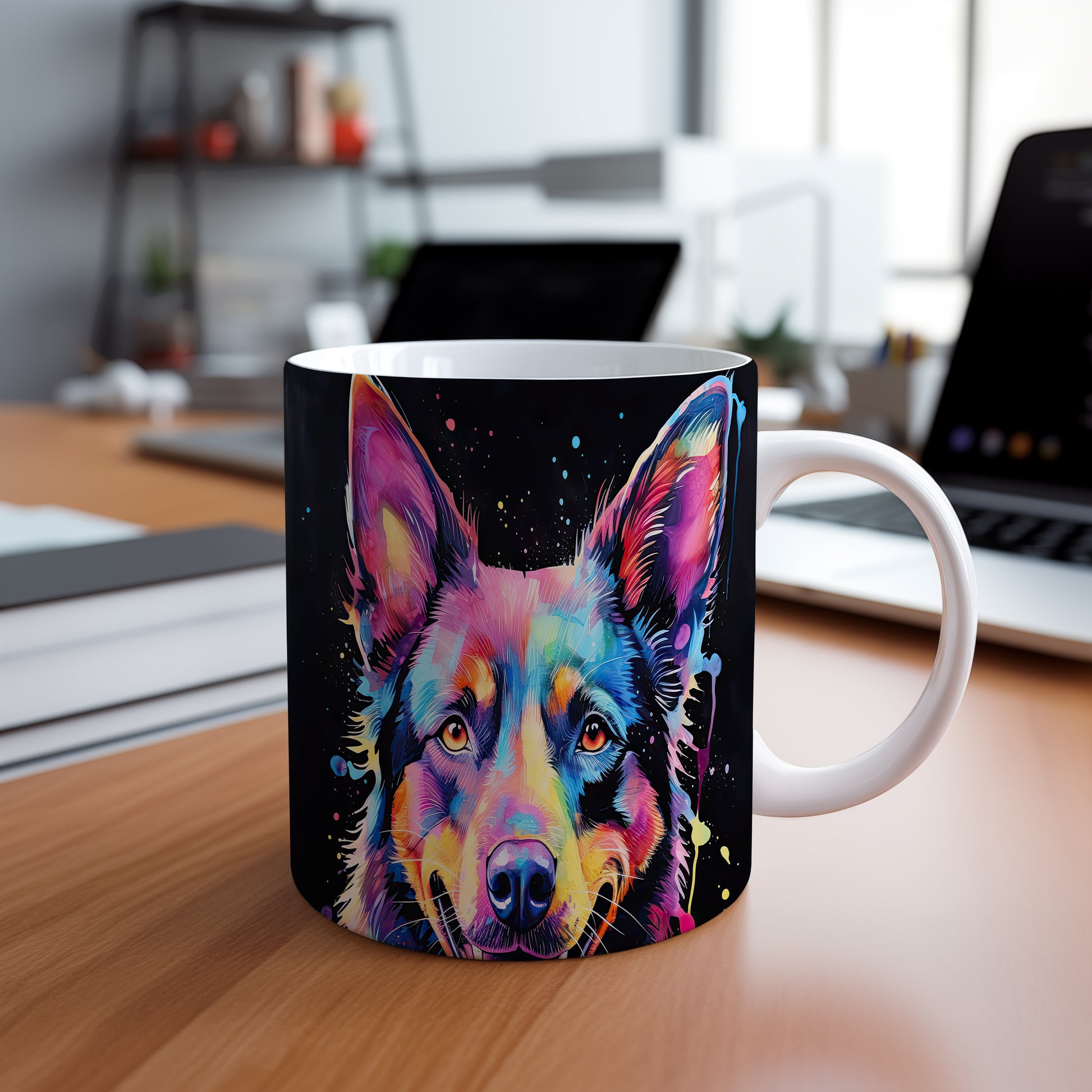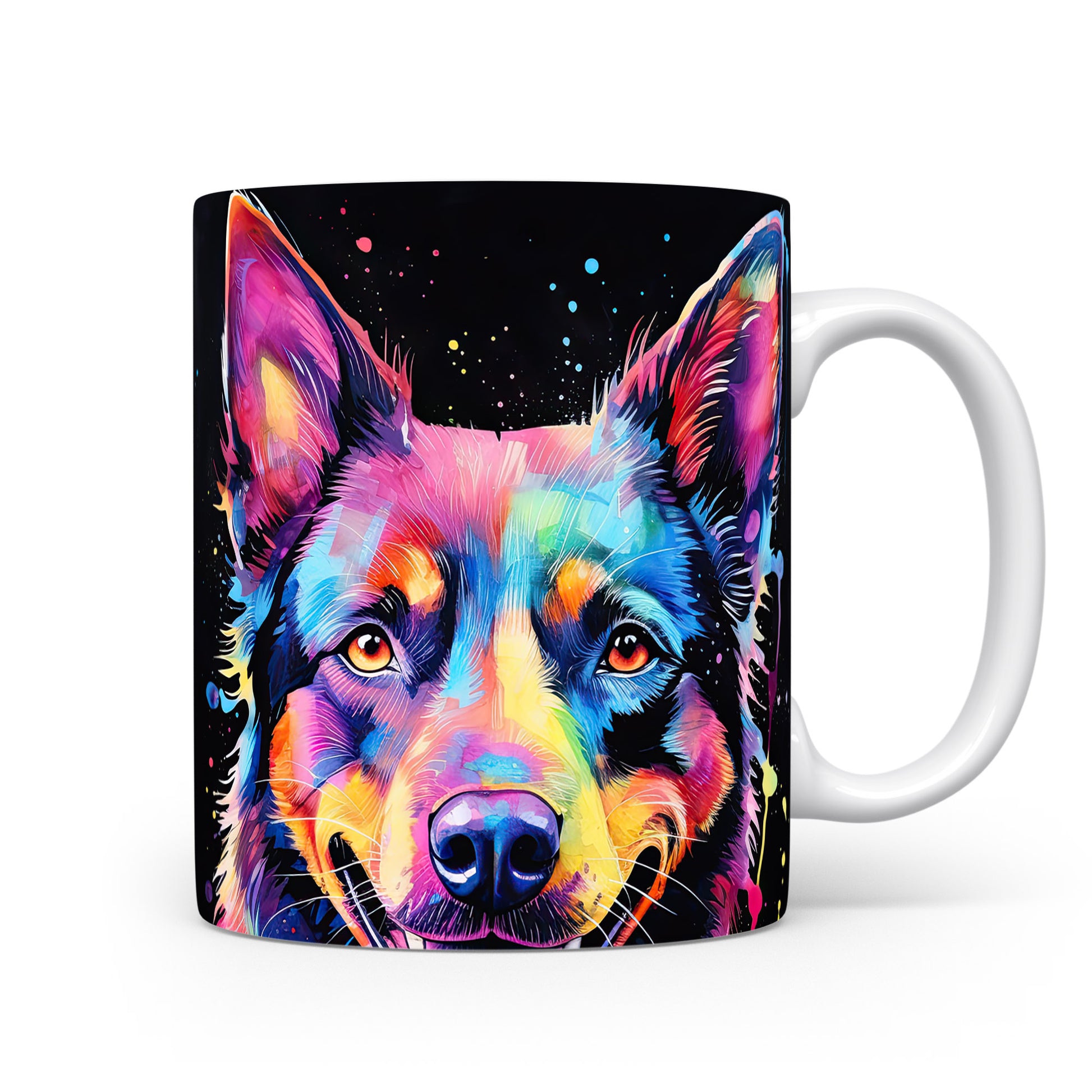 Hrnek s barevným ovčákem na černém pozadí