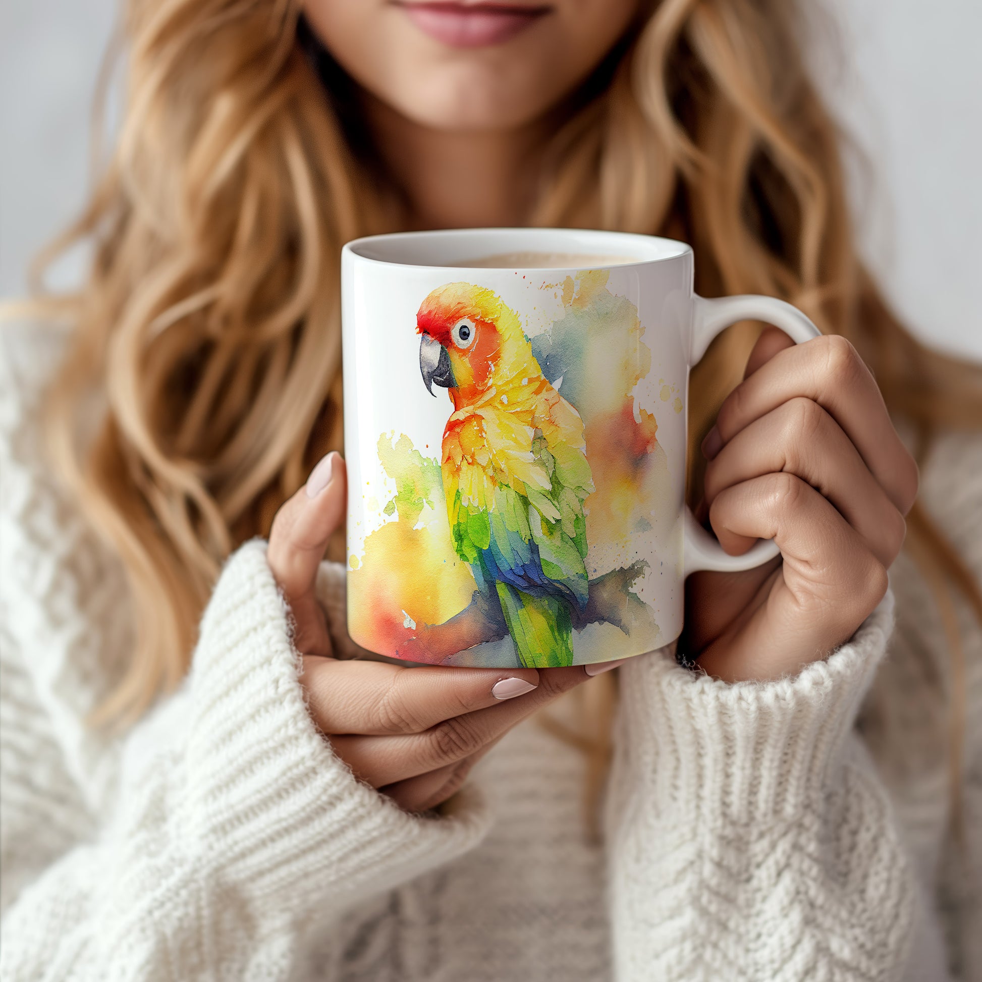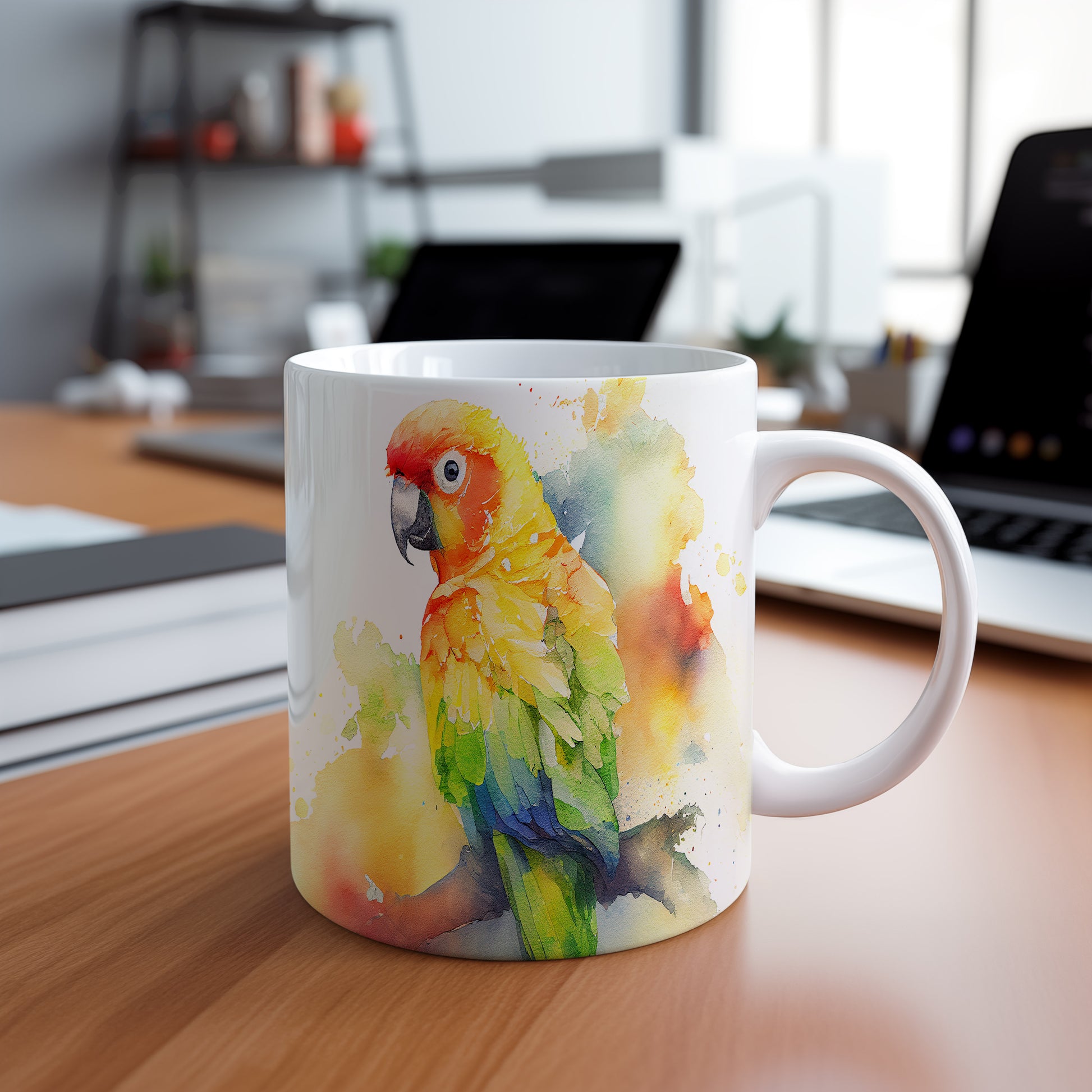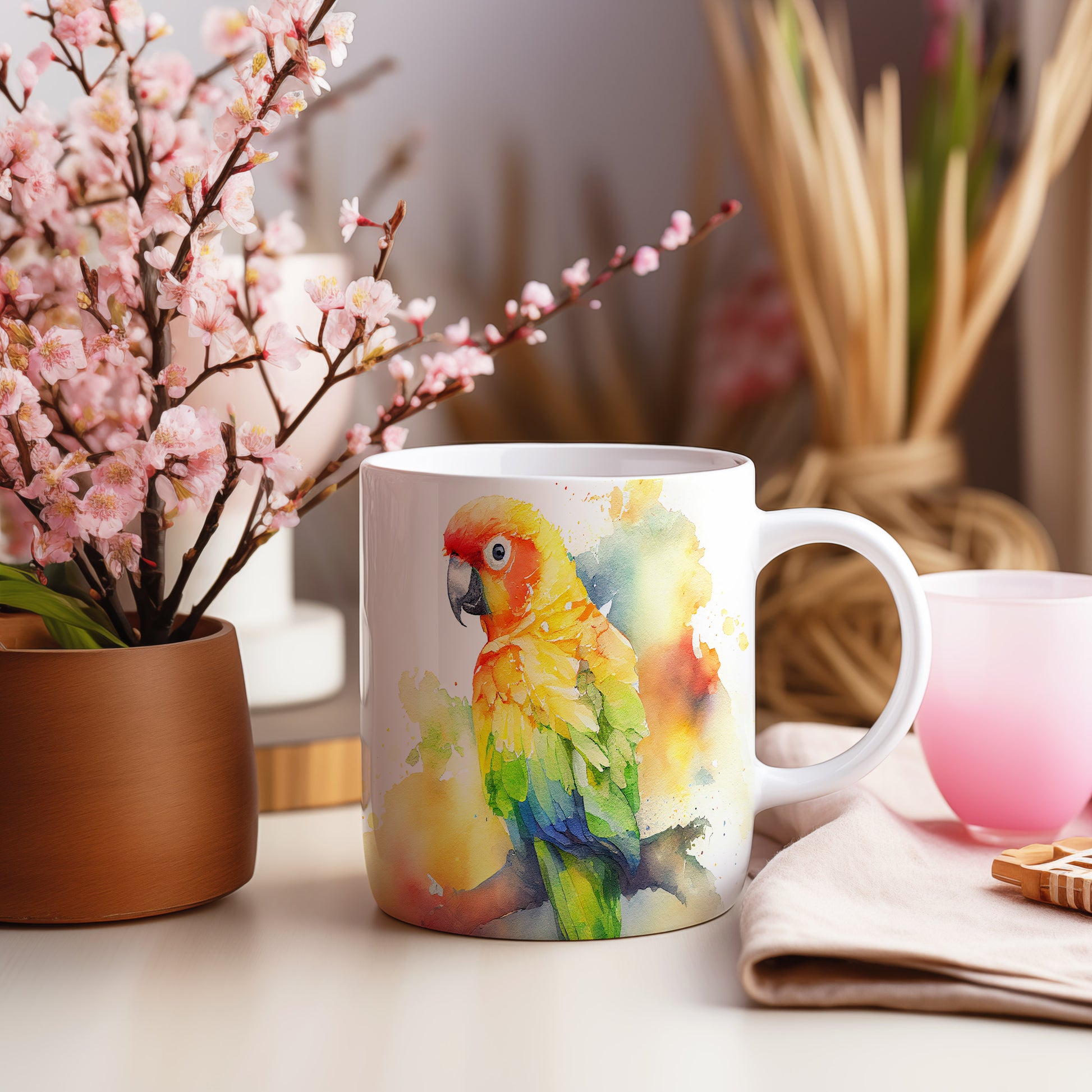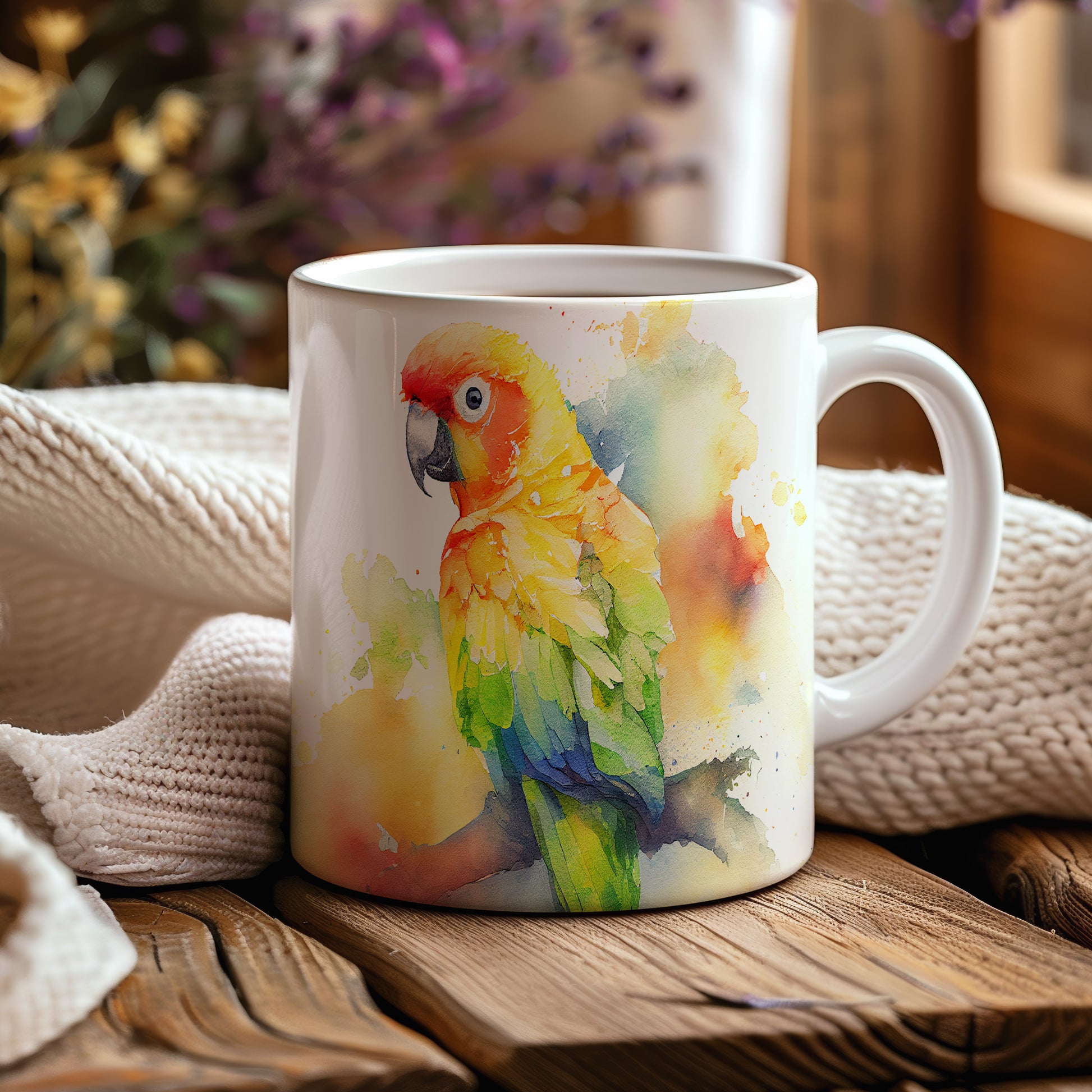Tento hrnek zobrazuje krásného papouška v živých akvarelových barvách. Je ideální pro milovníky exotických ptáků a skvělým dárkem pro přátele či rodinu. Materiál: keramika. Objem: 330 ml. Vhodné do myčky i mikrovlnky. Užijte si každé sousto s tímto uměleckým kouskem, který přinese do vašeho dne radost a barevnost.