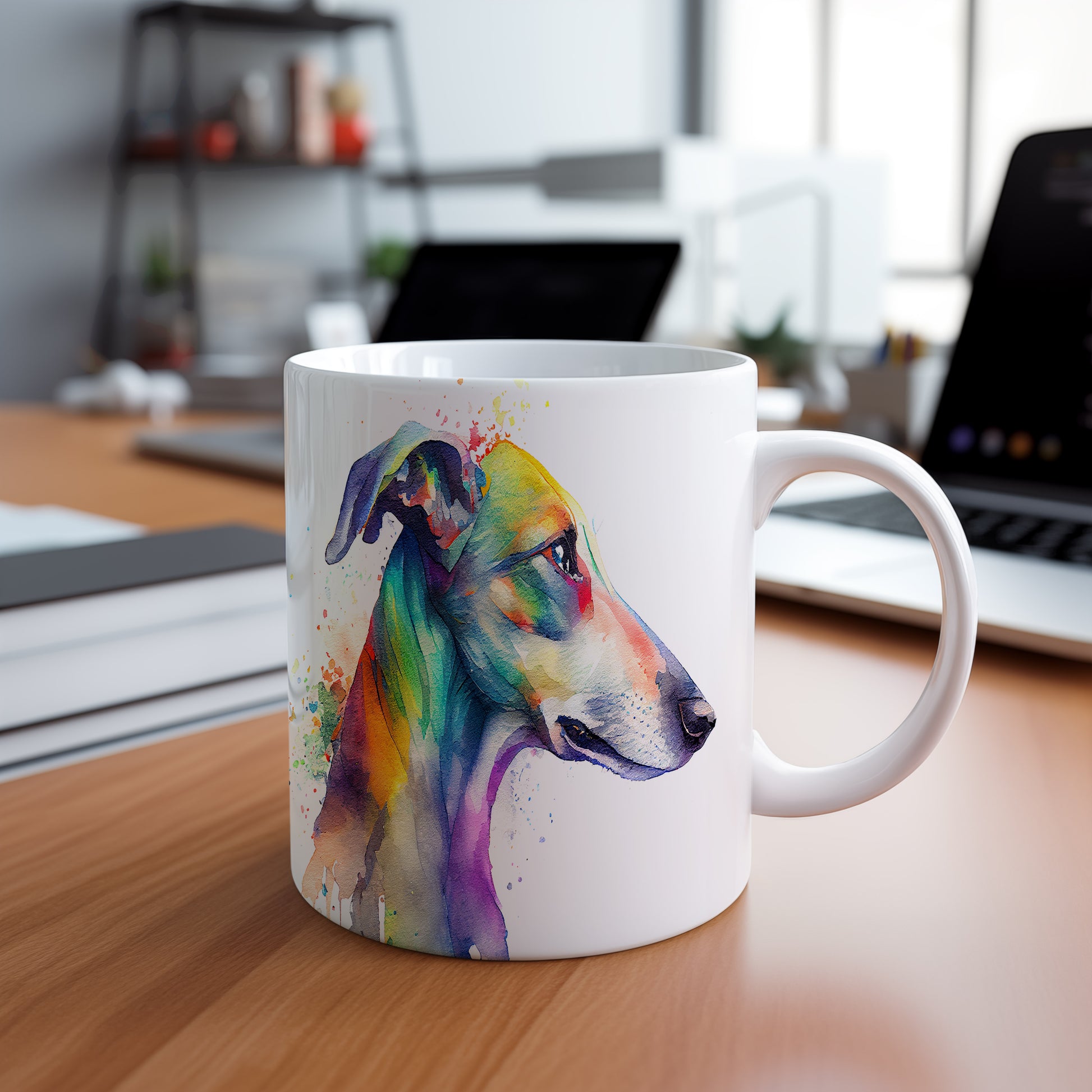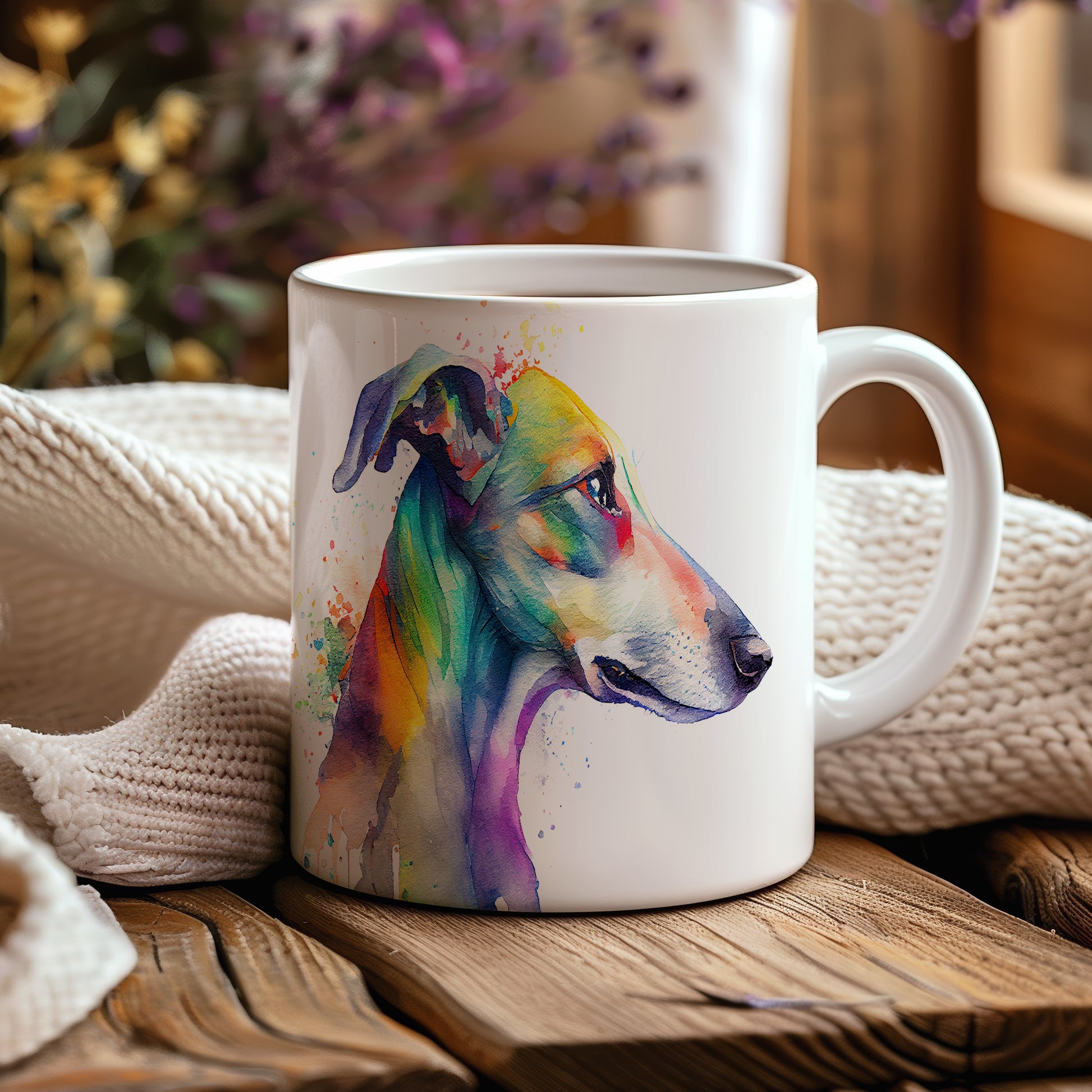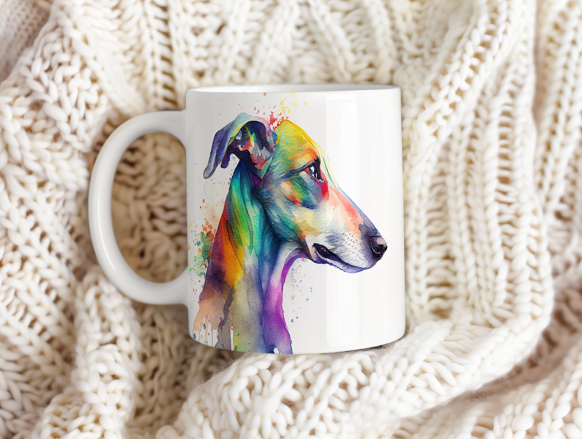 Hrnek s barevným portrétem chrta – v modrých tónech