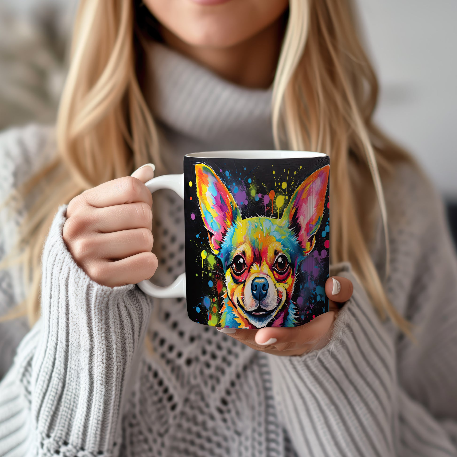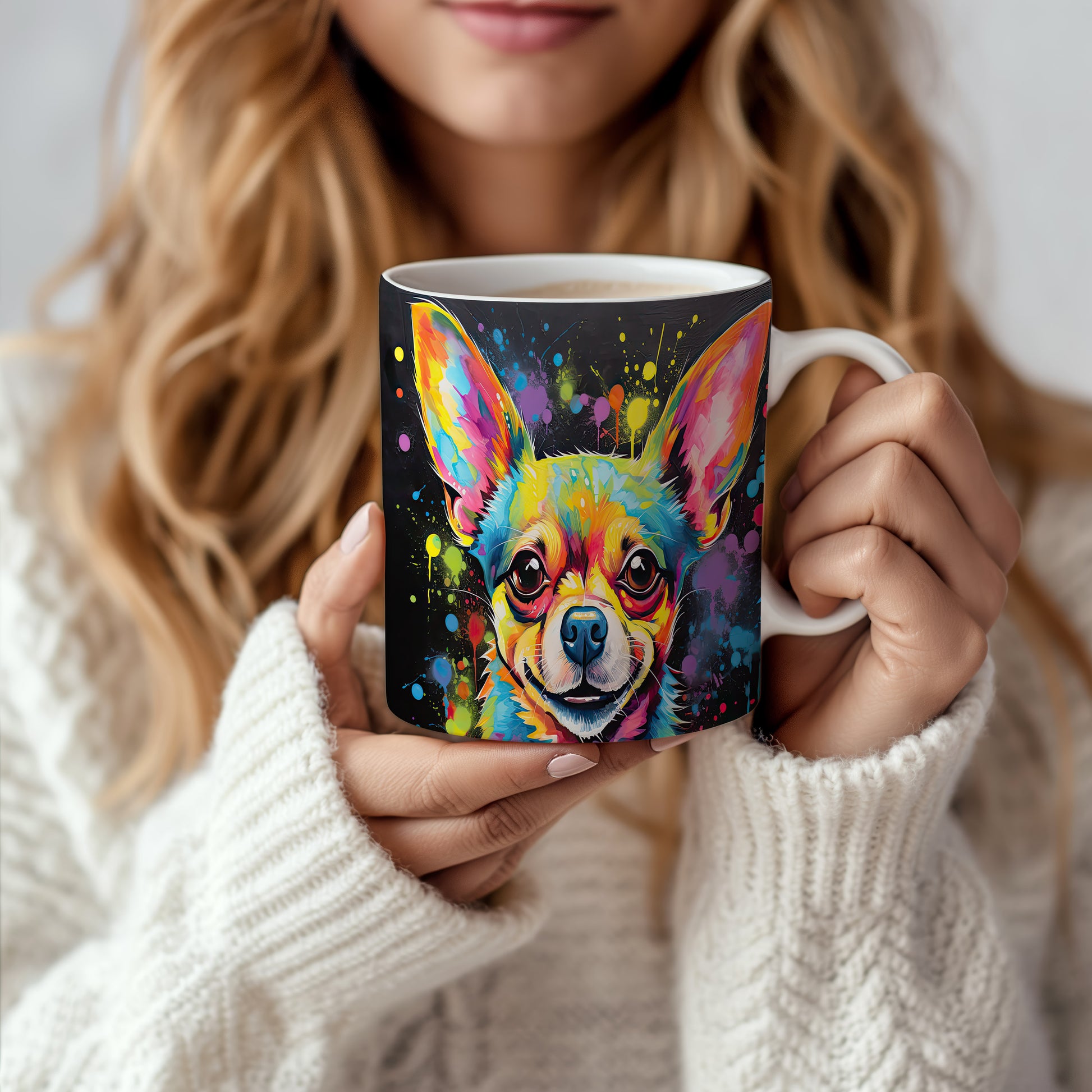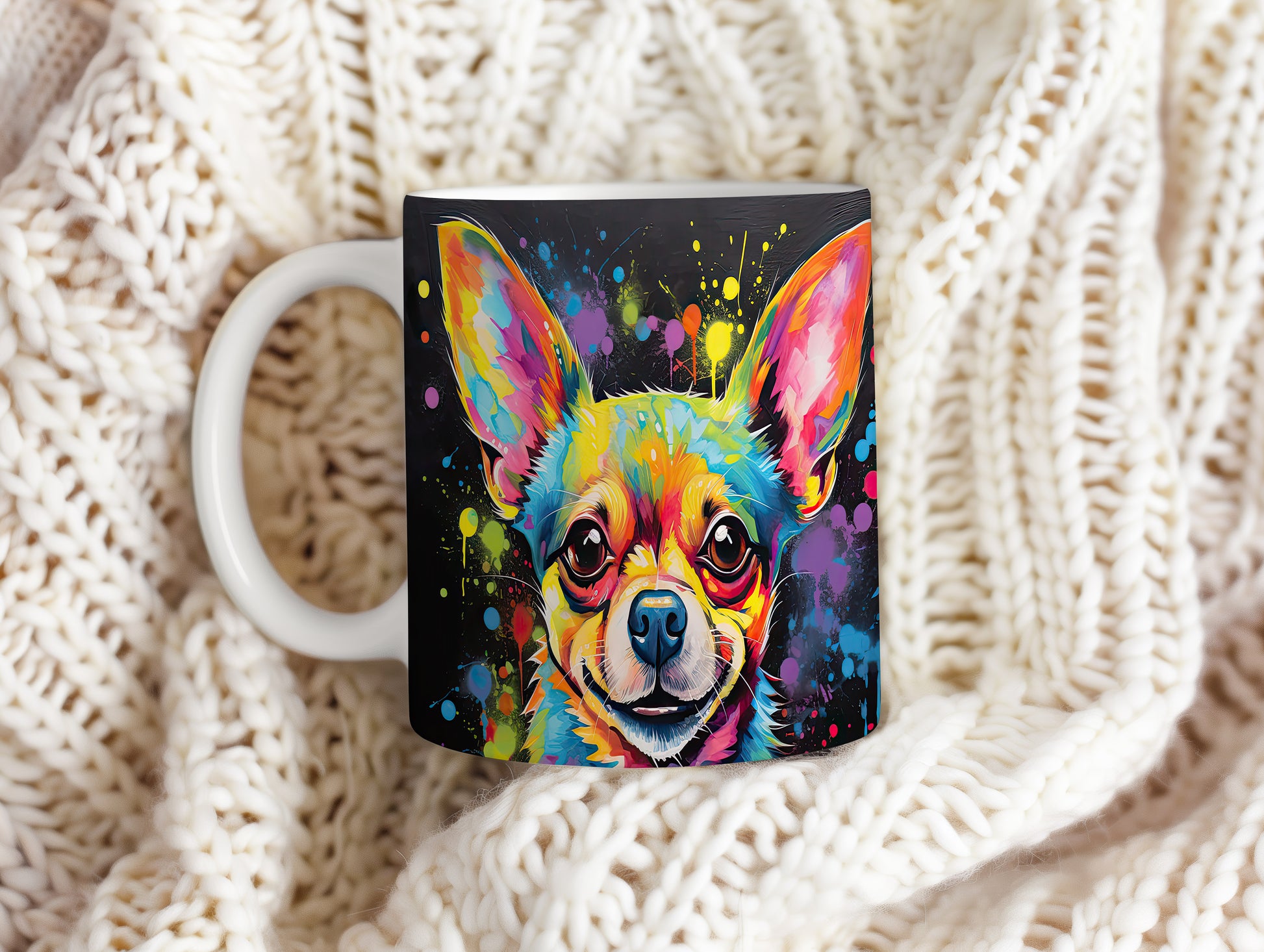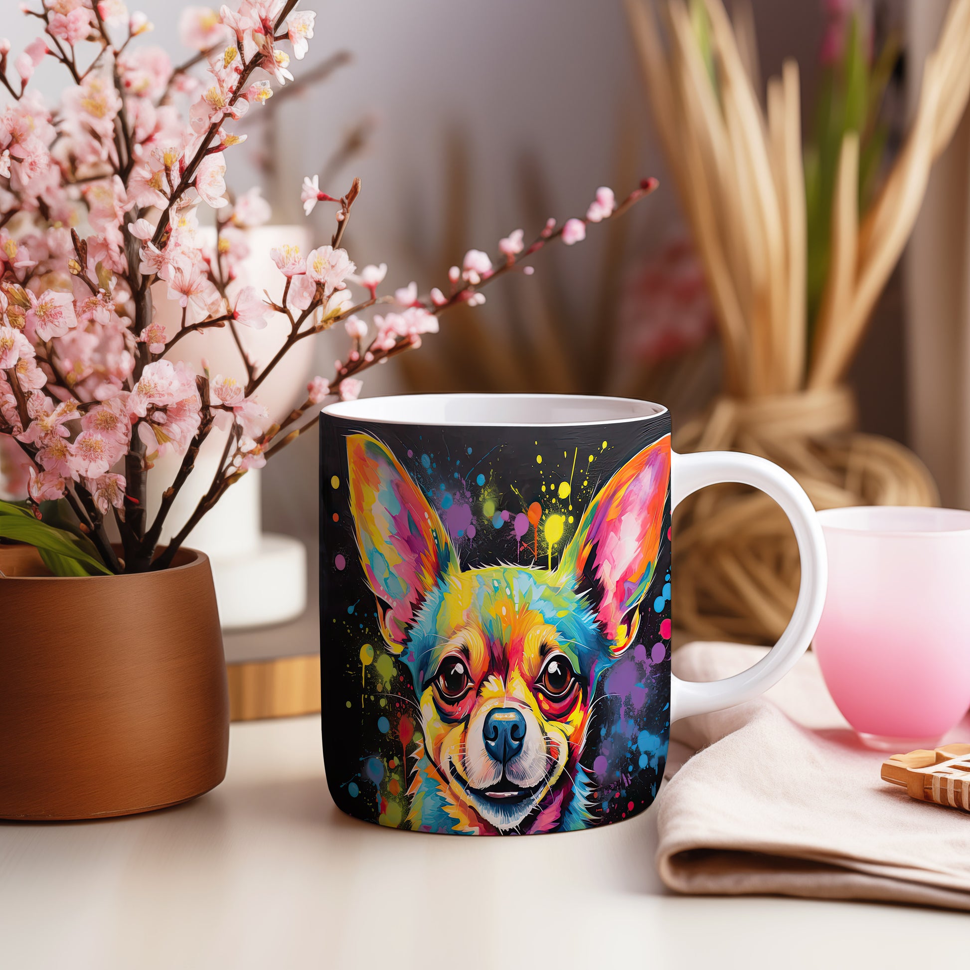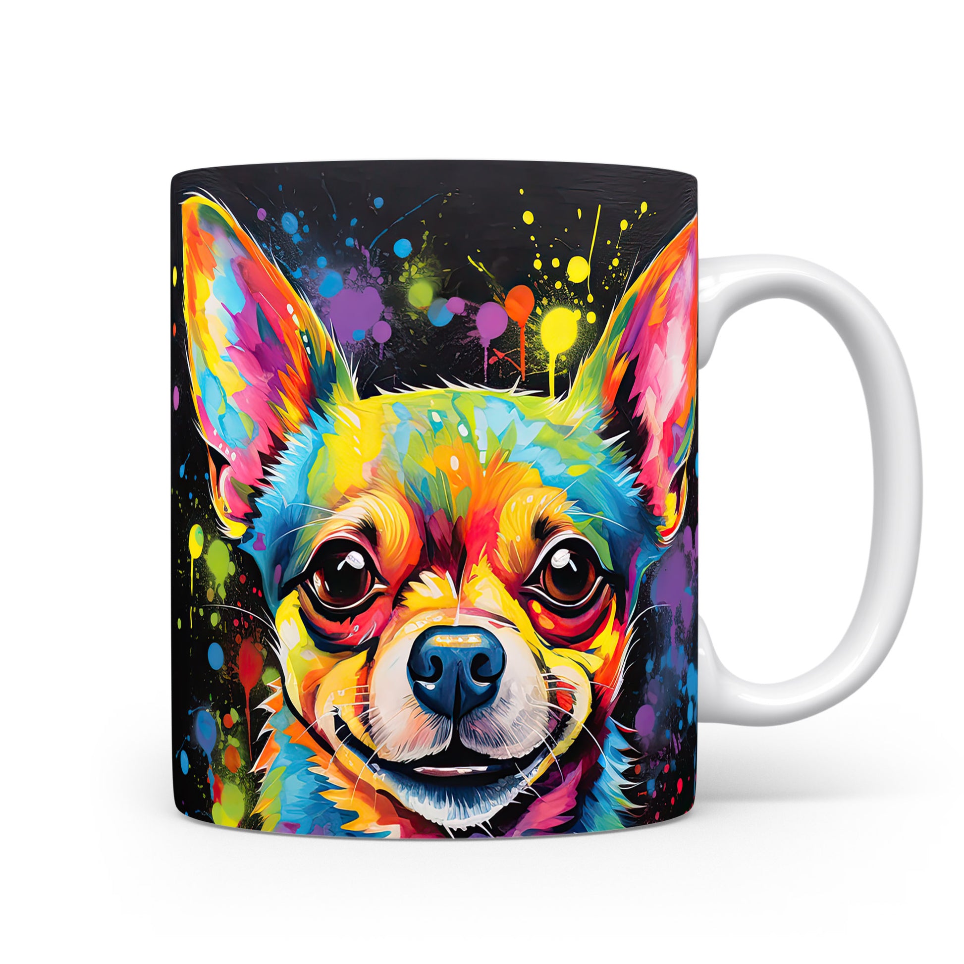 Hrnek s barevným portrétem čivavy – černým akcentem