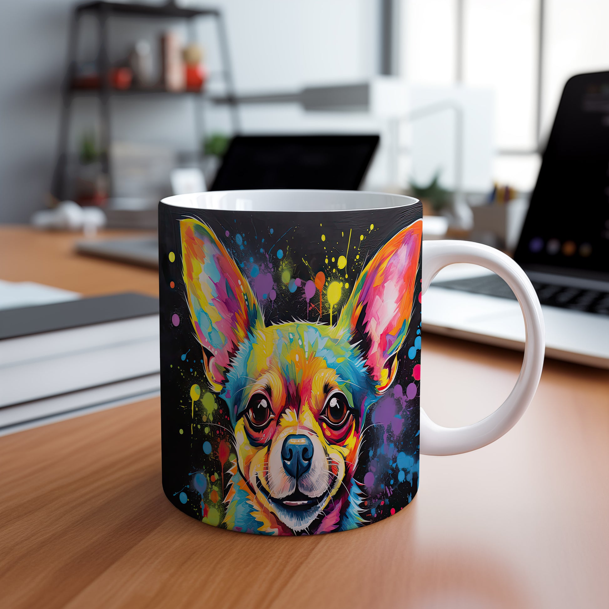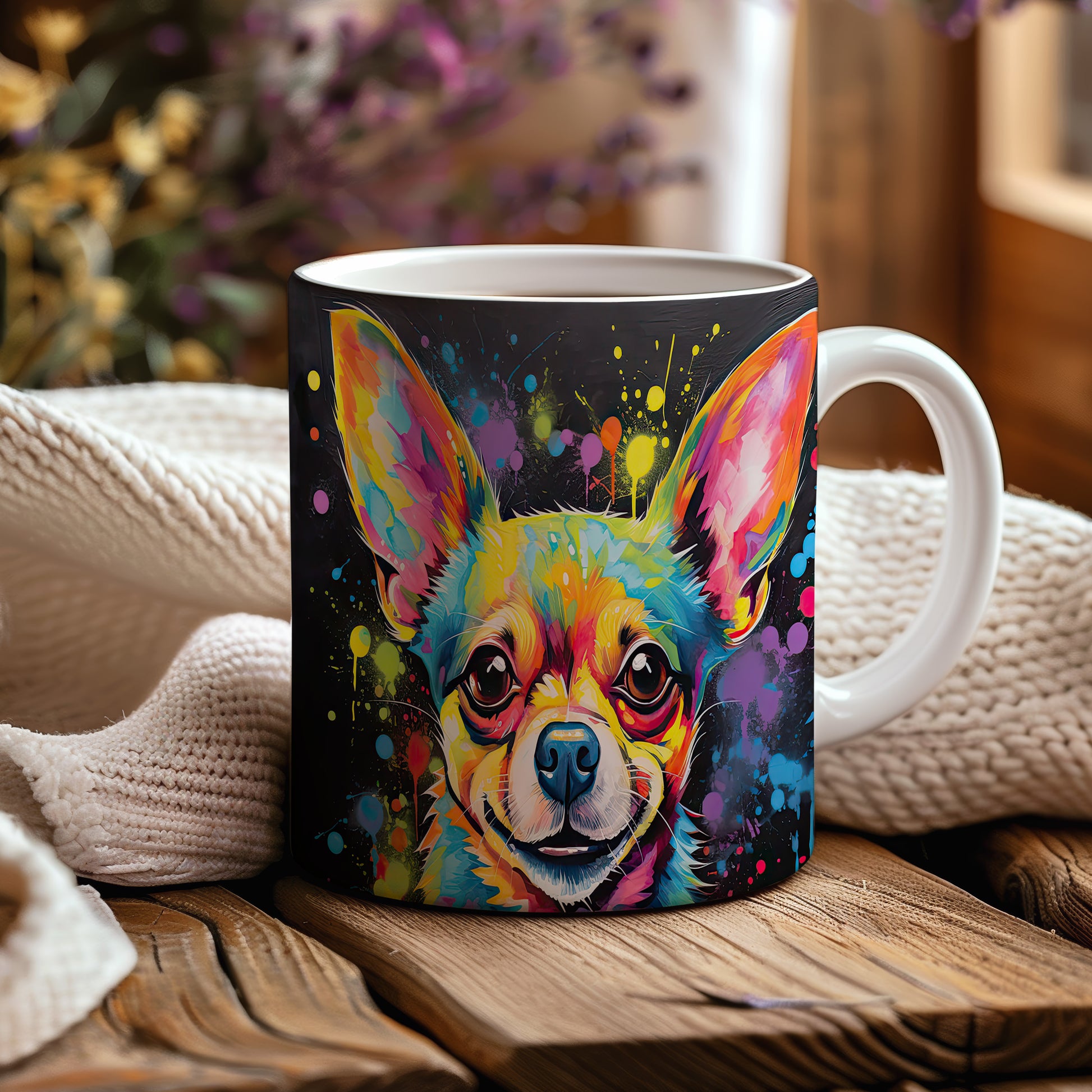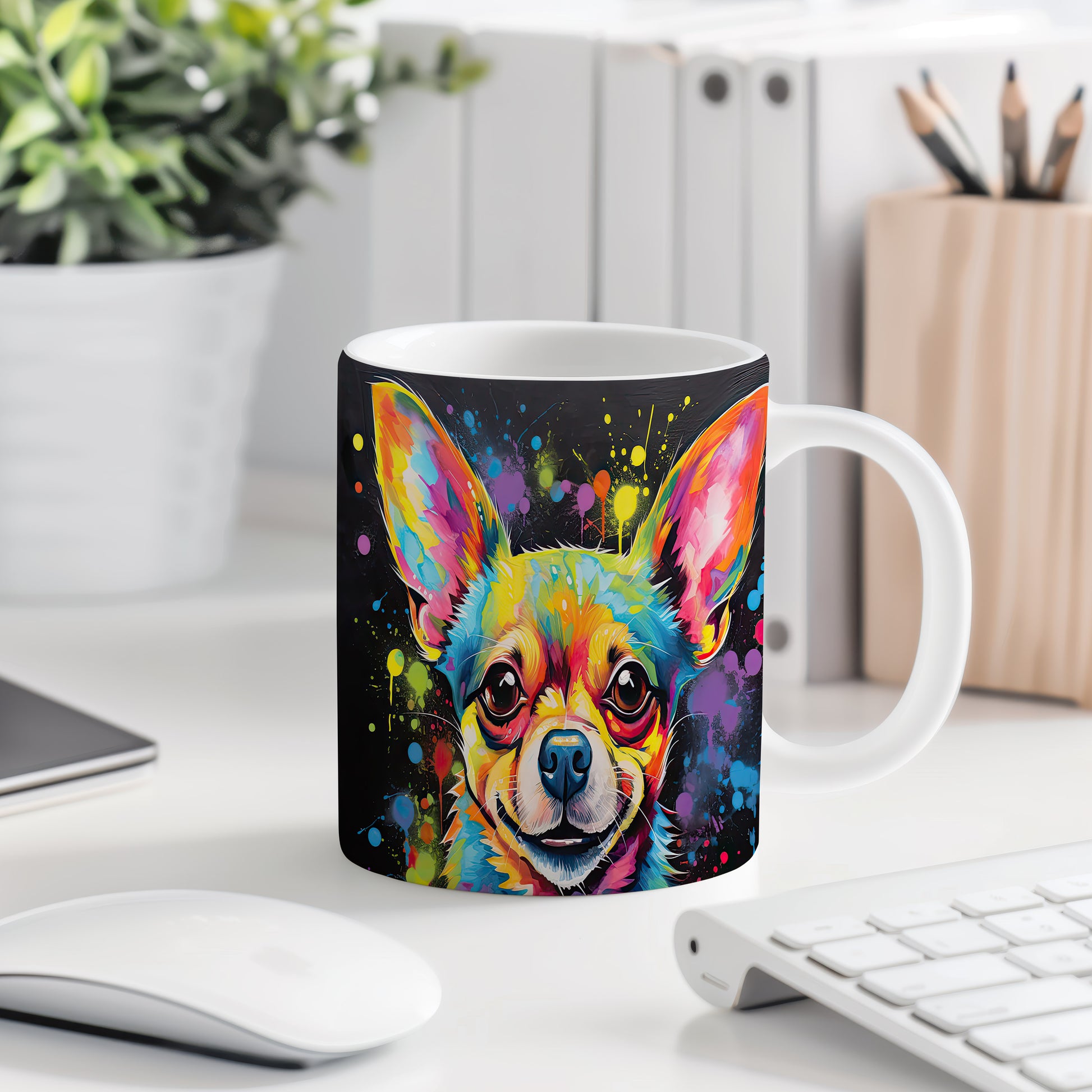 Tento hrnek zobrazuje živý portrét čivavy s barevnými skvrnami. Je ideální pro milovníky psů a skvělým dárkem pro každého, kdo má rád tuto plemeno. Materiál: keramika. Objem: 330 ml. Vhodné do myčky i mikrovlnky. Používání tohoto hrnku přináší radost a oživí každé pití.