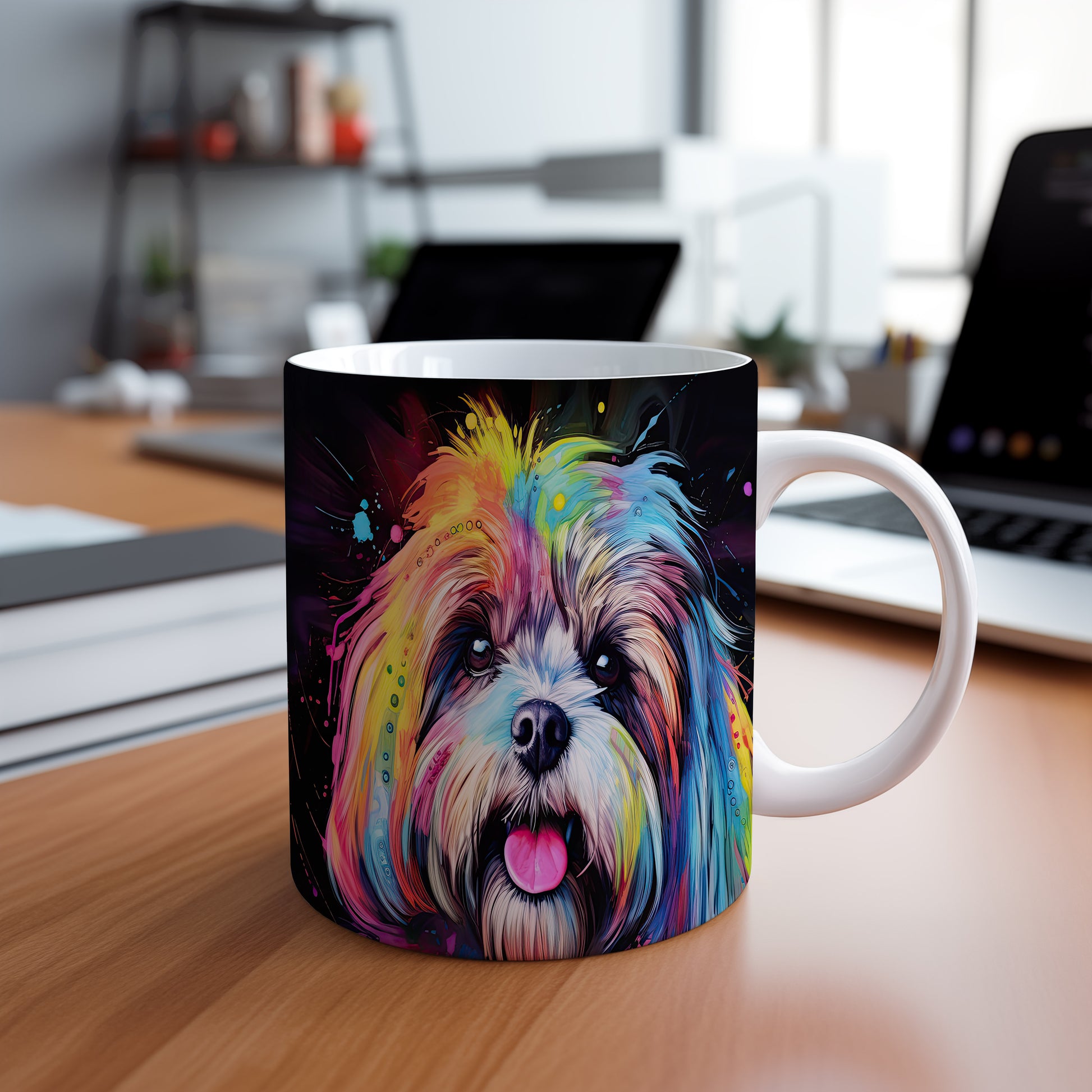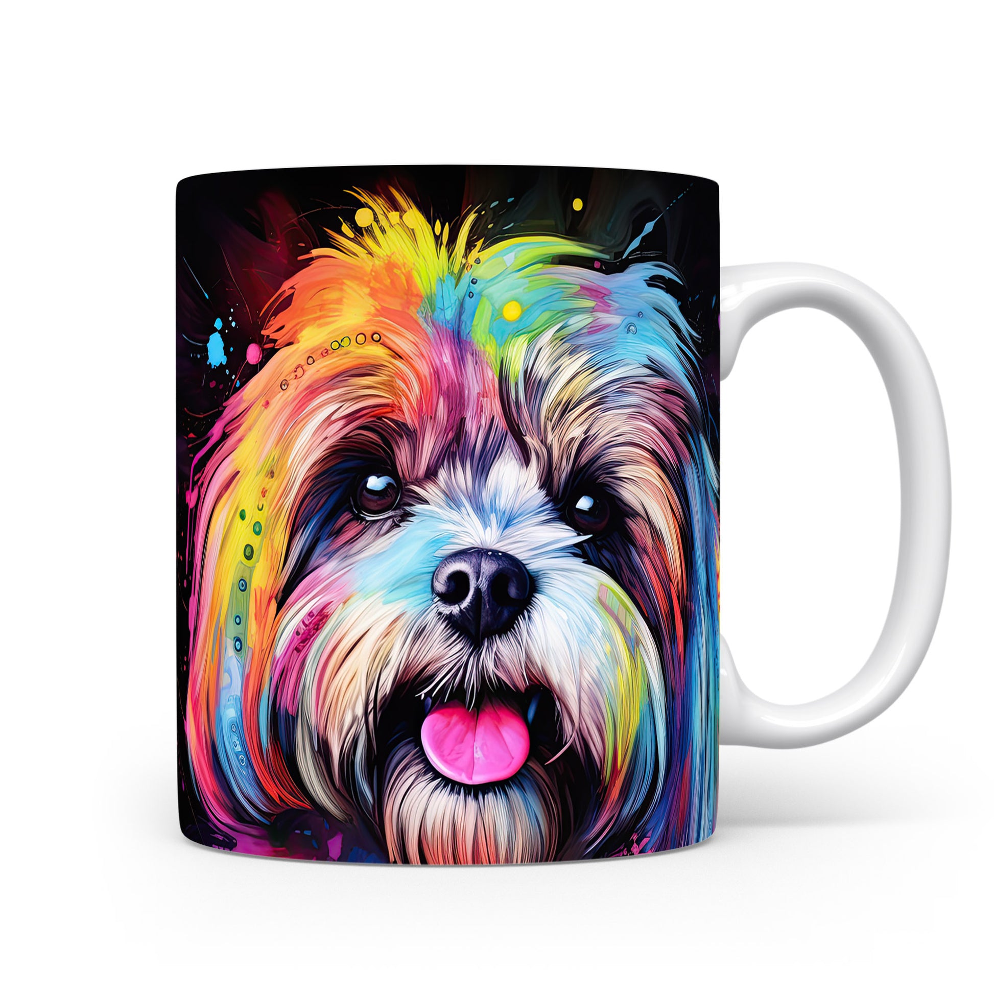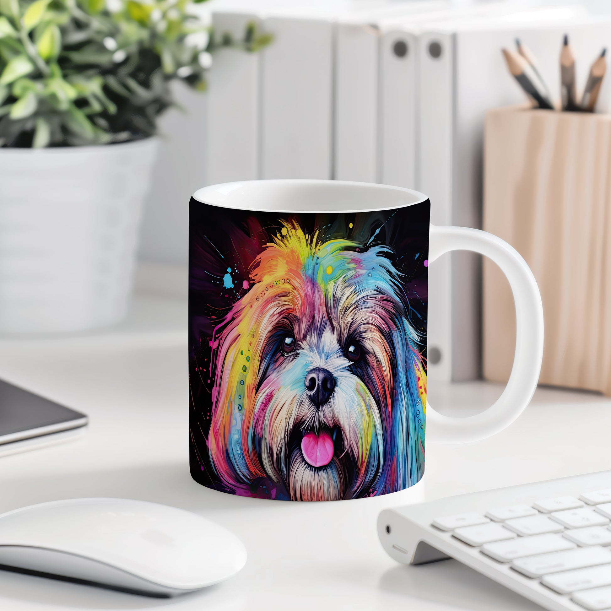Tento keramický hrnek zobrazuje barevný portrét psa, který zaujme svým výrazným vzhledem. Je ideální pro milovníky psů a skvělým dárkem pro každého, kdo má rád zvířata. Materiál: keramika. Objem: 330 ml. Vhodné do myčky i mikrovlnky. Užijte si svůj oblíbený nápoj s tímto originálním kouskem.