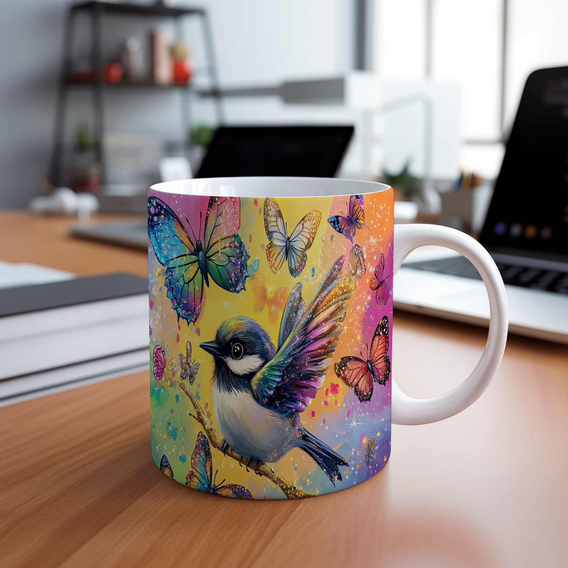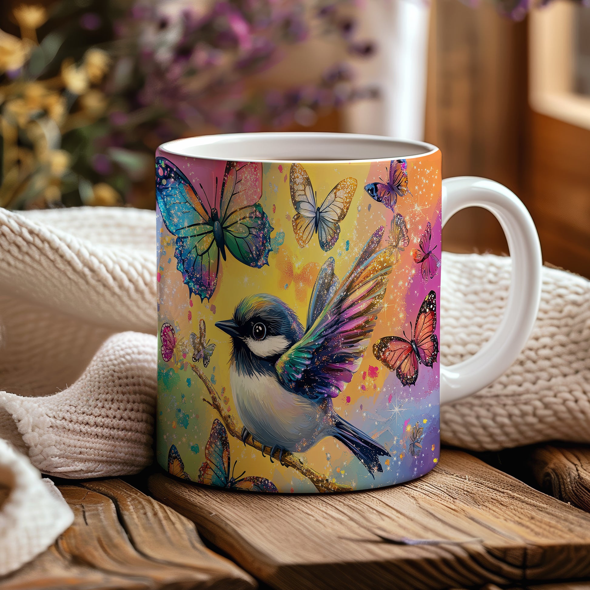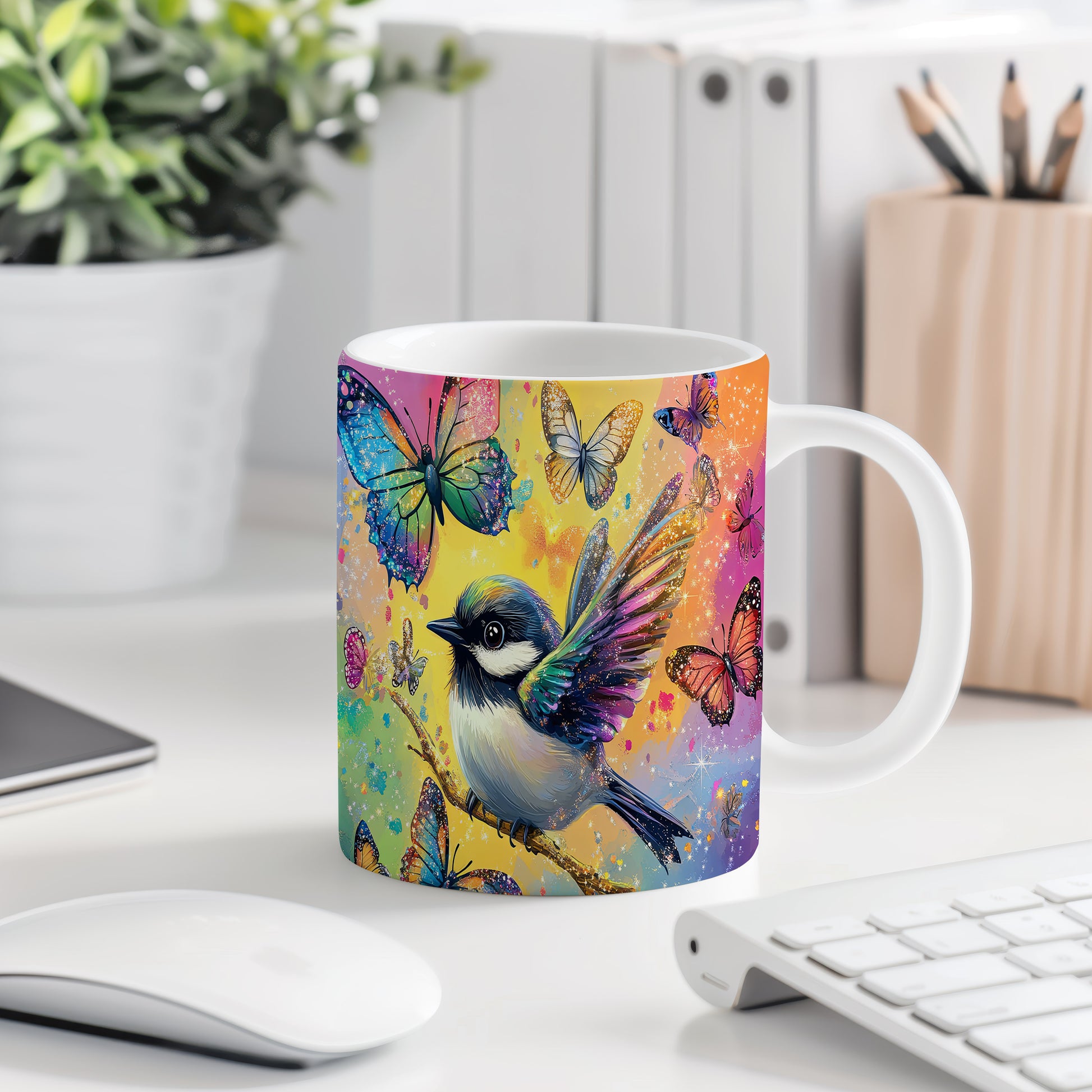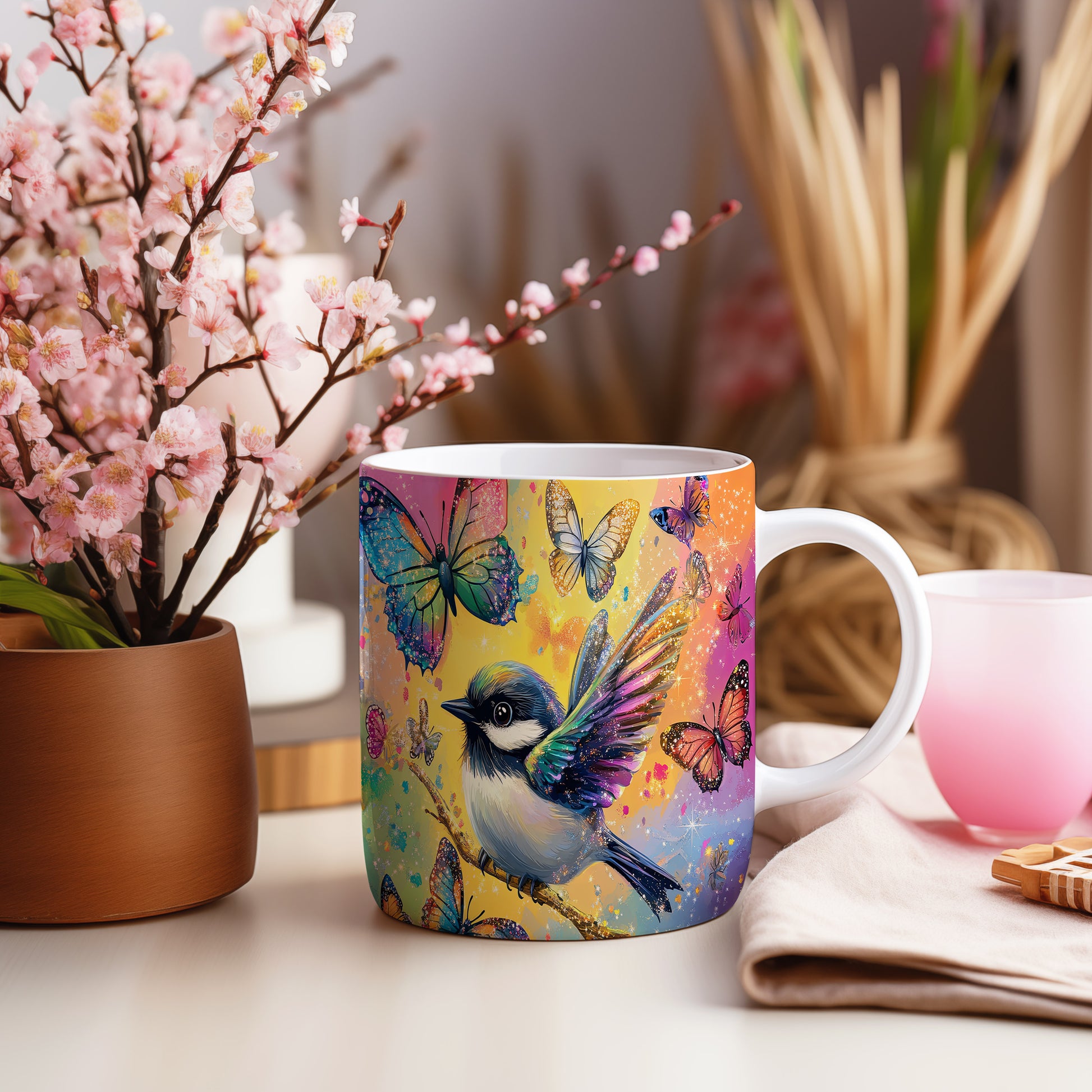 Hrnek s barevným ptáčkem a motýly v růžových tónech