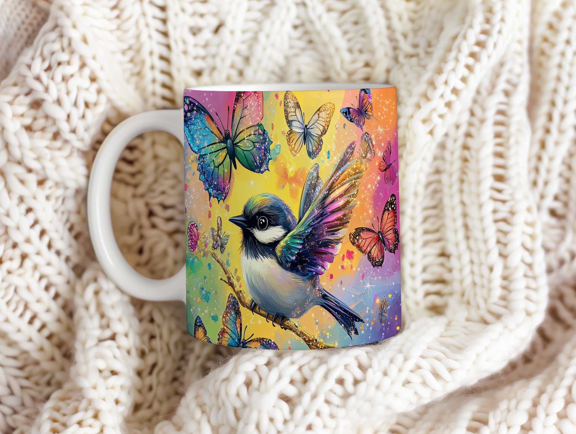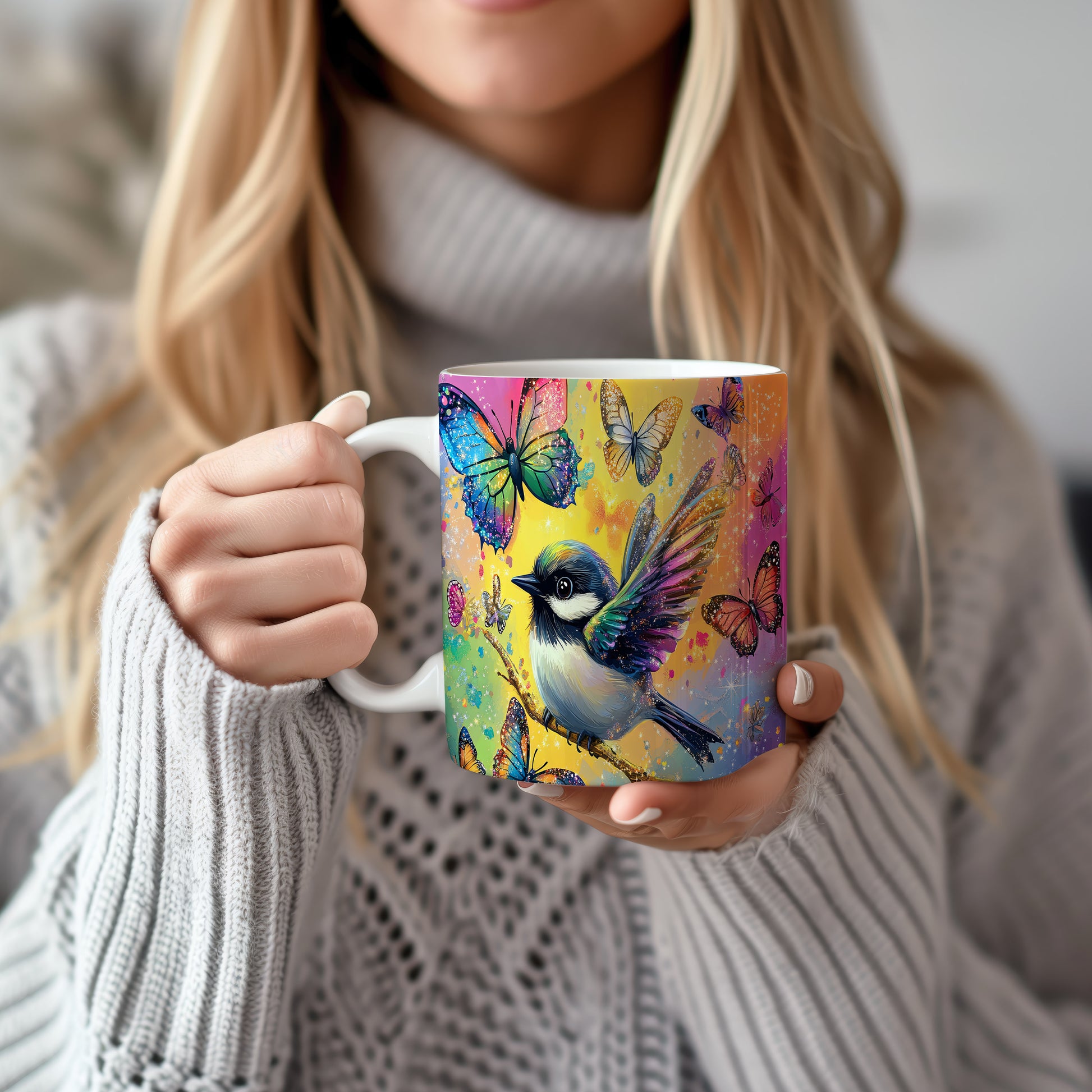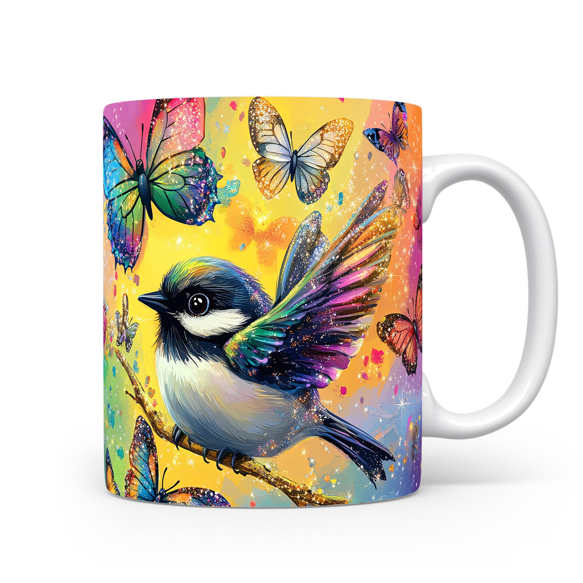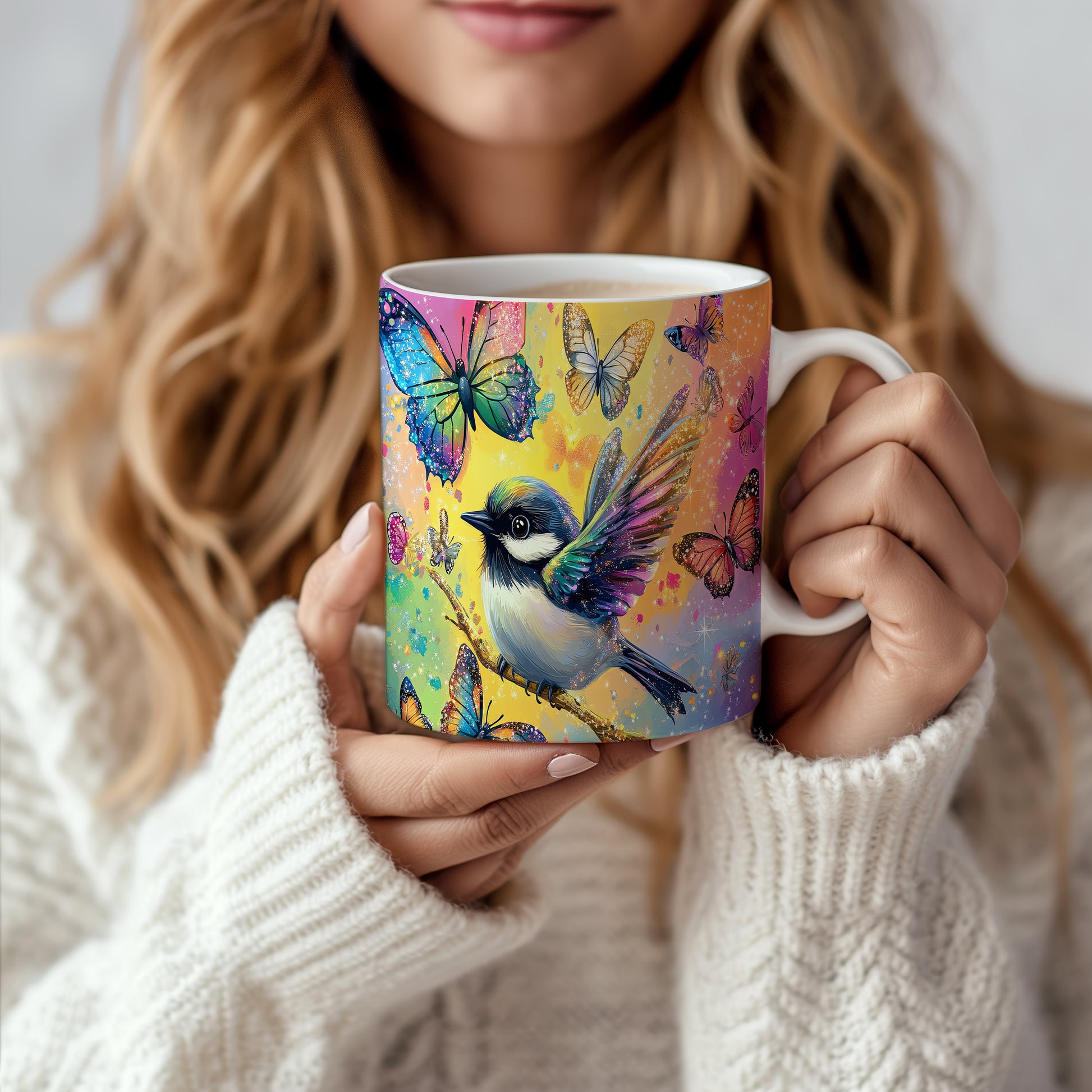 Hrnek s barevným ptáčkem a motýly v růžových tónech