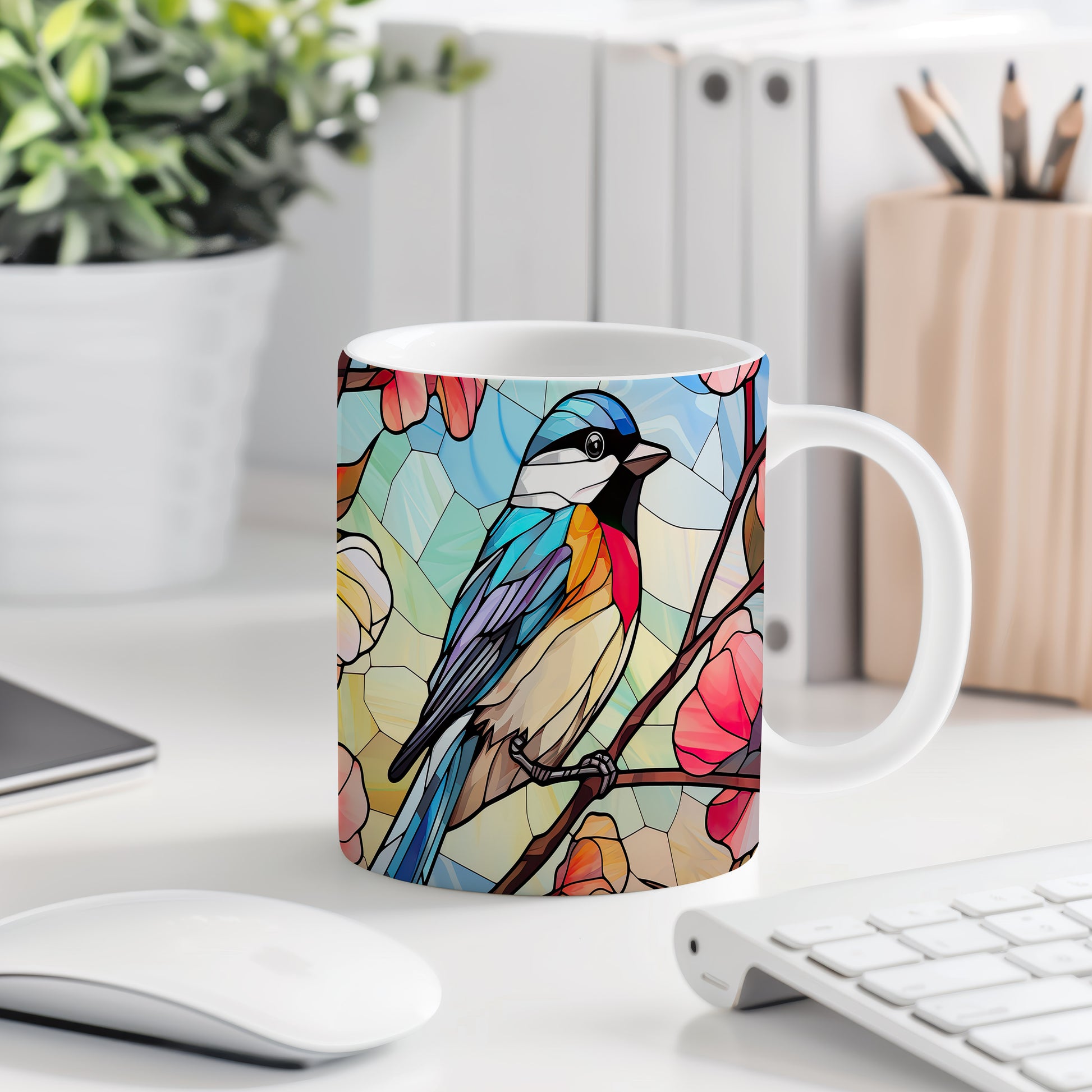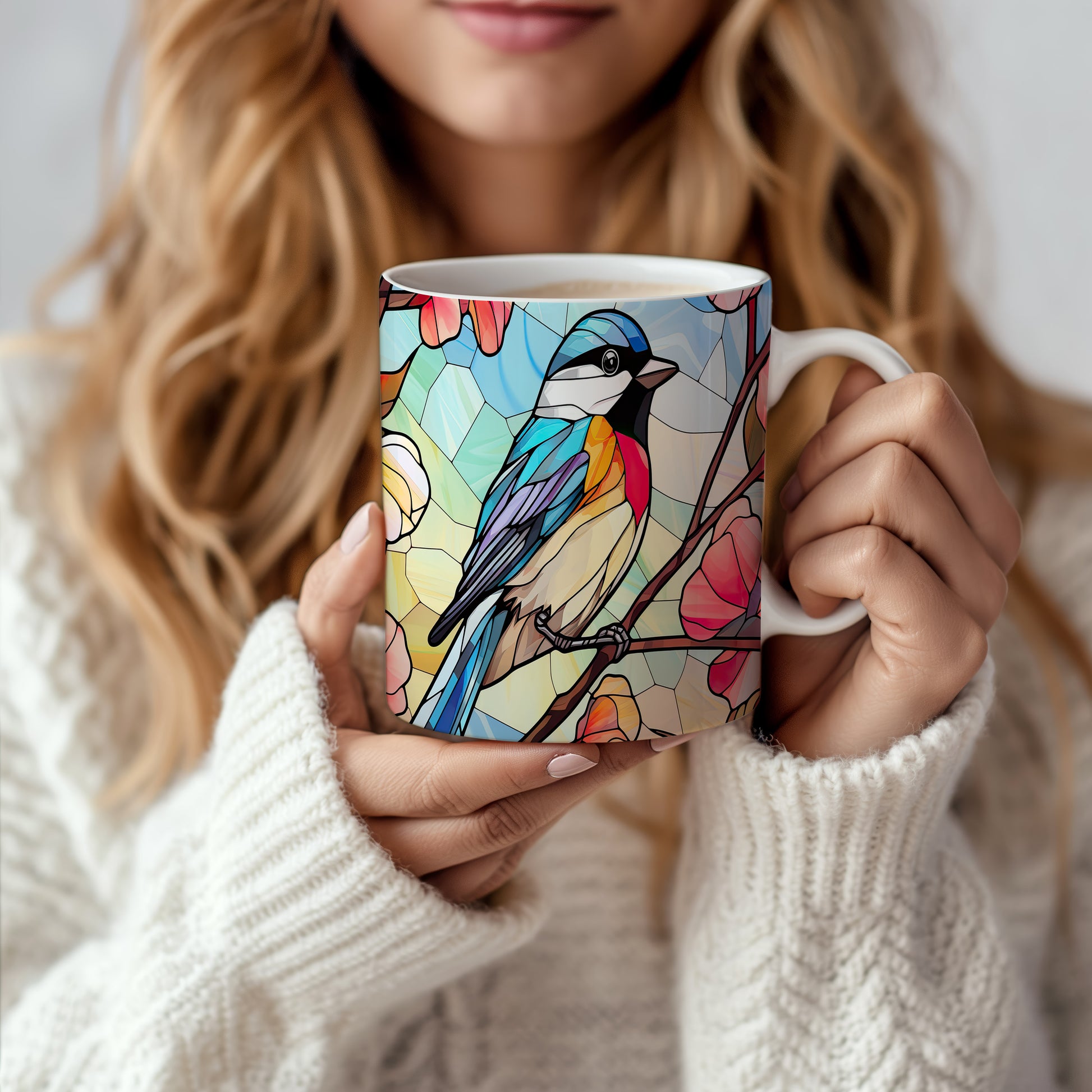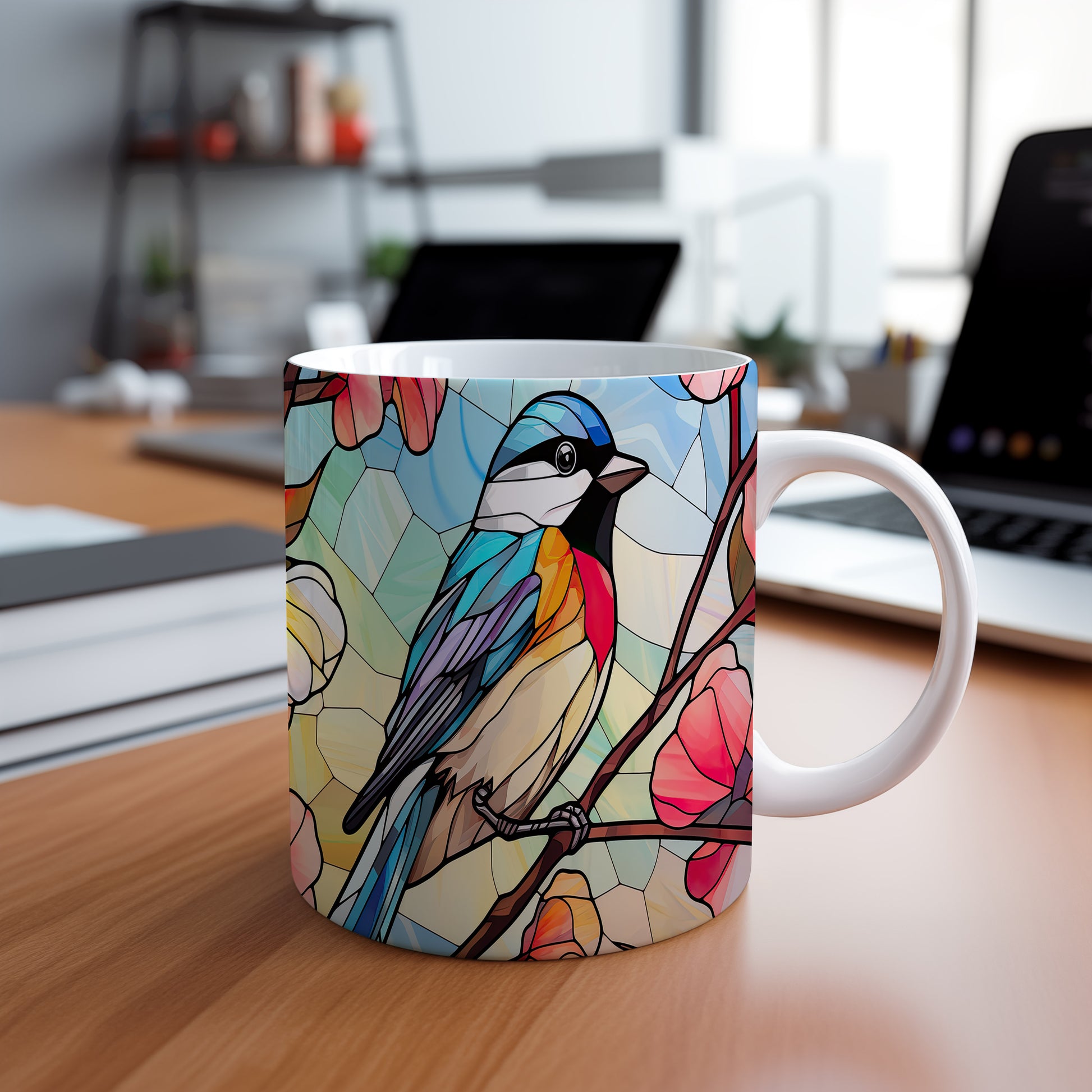 Hrnek s barevným ptákem – moderní digitální ilustrací