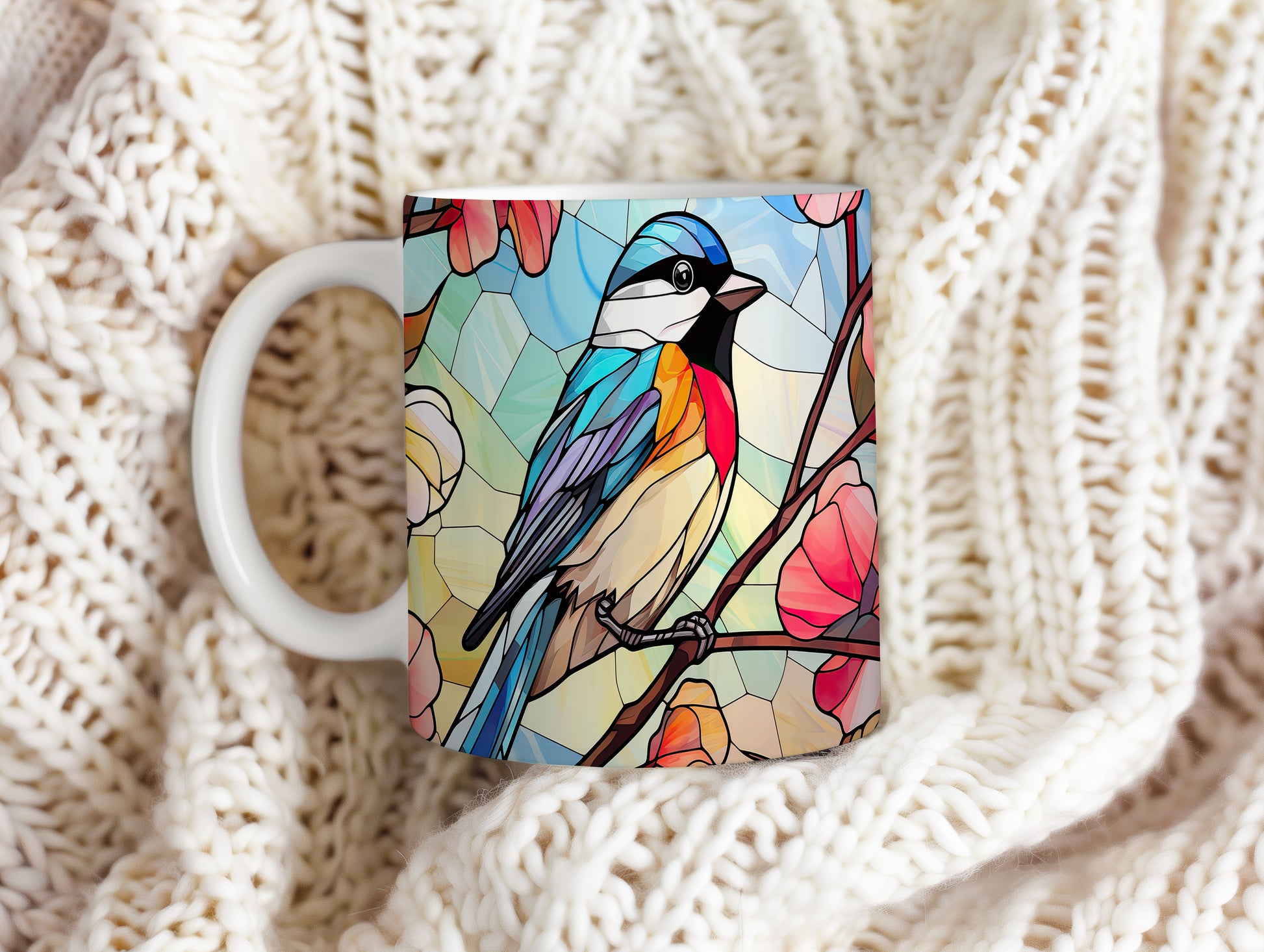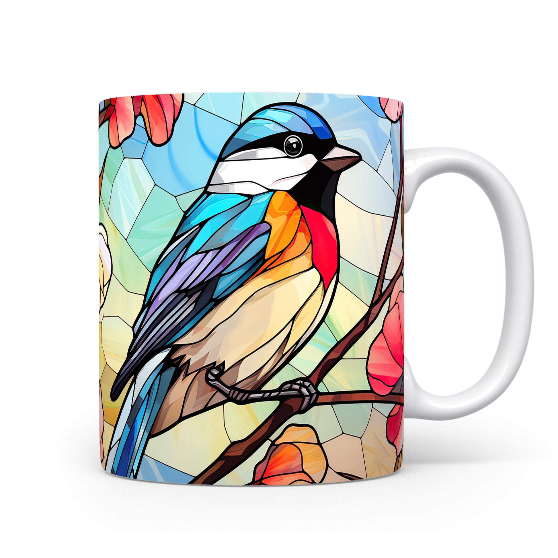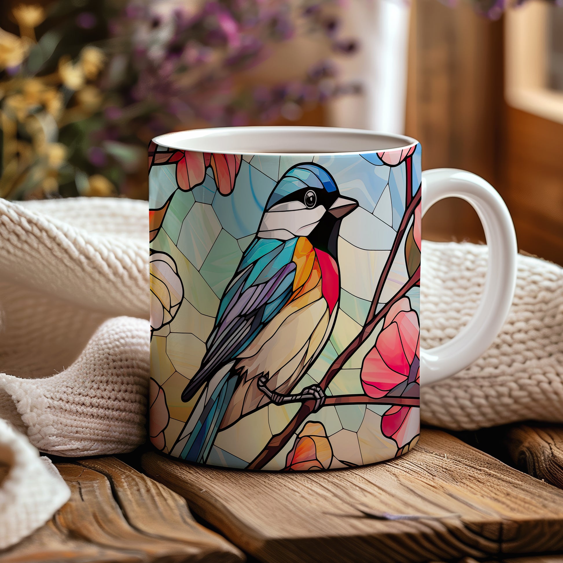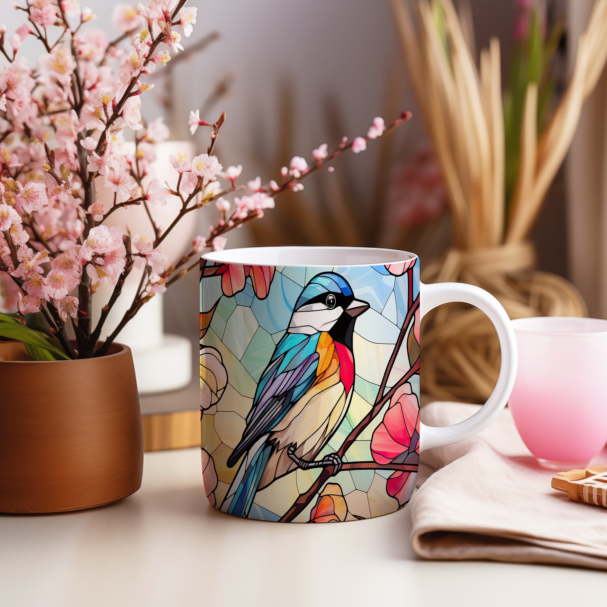 Hrnek s barevným ptákem – moderní digitální ilustrací