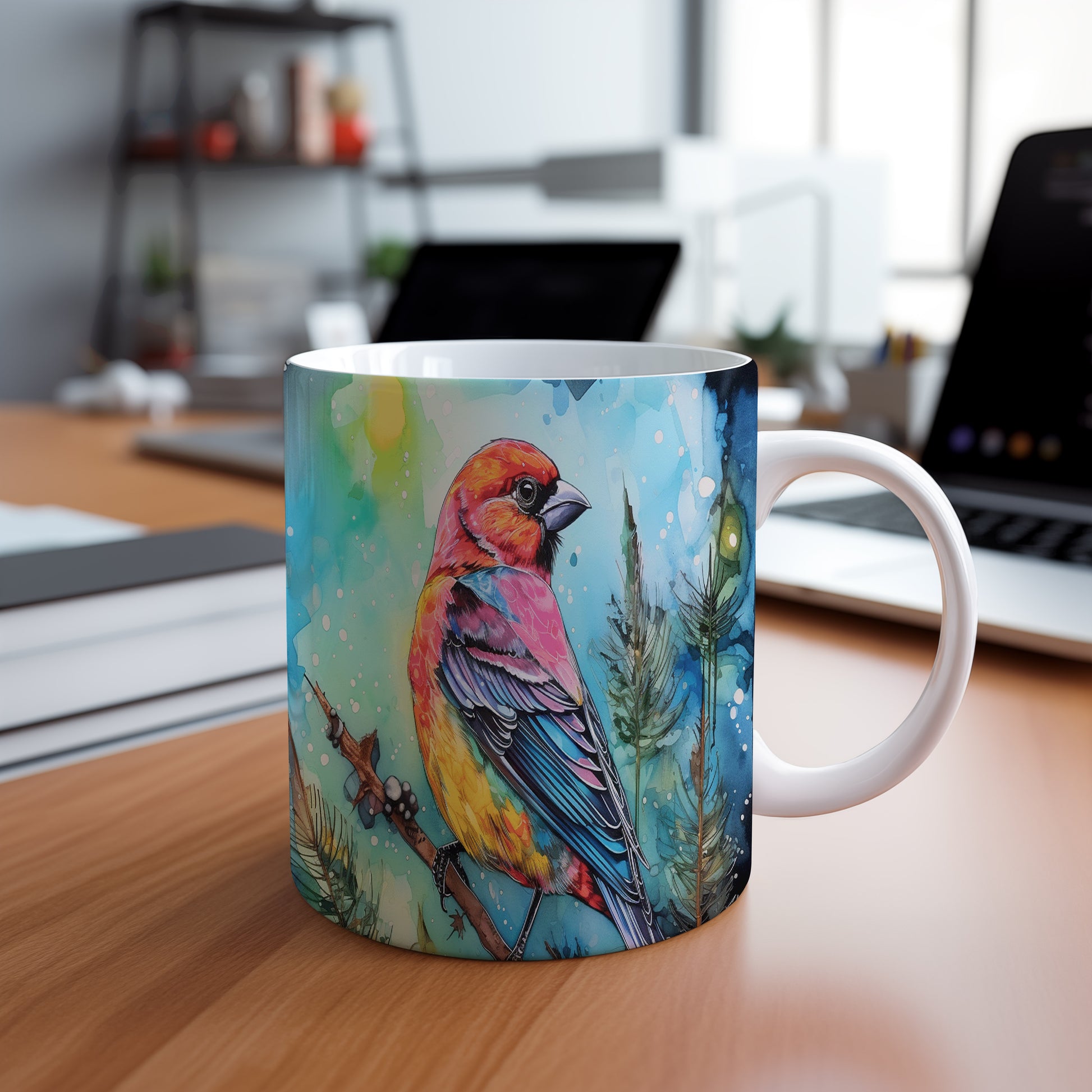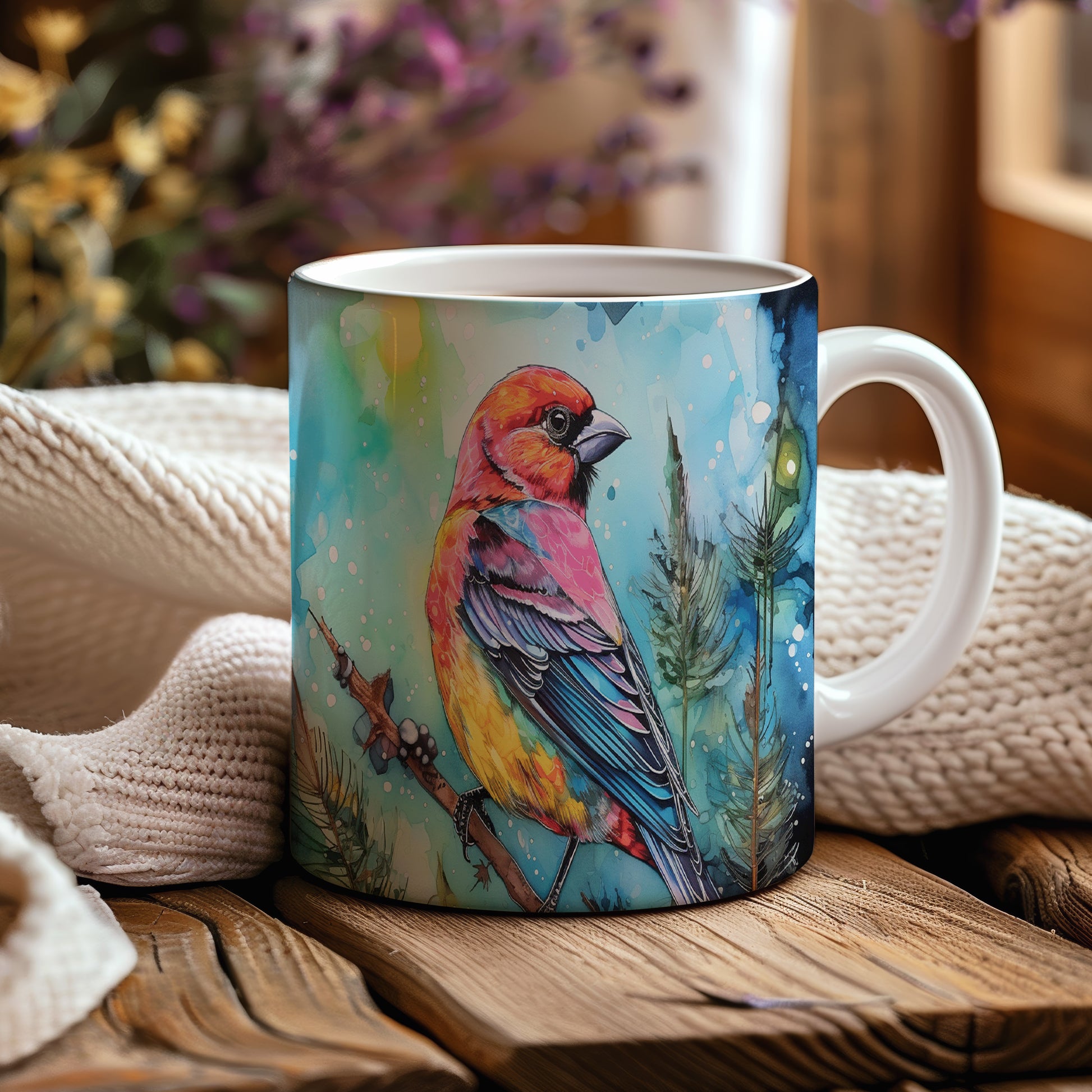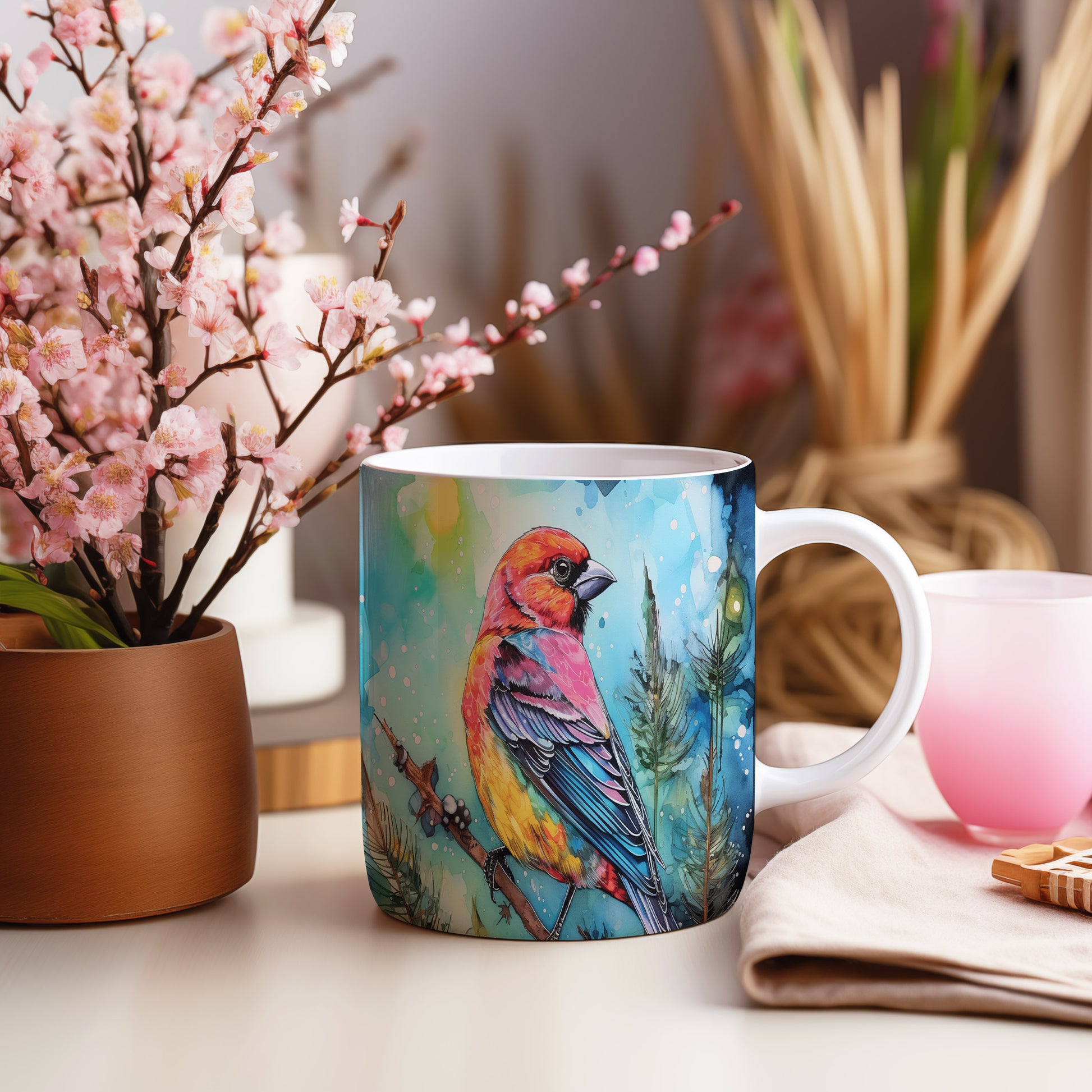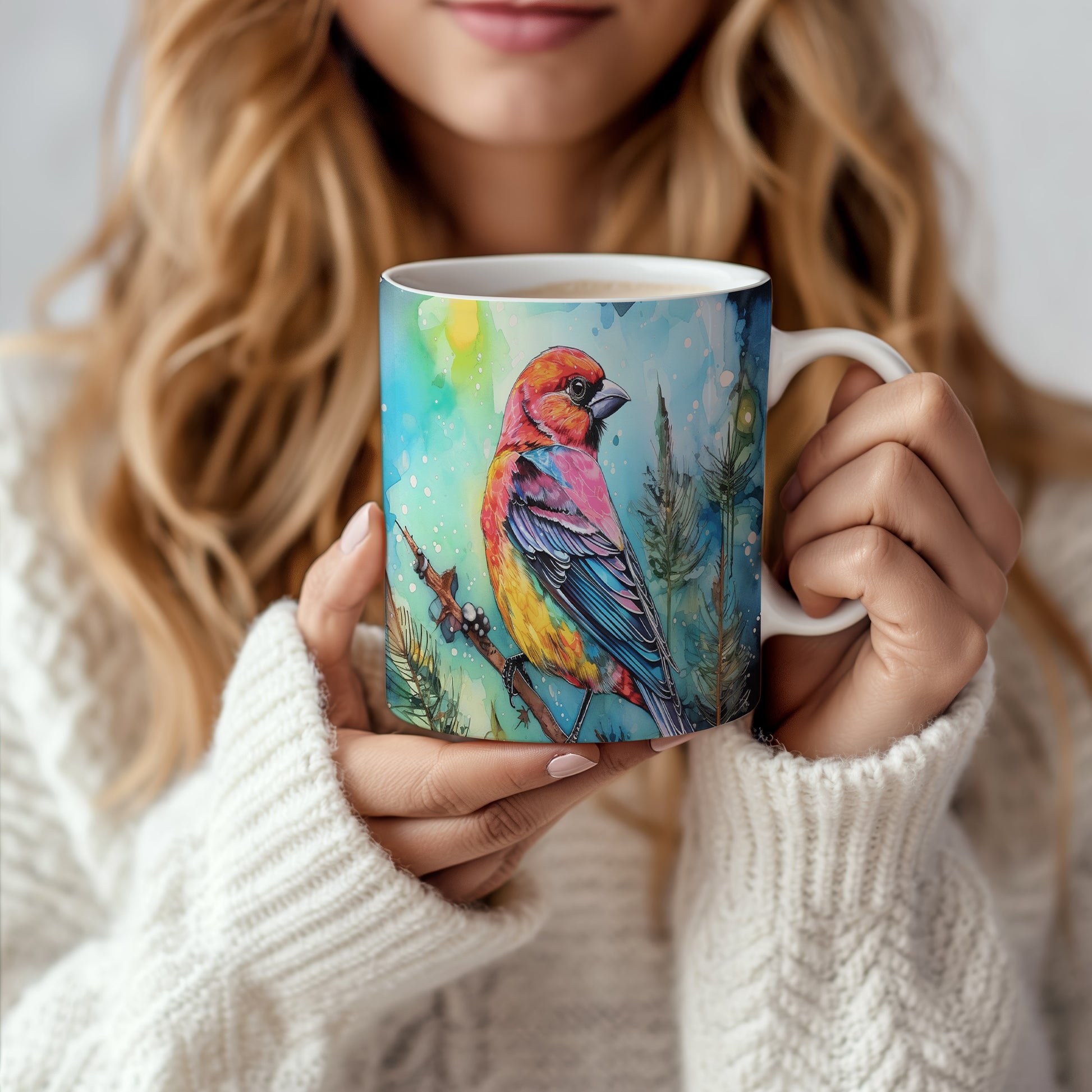 Hrnek s barevným ptákem v akvarelovém stylu – akvarelovým stylem