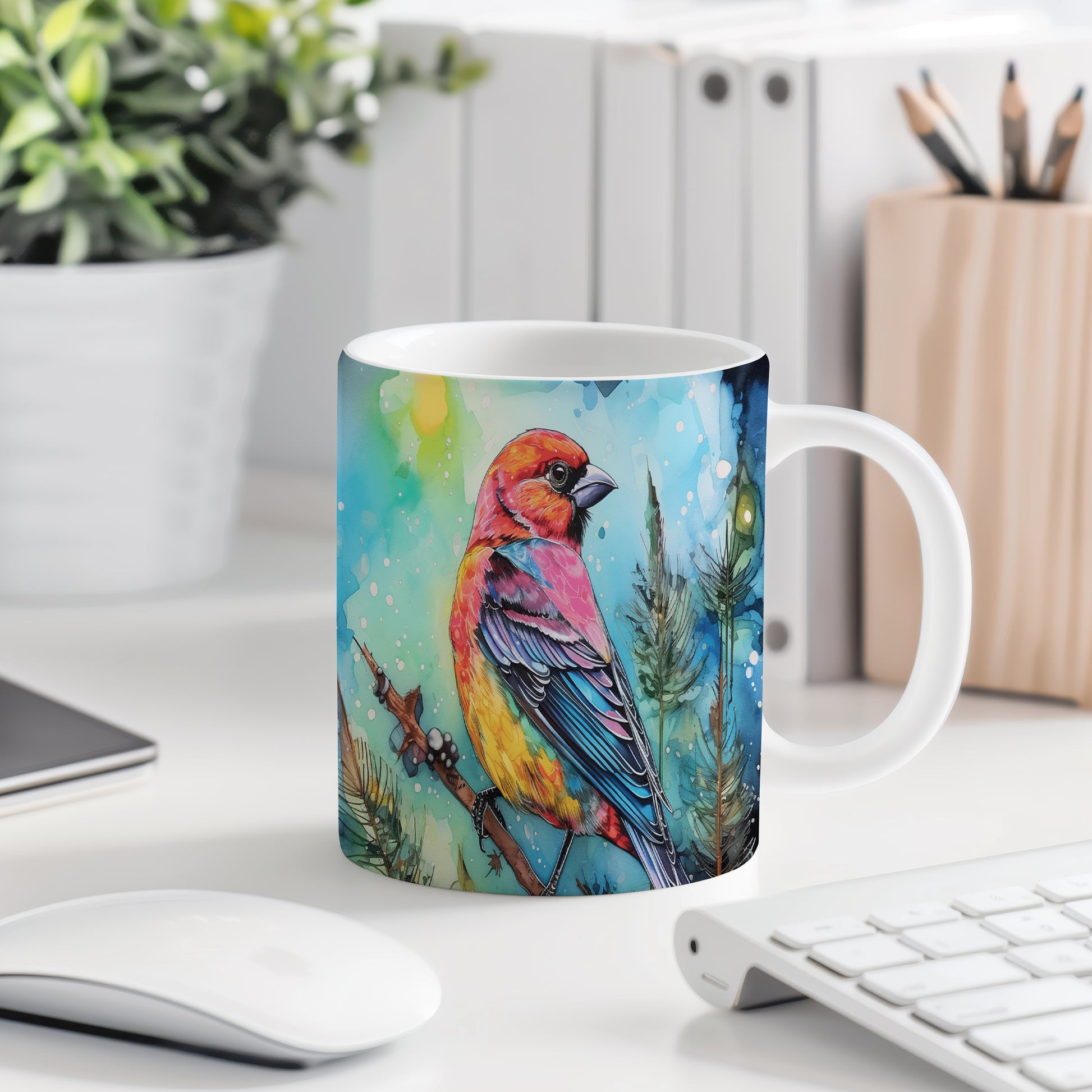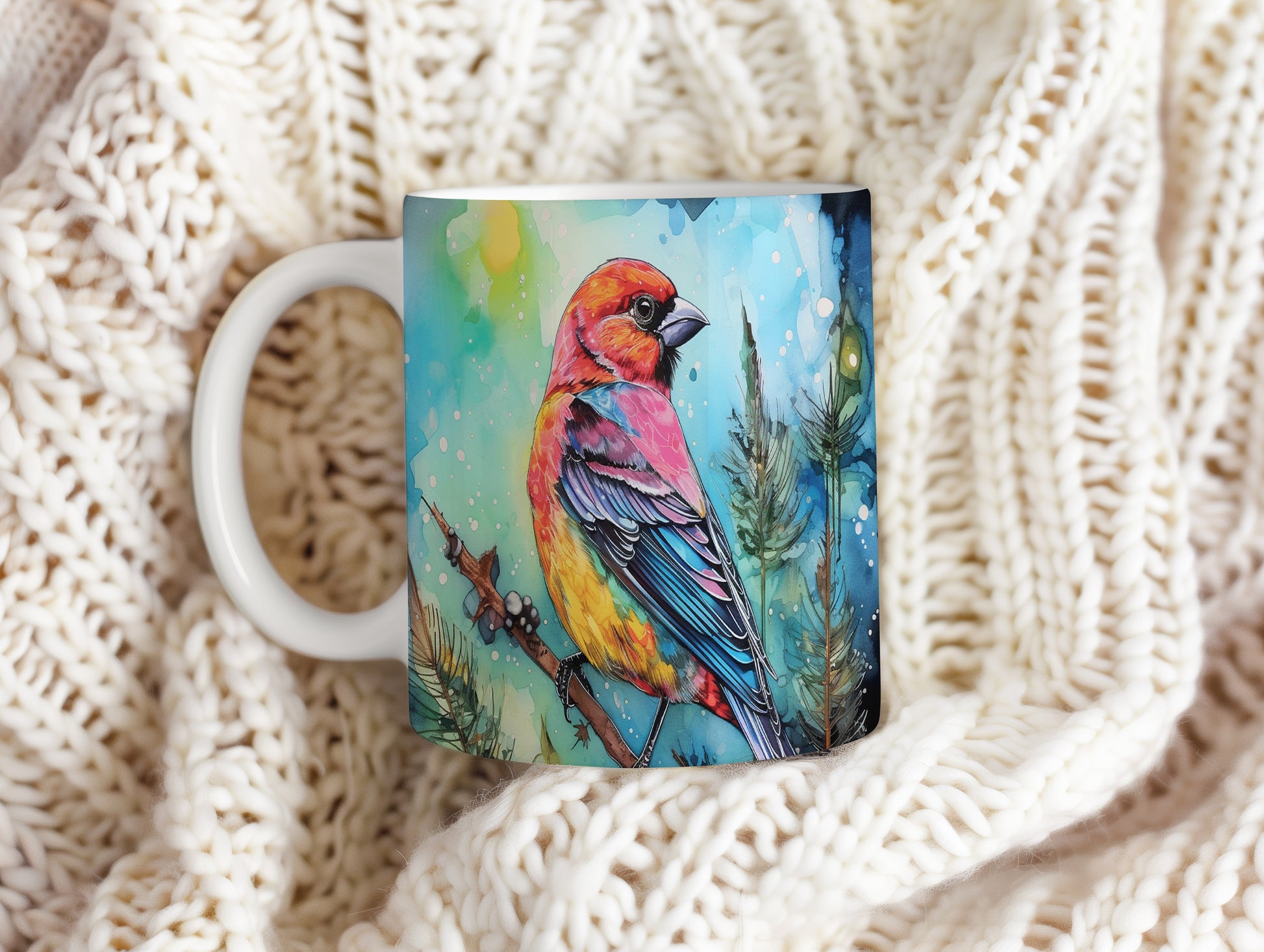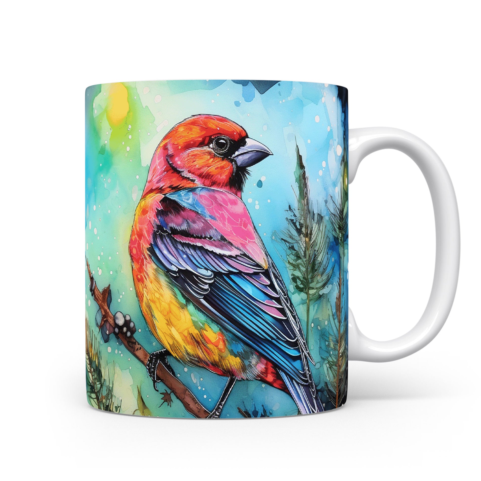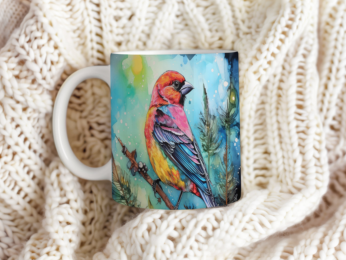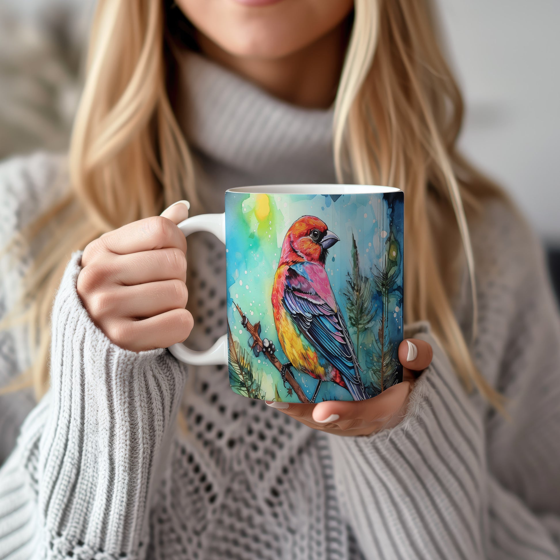 Hrnek s barevným ptákem v akvarelovém stylu – akvarelovým stylem