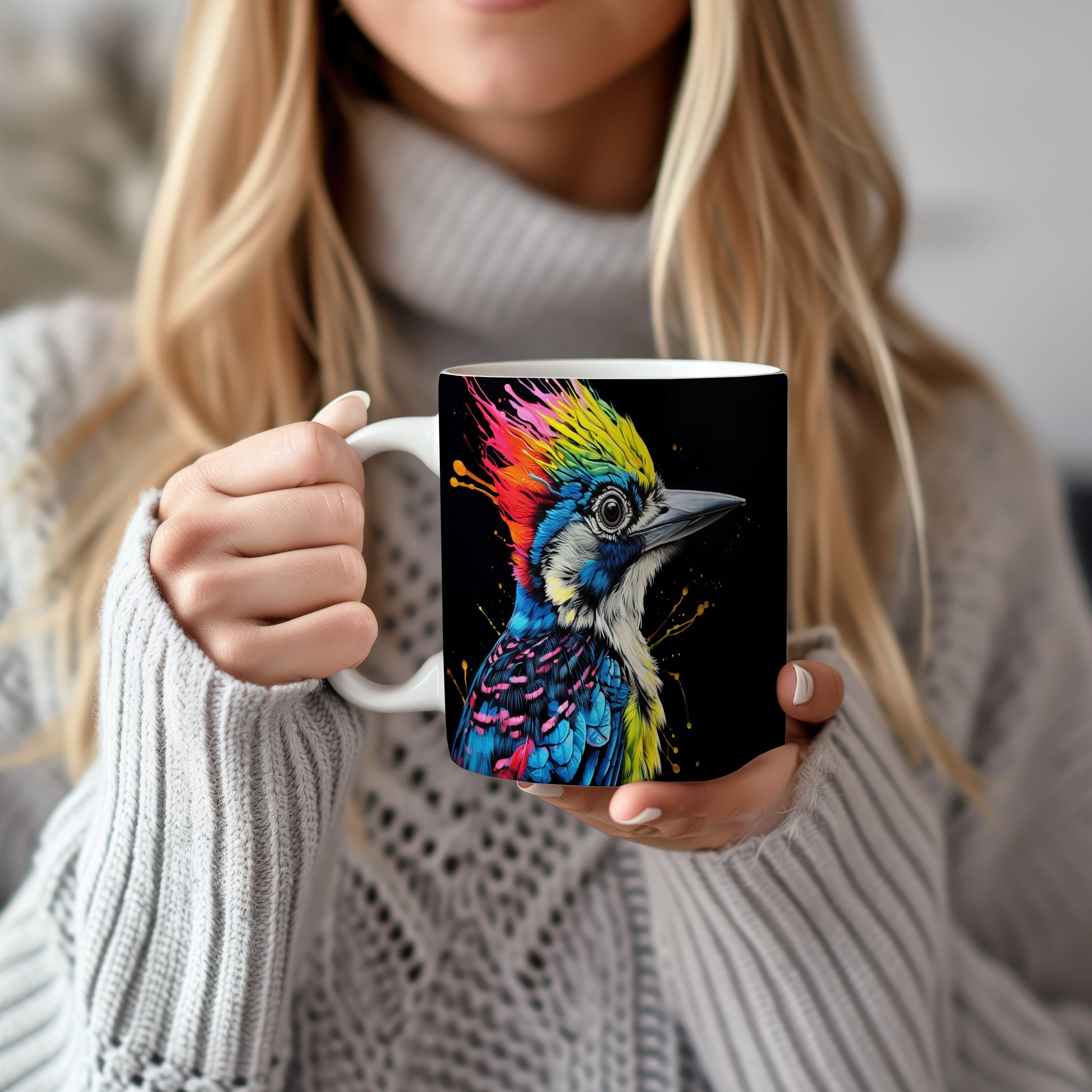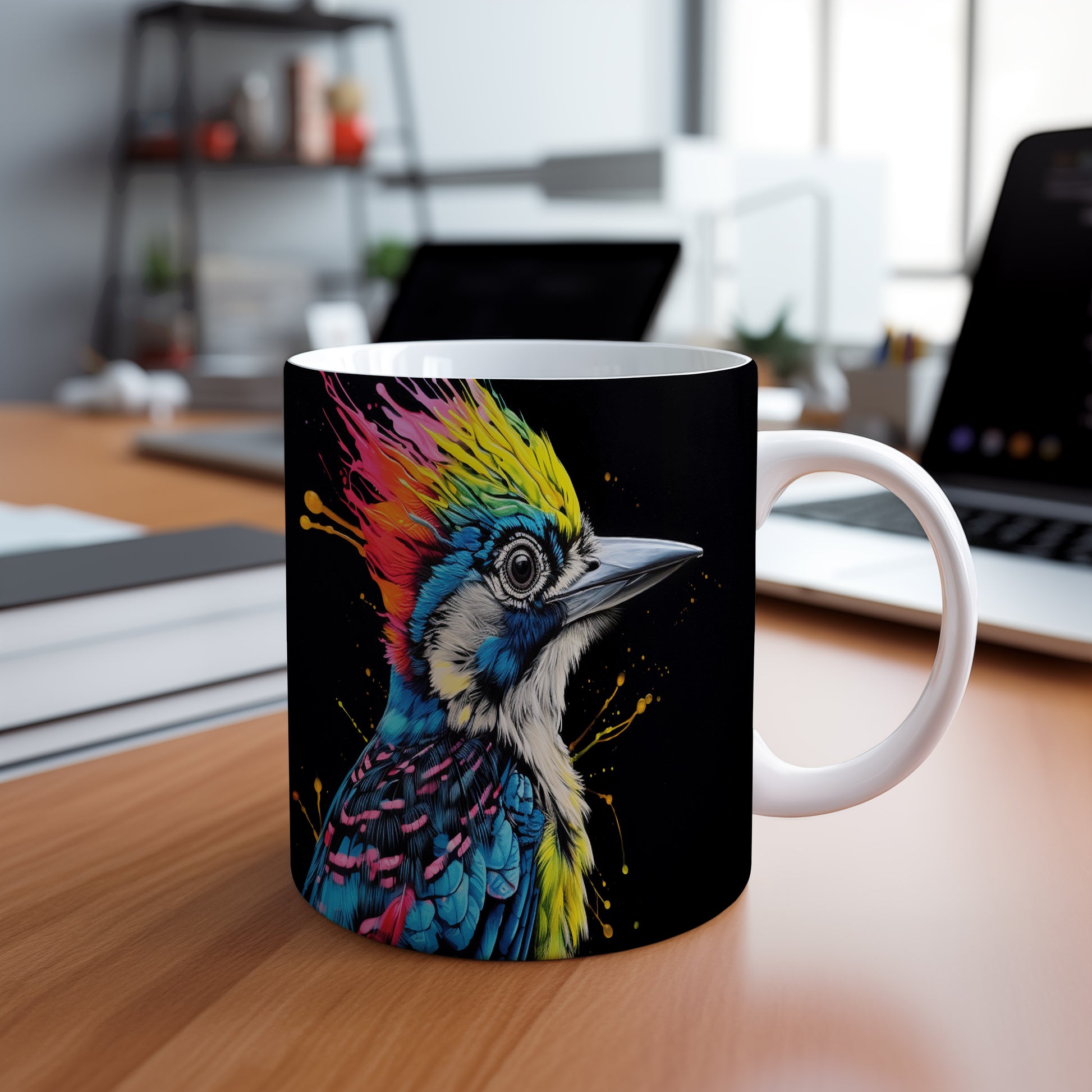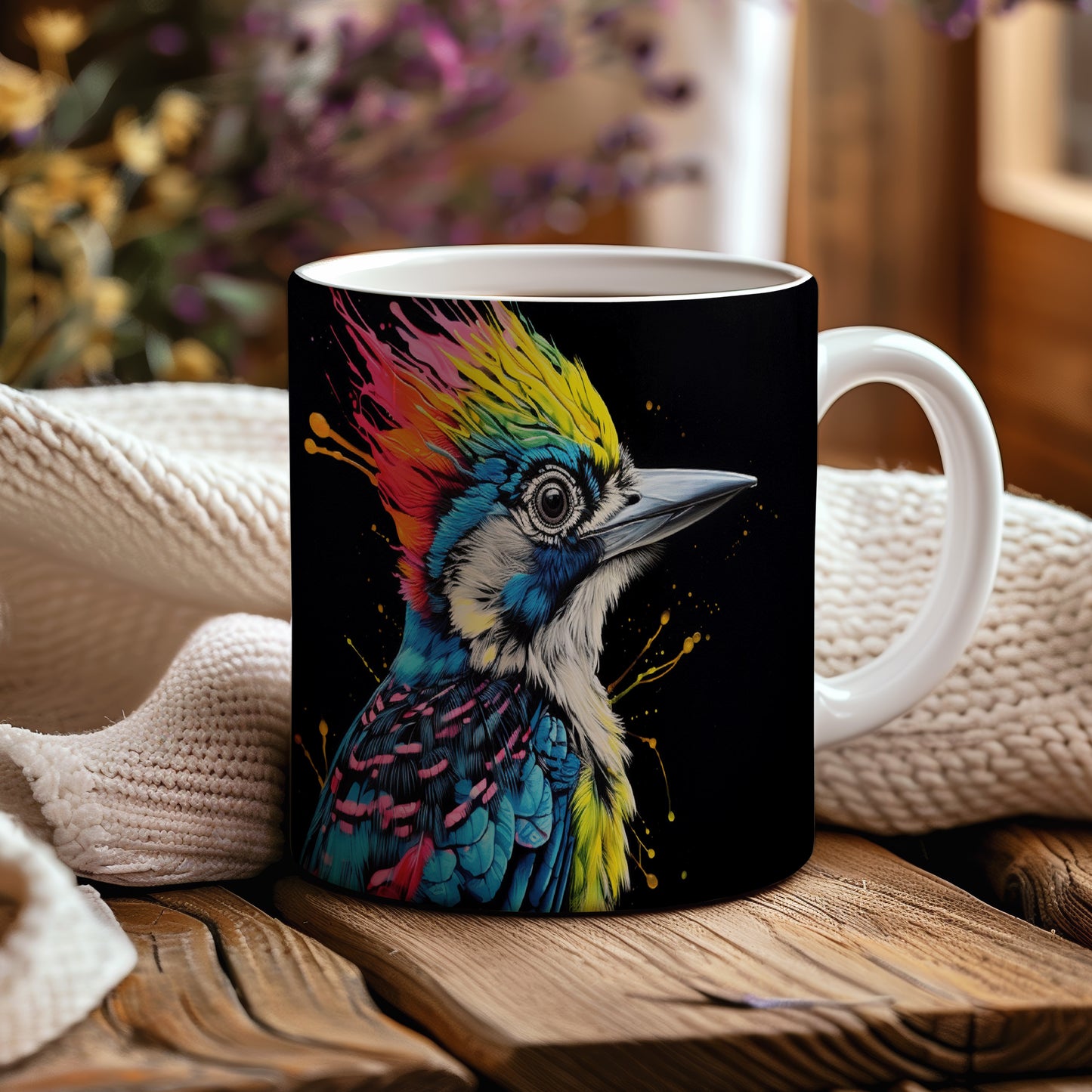 Hrnek s barevným ptákem v roztomilém stylu – stylovým zpracováním