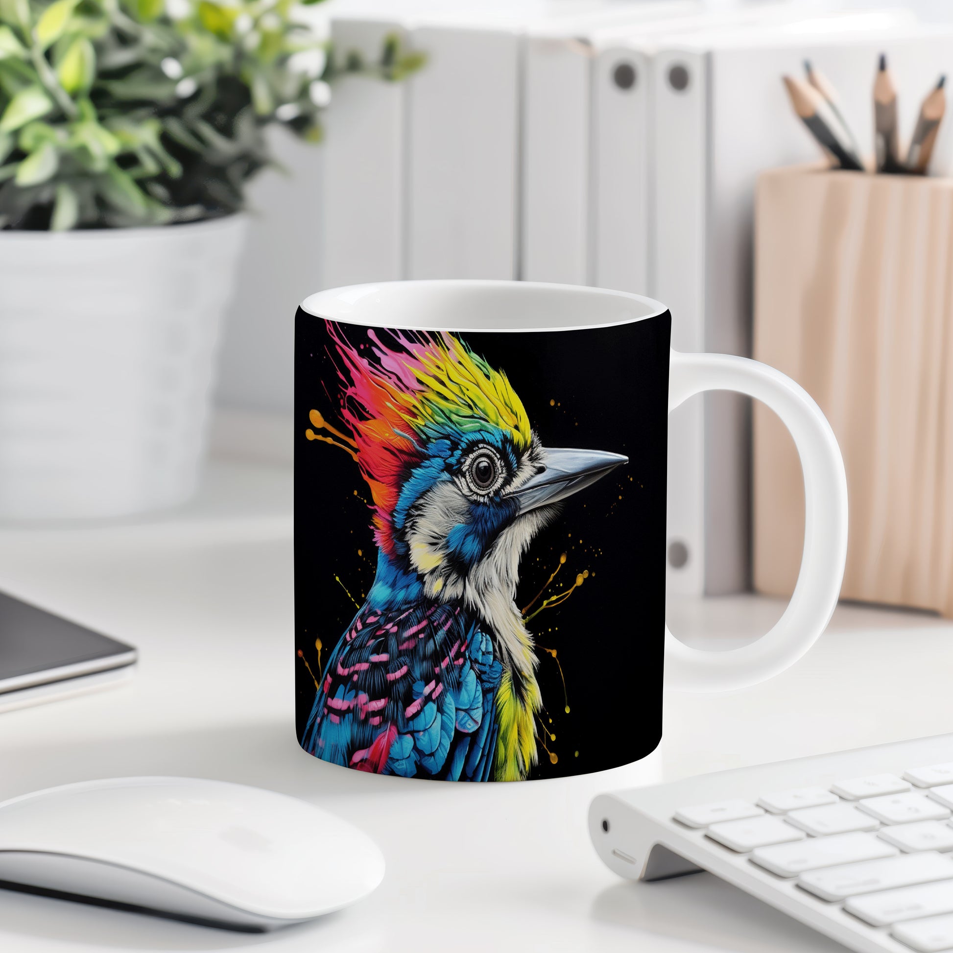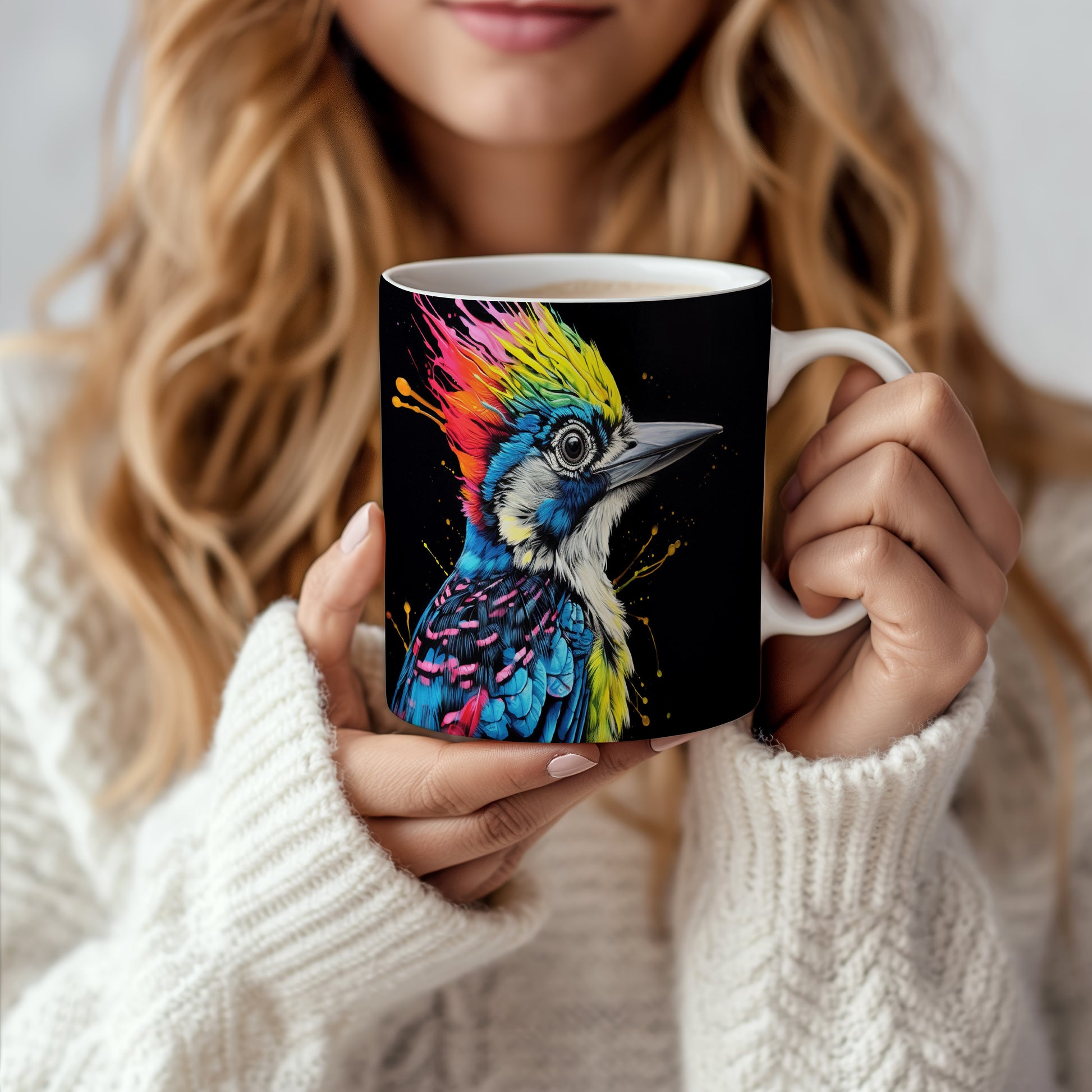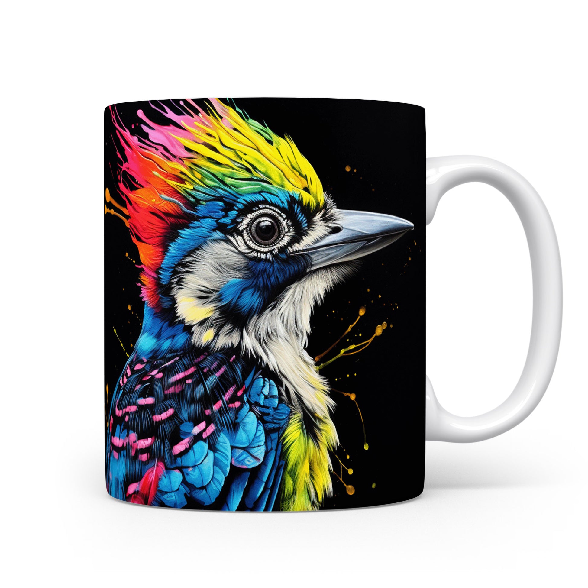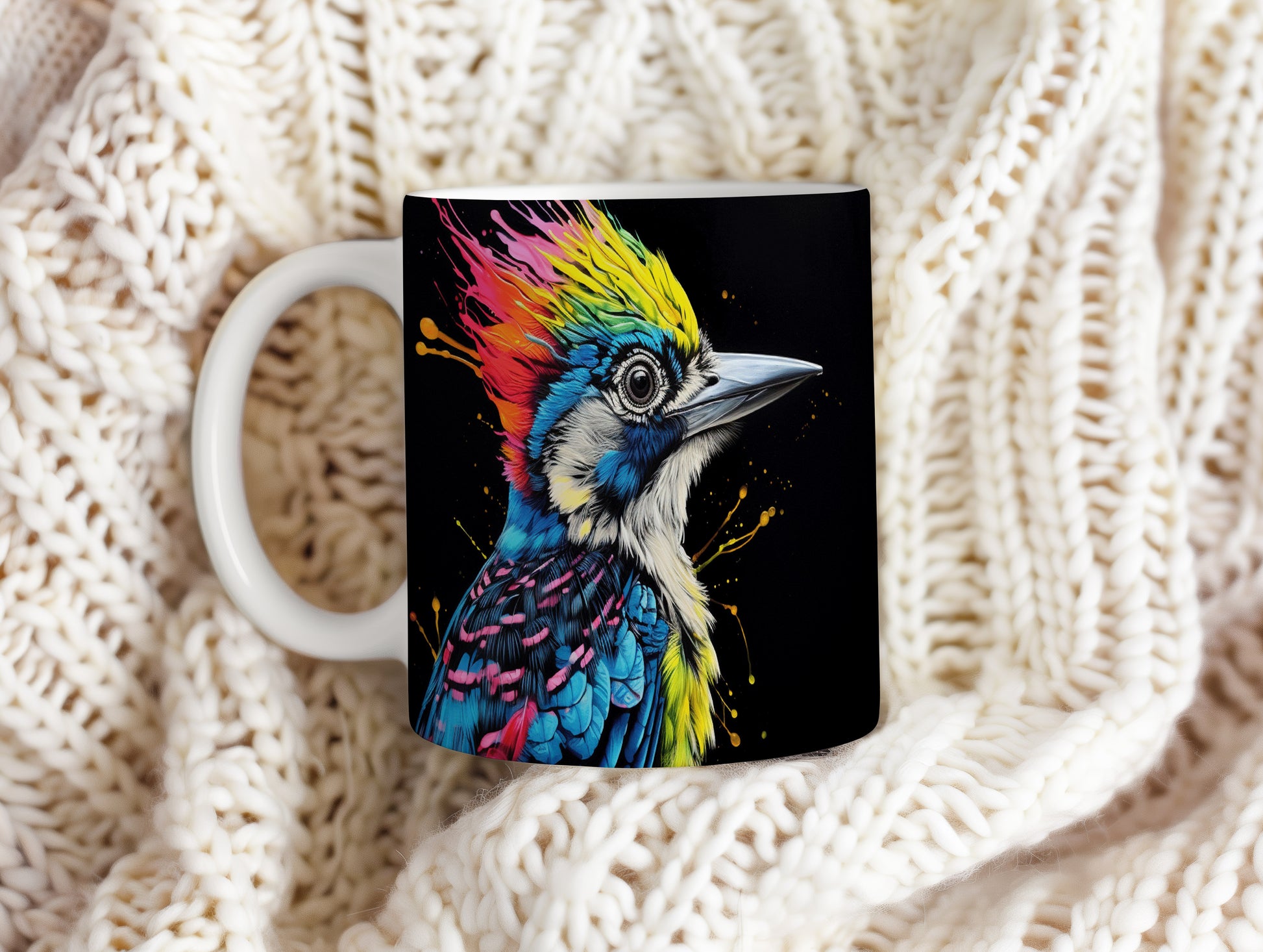 Hrnek s barevným ptákem v roztomilém stylu – stylovým zpracováním
