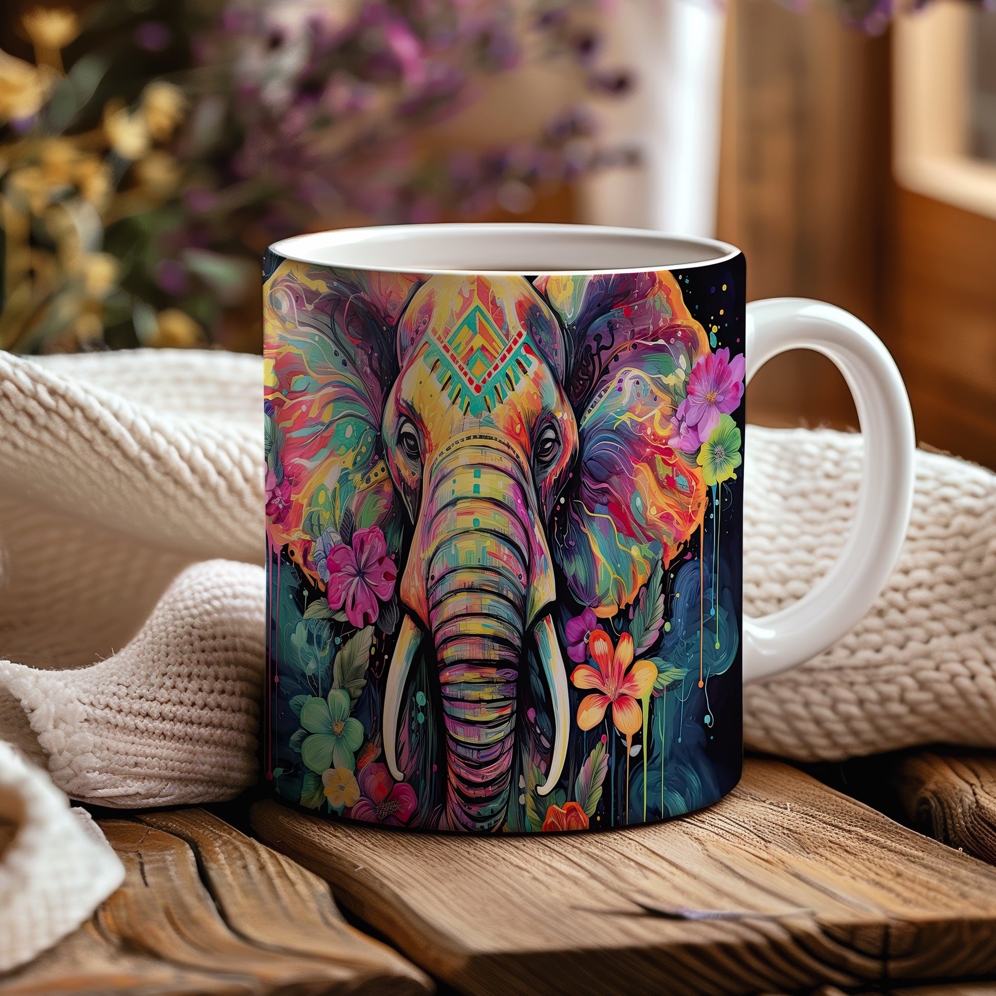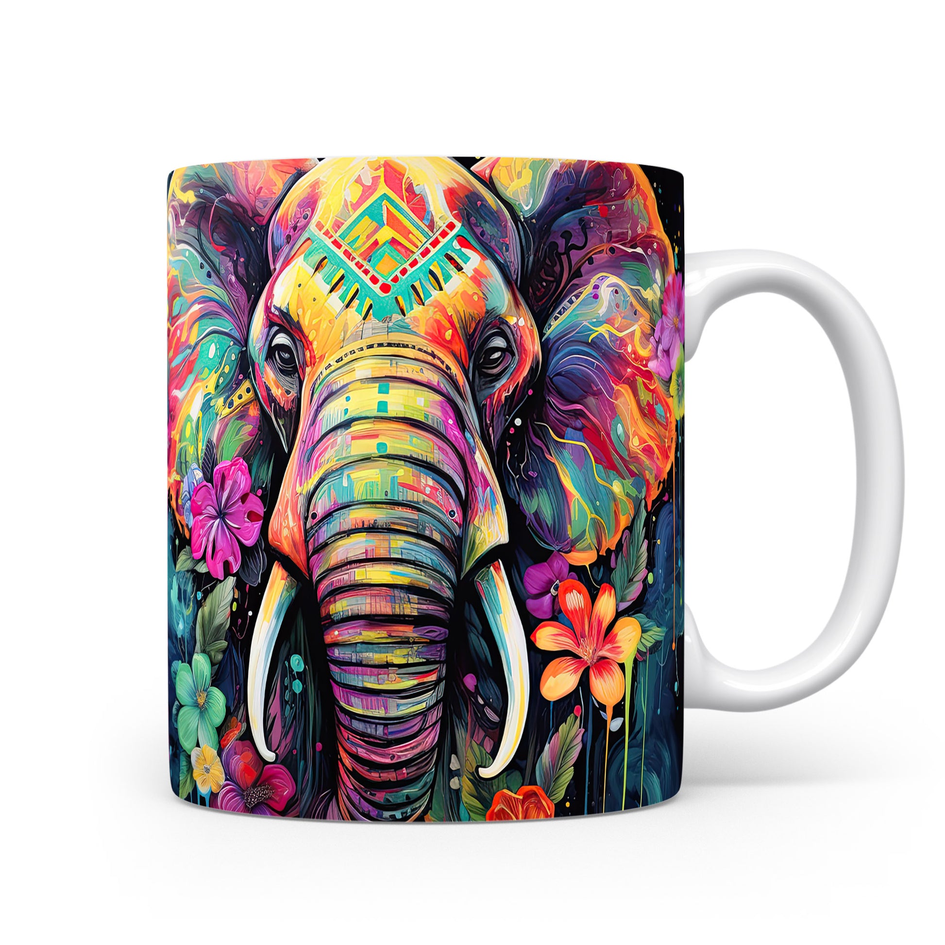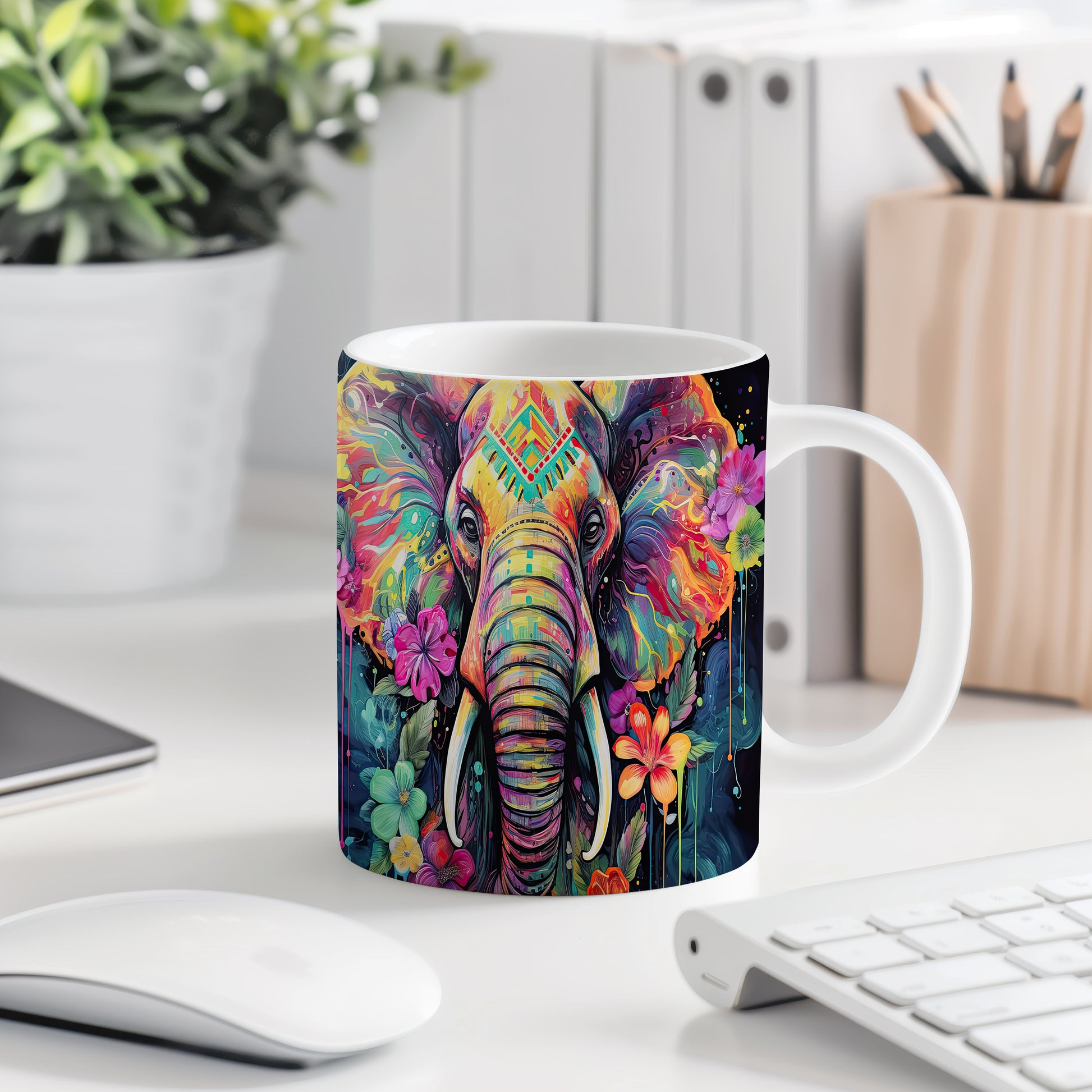 Tento keramický hrnek s motivem barevného slona a květin je skvělou volbou pro milovníky přírody. Je ideální jako dárek pro přátele nebo rodinu, kteří ocení originální design. Materiál: keramika. Objem: 330 ml. Vhodné do myčky i mikrovlnky. Užijte si svůj oblíbený nápoj s tímto jedinečným hrnkem.