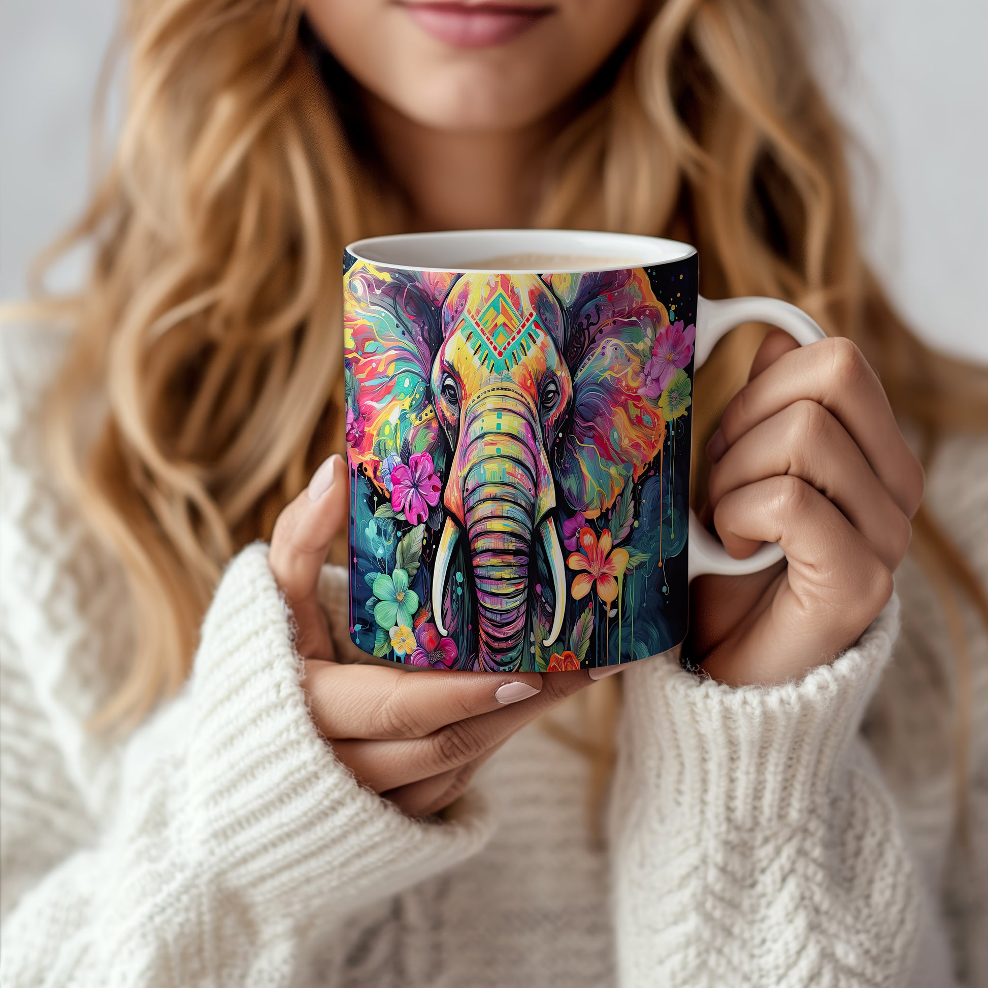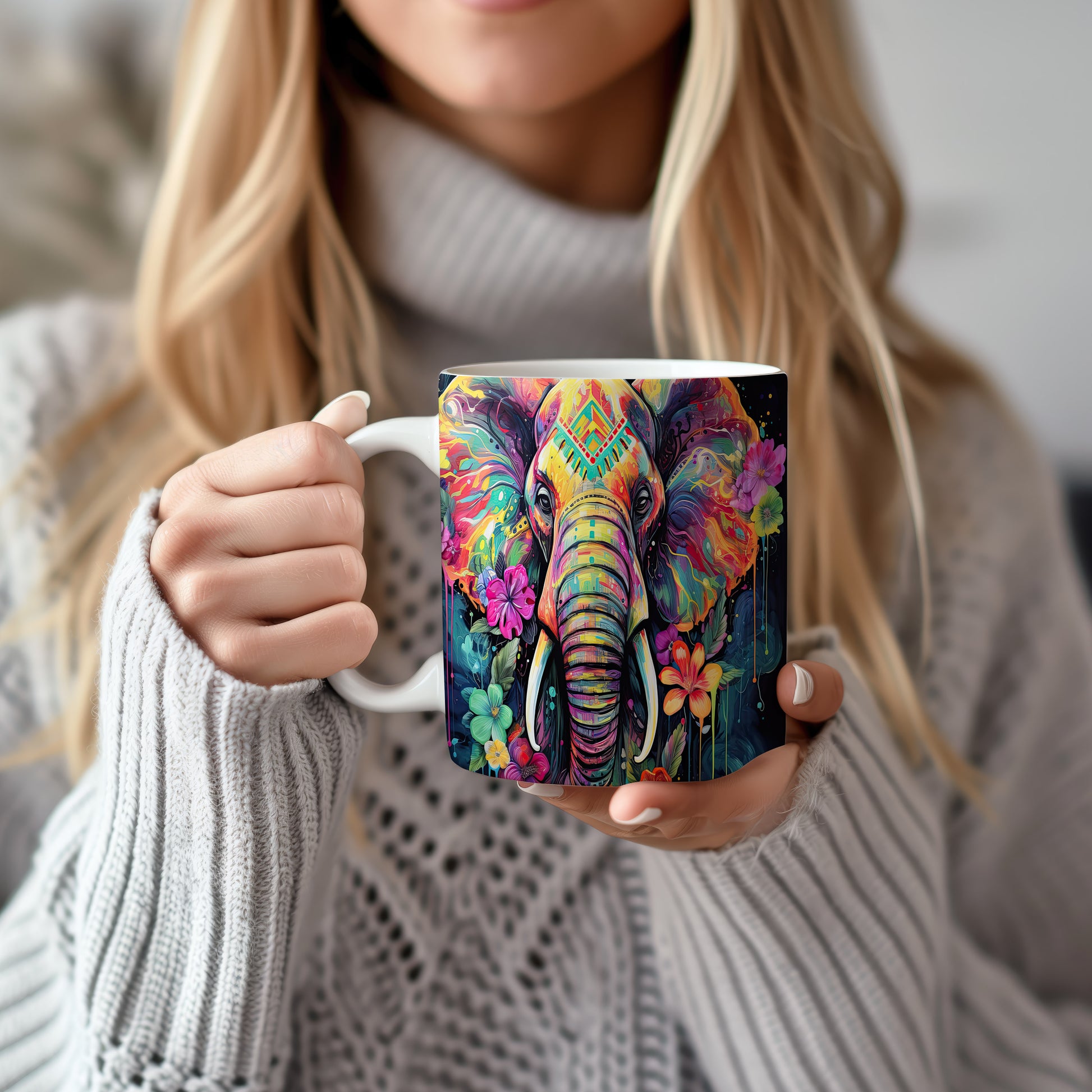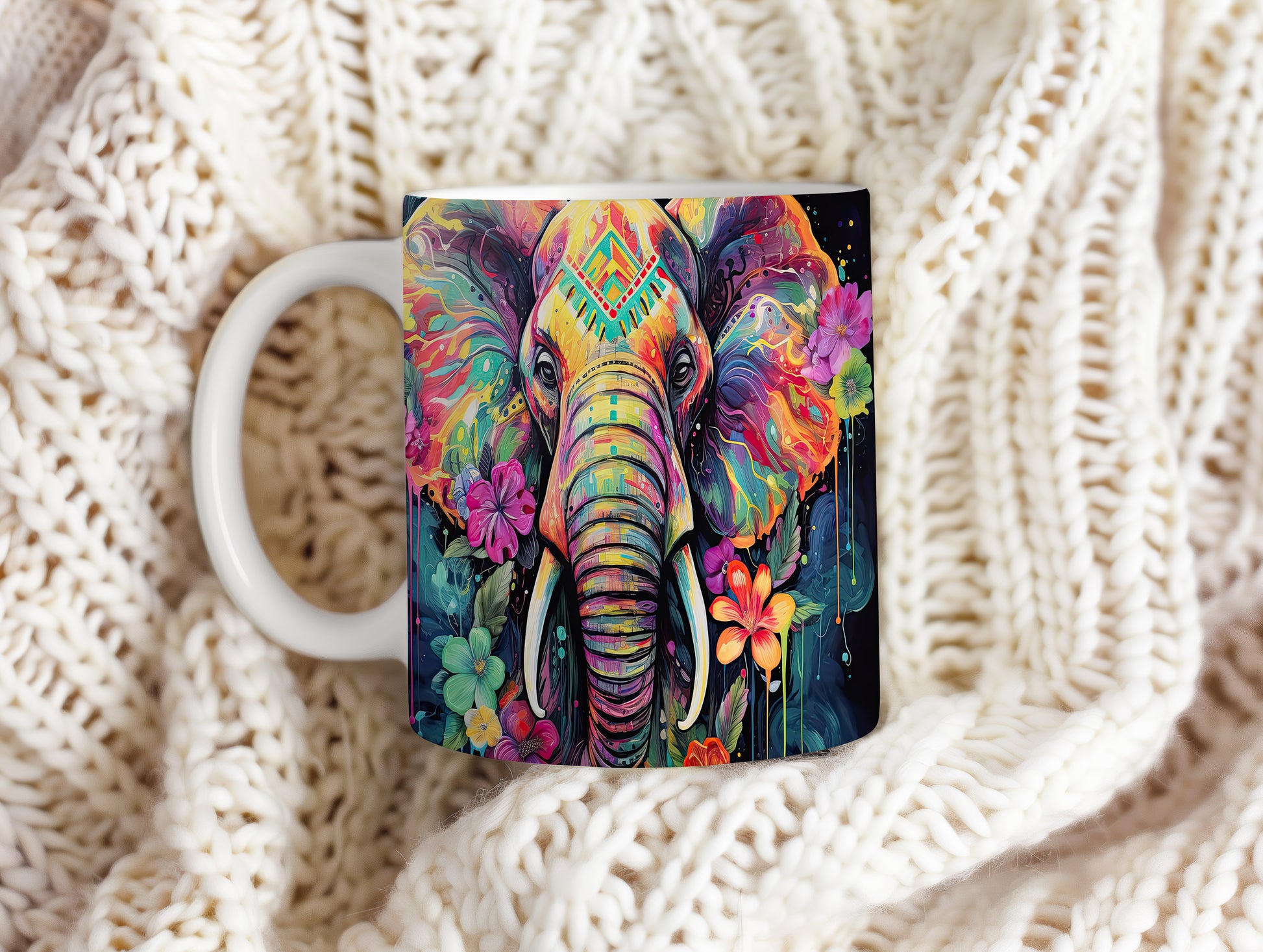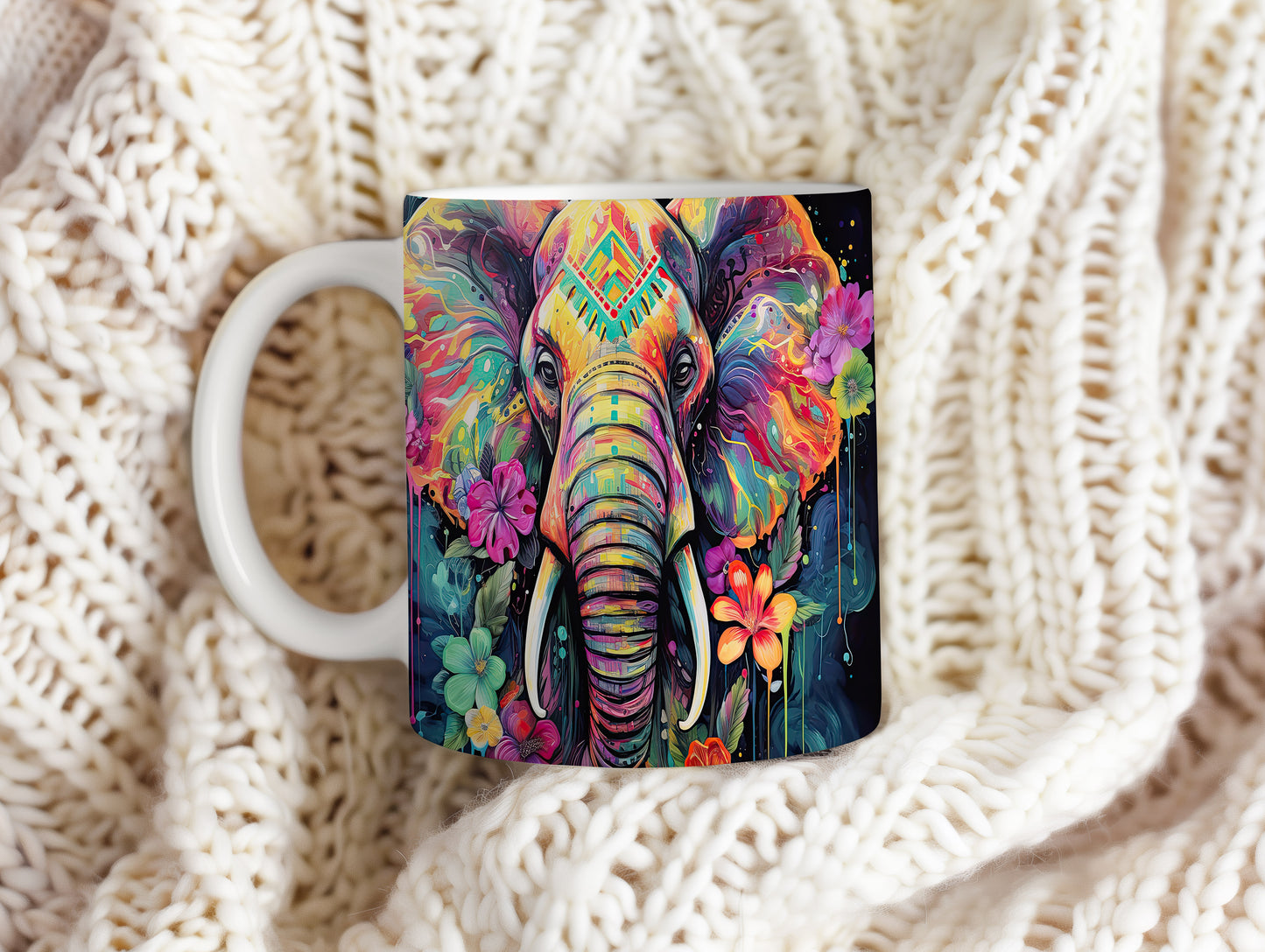 Tento keramický hrnek s motivem barevného slona a květin je skvělou volbou pro milovníky přírody. Je ideální jako dárek pro přátele nebo rodinu, kteří ocení originální design. Materiál: keramika. Objem: 330 ml. Vhodné do myčky i mikrovlnky. Užijte si svůj oblíbený nápoj s tímto jedinečným hrnkem.