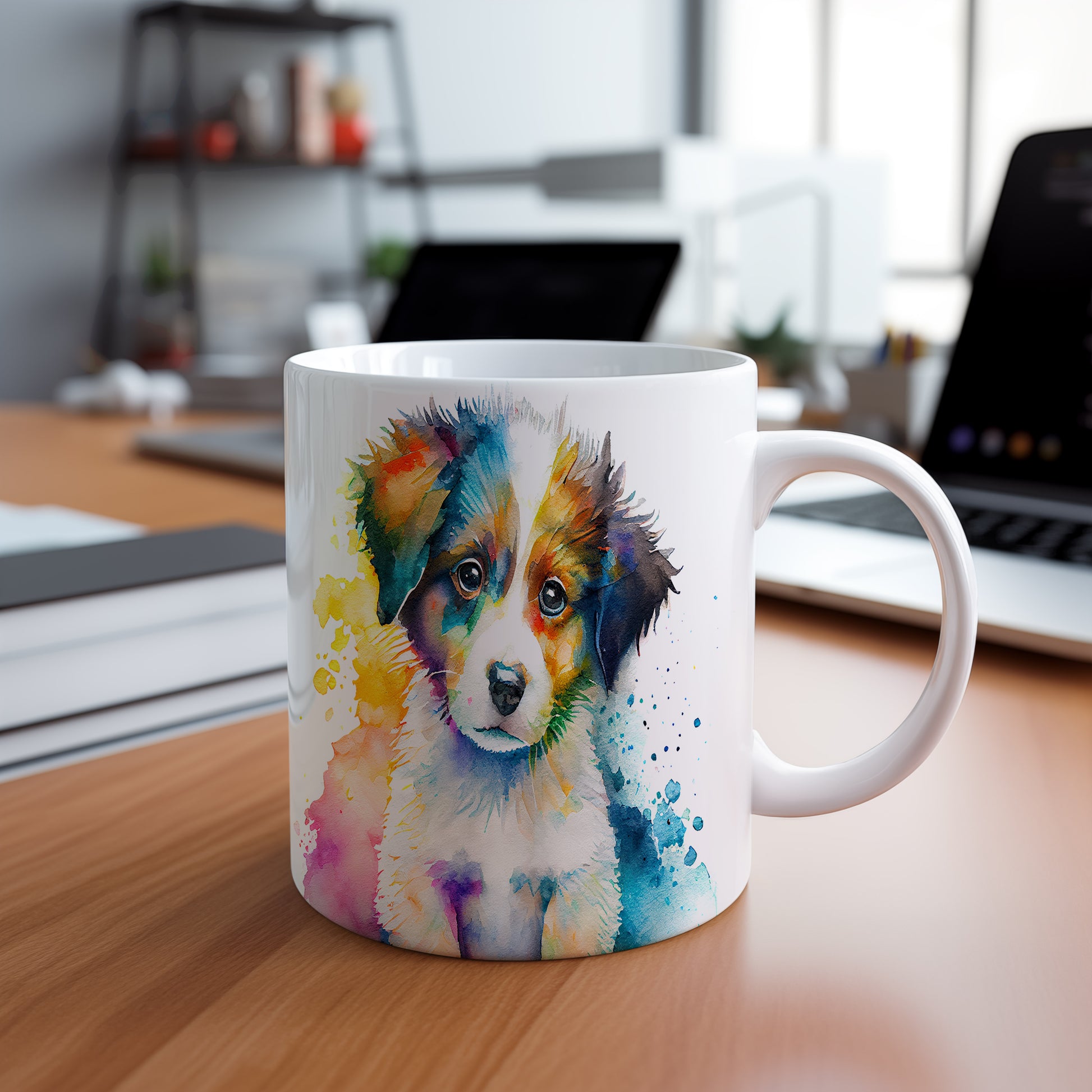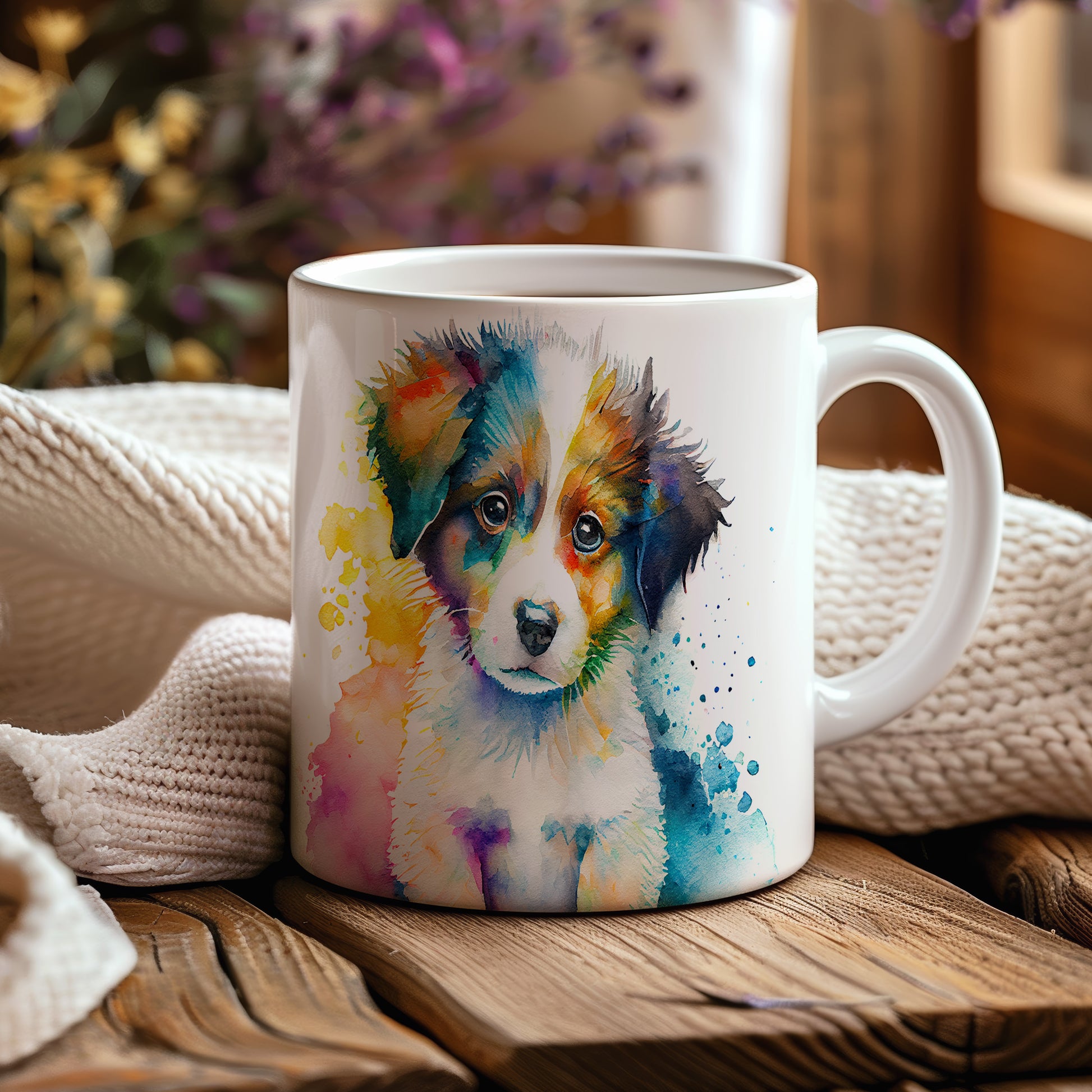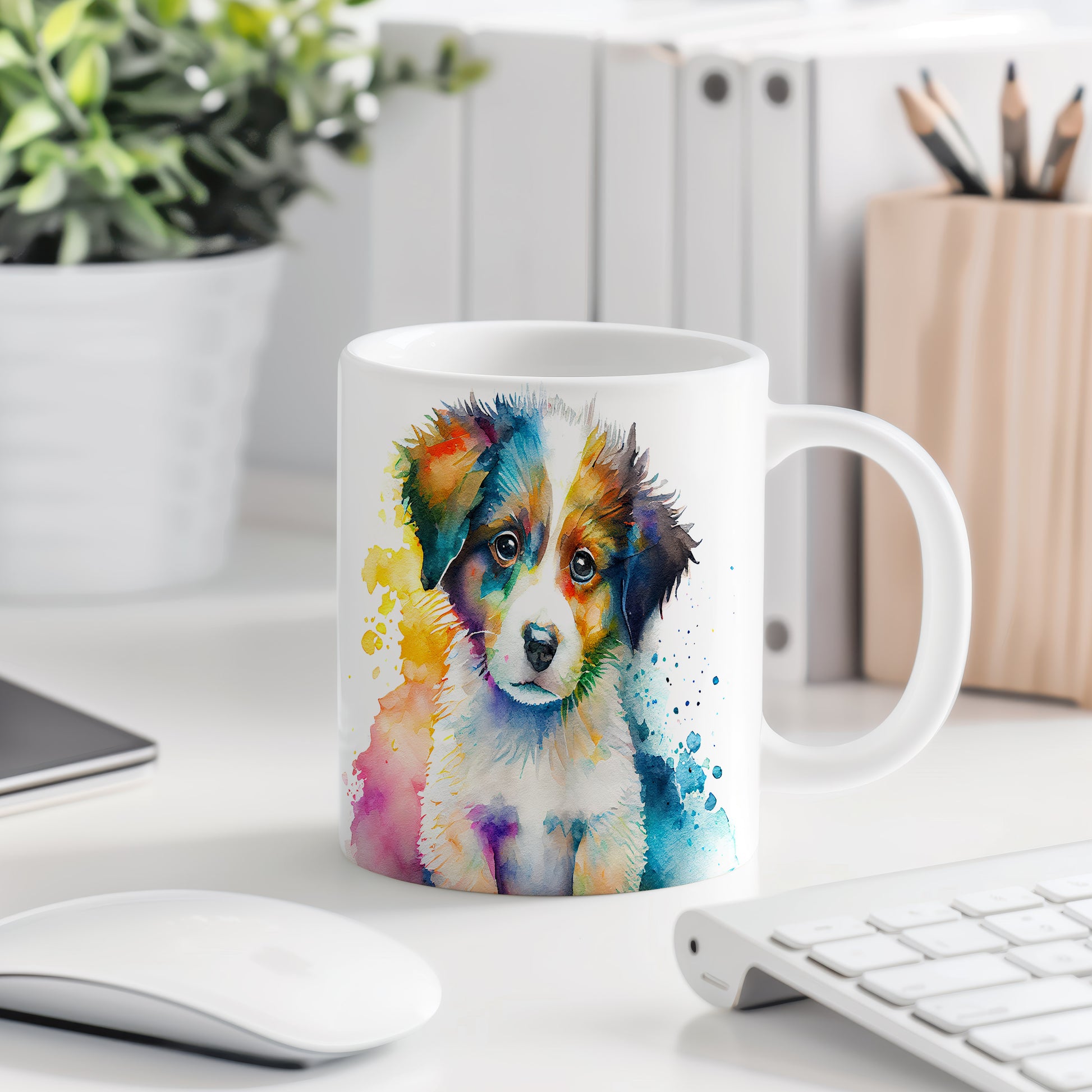 Keramický hrnek s motivem barevného štěněte, stylizovaný akvarelovým stylem. Tento hrnek je ideální pro milovníky psů a skvělý dárek pro každého, kdo si rád užívá domácí pohodu. Materiál: keramika. Objem: 330 ml. Vhodné do myčky i mikrovlnky. Používání tohoto hrnku přináší radost a útulnost do každého dne.