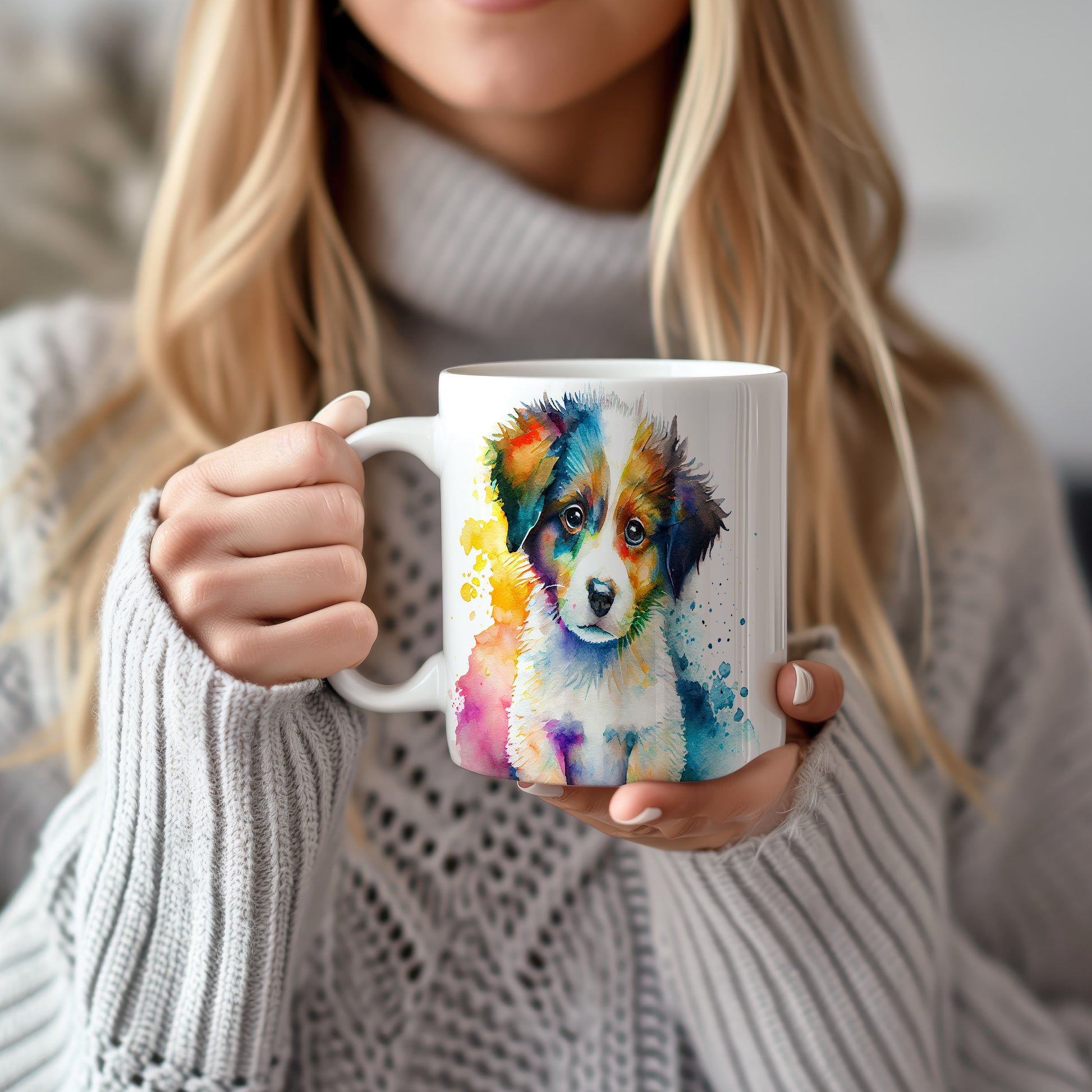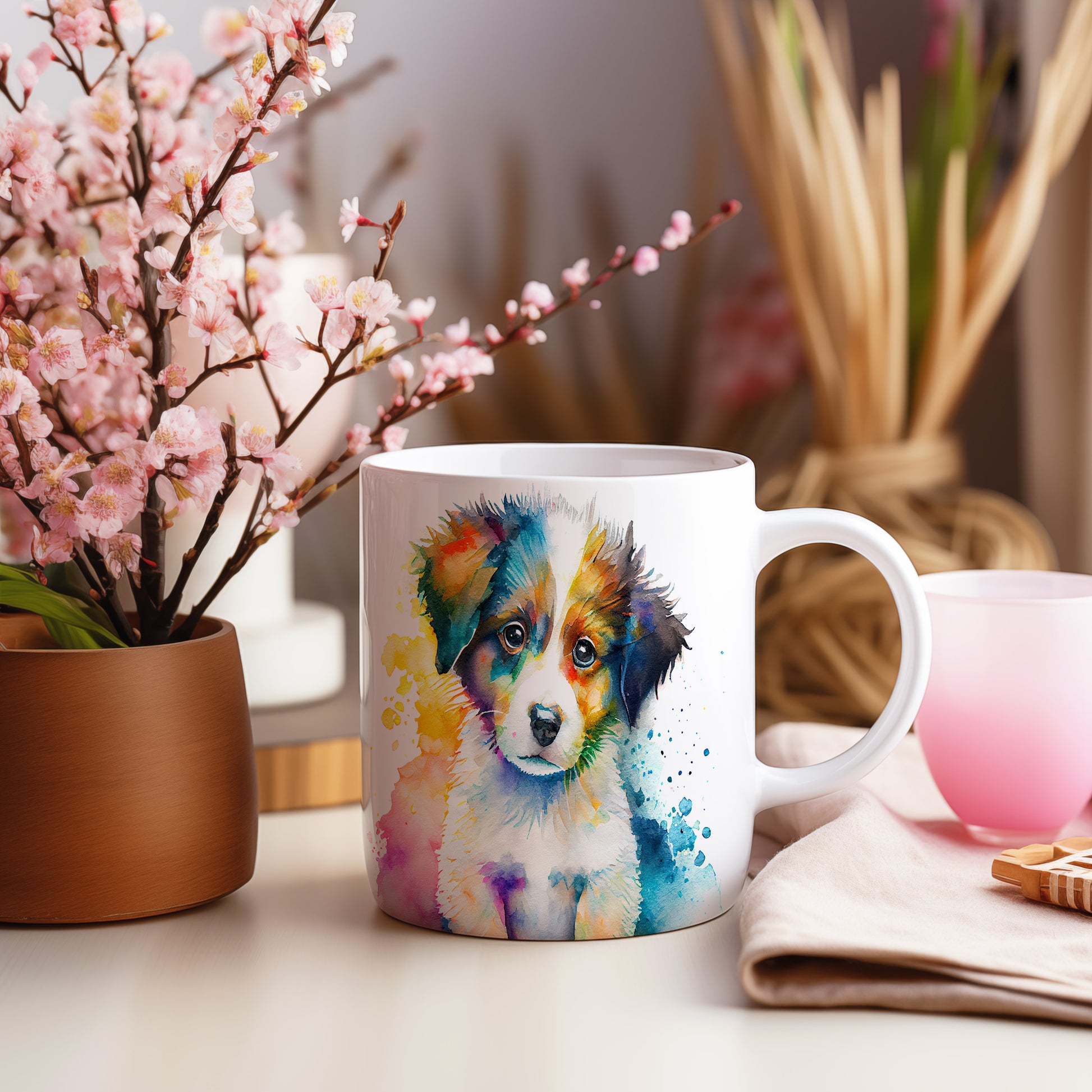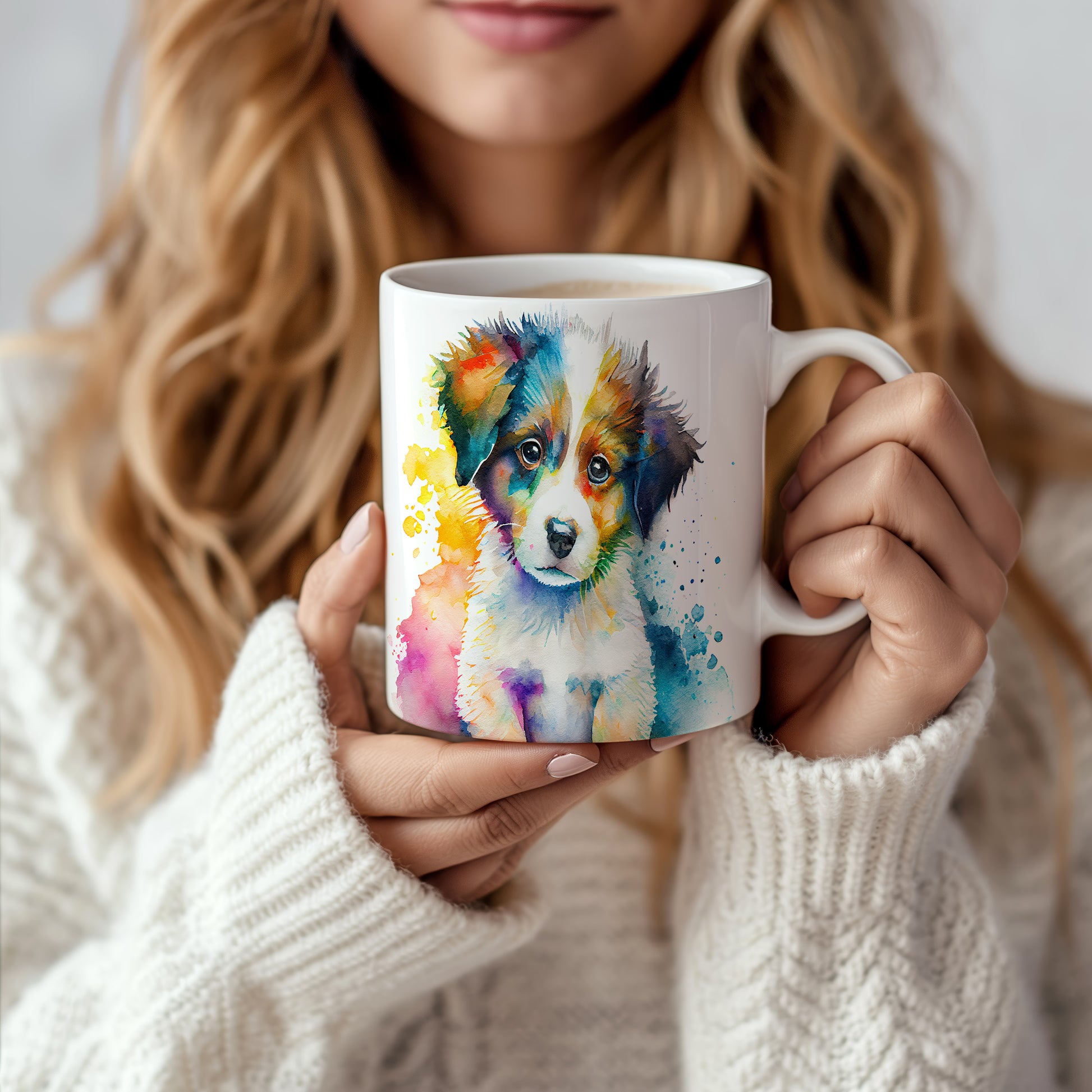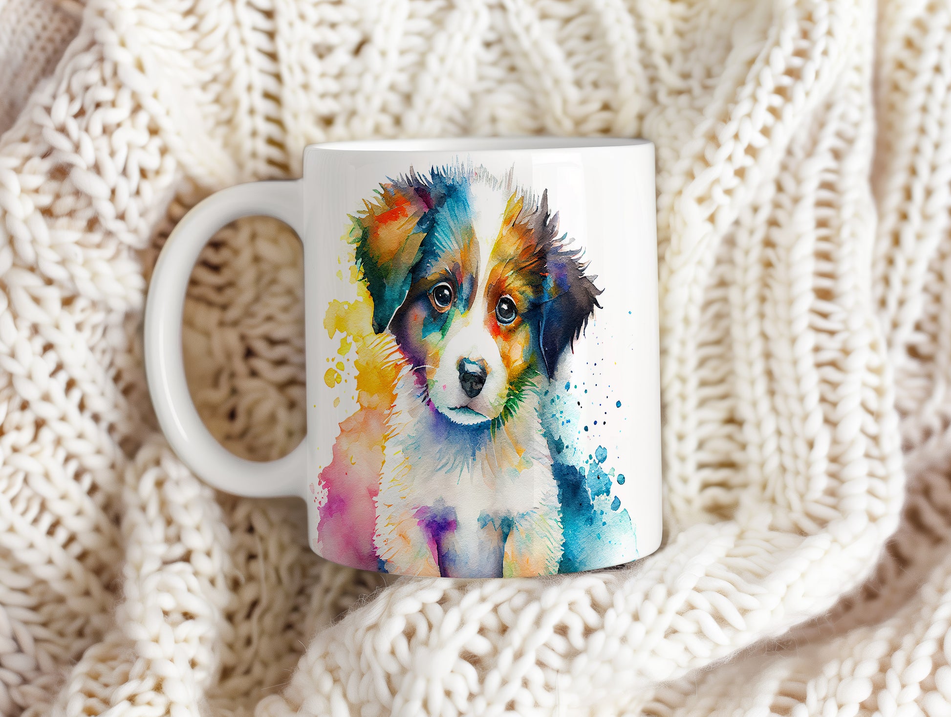 Keramický hrnek s motivem barevného štěněte, stylizovaný akvarelovým stylem. Tento hrnek je ideální pro milovníky psů a skvělý dárek pro každého, kdo si rád užívá domácí pohodu. Materiál: keramika. Objem: 330 ml. Vhodné do myčky i mikrovlnky. Používání tohoto hrnku přináší radost a útulnost do každého dne.