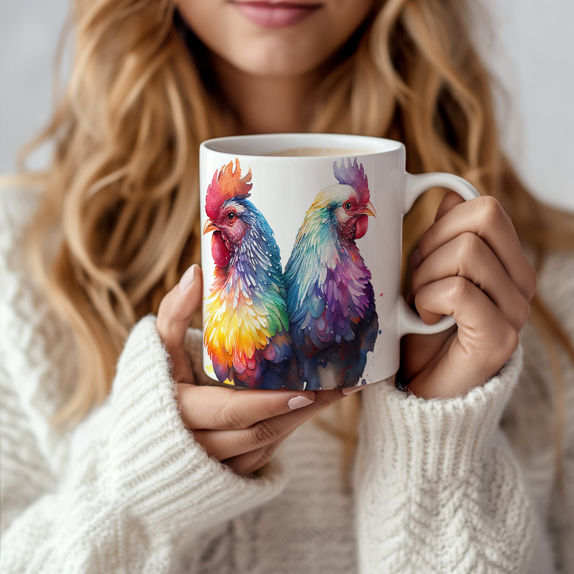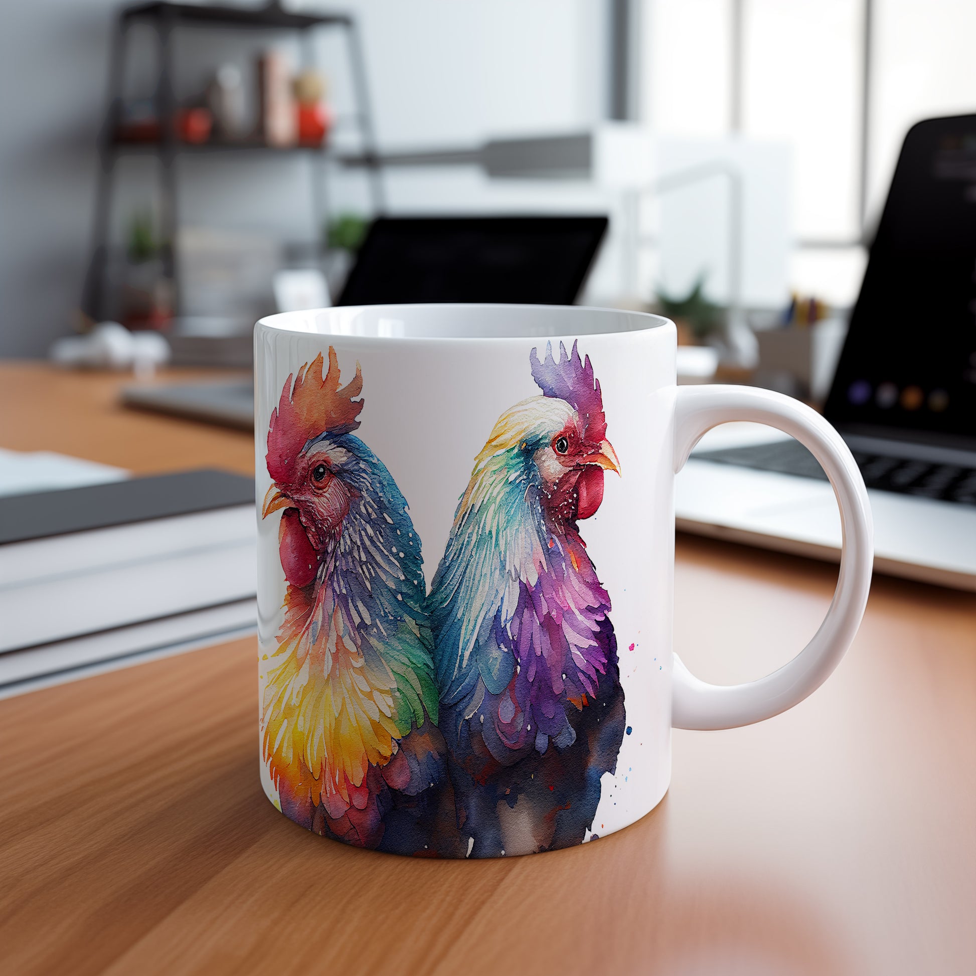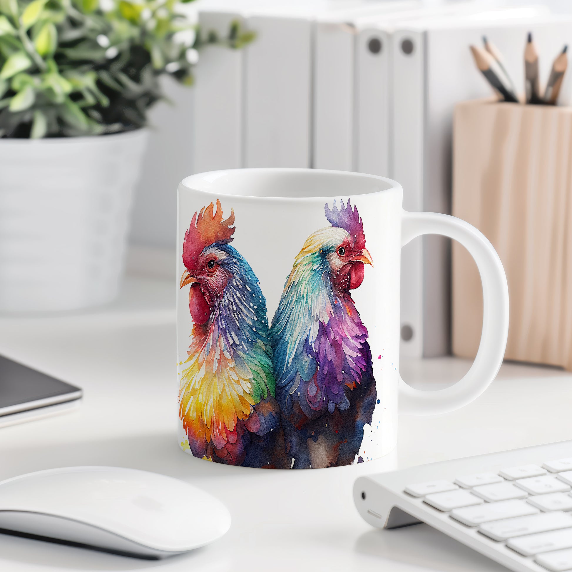 Tento elegantní hrnek s akvarelovou ilustrací dvou barevných kohoutů přináší do vašeho domova styl a barevnost. Je ideální pro milovníky originálního designu a skvělým dárkem pro přátele a rodinu. Materiál: keramika. Objem: 330 ml. Vhodné do myčky i mikrovlnky. Díky svému objemu je perfektní pro váš oblíbený nápoj.