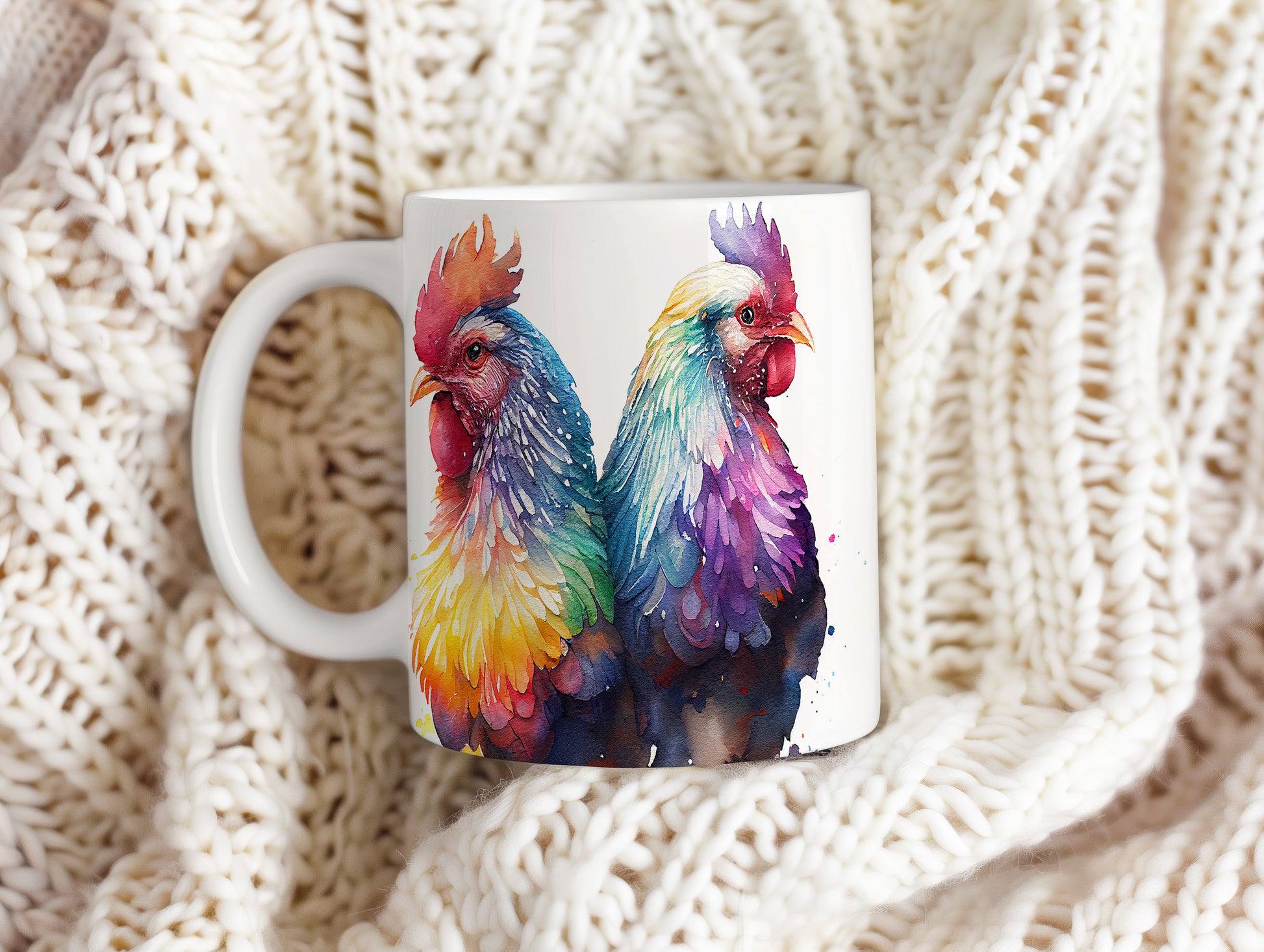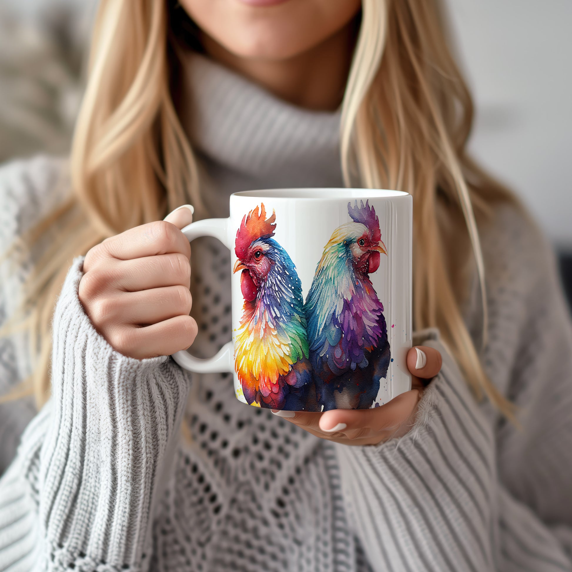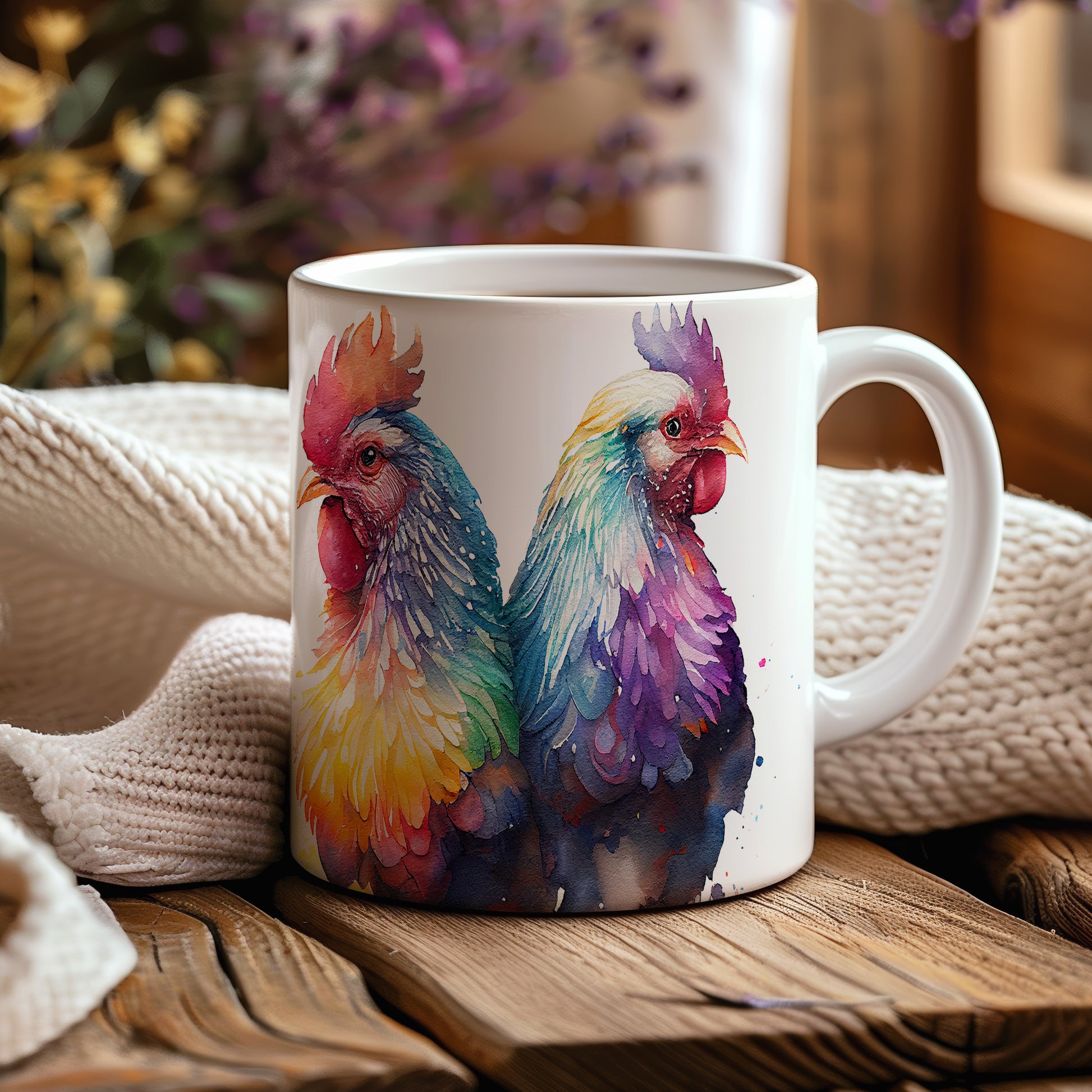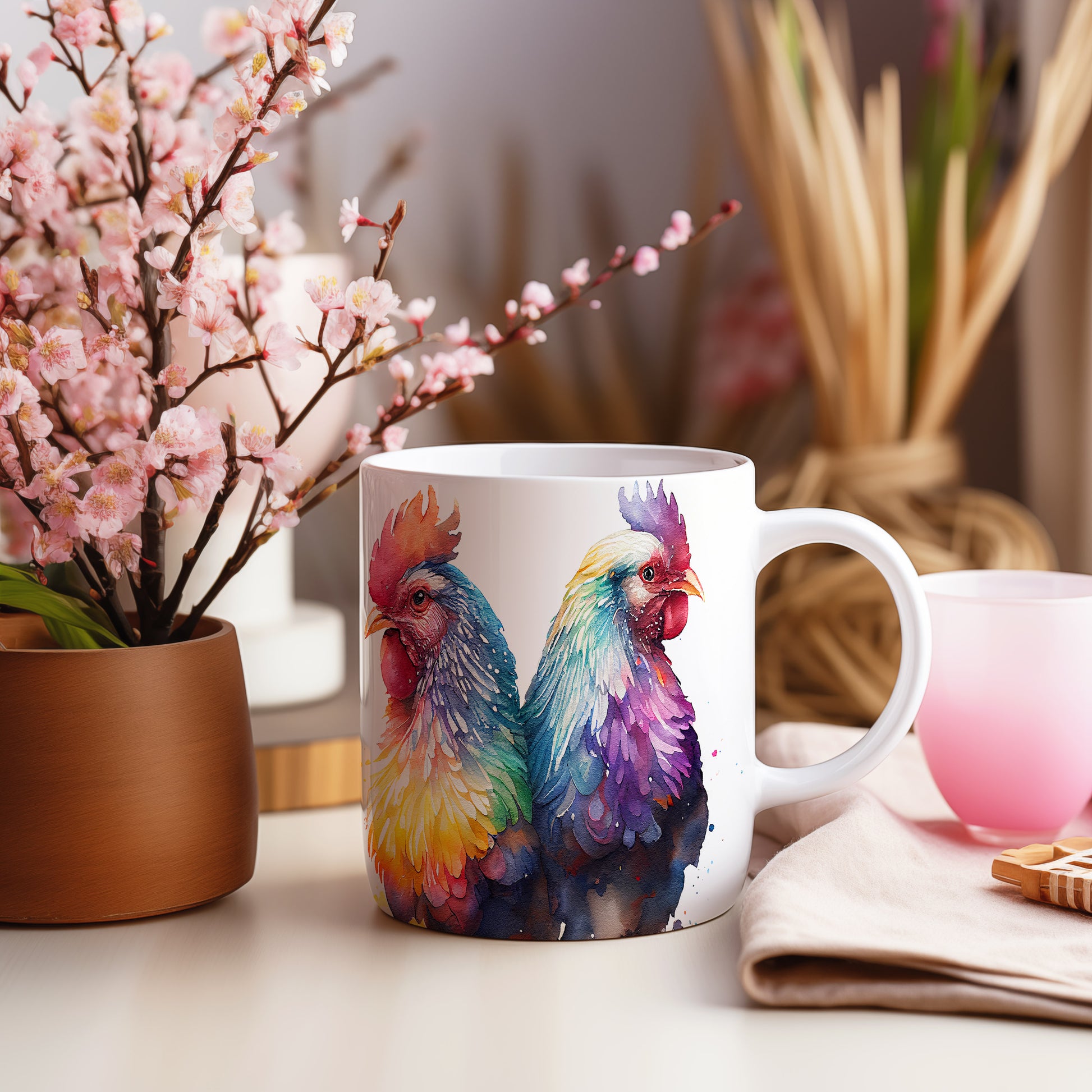 Tento elegantní hrnek s akvarelovou ilustrací dvou barevných kohoutů přináší do vašeho domova styl a barevnost. Je ideální pro milovníky originálního designu a skvělým dárkem pro přátele a rodinu. Materiál: keramika. Objem: 330 ml. Vhodné do myčky i mikrovlnky. Díky svému objemu je perfektní pro váš oblíbený nápoj.
