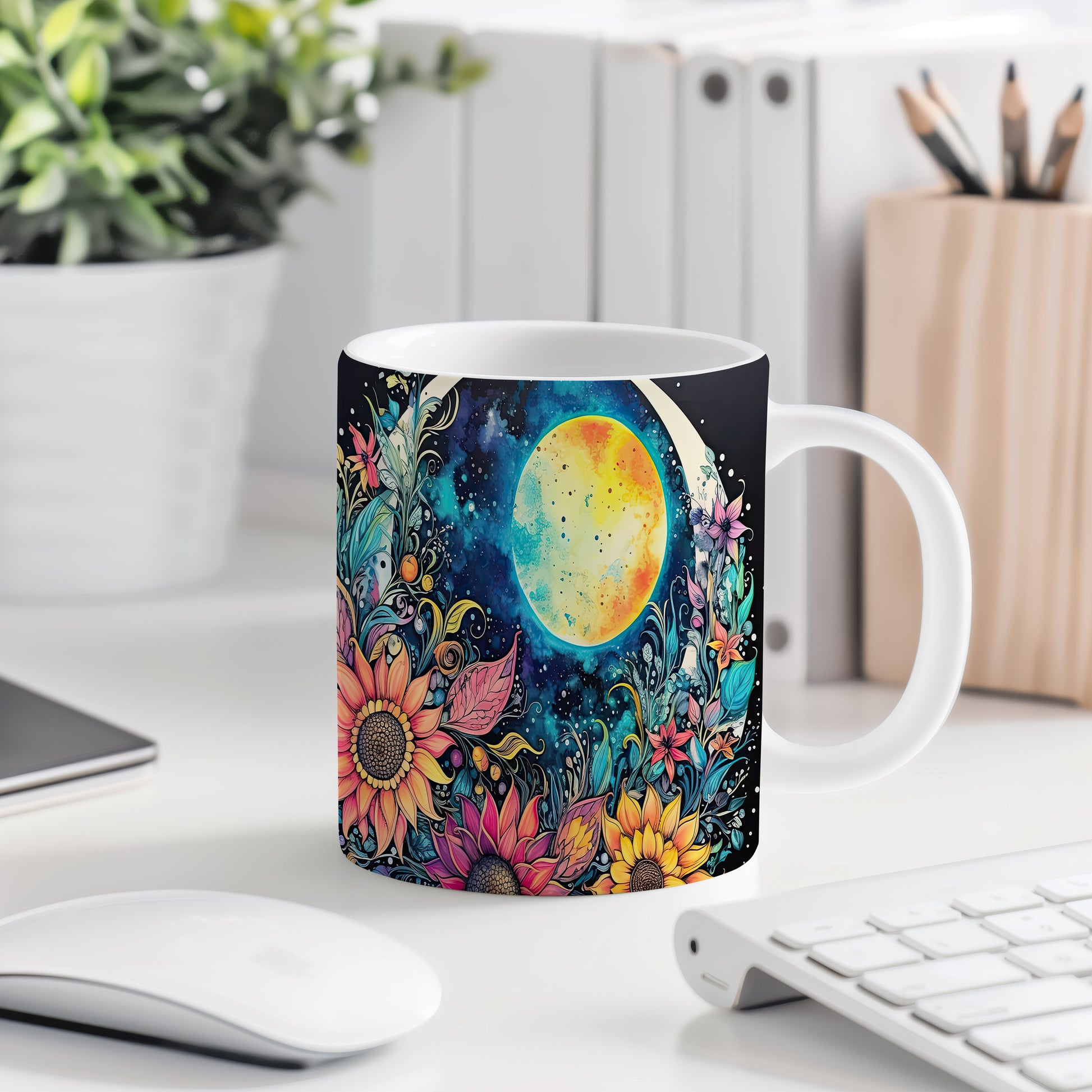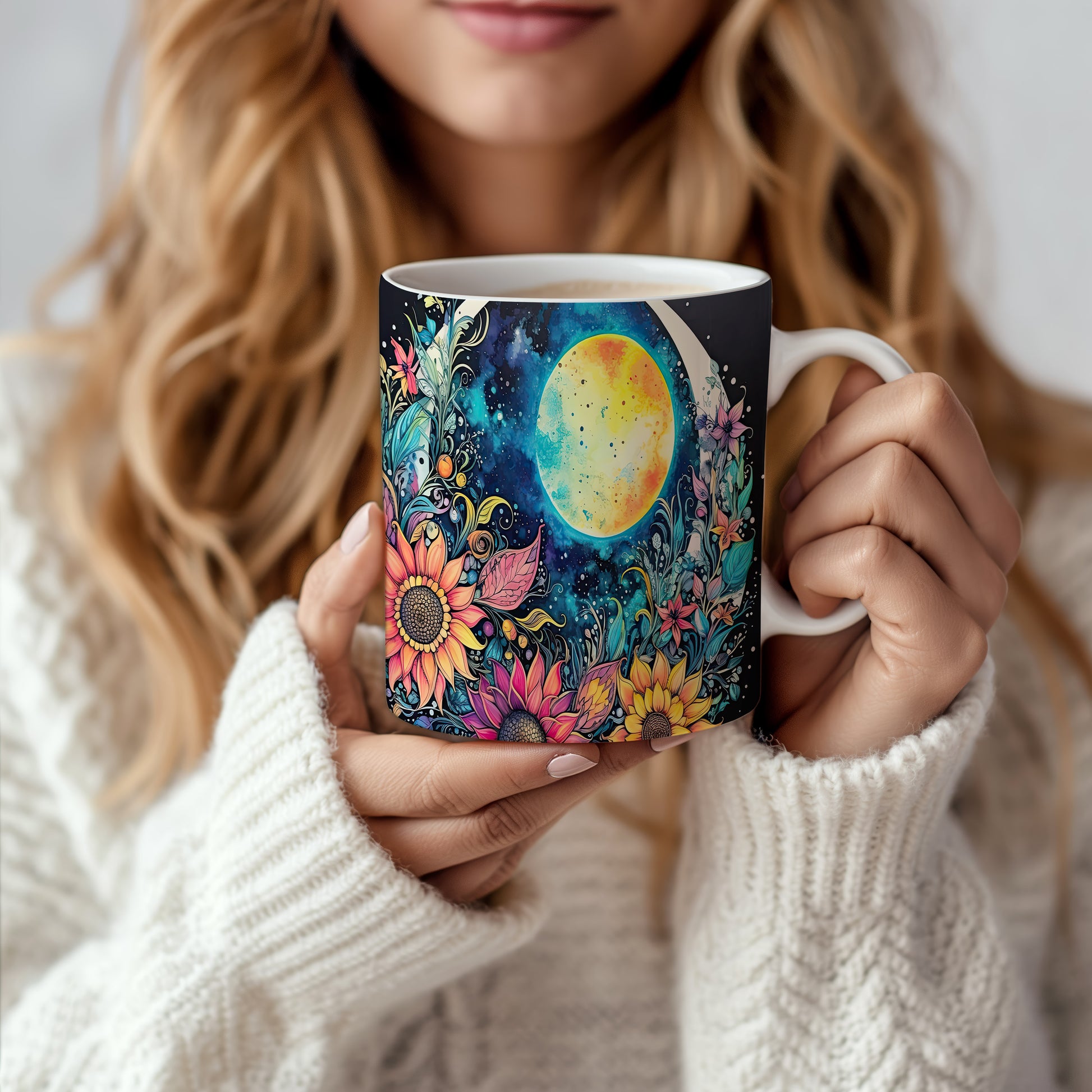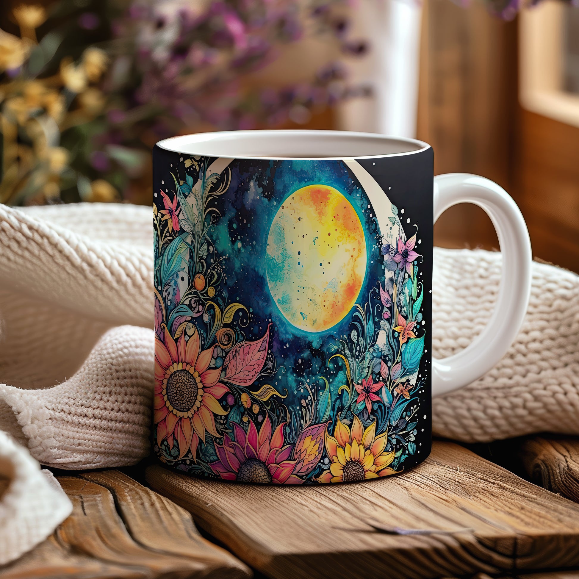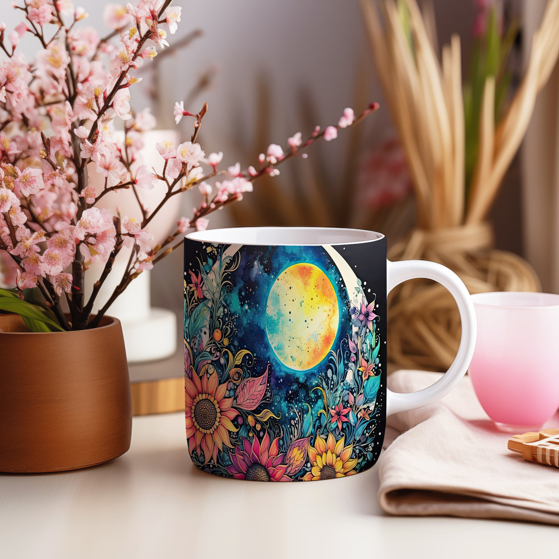 Hrnek s barevnými květinami a měsícem v fialových tónech