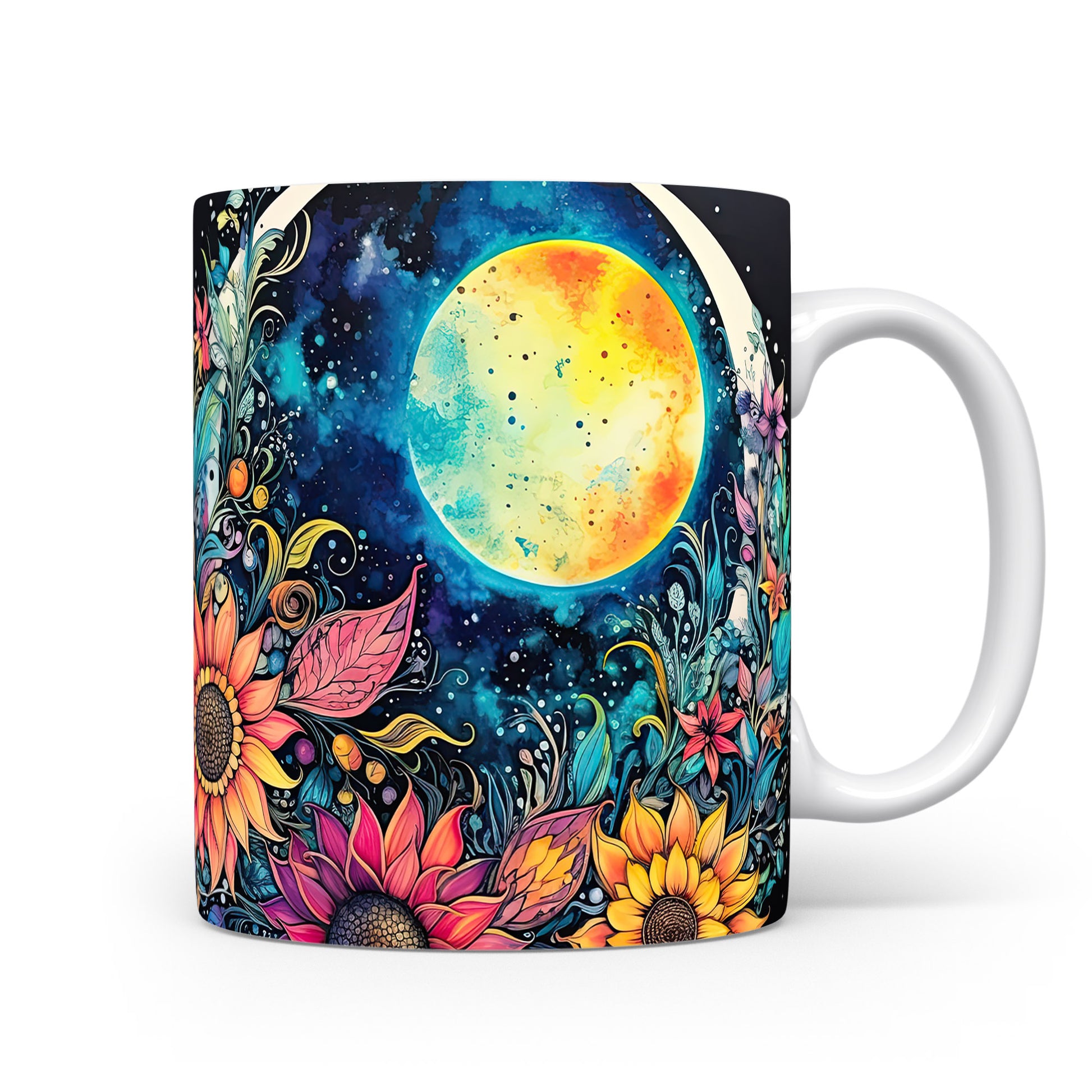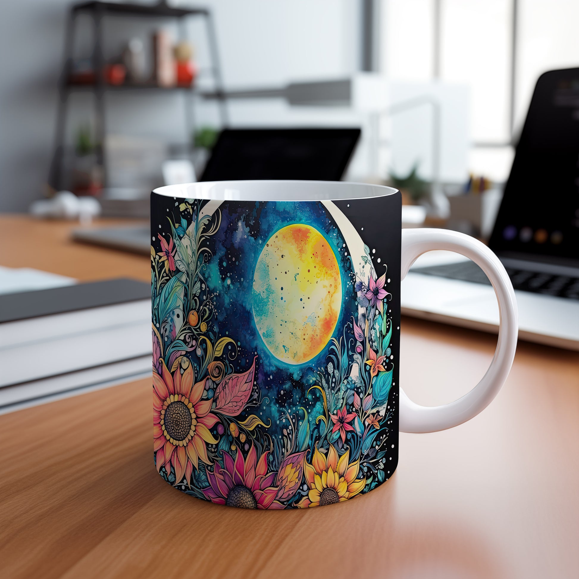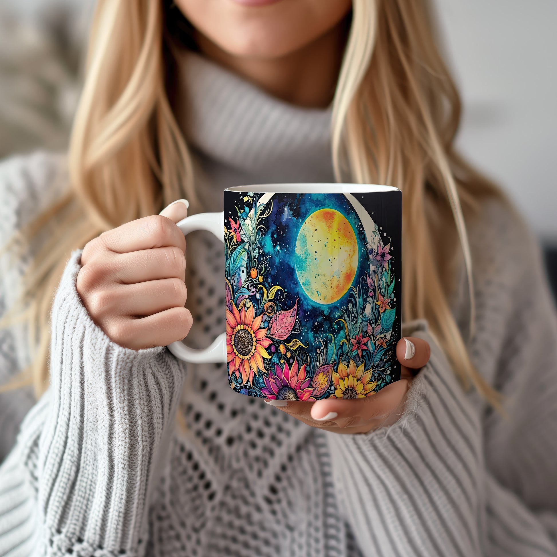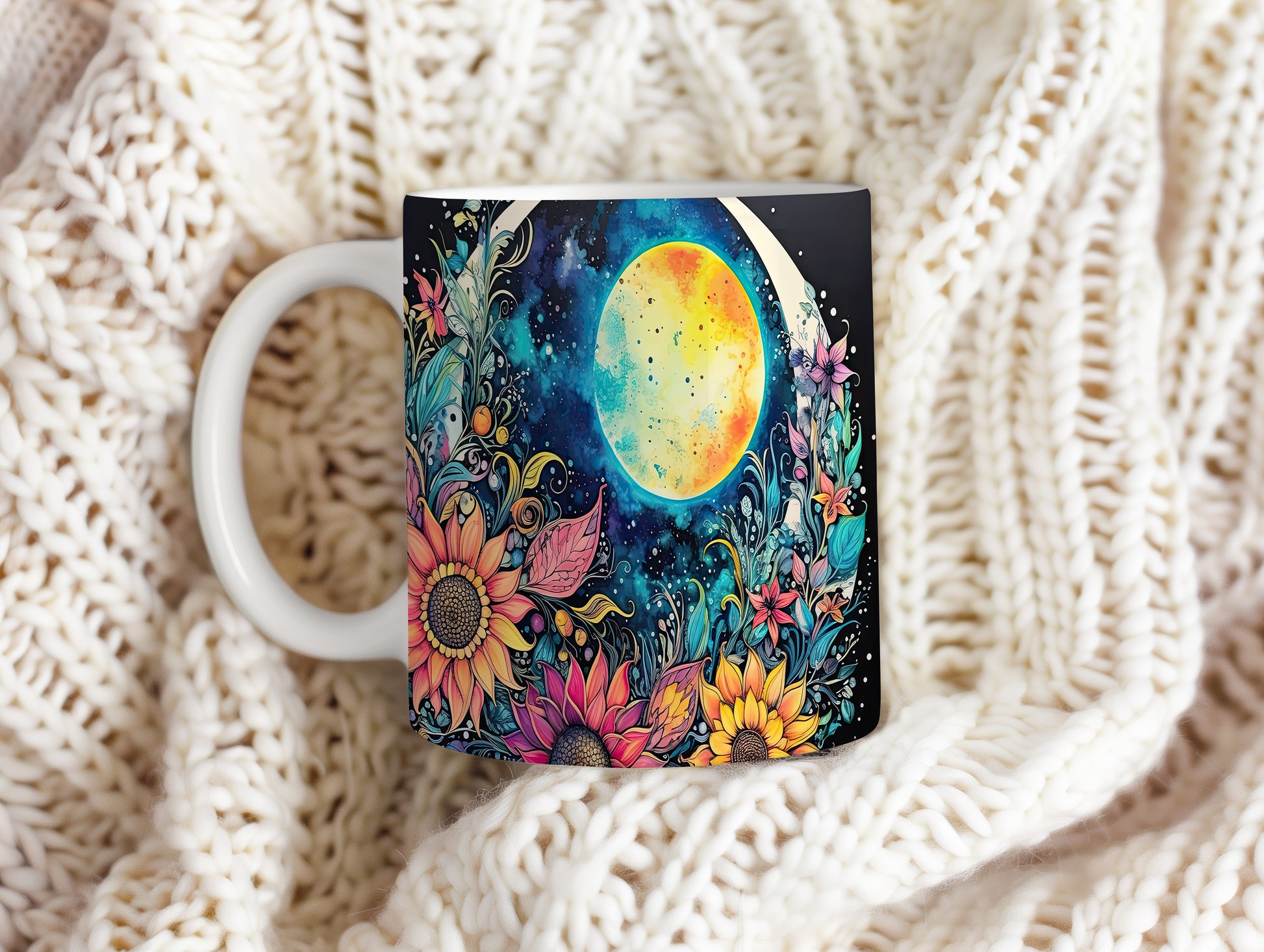 Hrnek s barevnými květinami a měsícem v fialových tónech