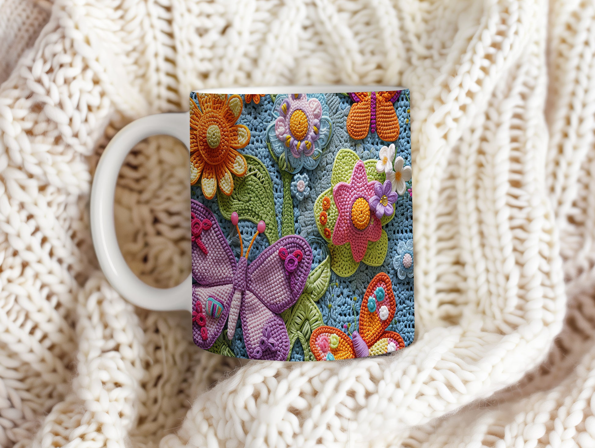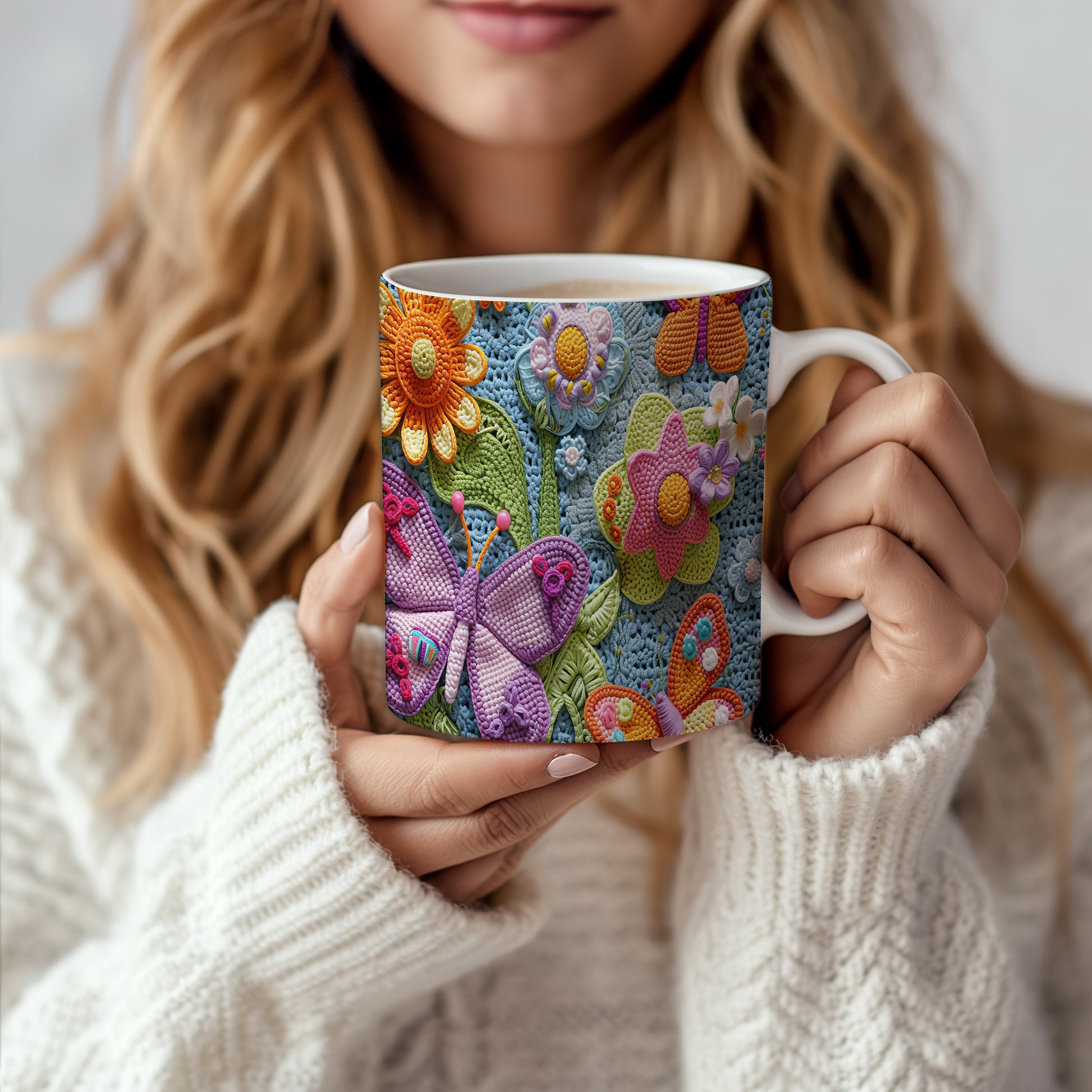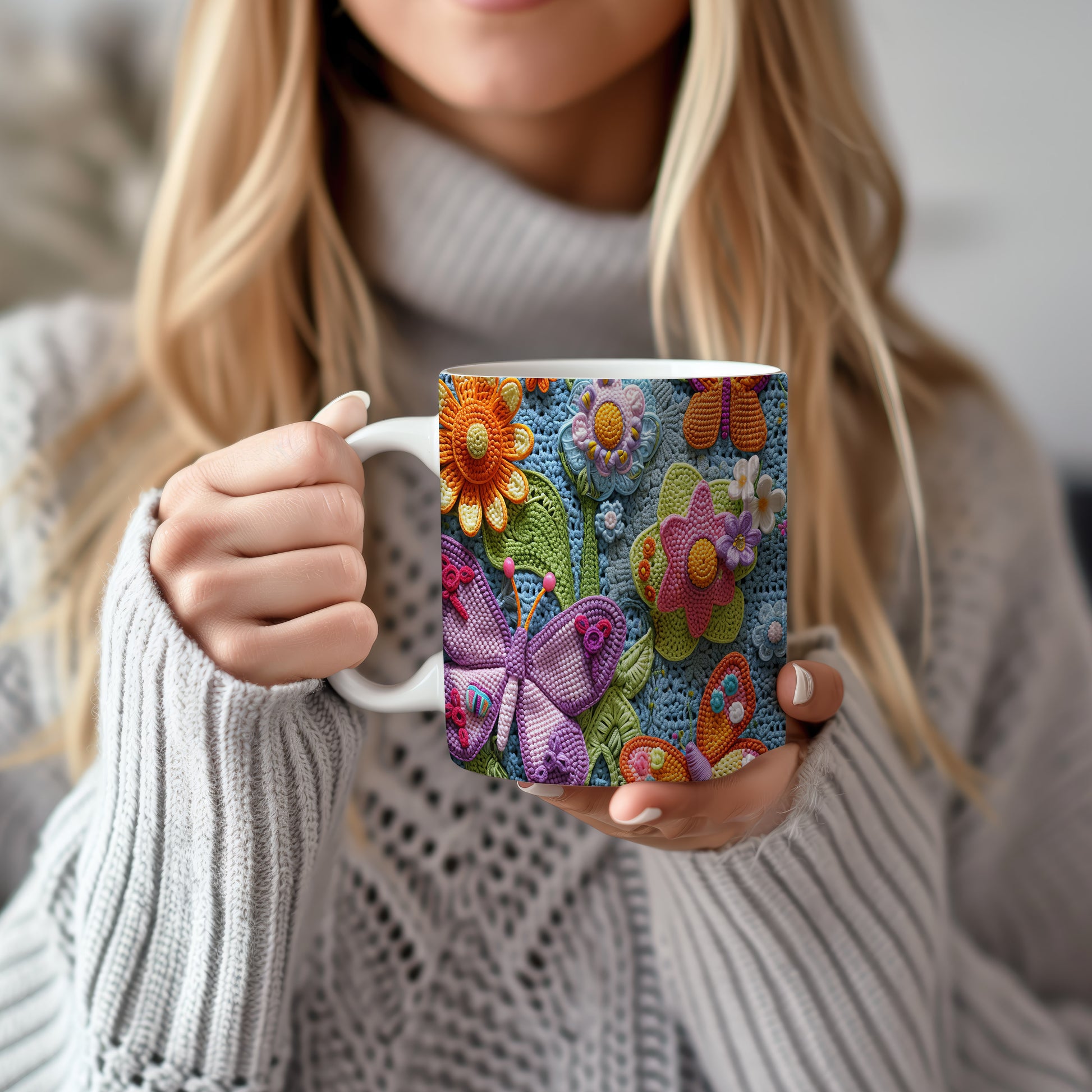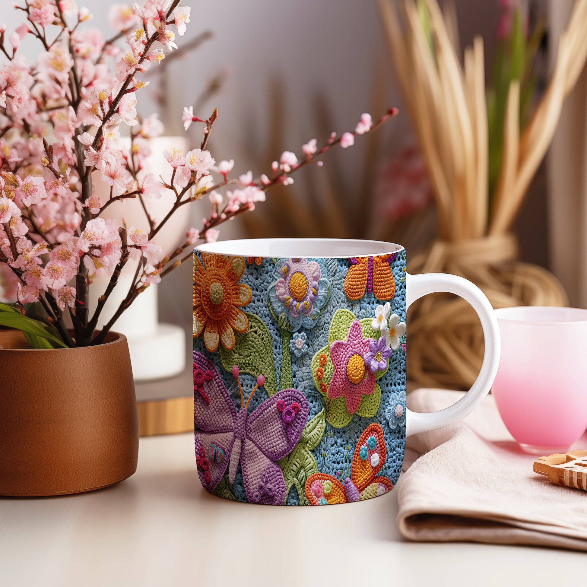 Hrnek s barevnými květinami a motýly – modrými detaily