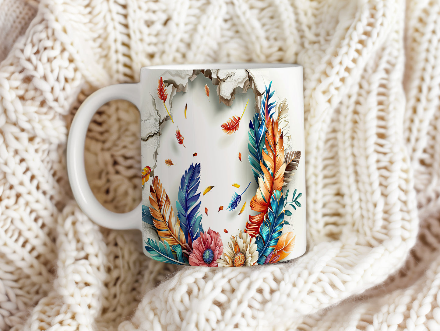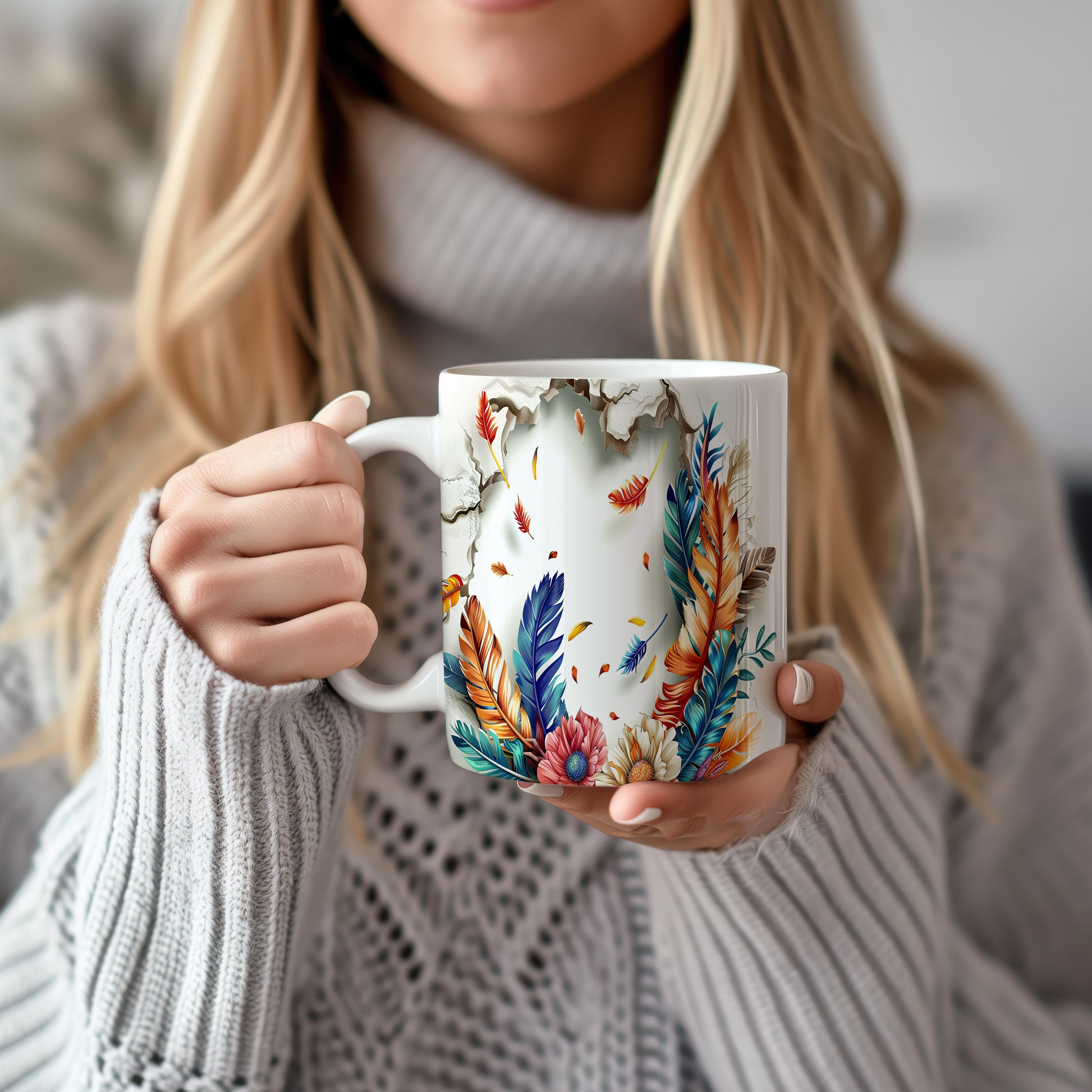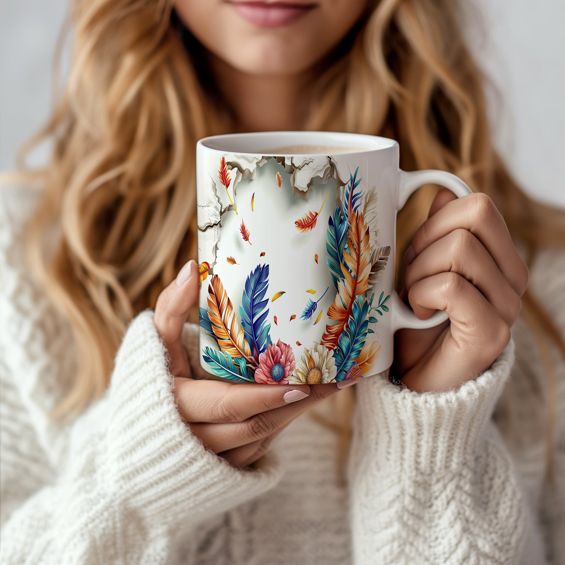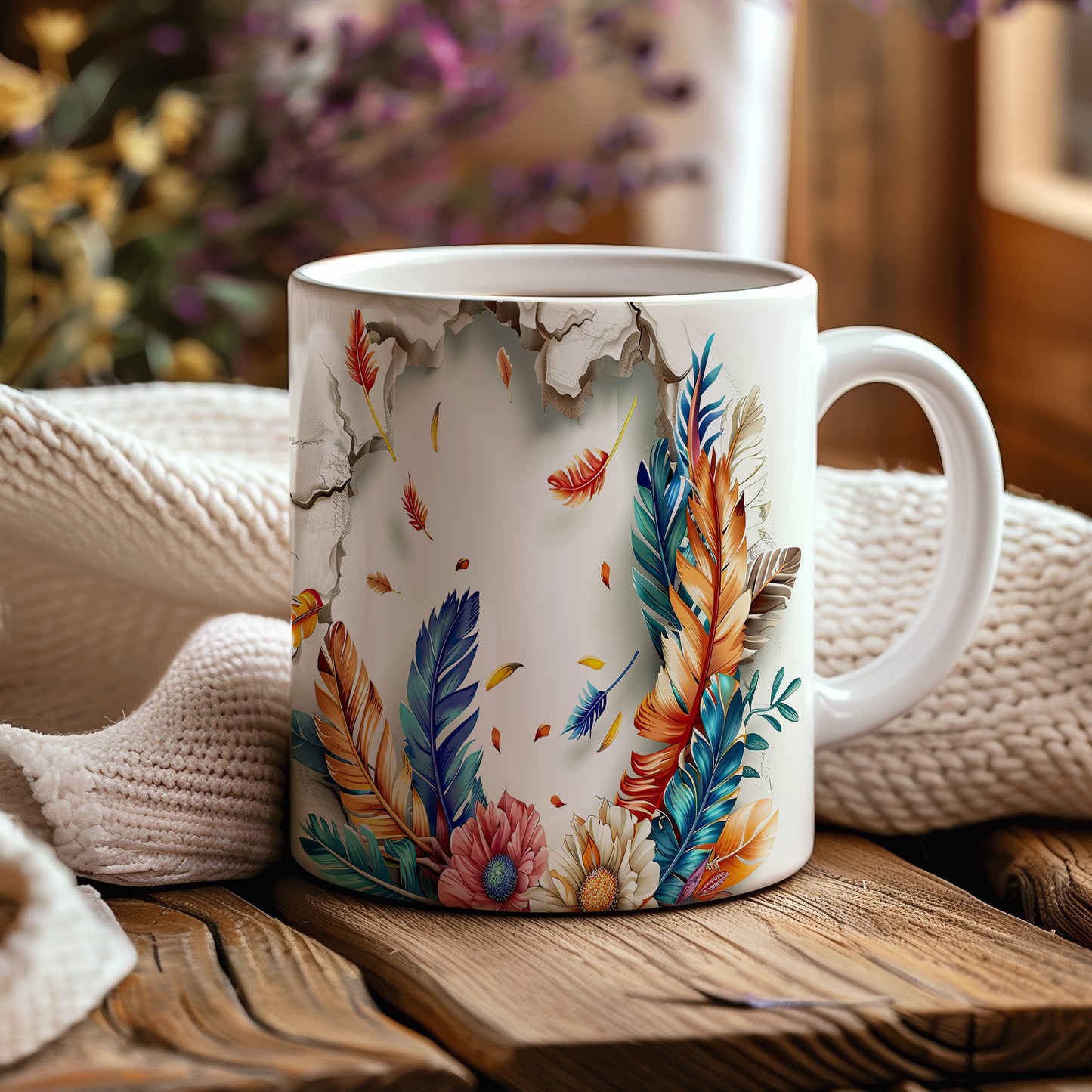 Tento hrnek s barevnými květinami a peřím je skvělým kouskem pro každého milovníka přírody. Je ideální jako dárek pro přátele nebo rodinu, kteří ocení originální design. Materiál: keramika. Objem: 330 ml. Vhodné do myčky i mikrovlnky. Používáním tohoto hrnku si zpříjemníte každodenní pití a dodáte mu osobitý styl.