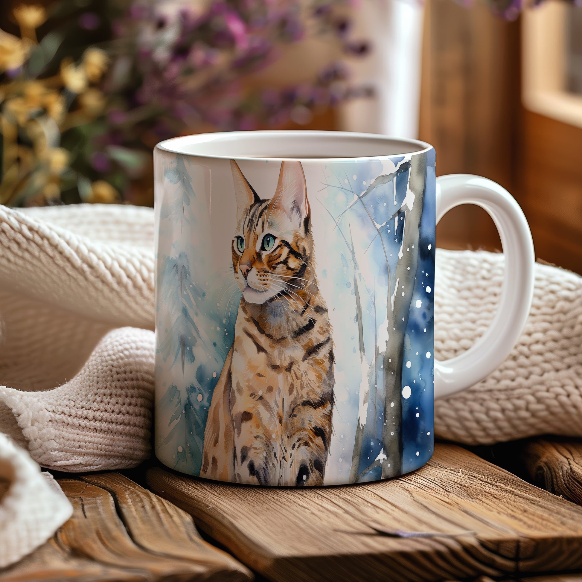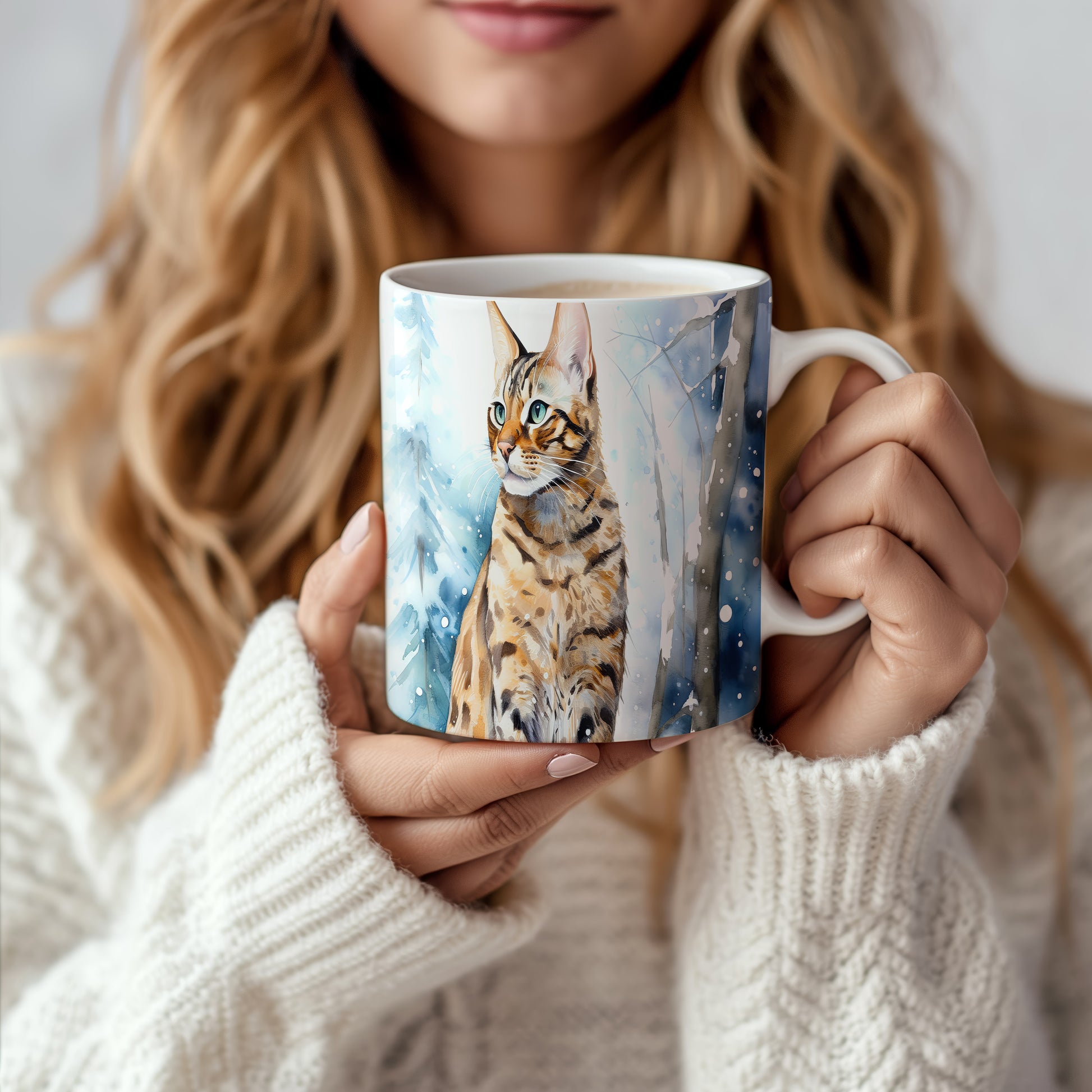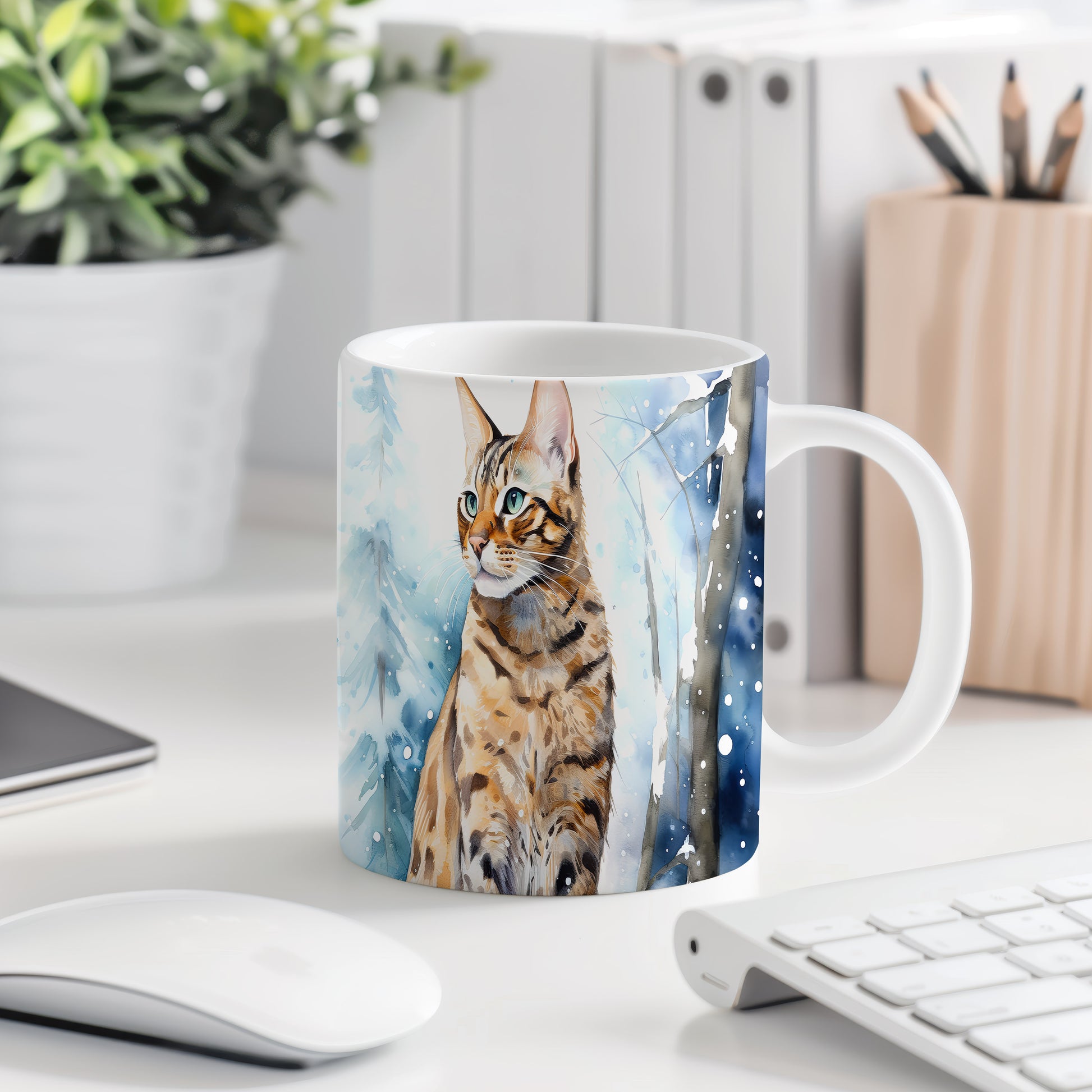 Hrnek s motivem bengálské kočky v zasněžené scenérii je stylovým kouskem pro všechny milovníky těchto krásných zvířat. Tento hrnek je skvělým dárkem pro přátele nebo rodinu, kteří ocení jedinečný design. Materiál: keramika. Objem: 330 ml. Vhodné do myčky i mikrovlnky. Díky svému originálnímu vzhledu přináší radost při každém doušku.