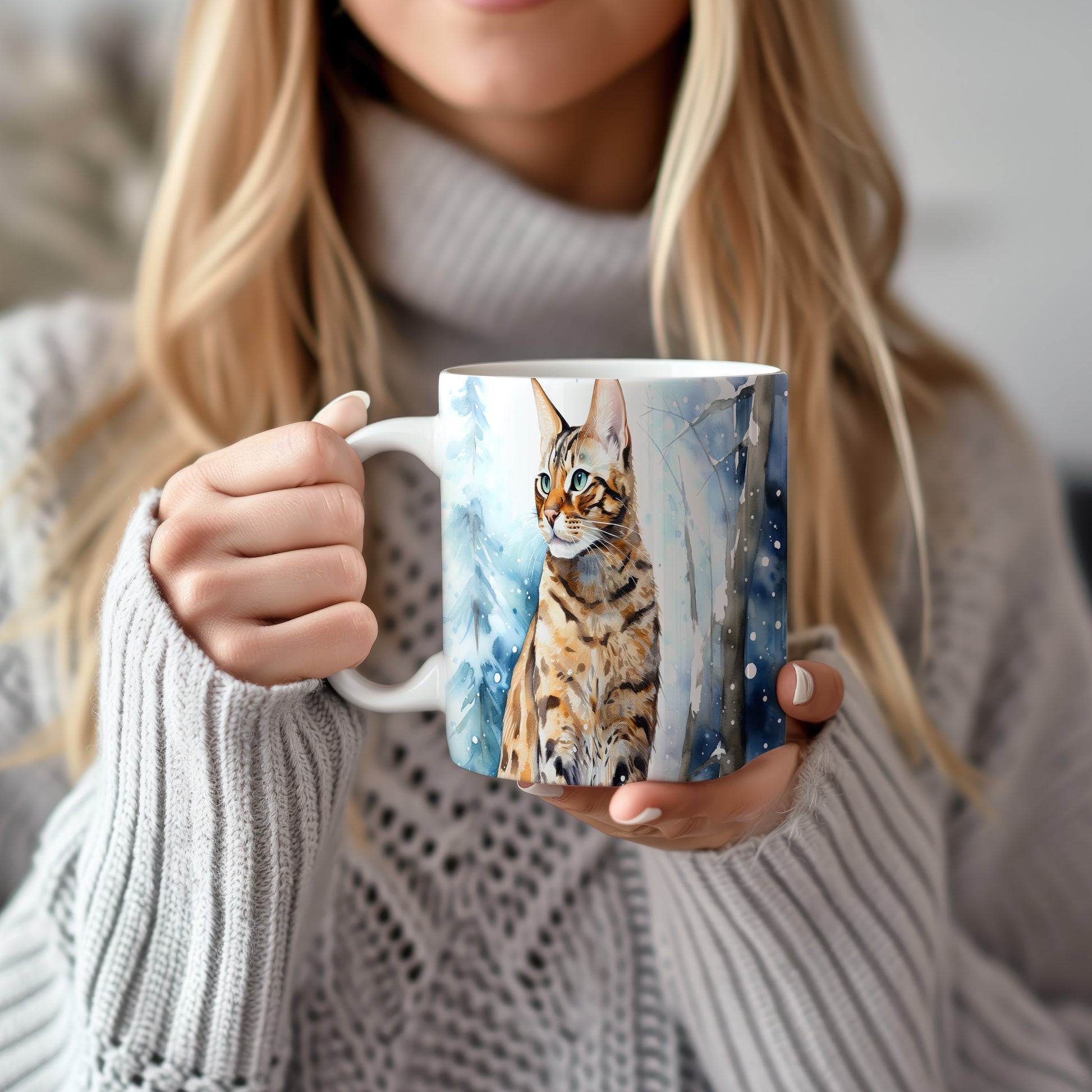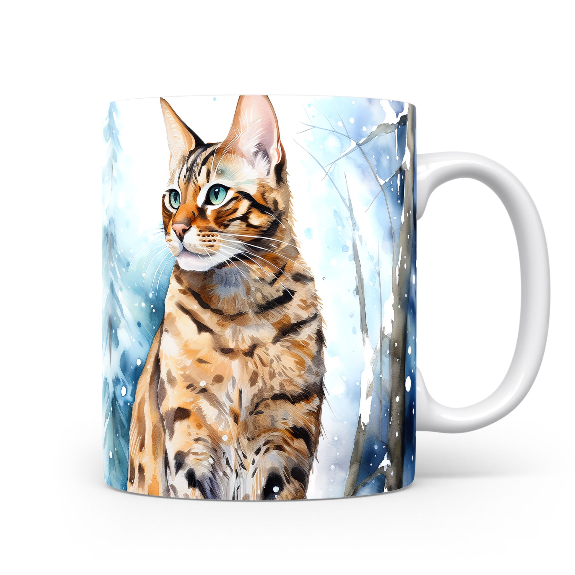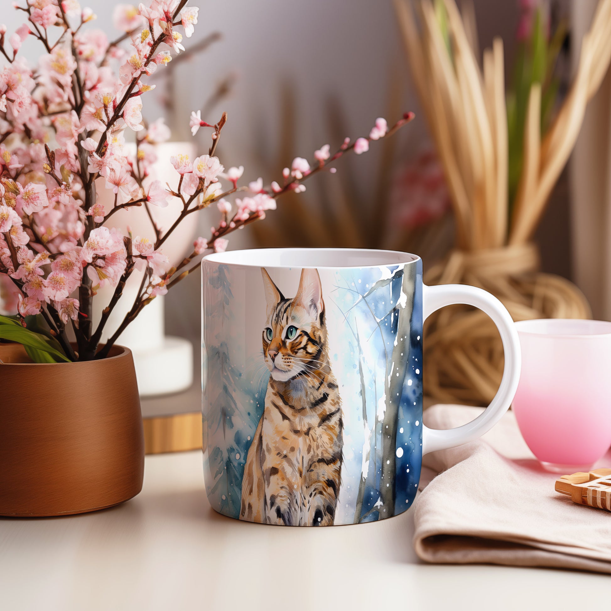Hrnek s motivem bengálské kočky v zasněžené scenérii je stylovým kouskem pro všechny milovníky těchto krásných zvířat. Tento hrnek je skvělým dárkem pro přátele nebo rodinu, kteří ocení jedinečný design. Materiál: keramika. Objem: 330 ml. Vhodné do myčky i mikrovlnky. Díky svému originálnímu vzhledu přináší radost při každém doušku.