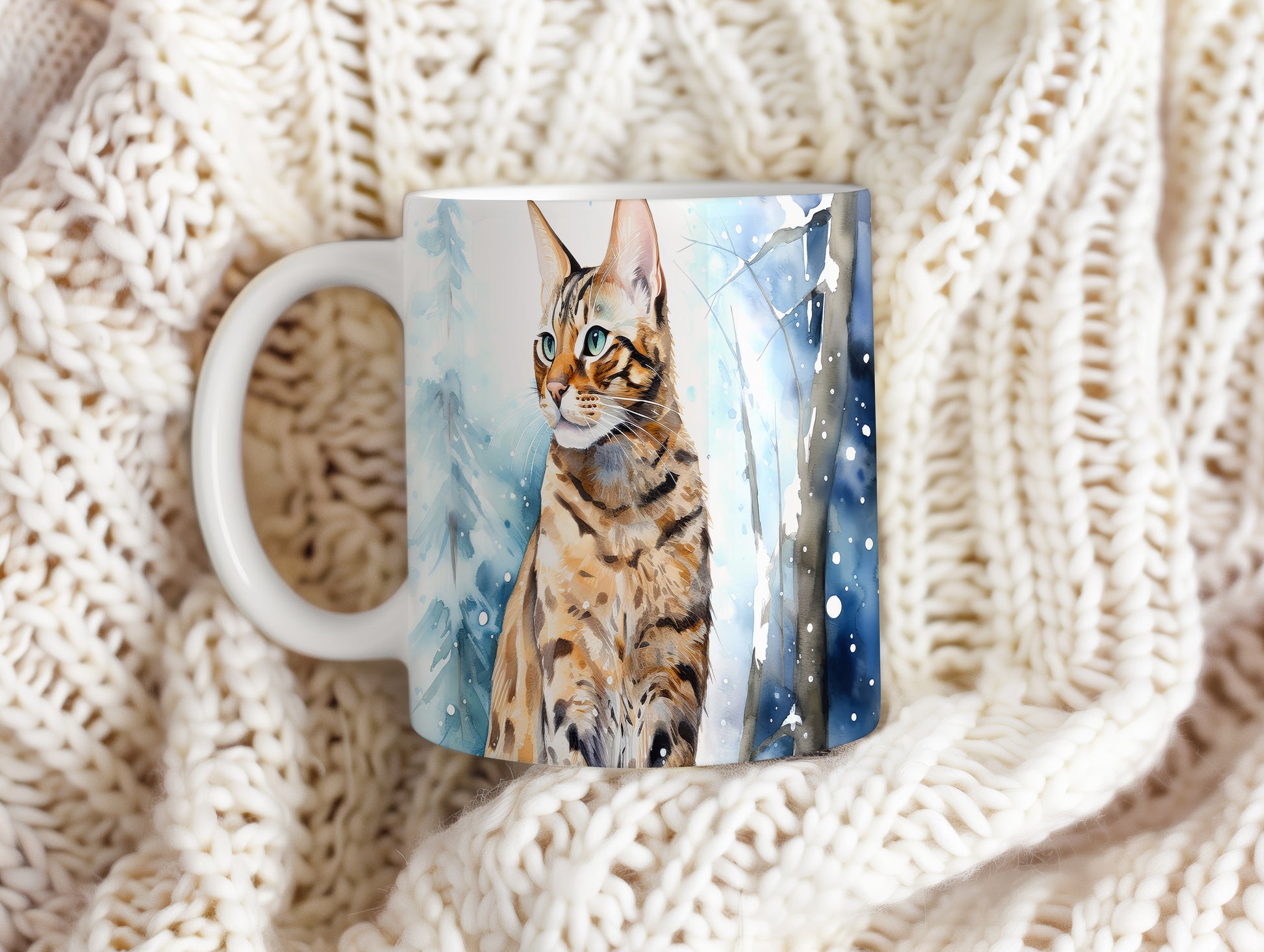 Hrnek s bengálskou kočkou na zasněženém pozadí