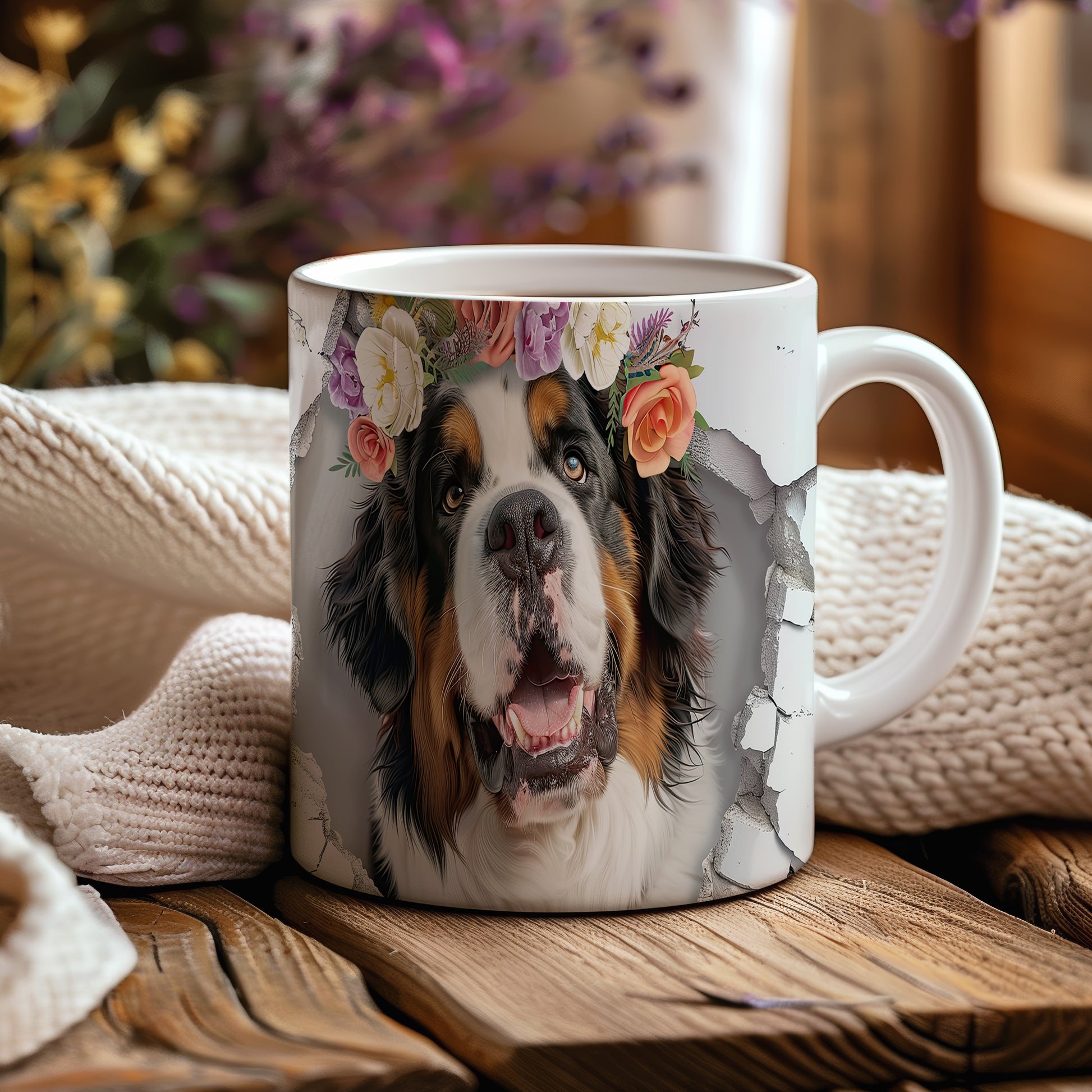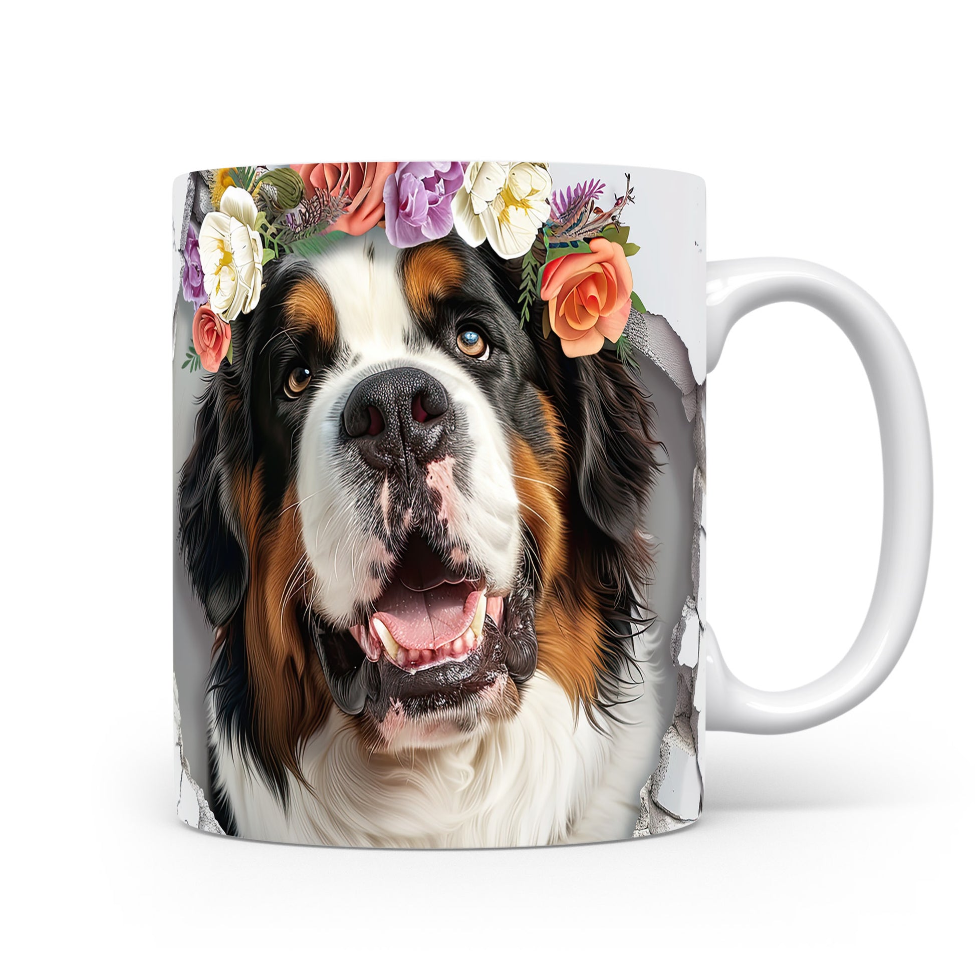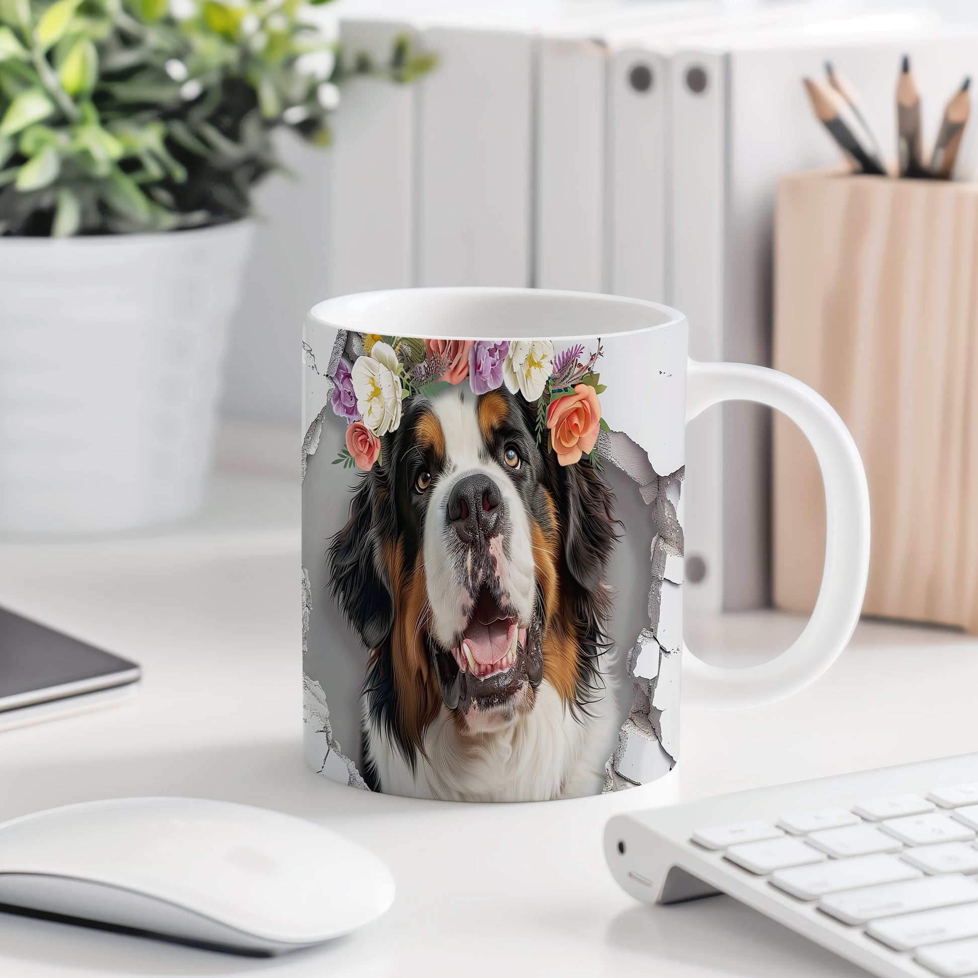 Hrnek s bernským salašnickým psem s 3D efektem květin