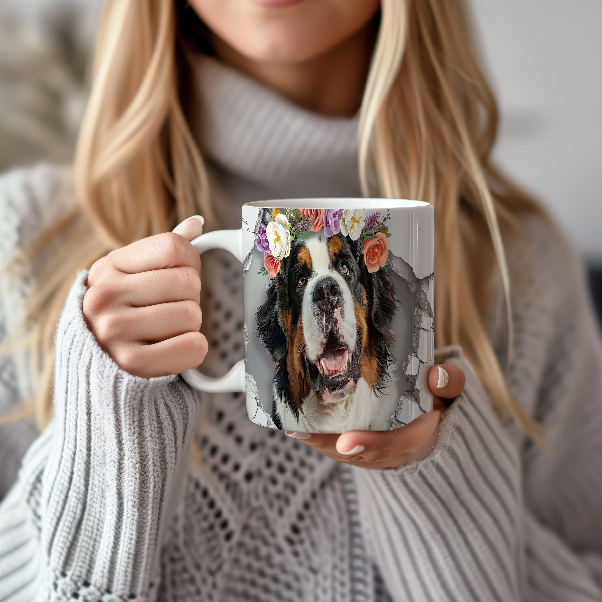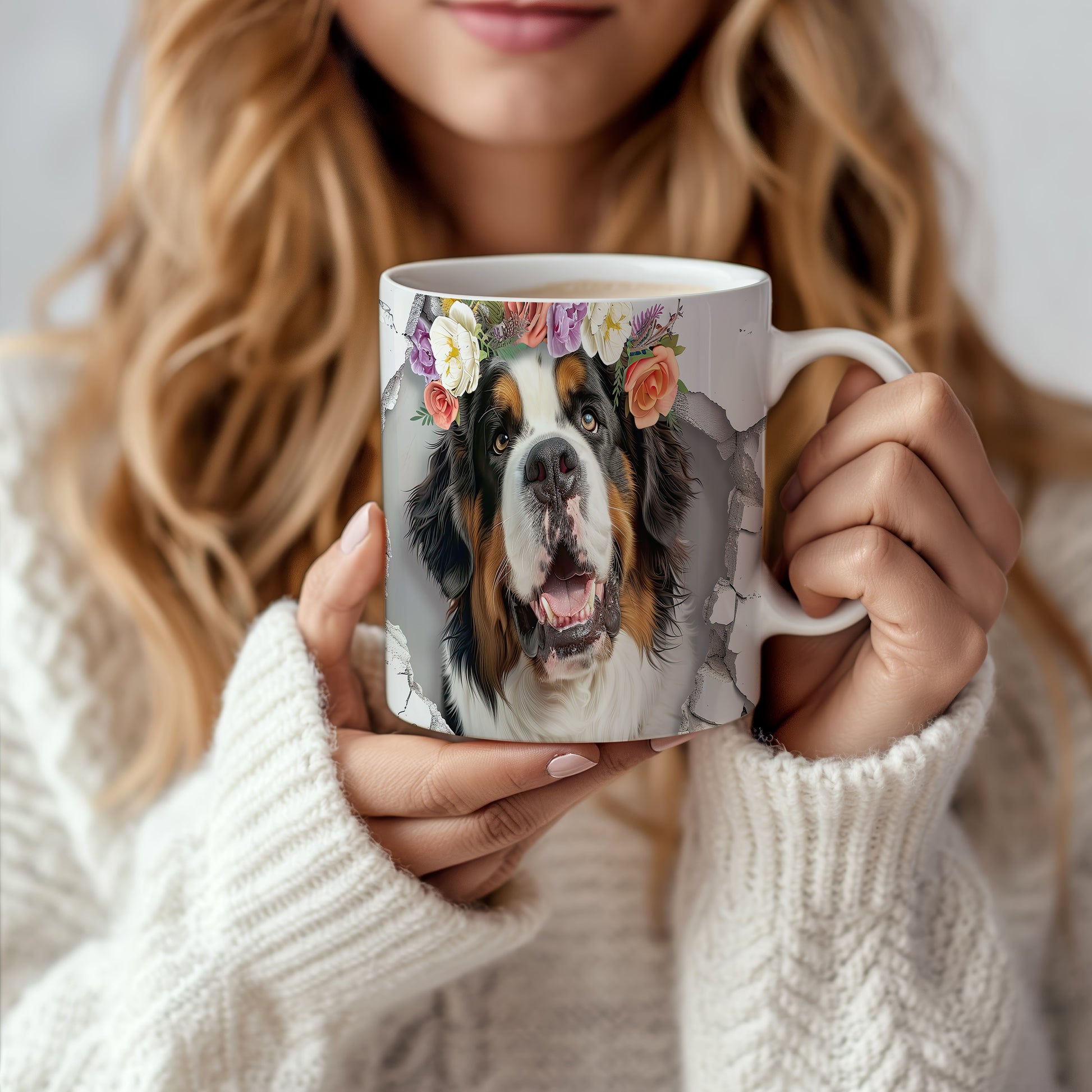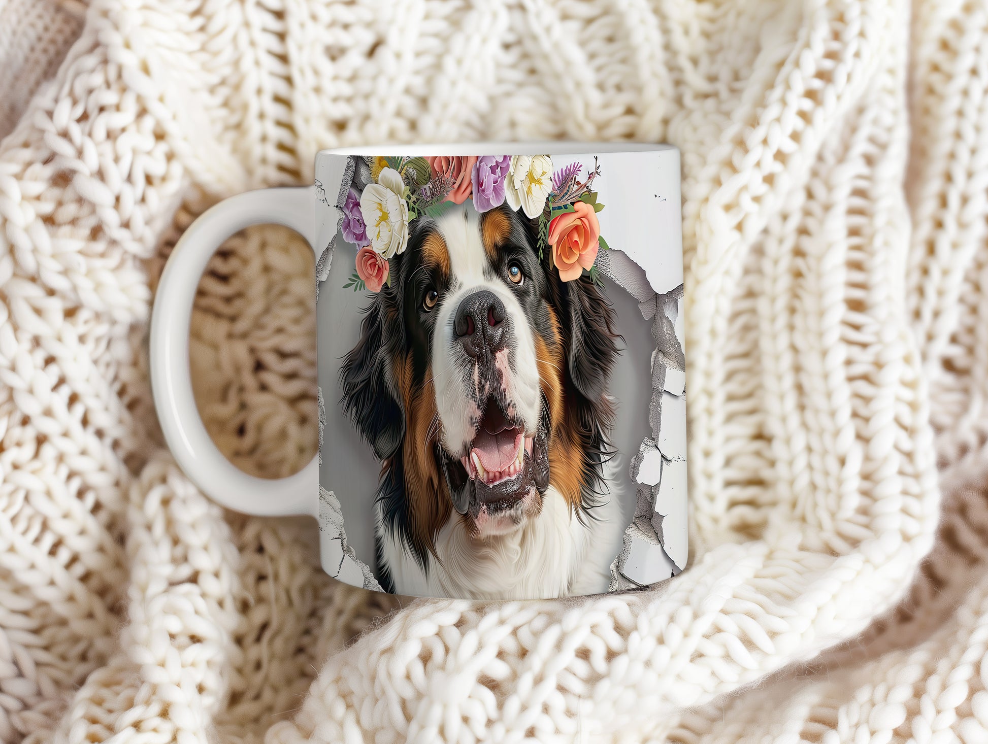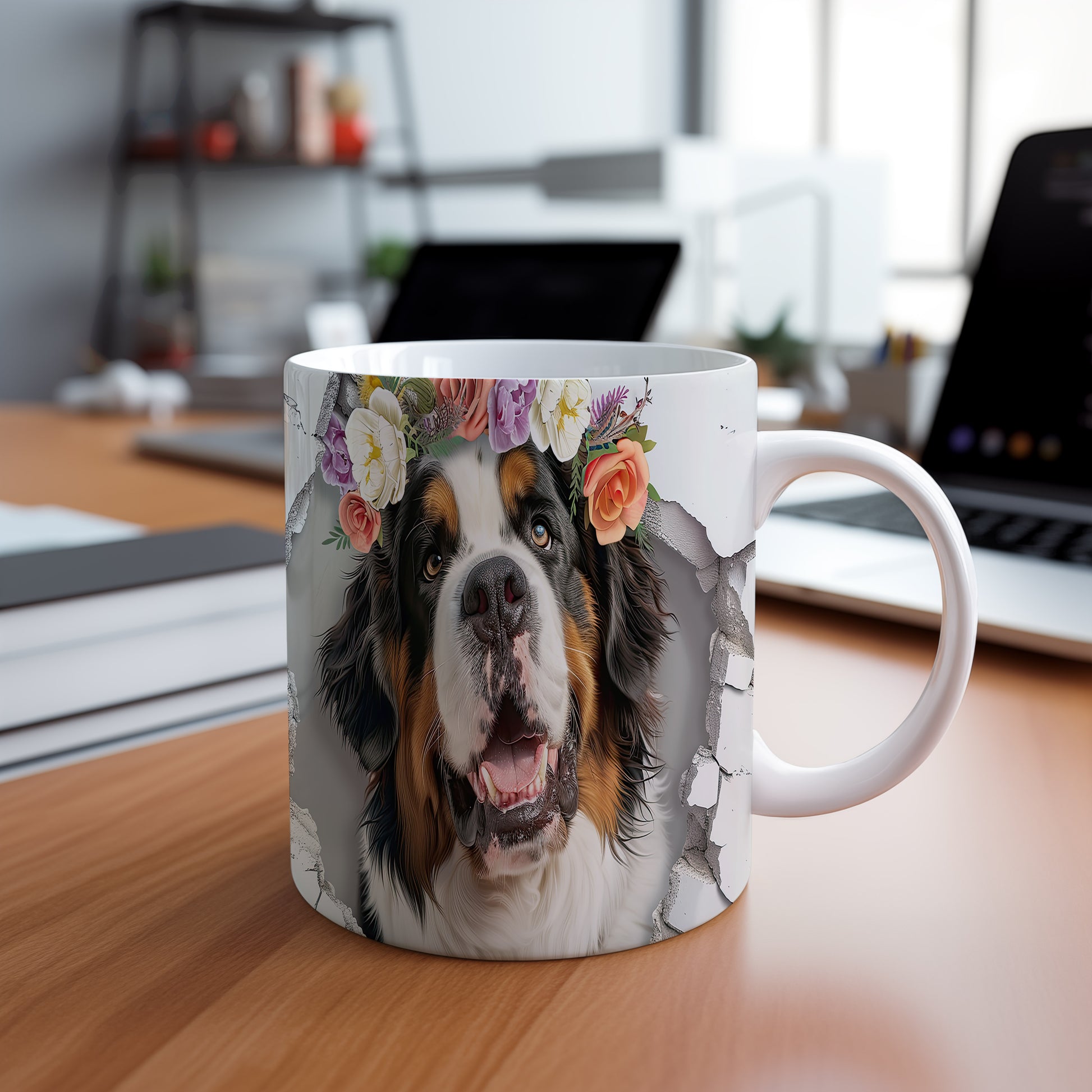 Hrnek s bernským salašnickým psem s 3D efektem květin