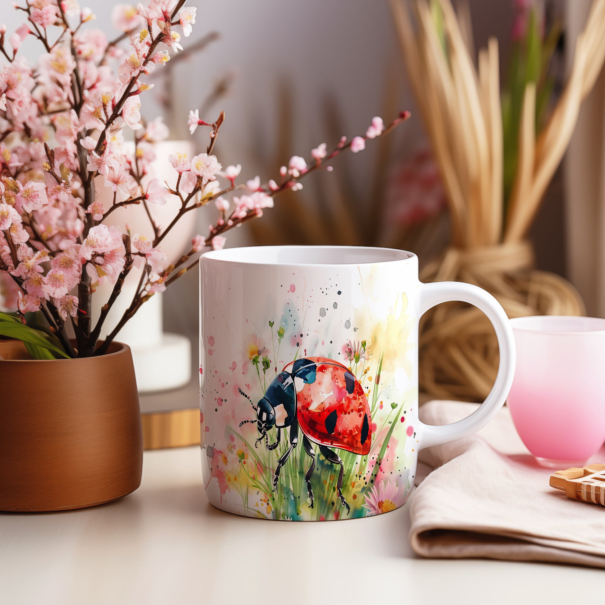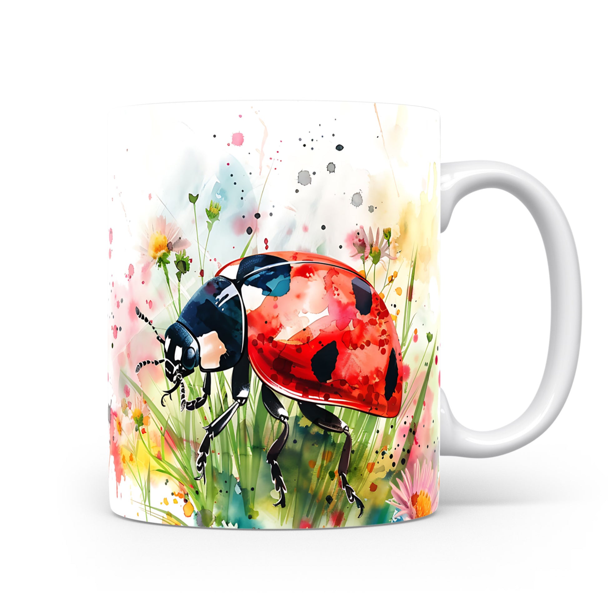 Hrnek s beruškou a květinami – černým akcentem