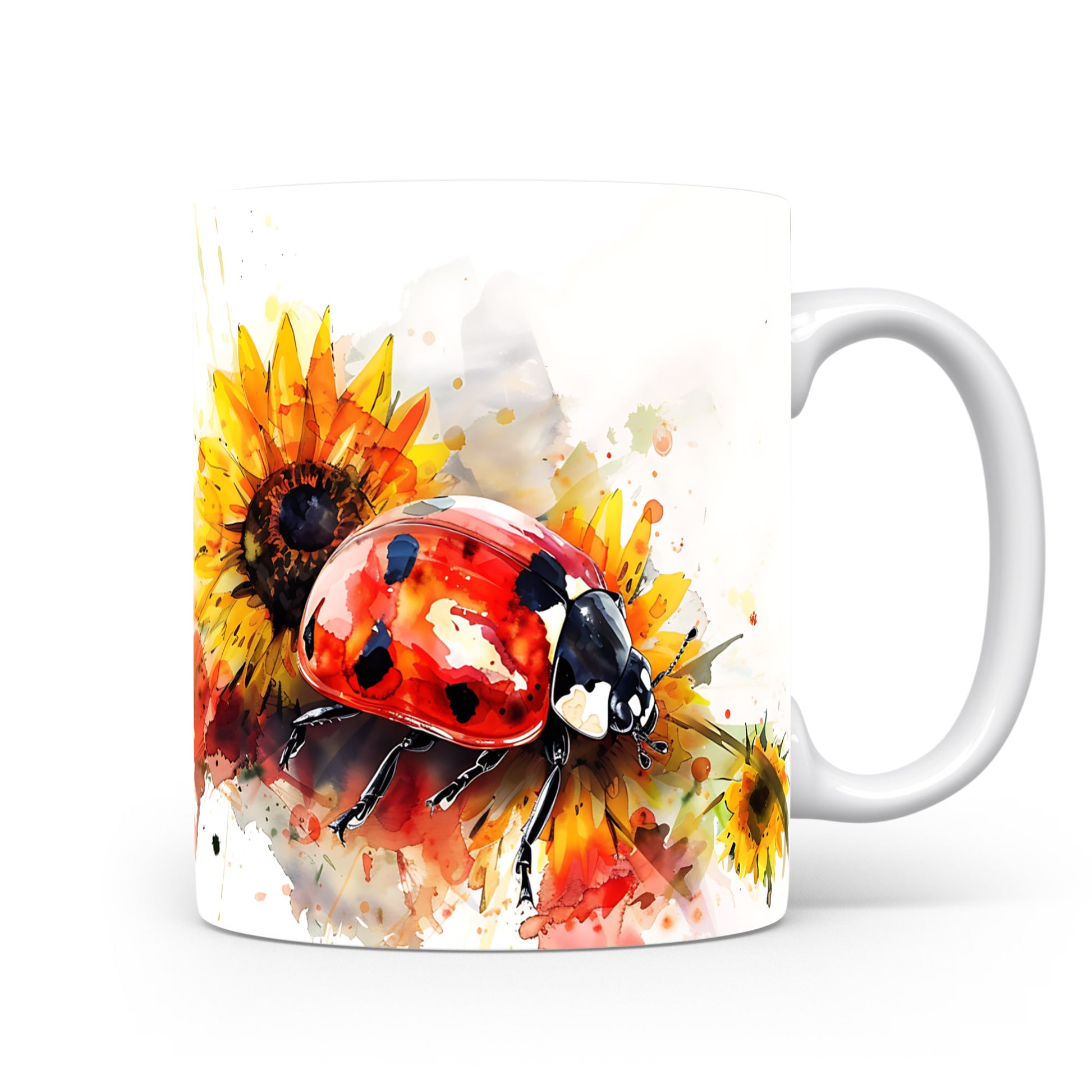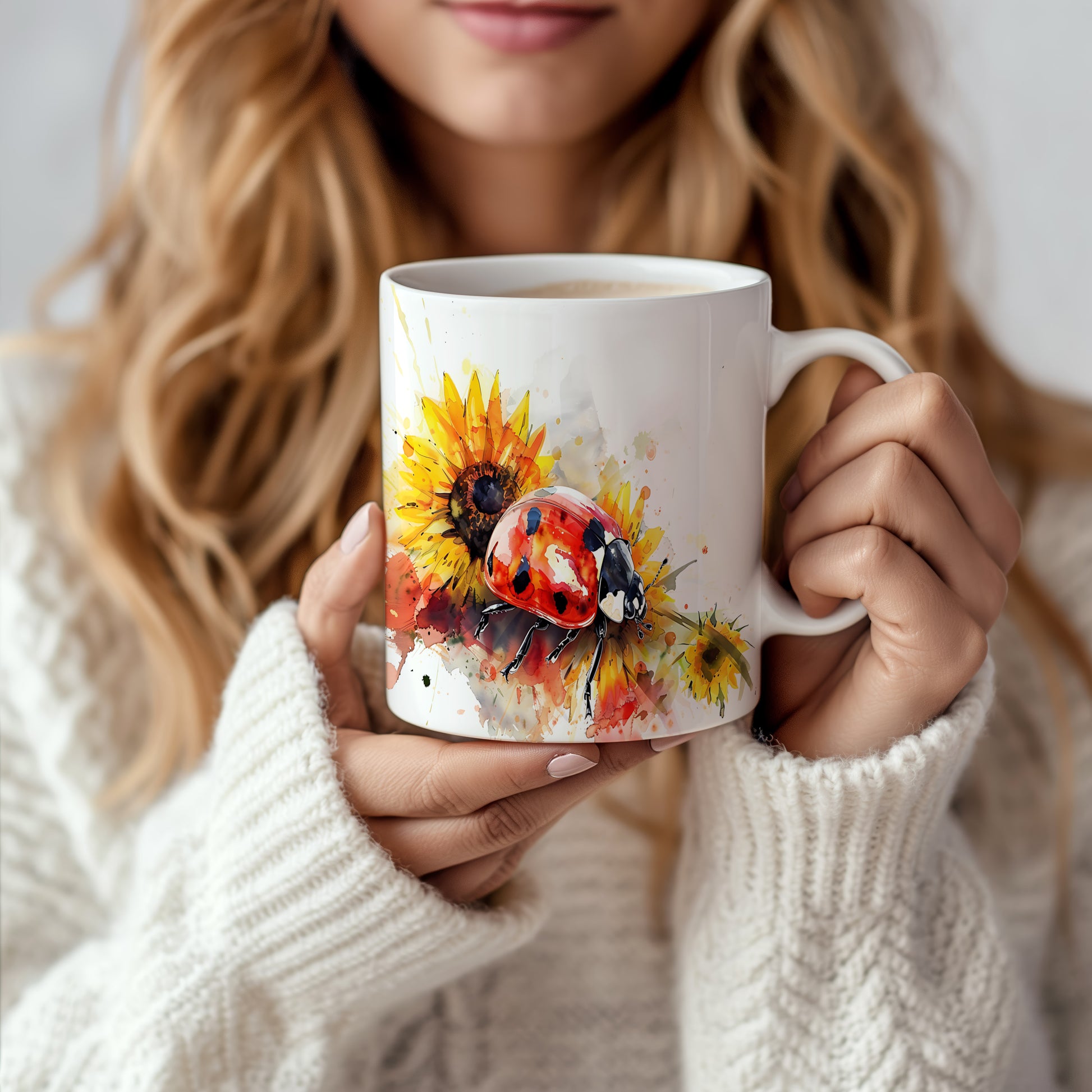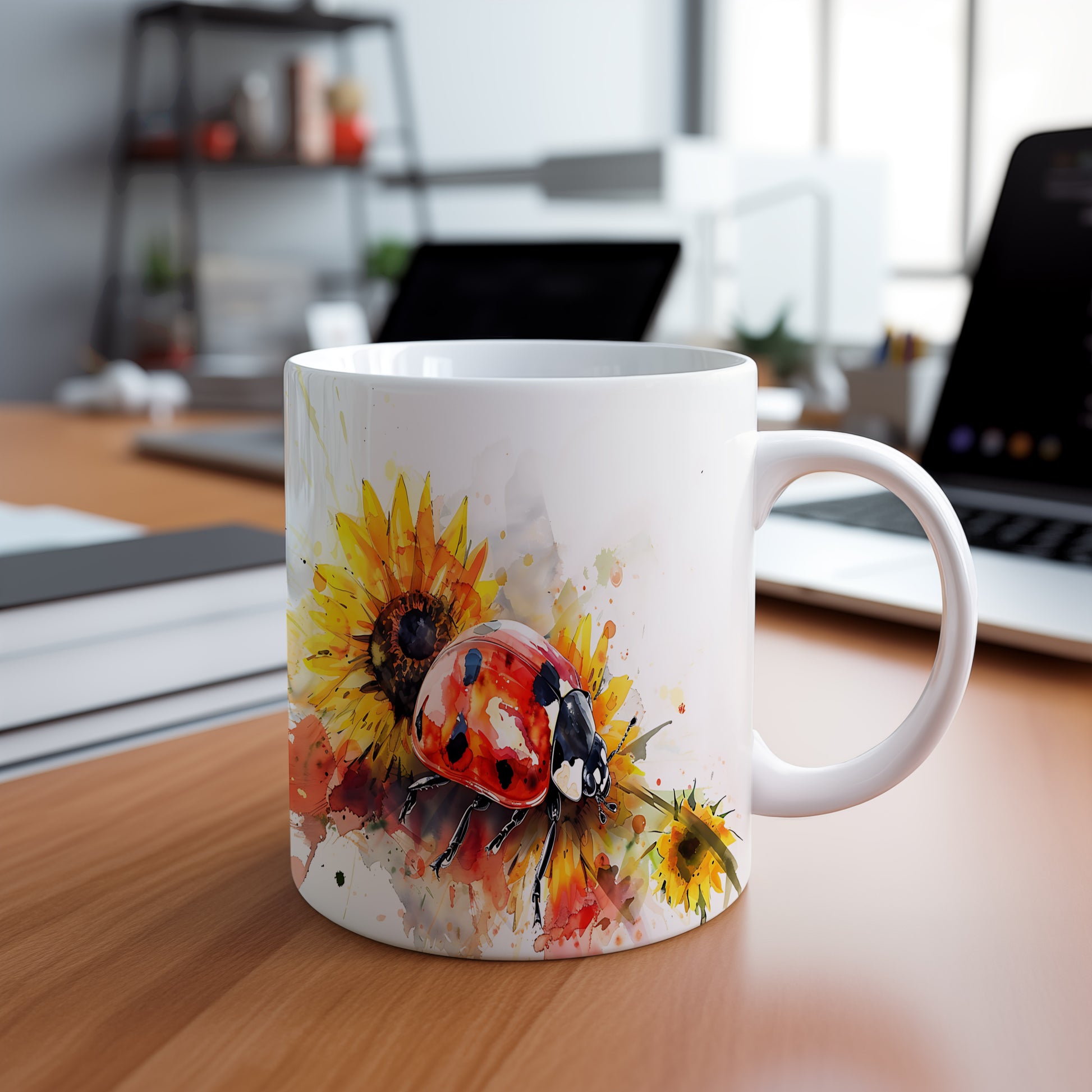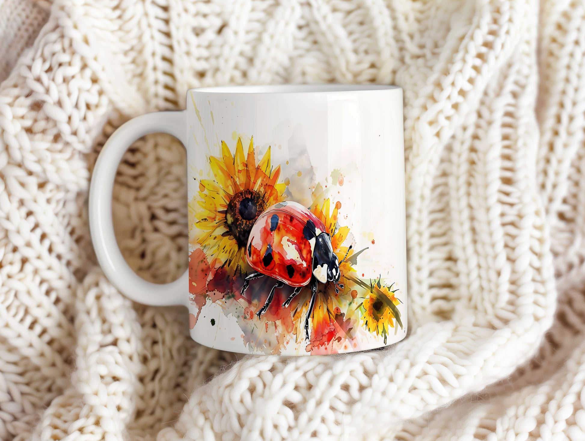 Hrnek s beruškou a slunečnicemi – malířským vzhledem