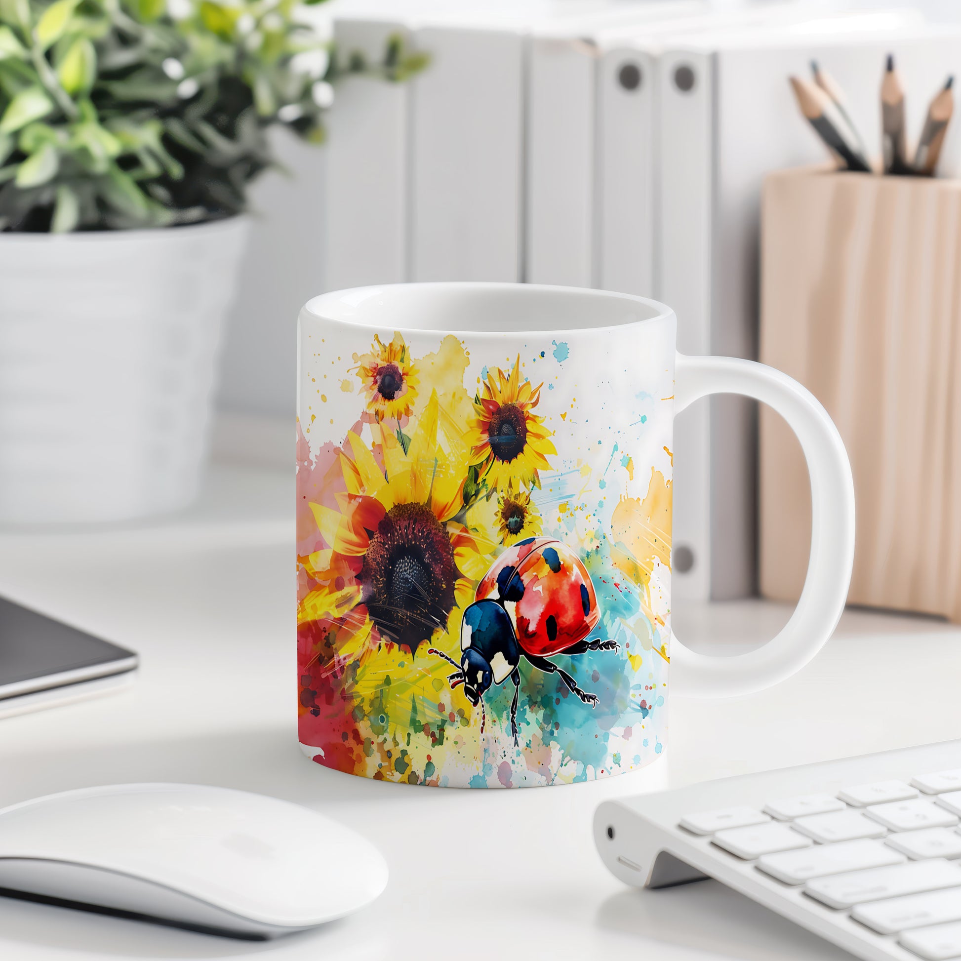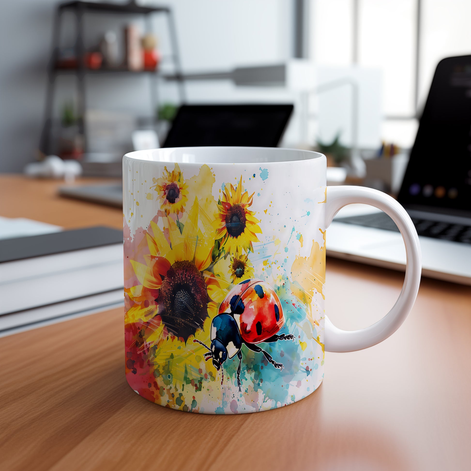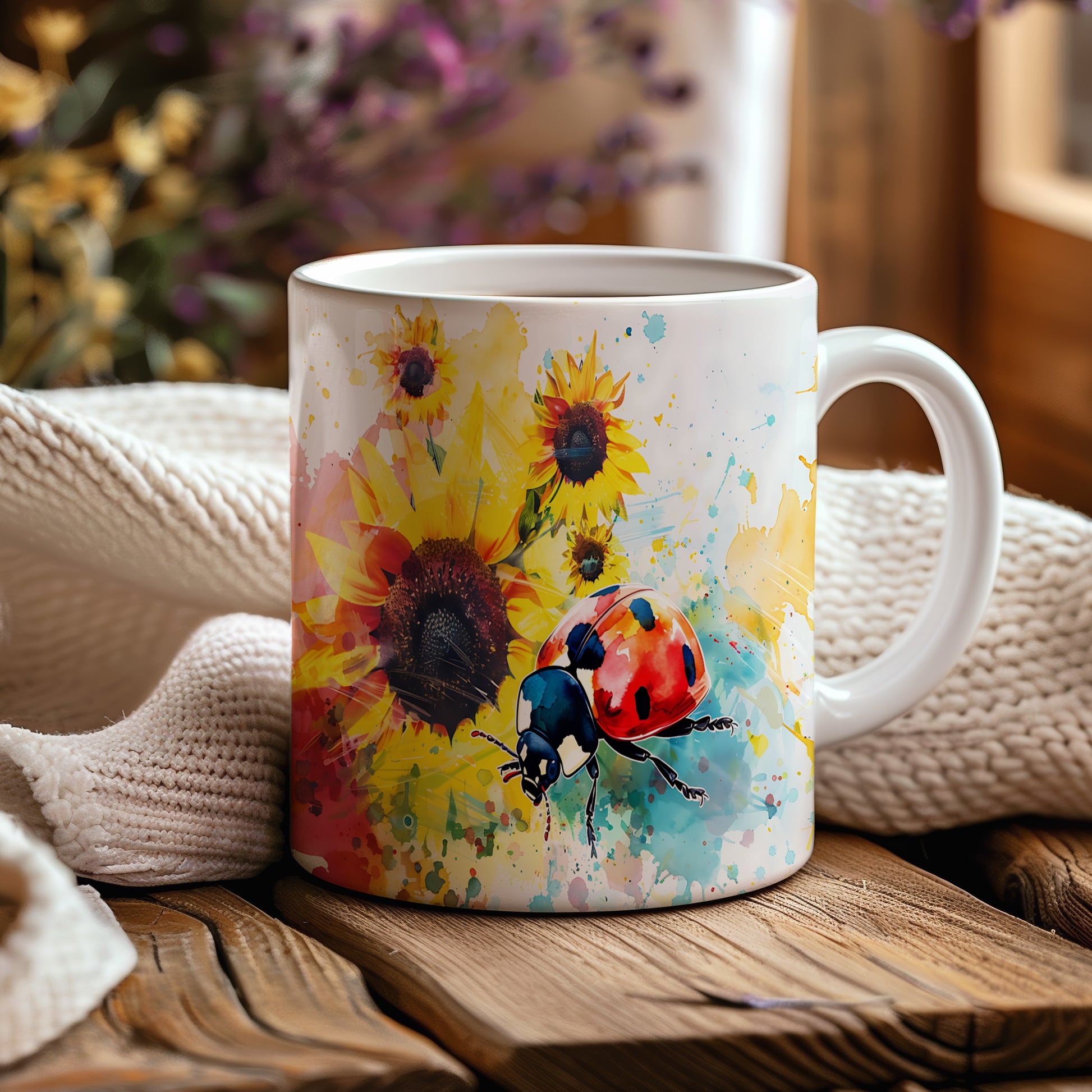 Tento hrnek zdobí krásná beruška na pozadí slunečnic. Je ideální pro milovníky přírody a skvělý tip na dárek pro přátele nebo rodinu. Materiál: keramika. Objem: 330 ml. Vhodné do myčky i mikrovlnky. Používání tohoto hrnku přináší radost a oživí každodenní pití.
