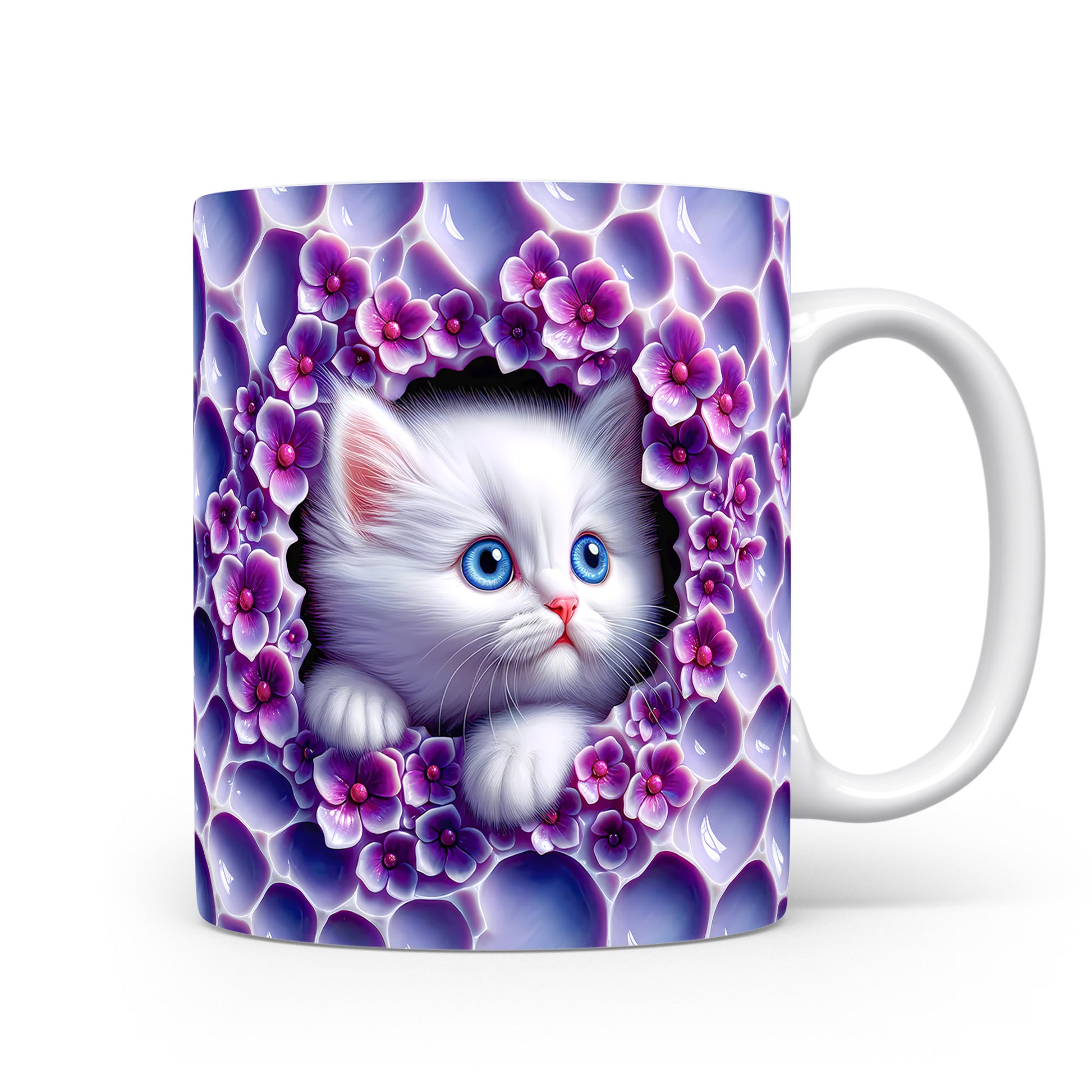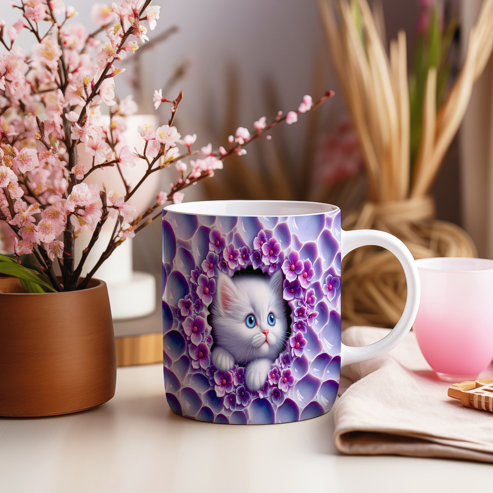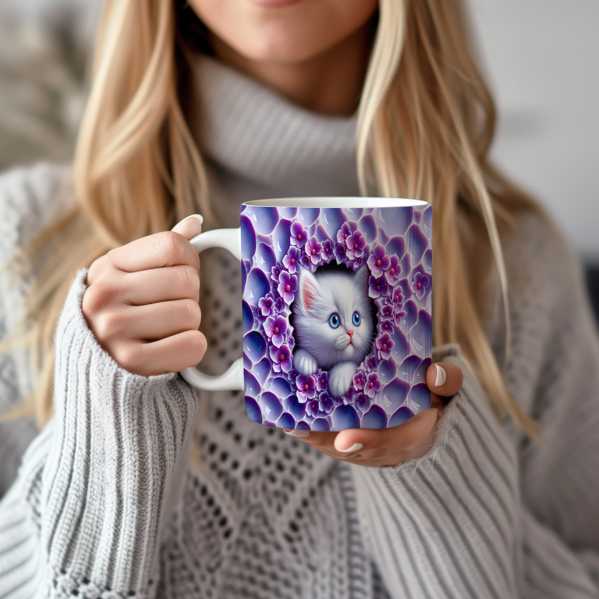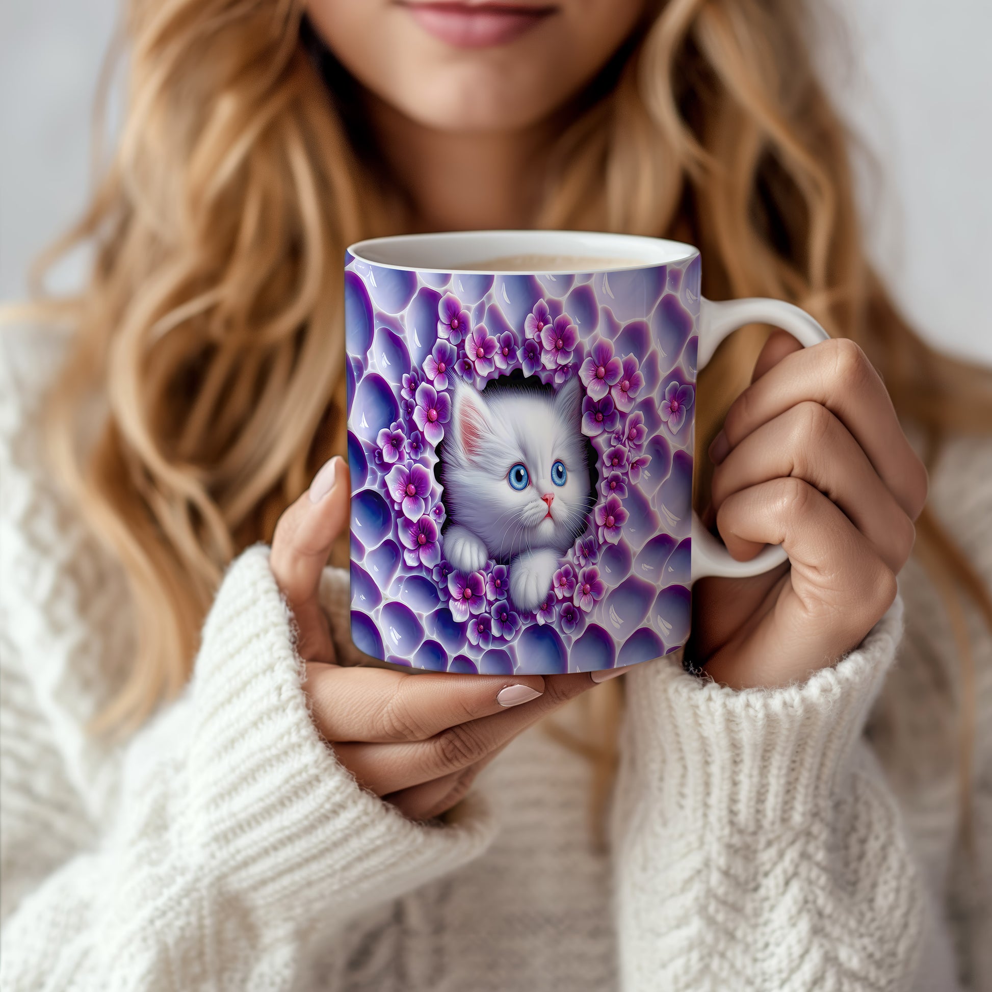 Tento hrnek zobrazuje roztomilou bílou kočičku s modrýma očima, která se schovává za květinovým vzorem. Je ideální pro milovníky koček a skvělý tip na dárek pro přátele nebo rodinu. Materiál: keramika. Objem: 330 ml. Vhodné do myčky i mikrovlnky. Používání tohoto hrnku přináší radost a útulnost do každého dne.