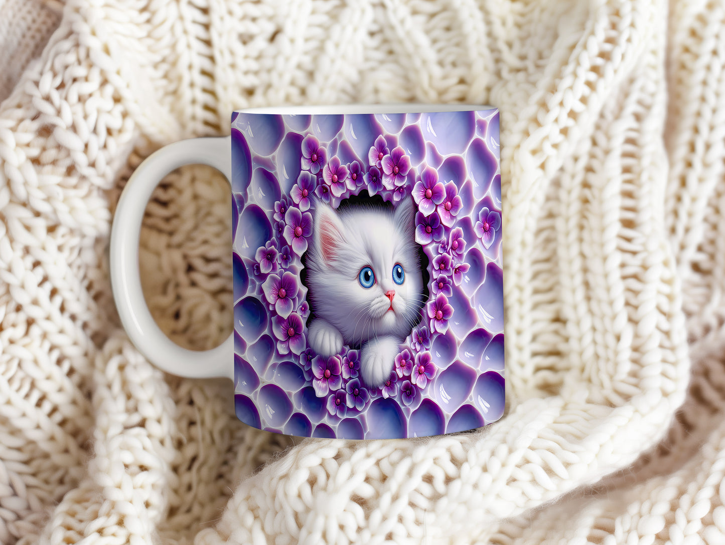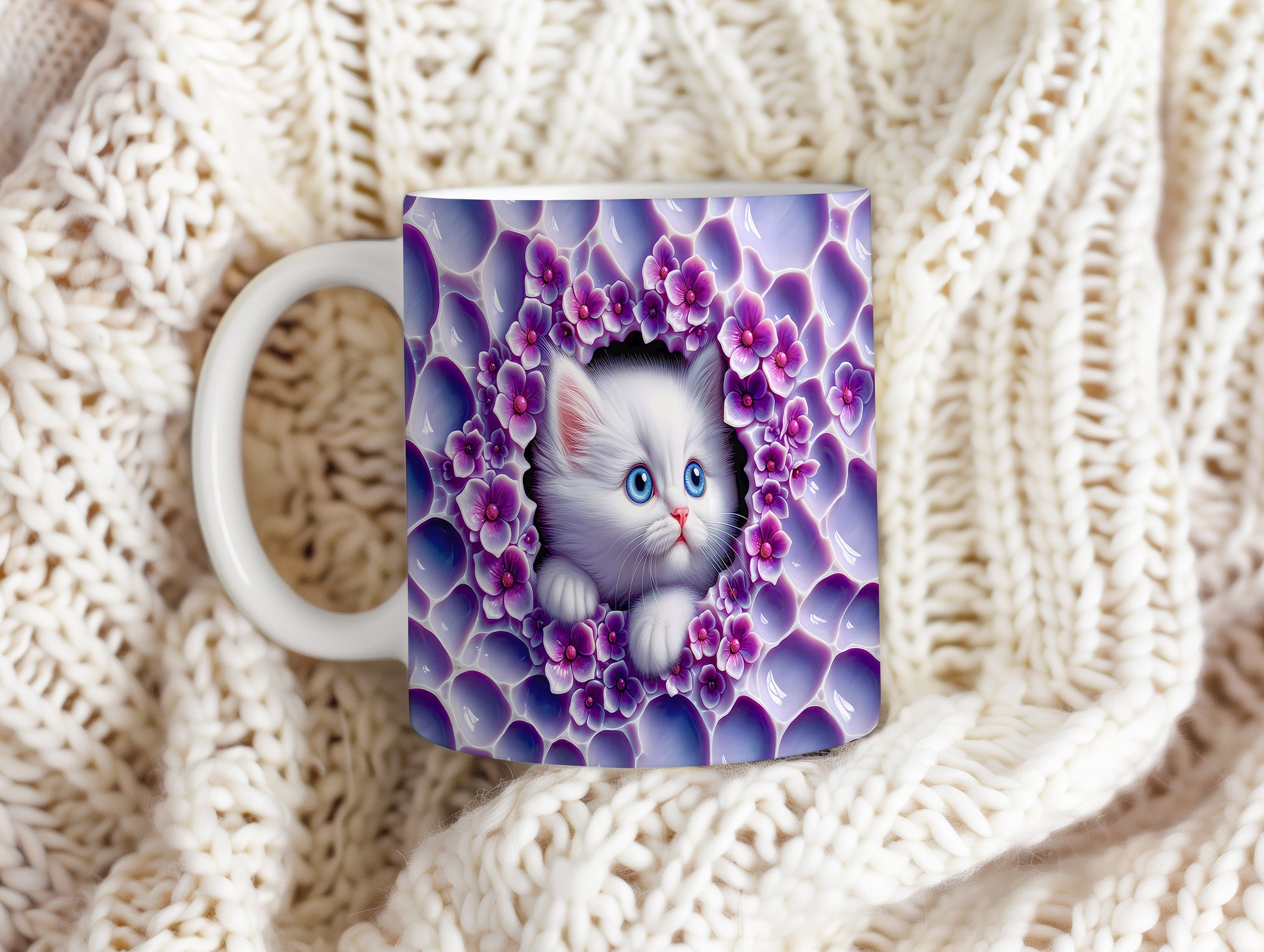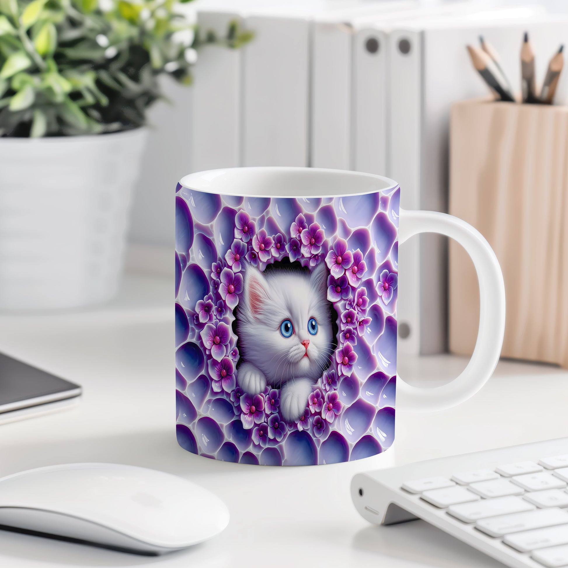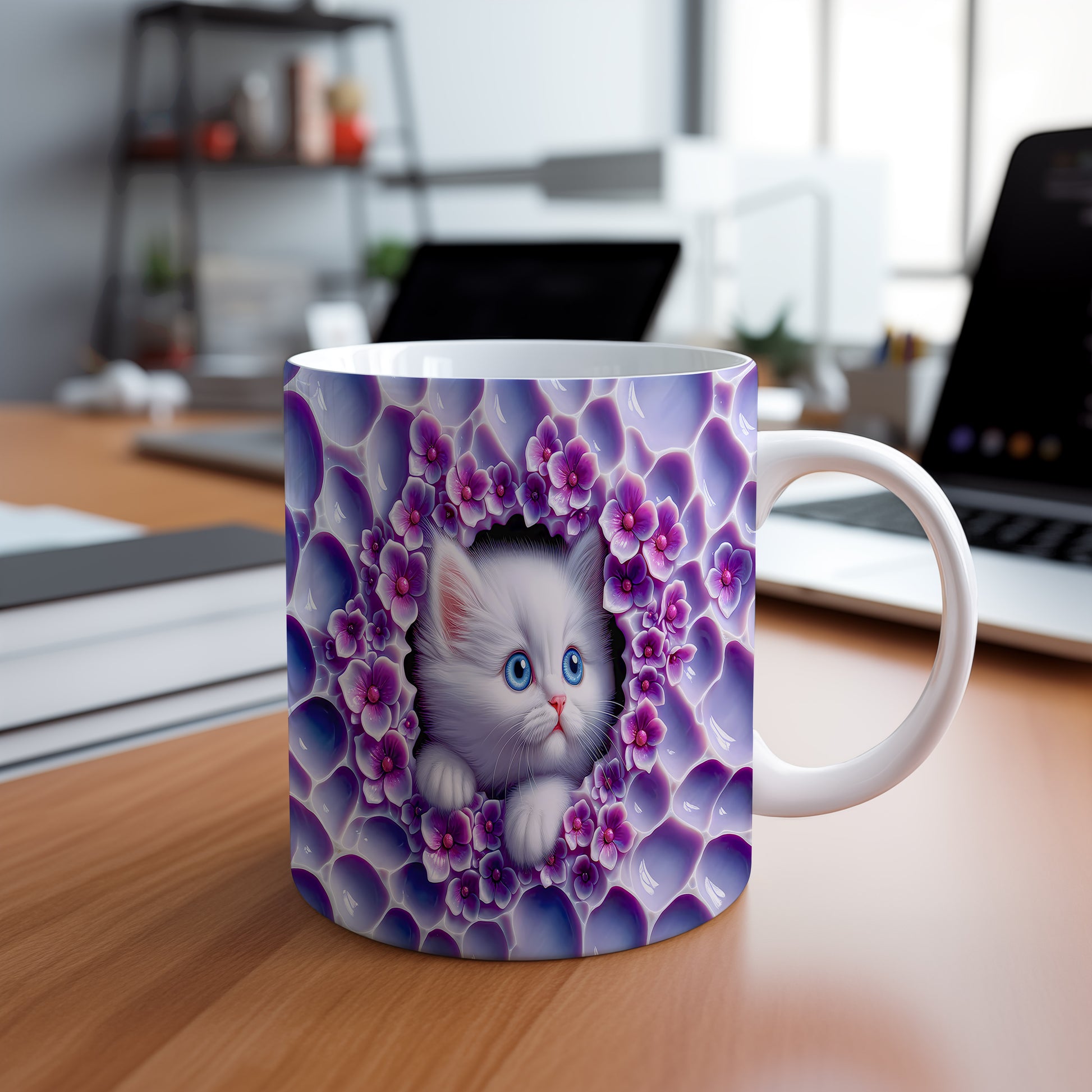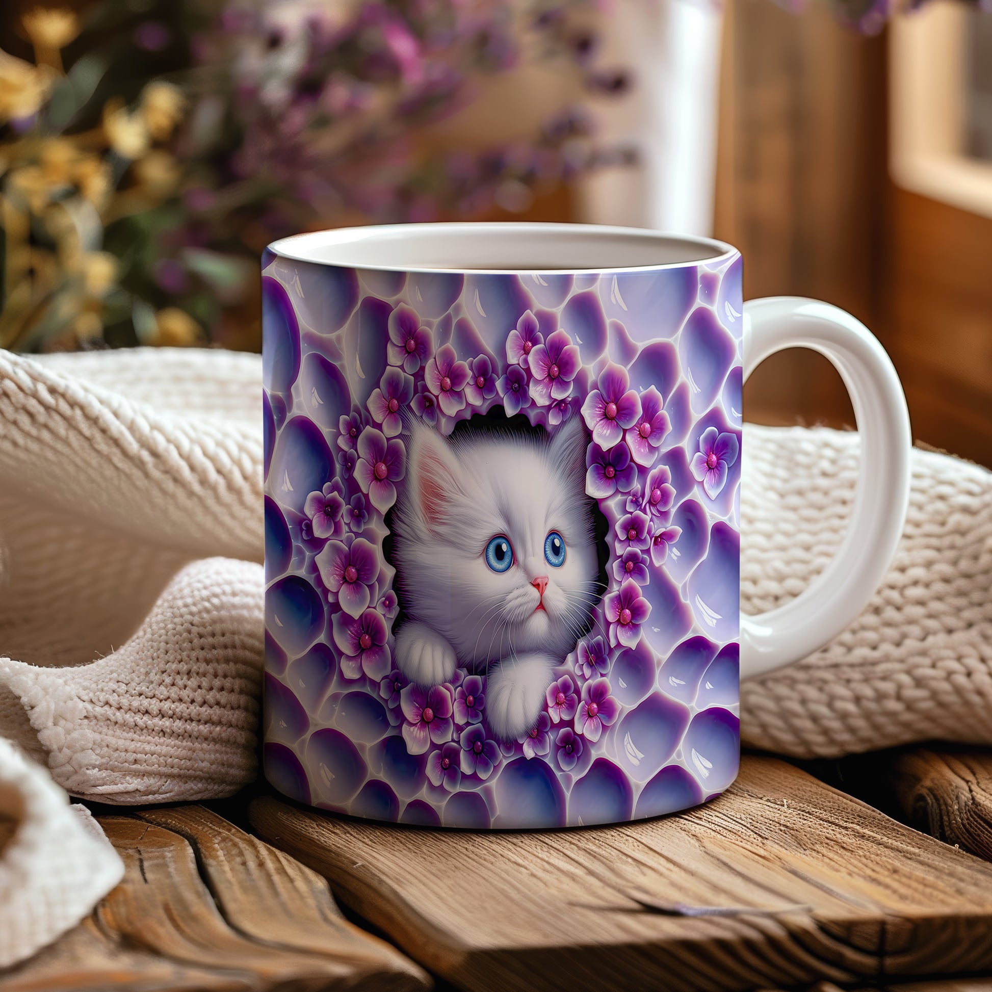 Tento hrnek zobrazuje roztomilou bílou kočičku s modrýma očima, která se schovává za květinovým vzorem. Je ideální pro milovníky koček a skvělý tip na dárek pro přátele nebo rodinu. Materiál: keramika. Objem: 330 ml. Vhodné do myčky i mikrovlnky. Používání tohoto hrnku přináší radost a útulnost do každého dne.