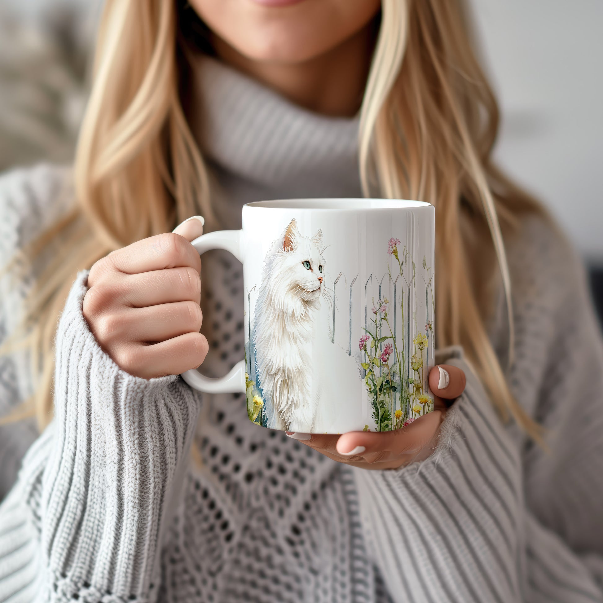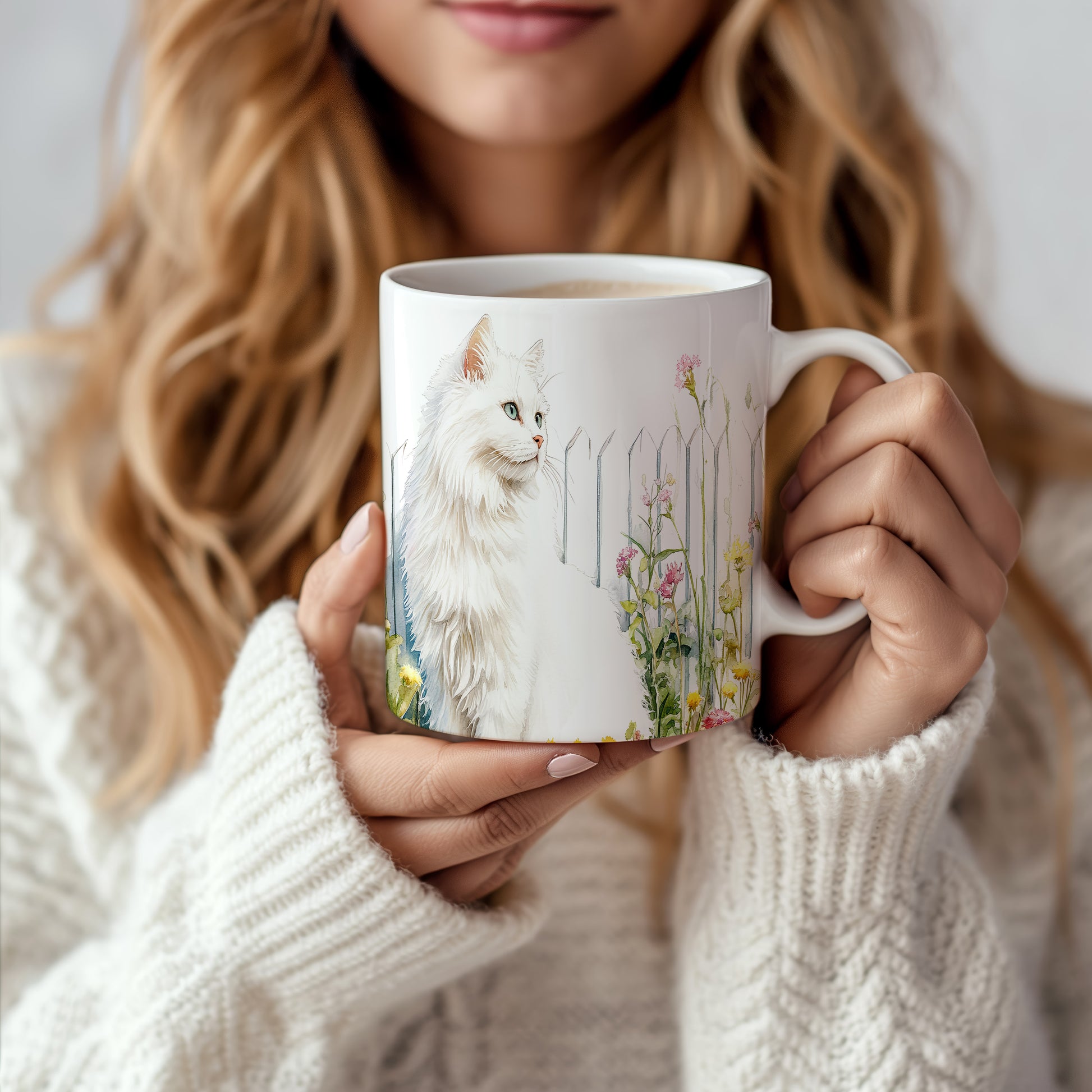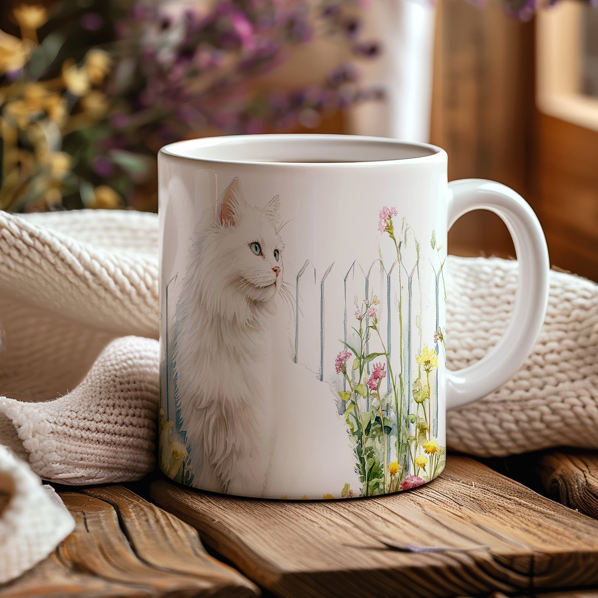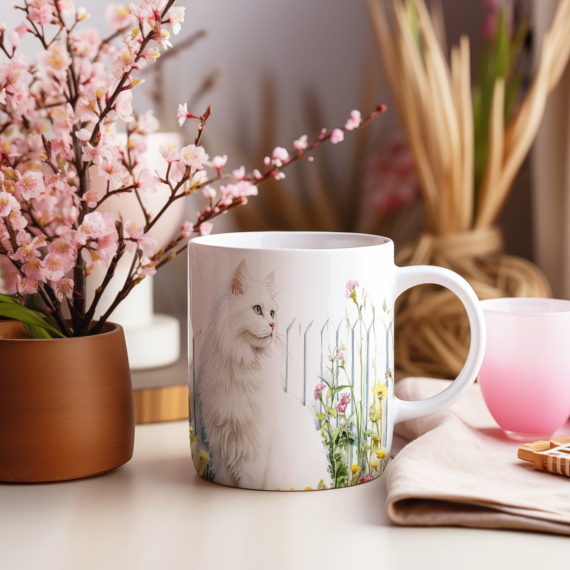 Elegantní hrnek s motivem bílé kočky sedící mezi květinami. Tento hrnek je ideální pro milovníky zvířat a skvělým dárkem pro každého, kdo má rád kočky. Materiál: keramika. Objem: 330 ml. Vhodné do myčky i mikrovlnky. Používání tohoto hrnku přináší radost a útulnost do každého dne.